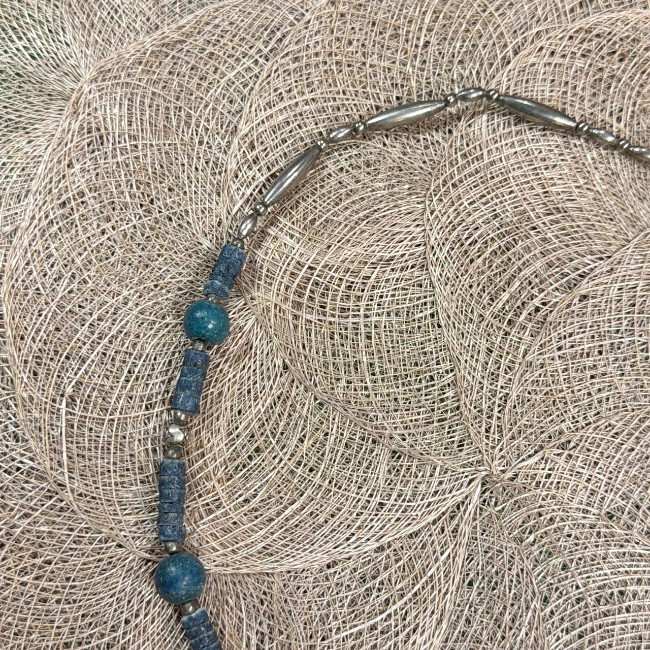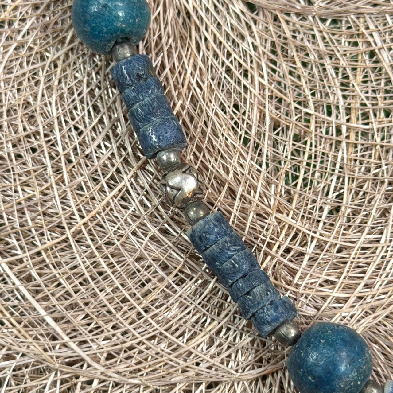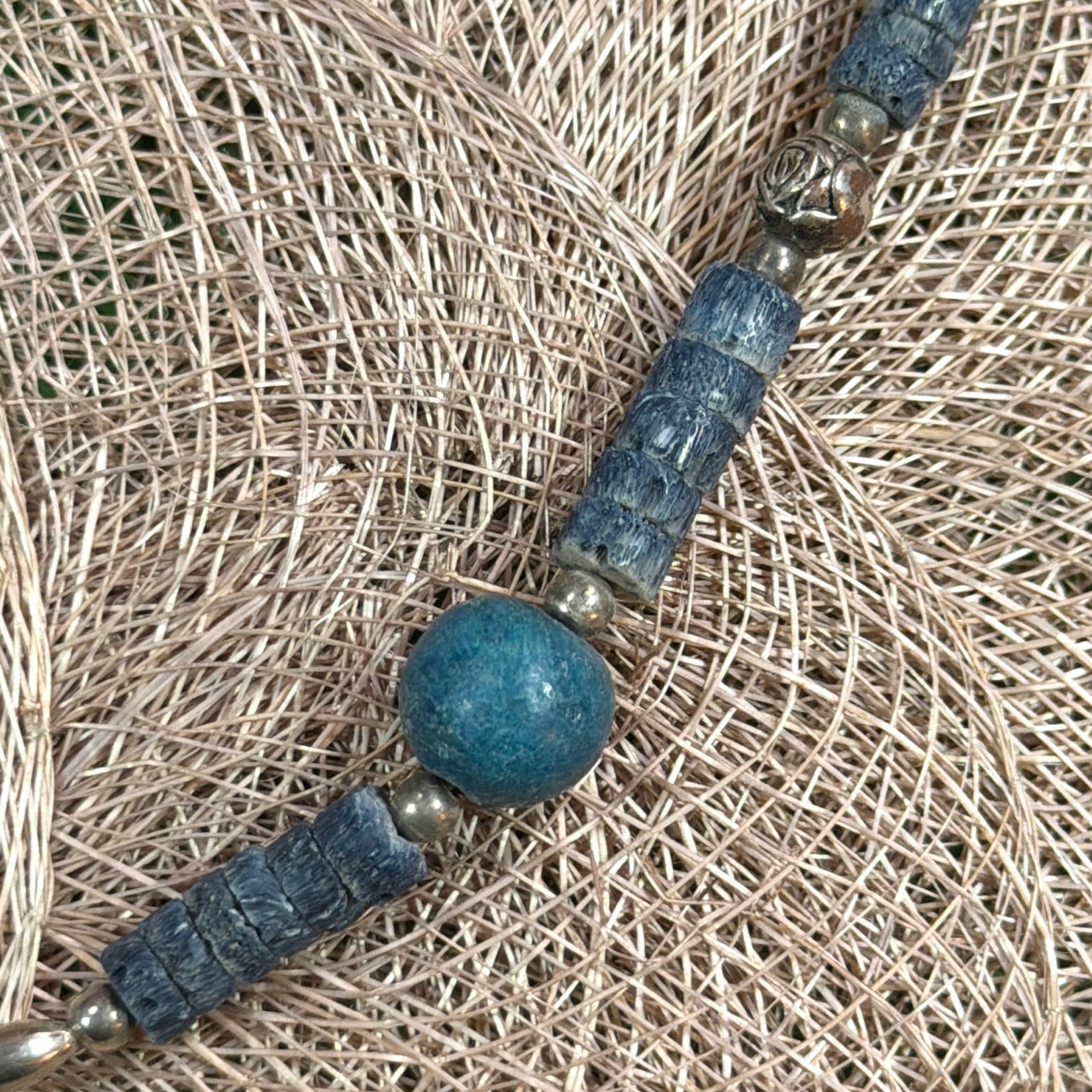 トップには人物を思わせるモチーフがが目を引く存在感のあるデザイン。周囲にはブルー系のビーズとシルバーカラーのパーツが組み合わされ、全体として落ち着きのある雰囲気に仕上がっています。