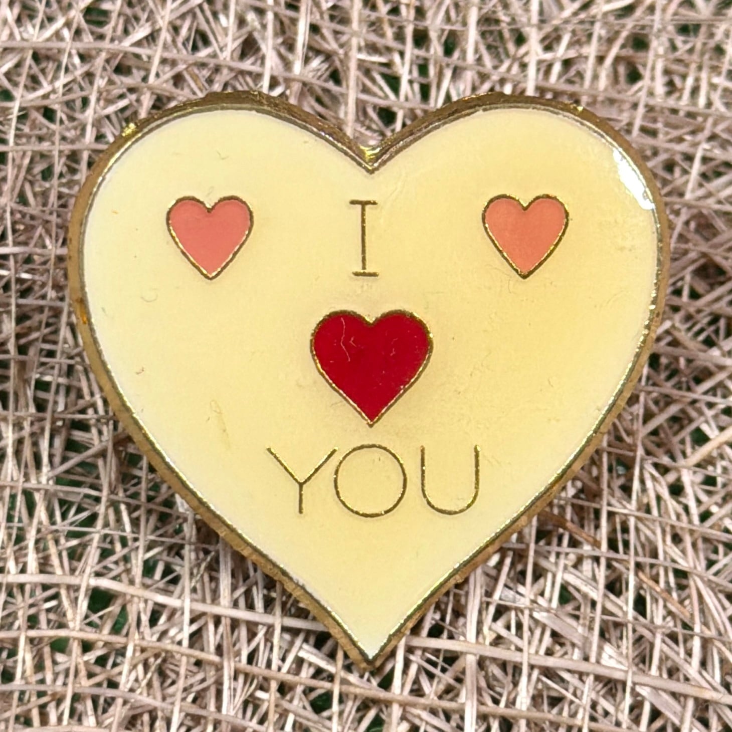 ハート型に「I ♥ YOU」のメッセージがデザインされたピンバッジです。
