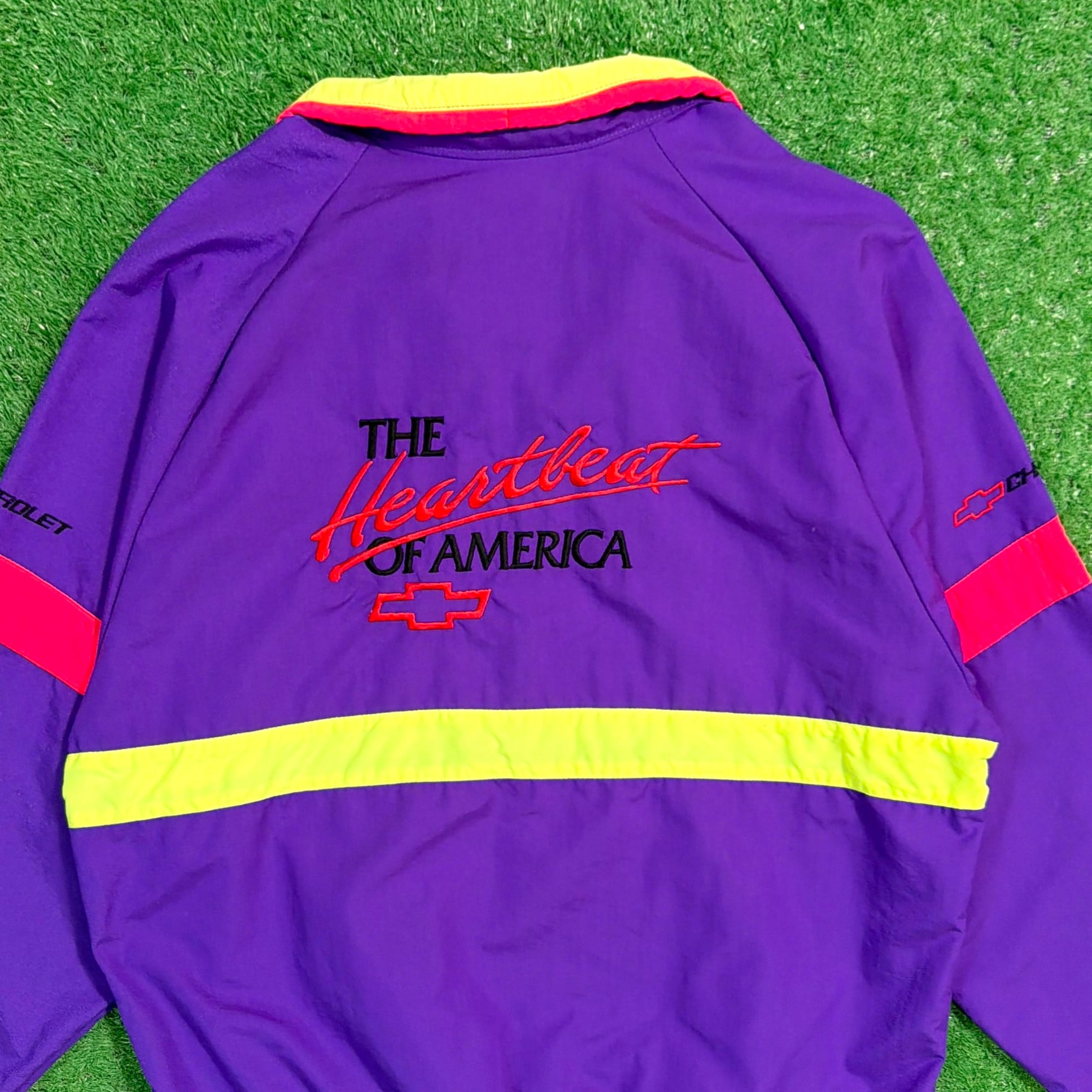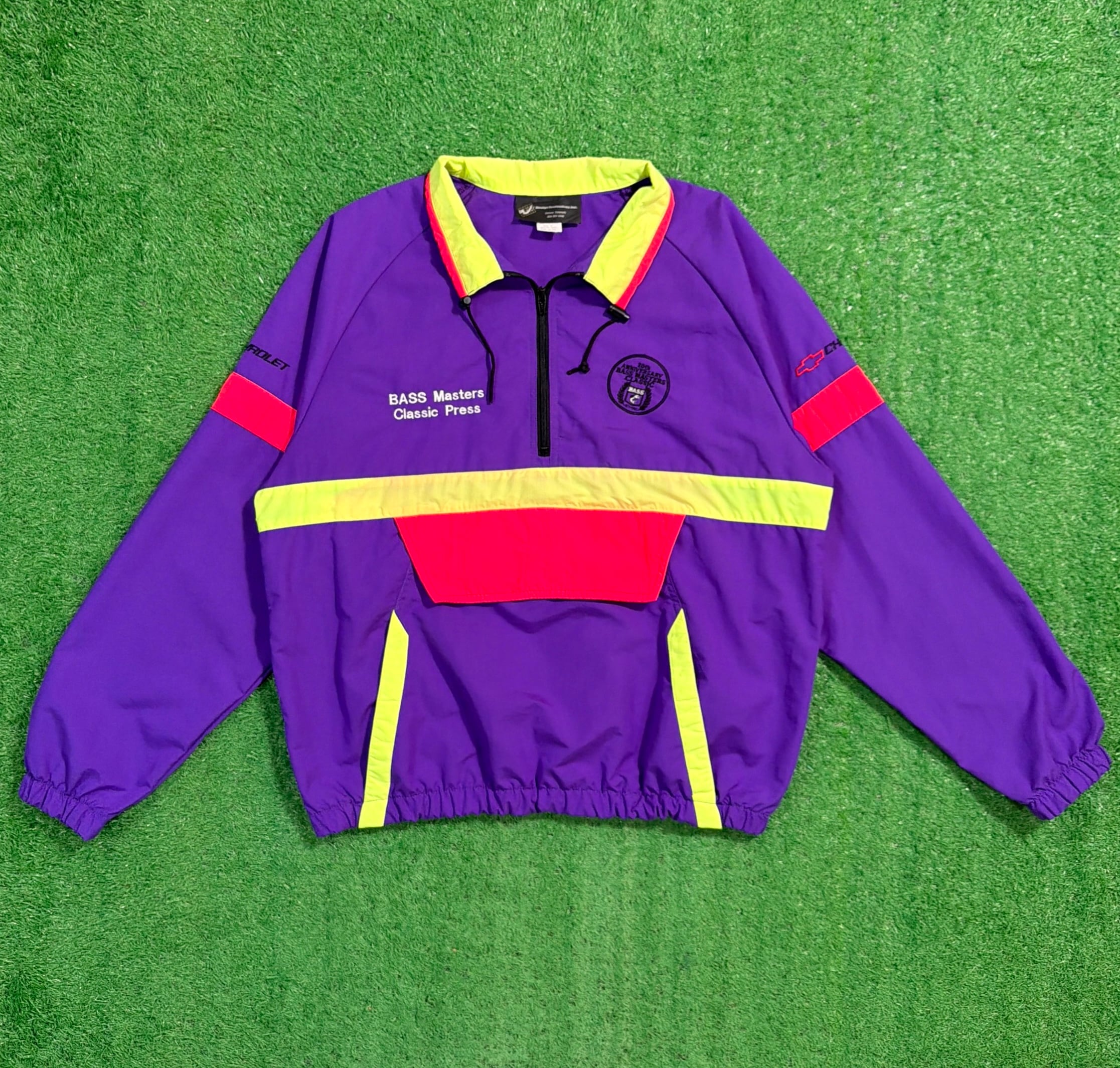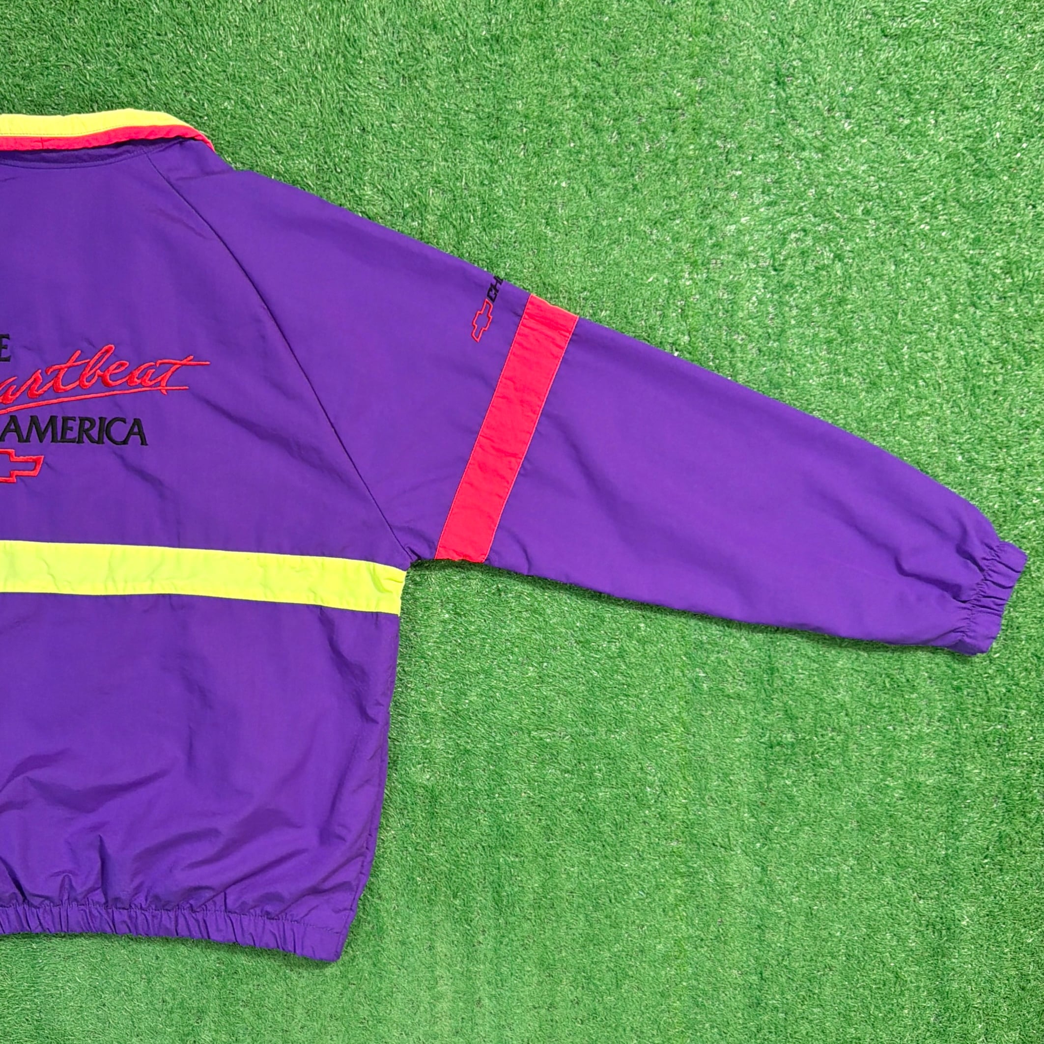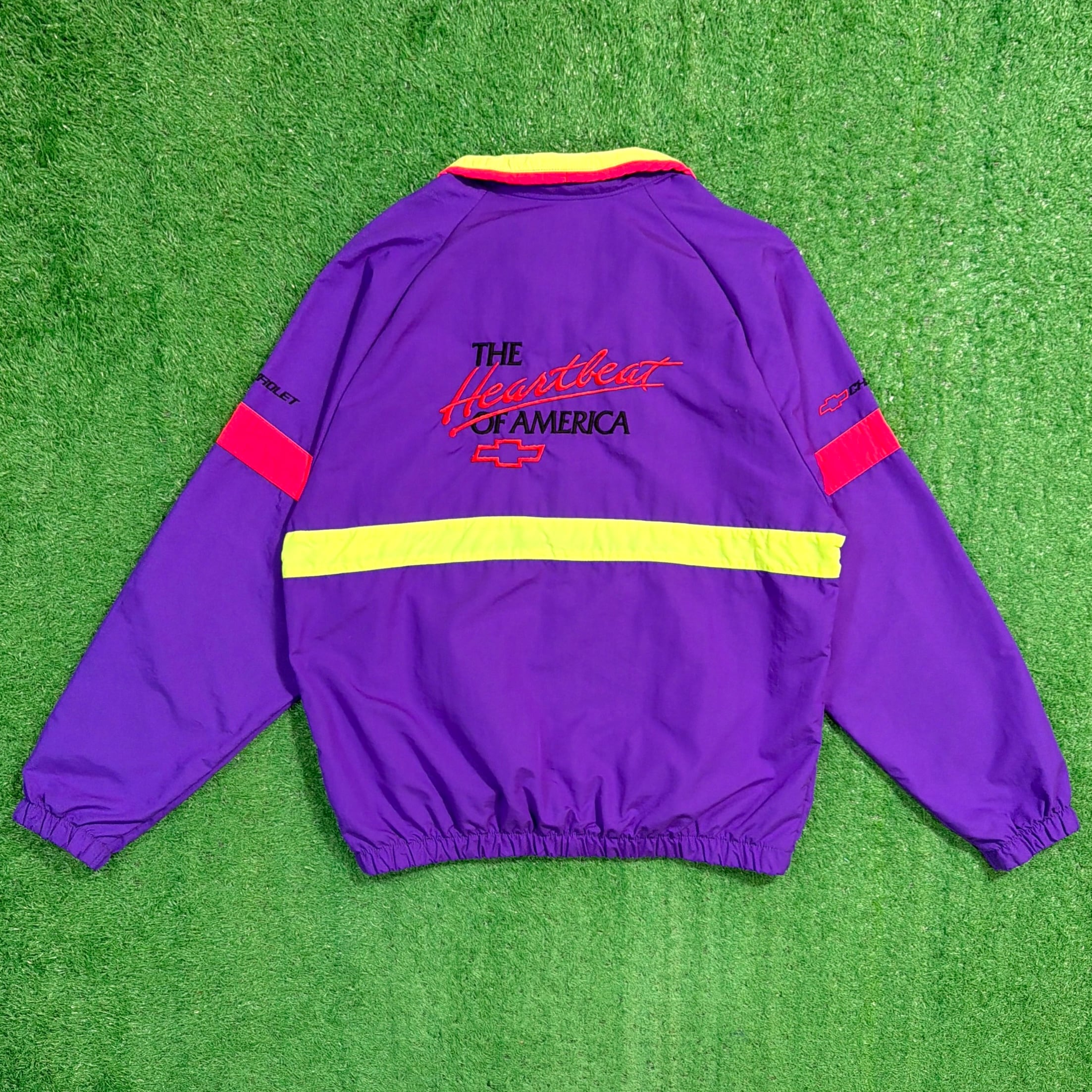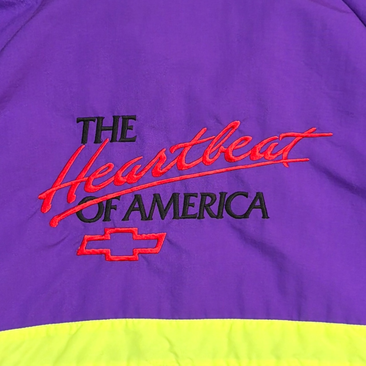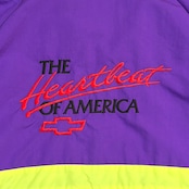 背中には当時のChevroletのスローガン「The Heartbeat of America」の刺繍入りで、アメリカのフィッシングカルチャーと企業スポンサー文化が色濃く反映された一着。パープルを基調に、イエローとレッドの切り替えが映える90sらしい配色も魅力です。
