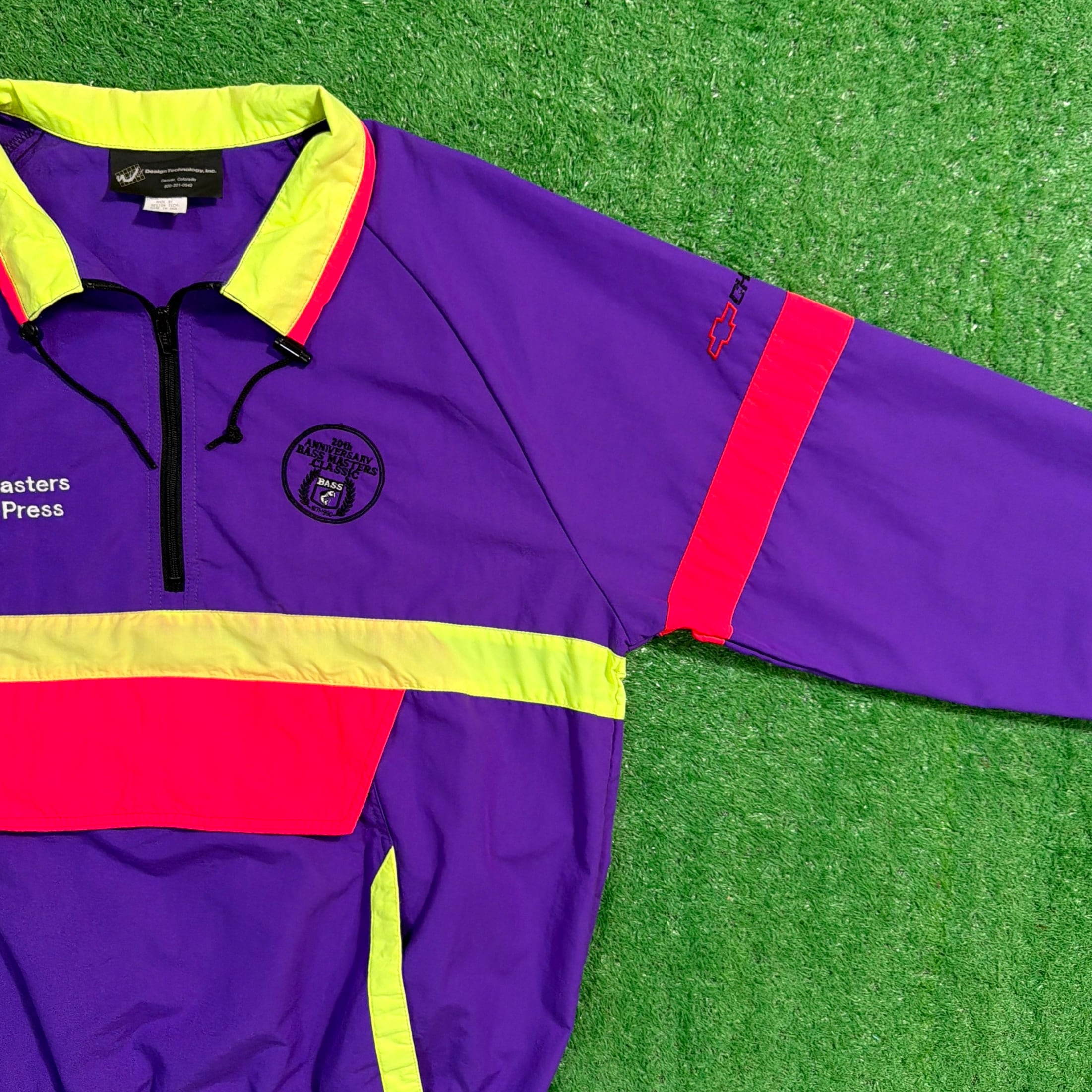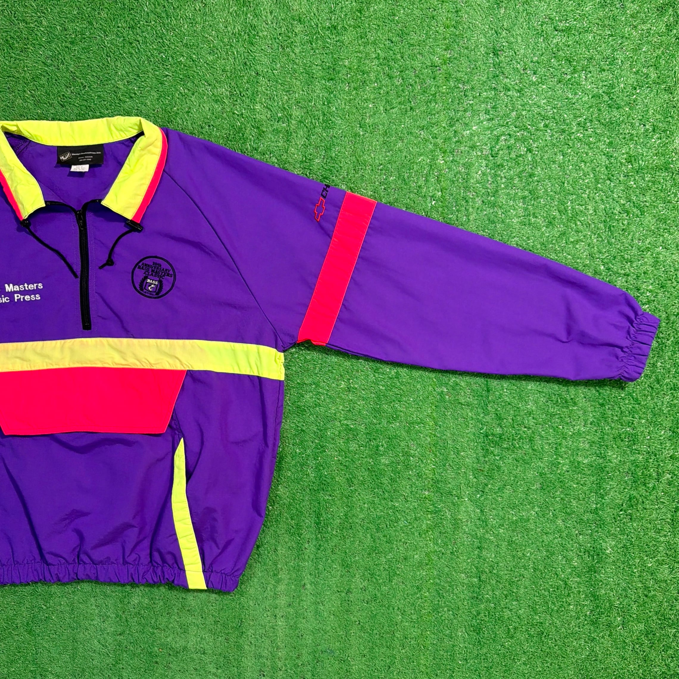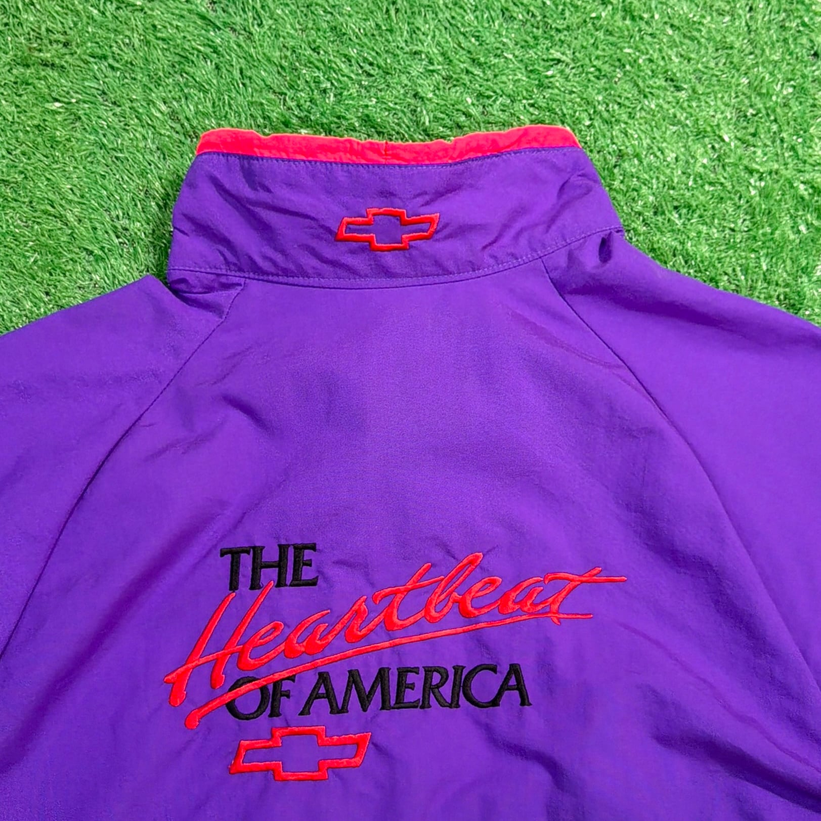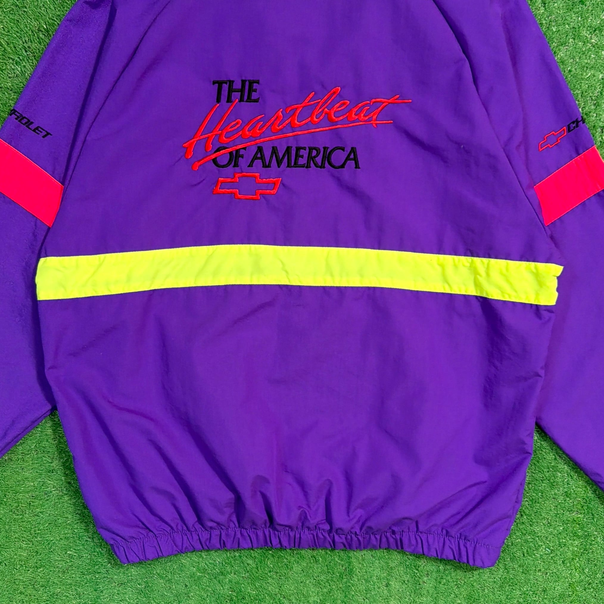 背中には当時のChevroletのスローガン「The Heartbeat of America」の刺繍入りで、アメリカのフィッシングカルチャーと企業スポンサー文化が色濃く反映された一着。パープルを基調に、イエローとレッドの切り替えが映える90sらしい配色も魅力です。