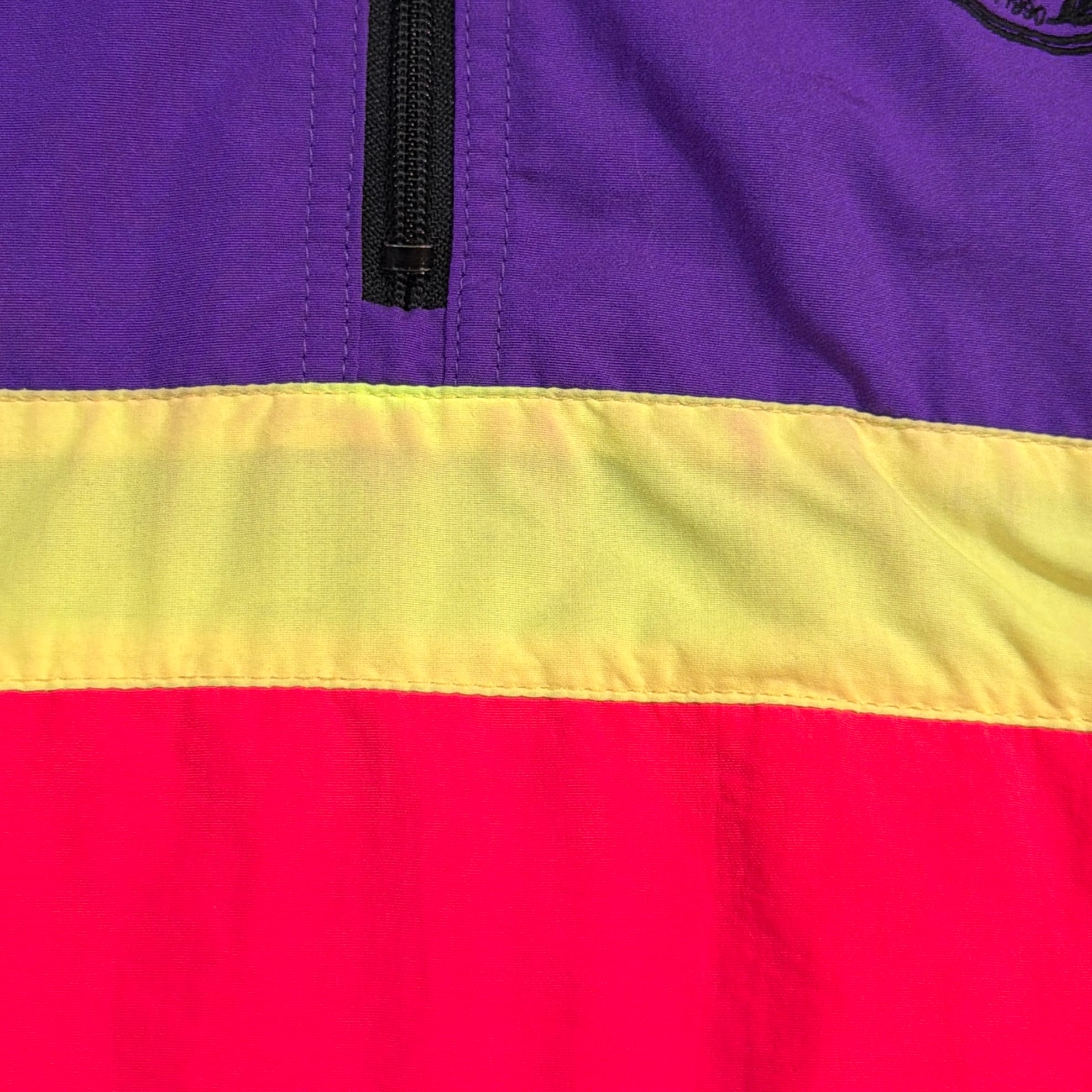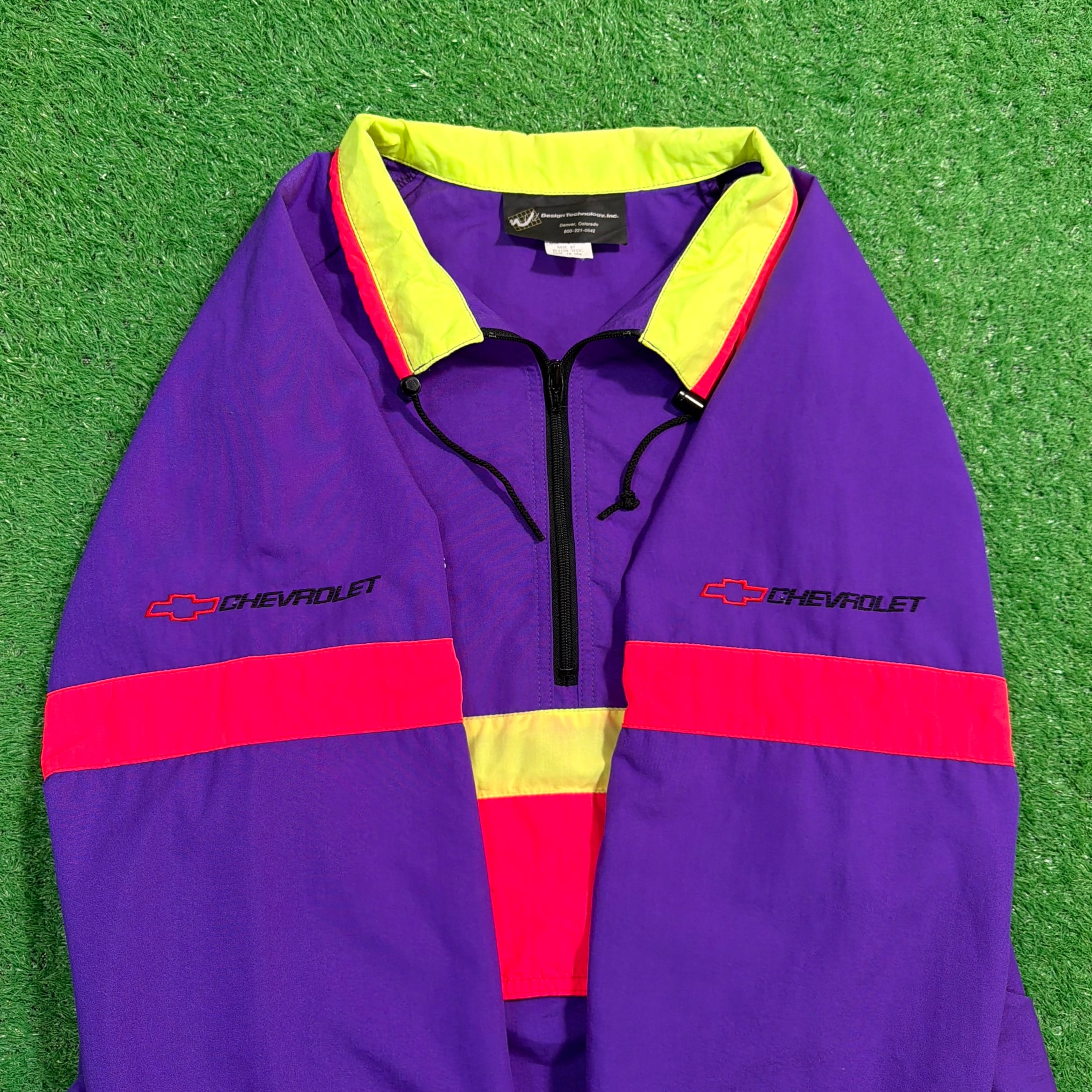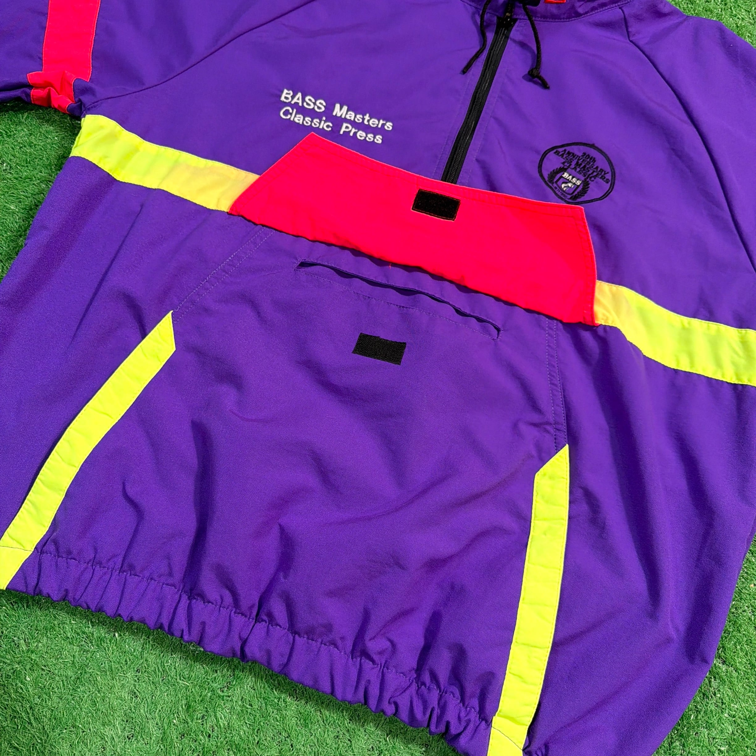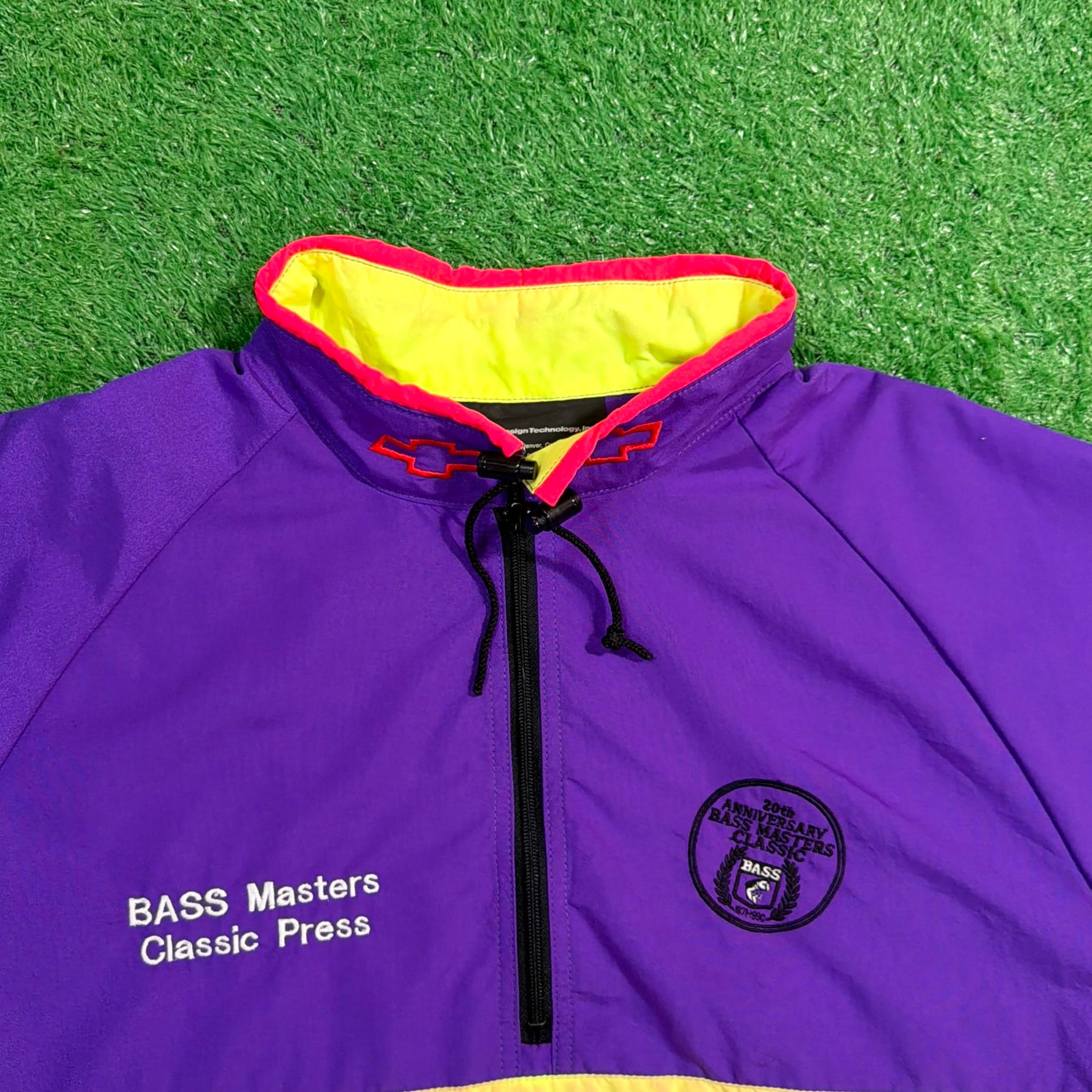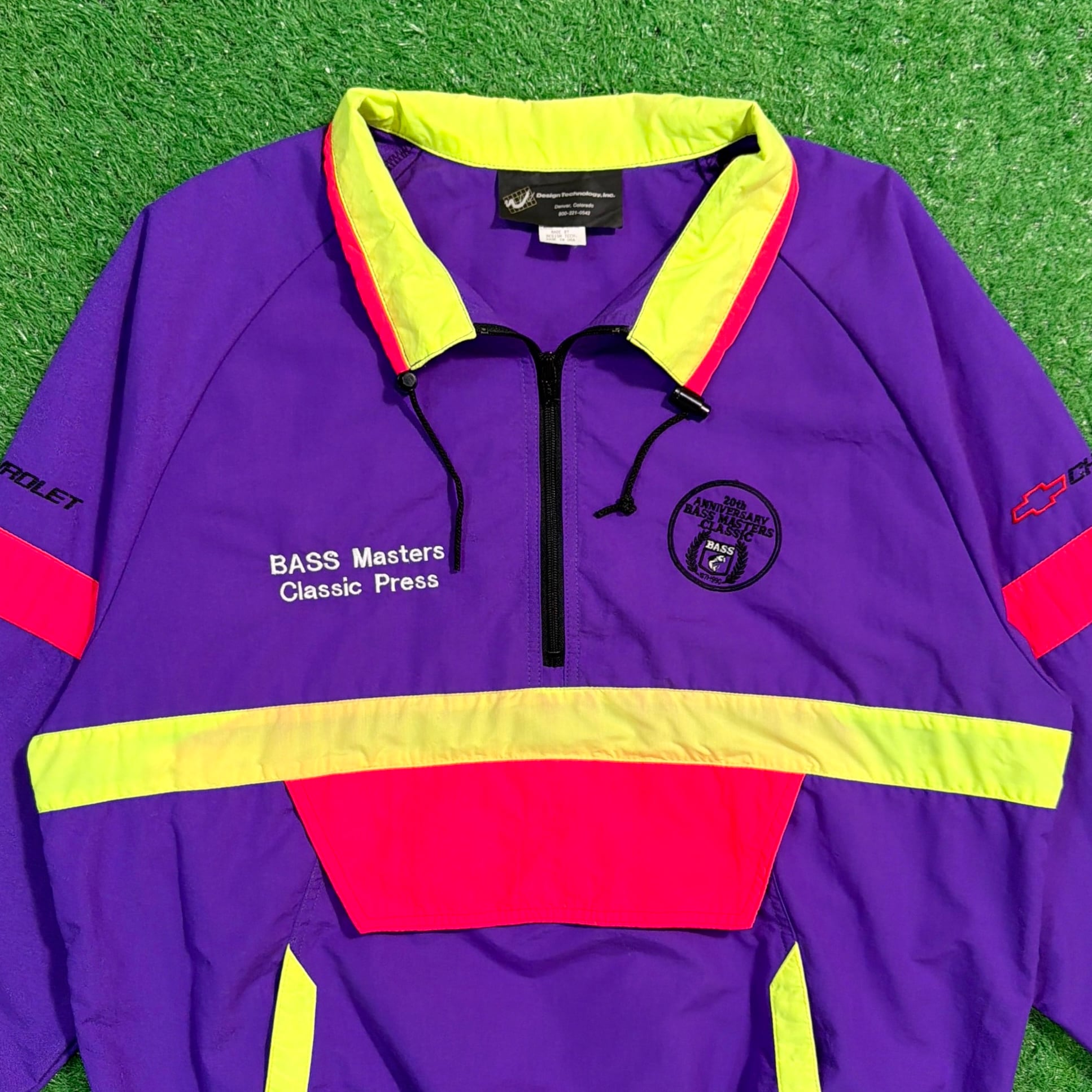 背中には当時のChevroletのスローガン「The Heartbeat of America」の刺繍入りで、アメリカのフィッシングカルチャーと企業スポンサー文化が色濃く反映された一着。パープルを基調に、イエローとレッドの切り替えが映える90sらしい配色も魅力です。