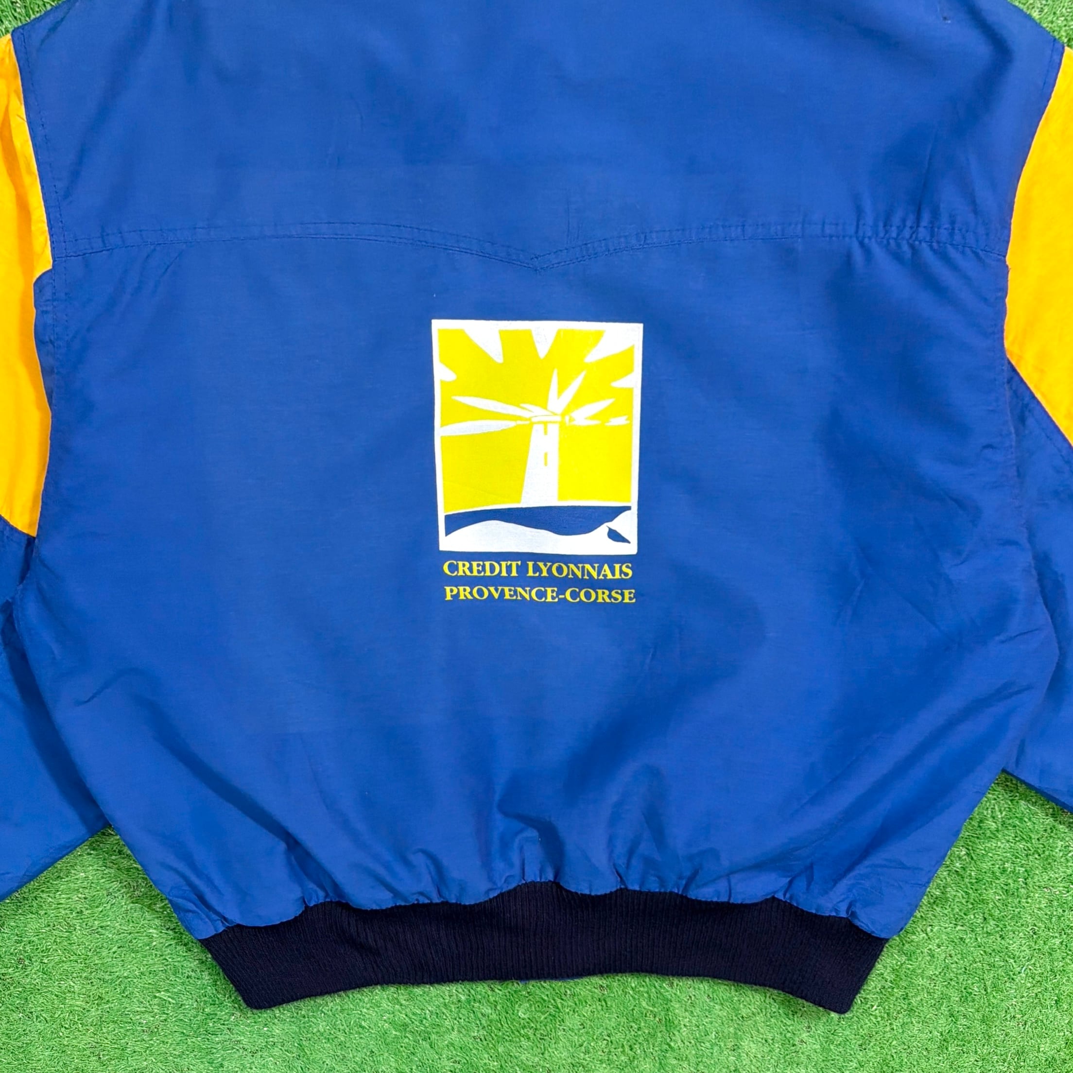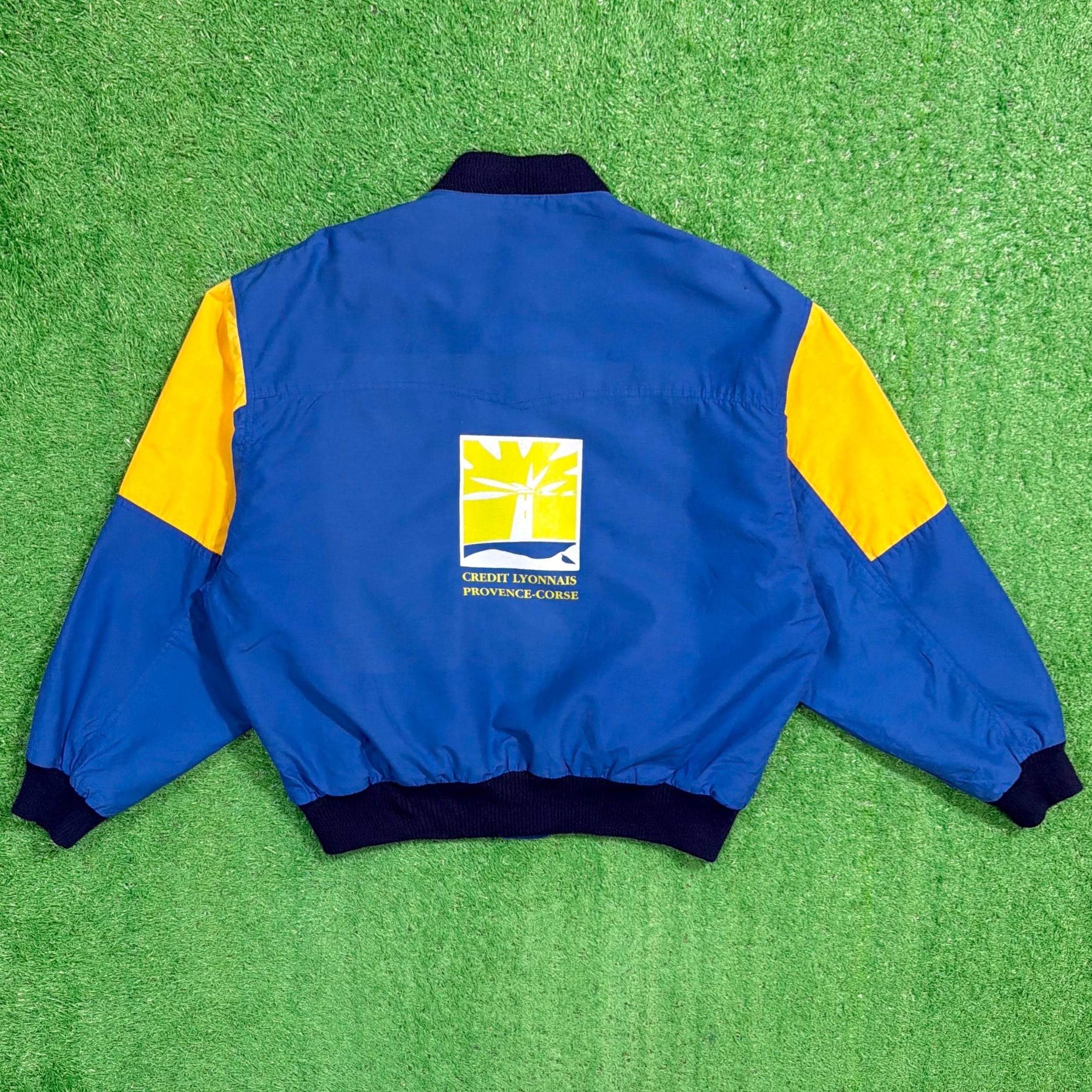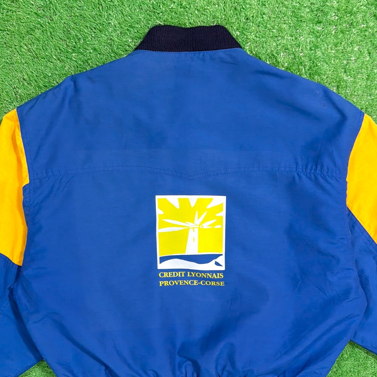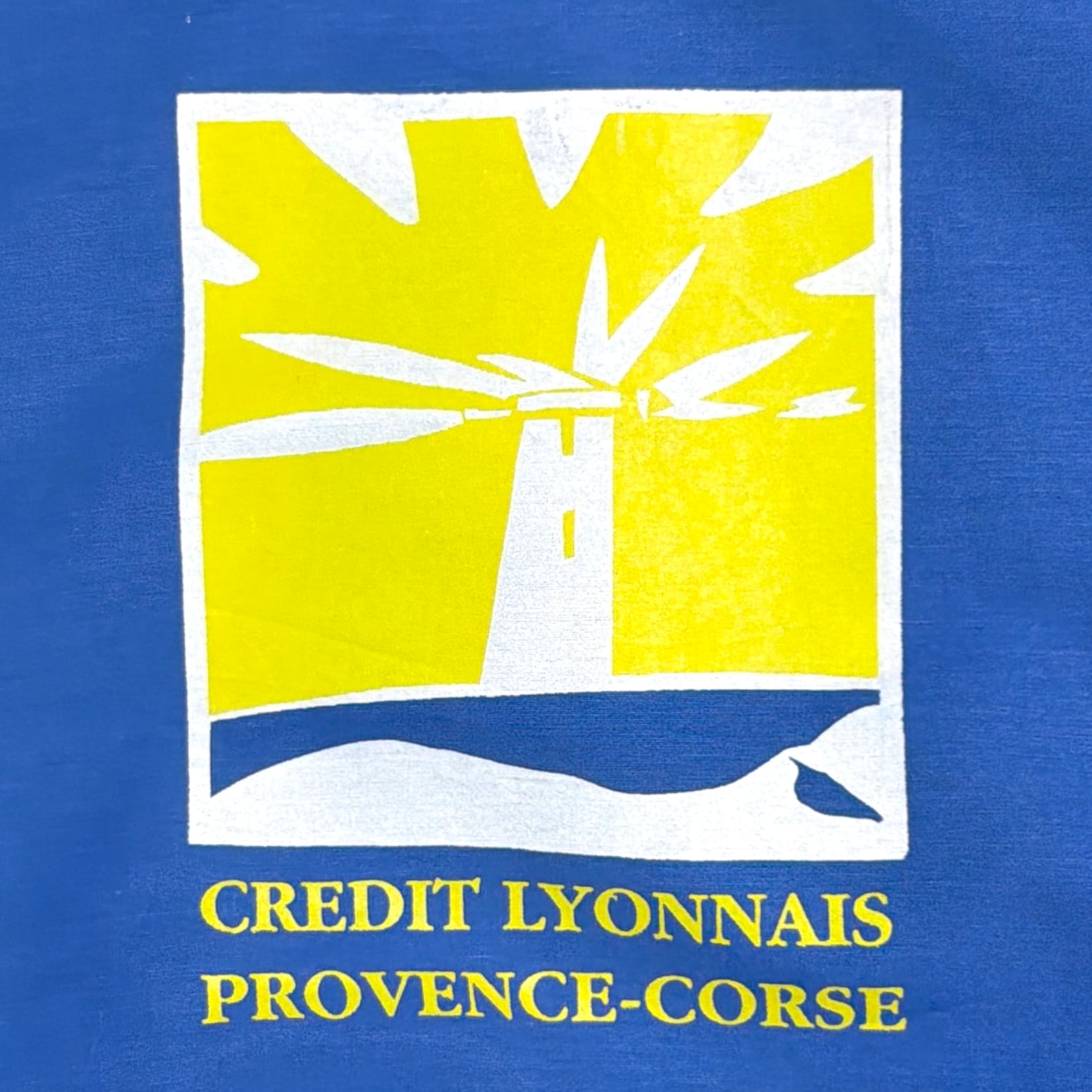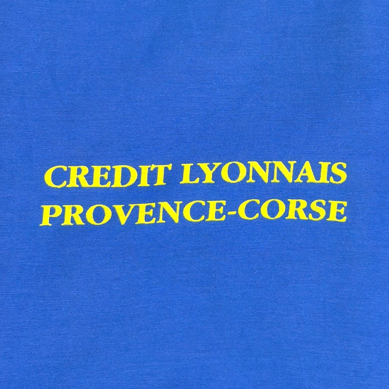 ブルー×イエローの切り返しデザインが印象的で、当時の企業ウェアらしい大胆な配色が目を引きます。背面とフロントには「Crédit Lyonnais Provence-Corse」のロゴが入り、フランス南部エリアの地域支店に関連したアイテムと思われます。ヨーロッパらしい企業モノならではの雰囲気と、80s〜90sらしいスポーティーなシルエットが魅力です。