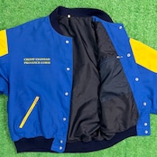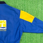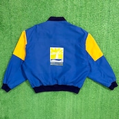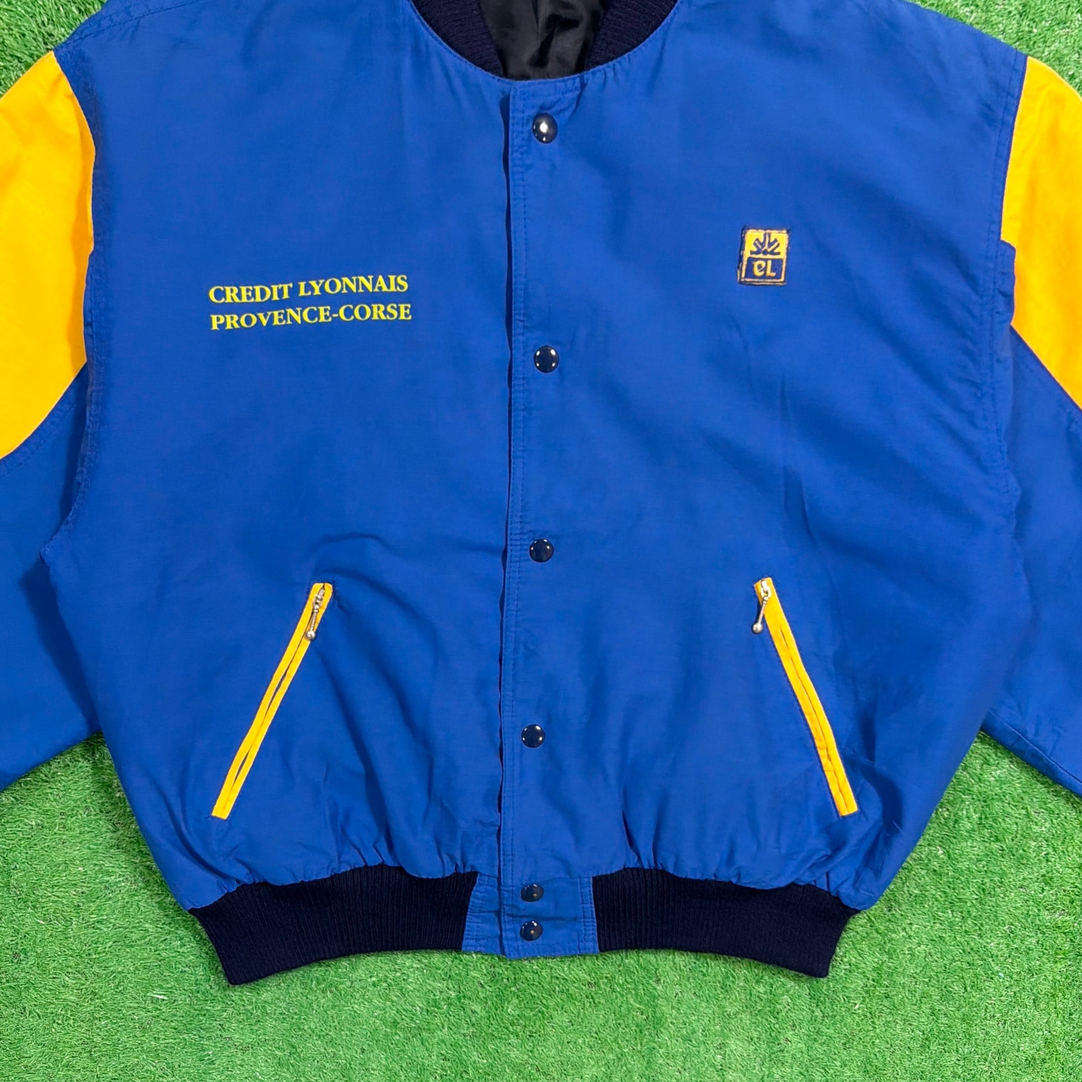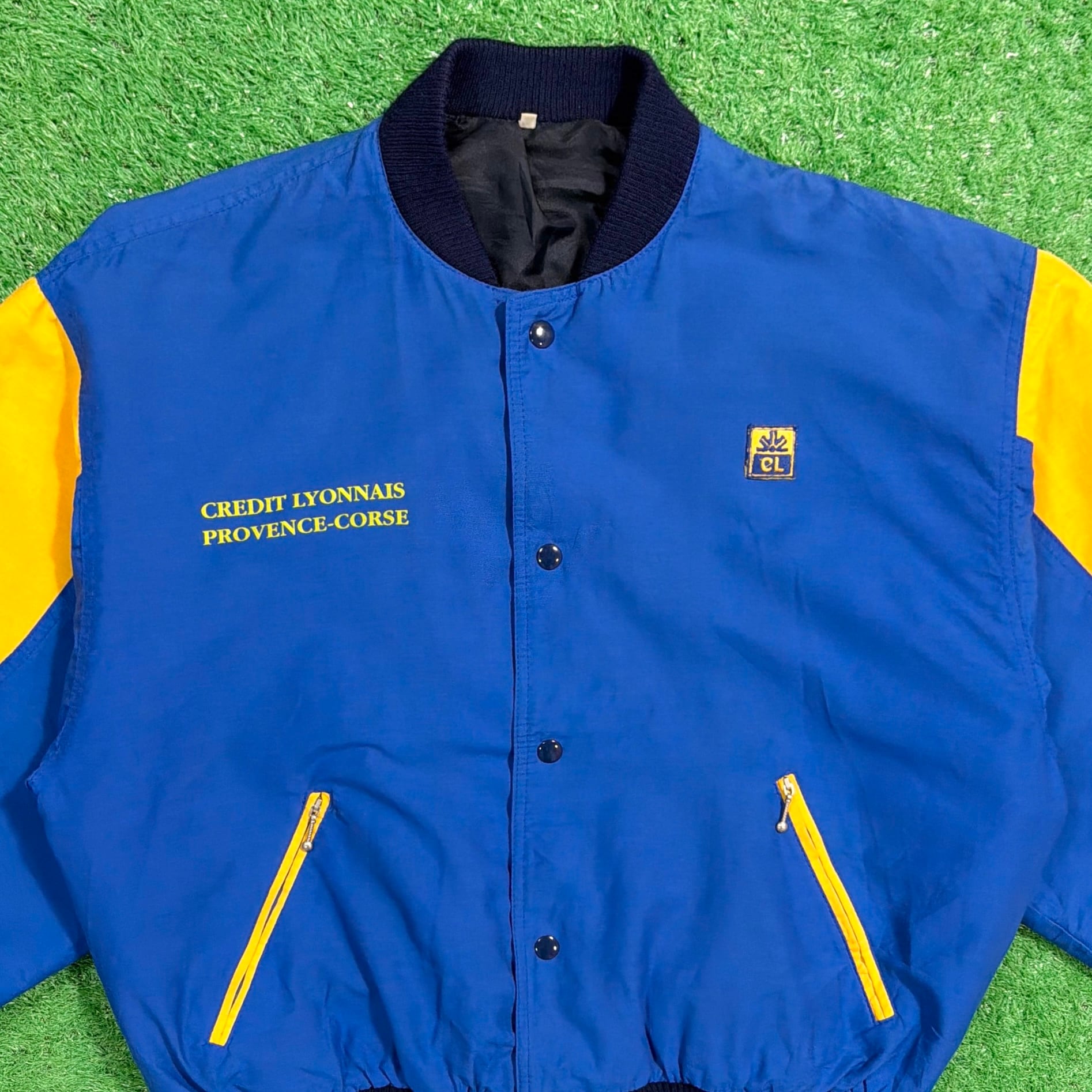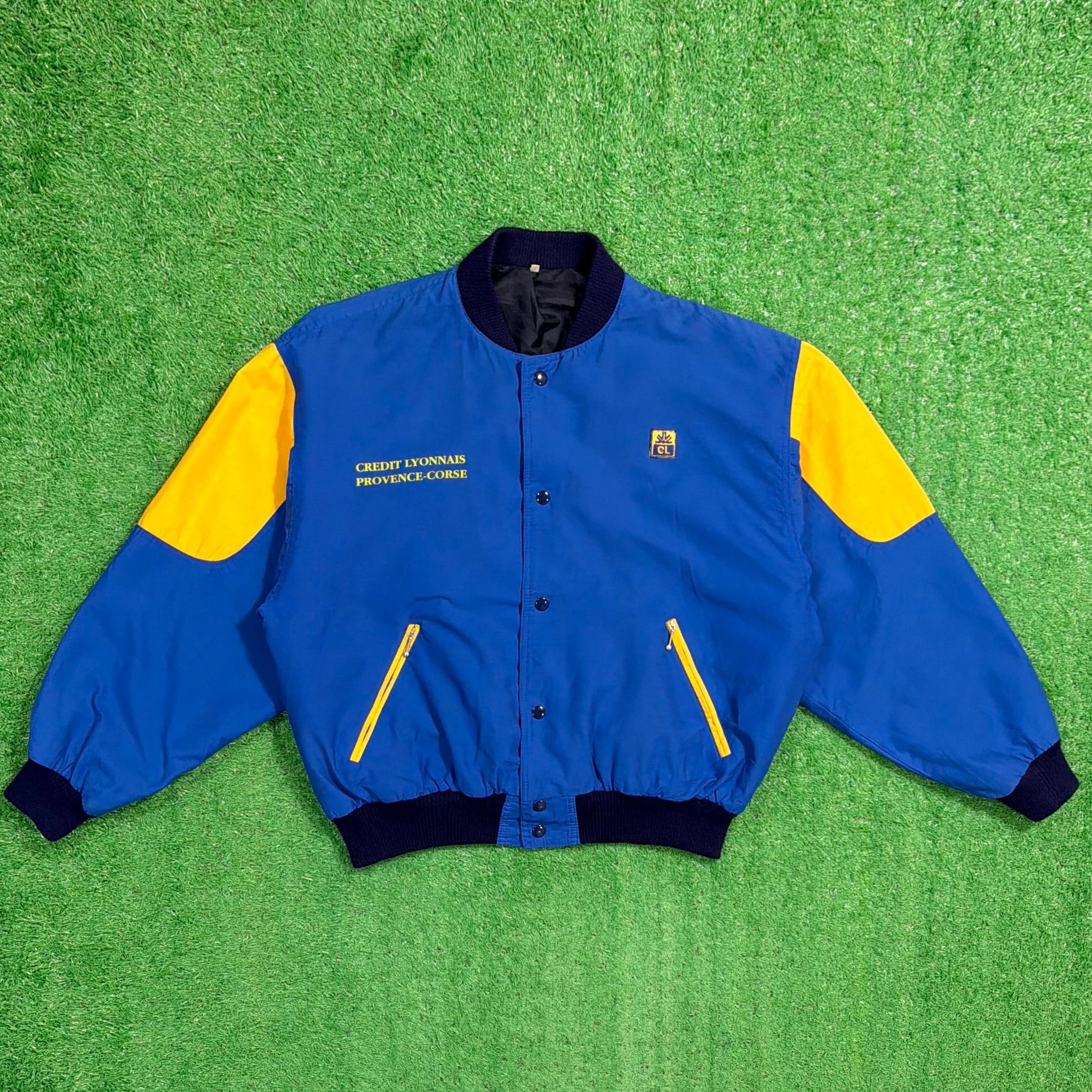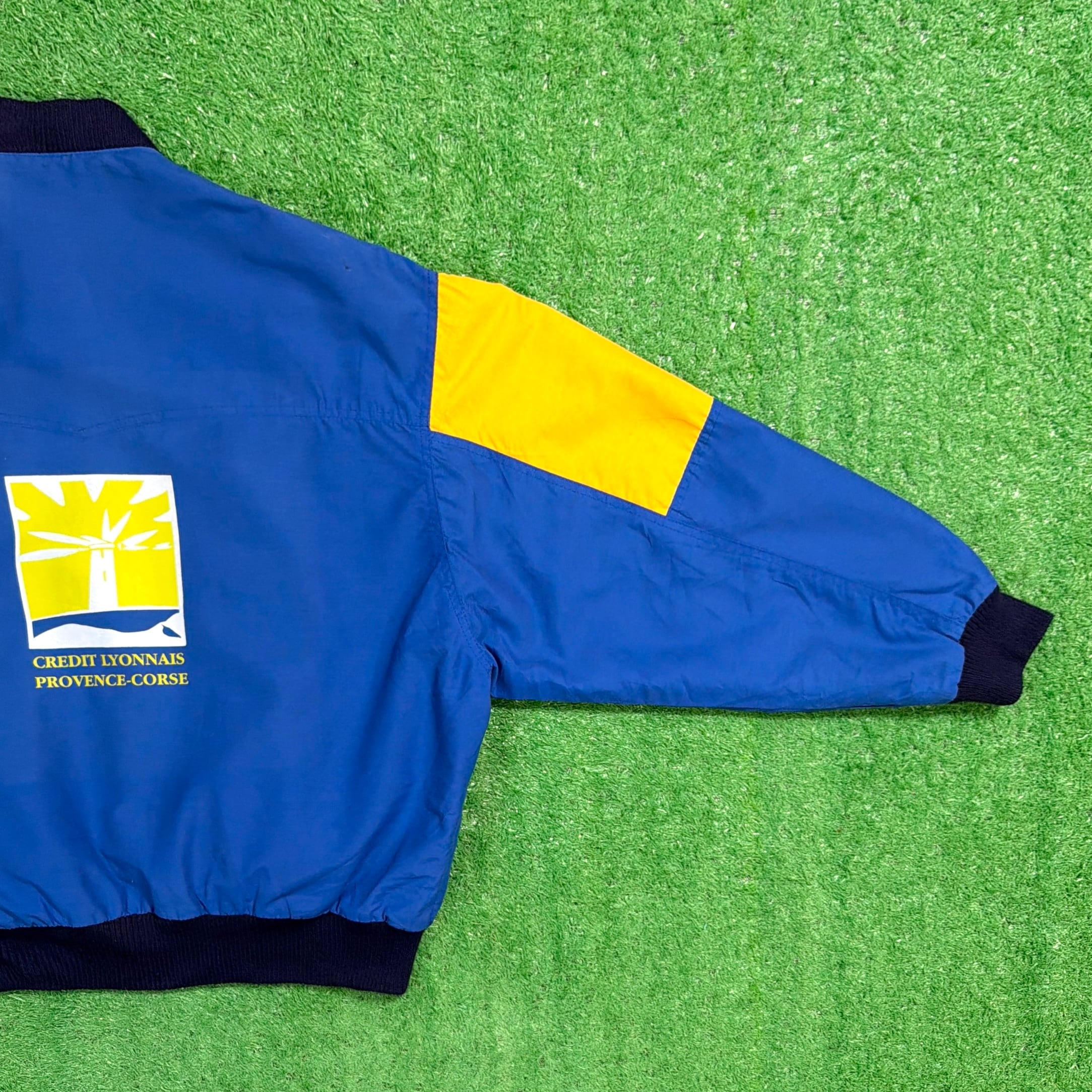 ブルー×イエローの切り返しデザインが印象的で、当時の企業ウェアらしい大胆な配色が目を引きます。背面とフロントには「Crédit Lyonnais Provence-Corse」のロゴが入り、フランス南部エリアの地域支店に関連したアイテムと思われます。ヨーロッパらしい企業モノならではの雰囲気と、80s〜90sらしいスポーティーなシルエットが魅力です。