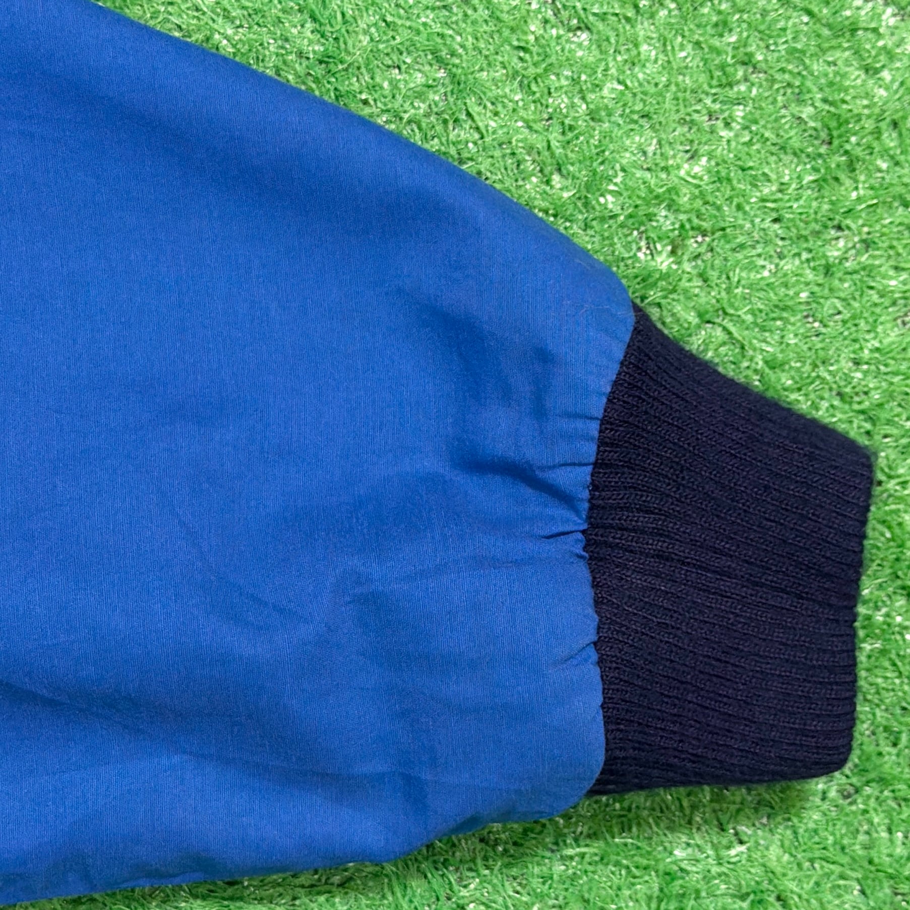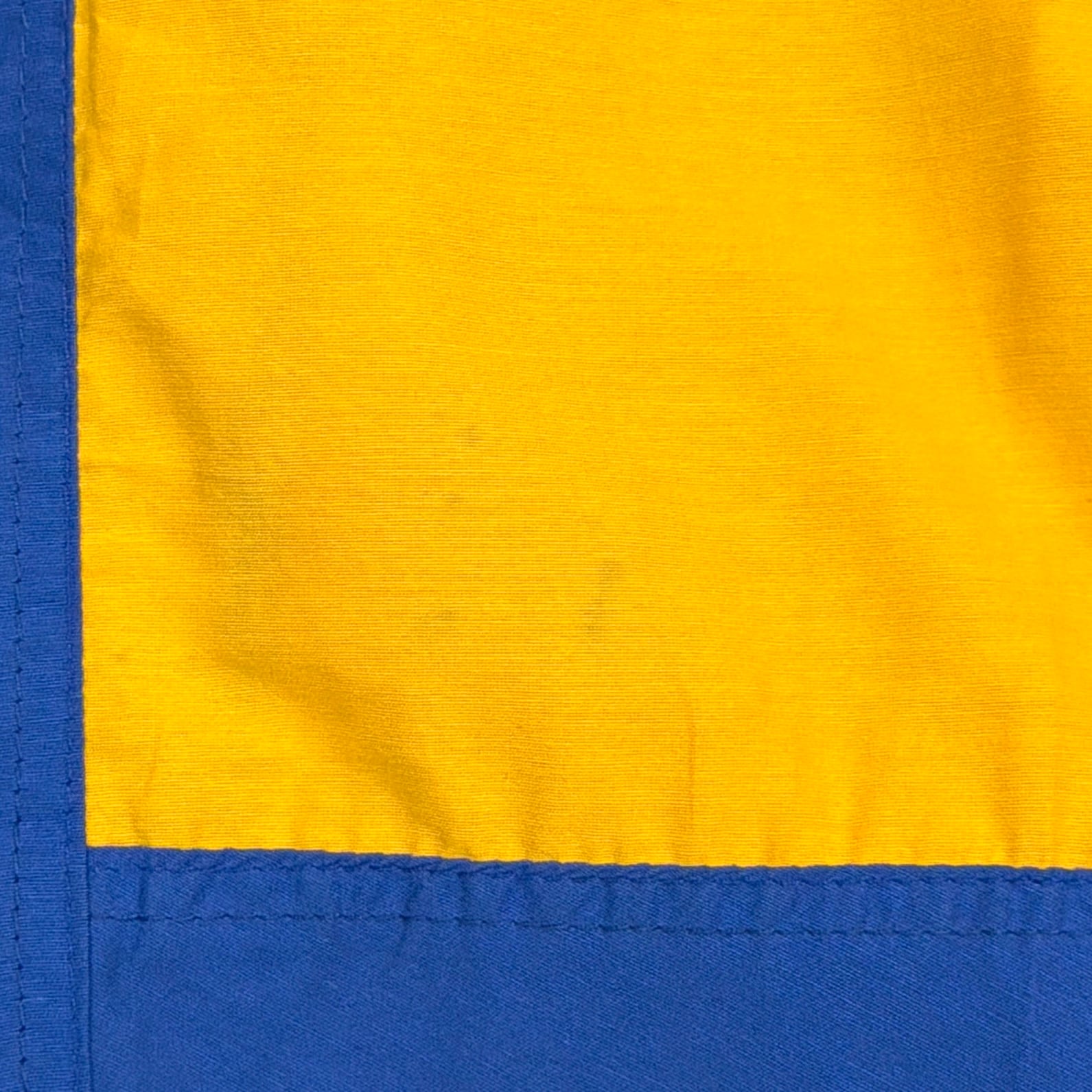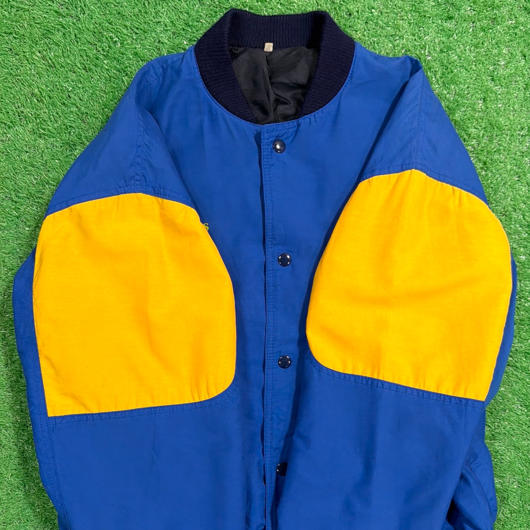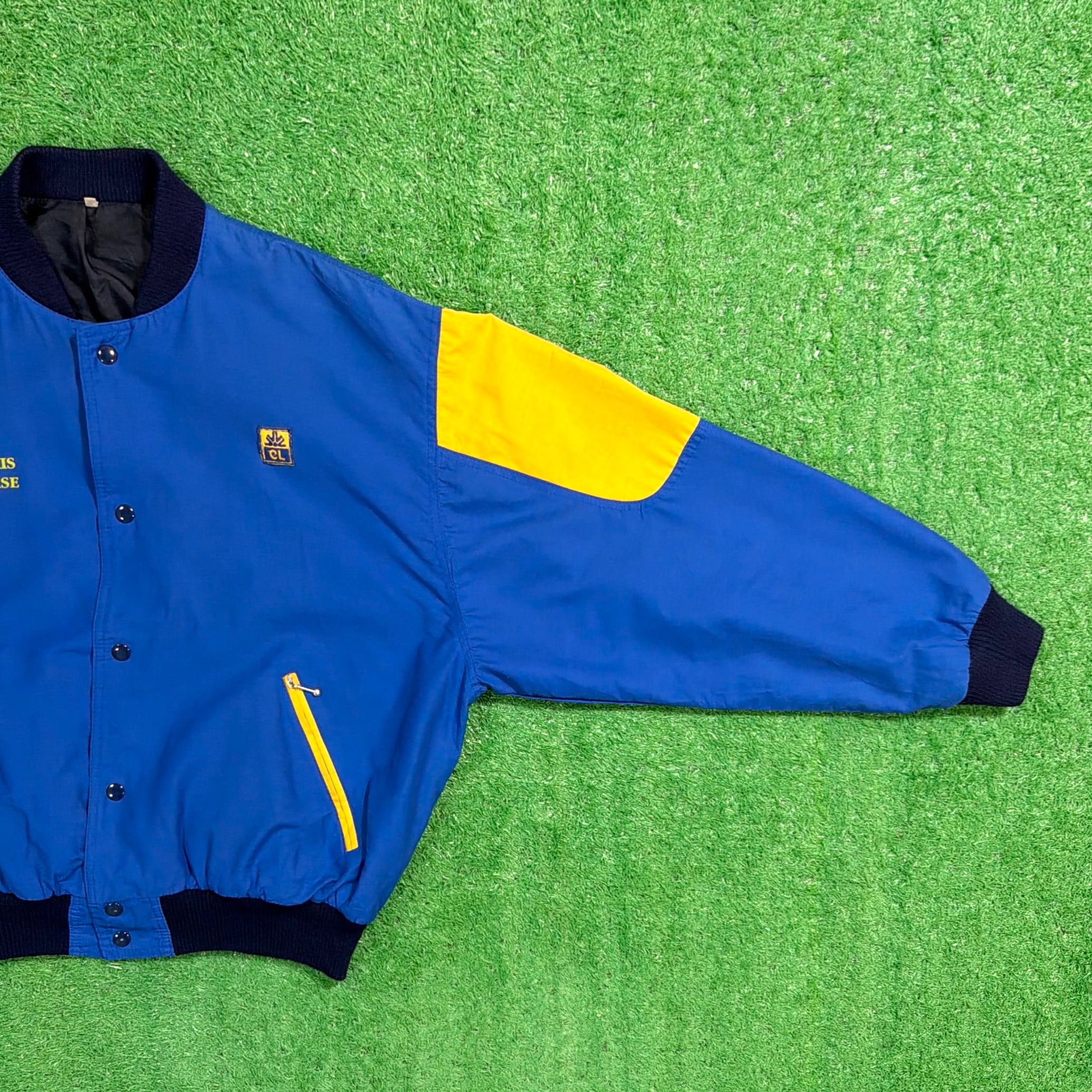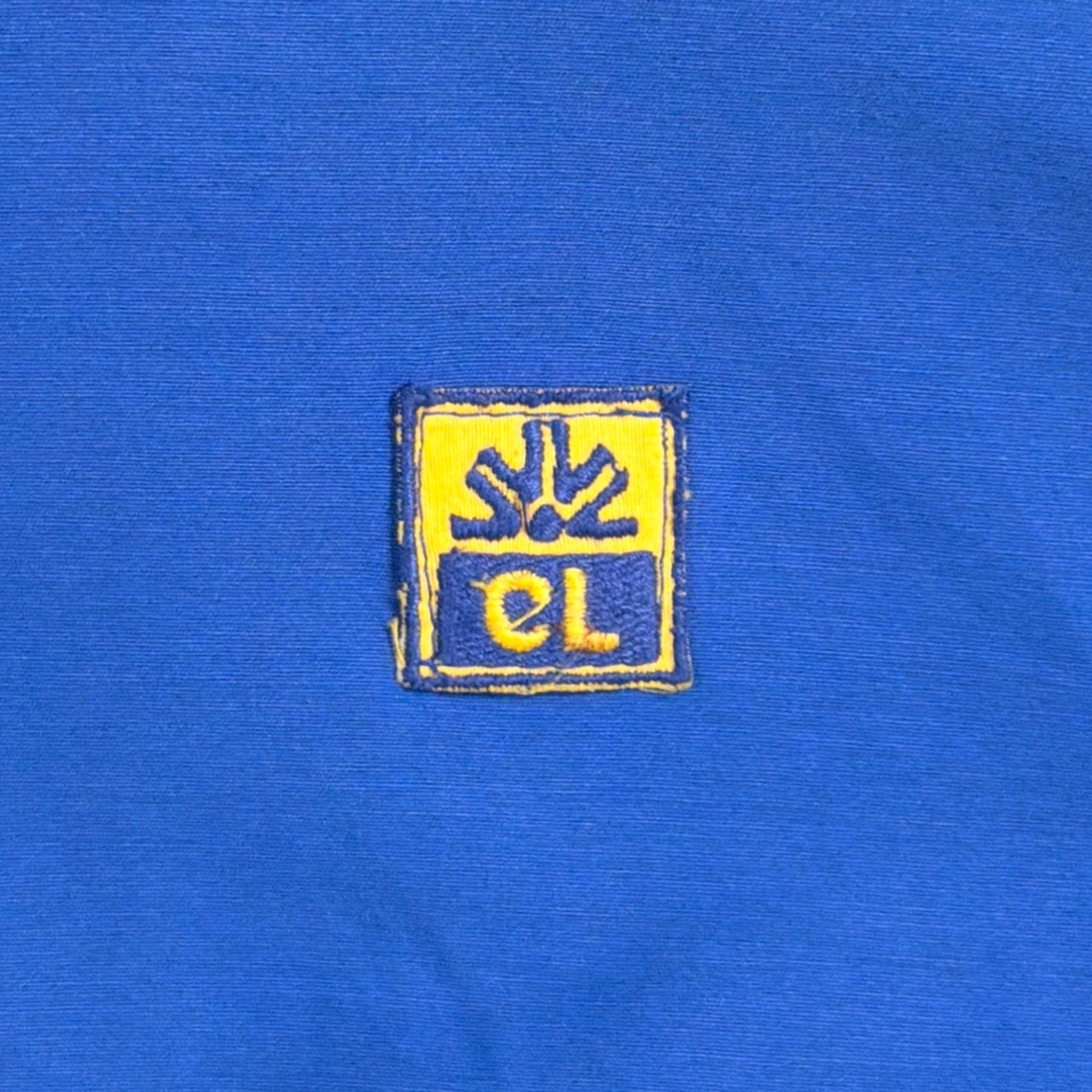ブルー×イエローの切り返しデザインが印象的で、当時の企業ウェアらしい大胆な配色が目を引きます。背面とフロントには「Crédit Lyonnais Provence-Corse」のロゴが入り、フランス南部エリアの地域支店に関連したアイテムと思われます。ヨーロッパらしい企業モノならではの雰囲気と、80s〜90sらしいスポーティーなシルエットが魅力です。