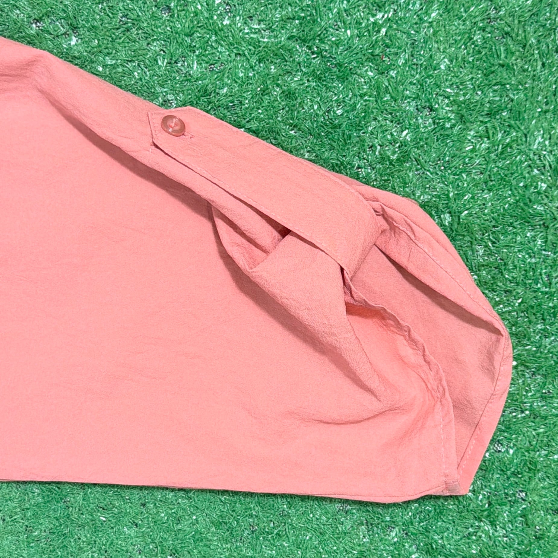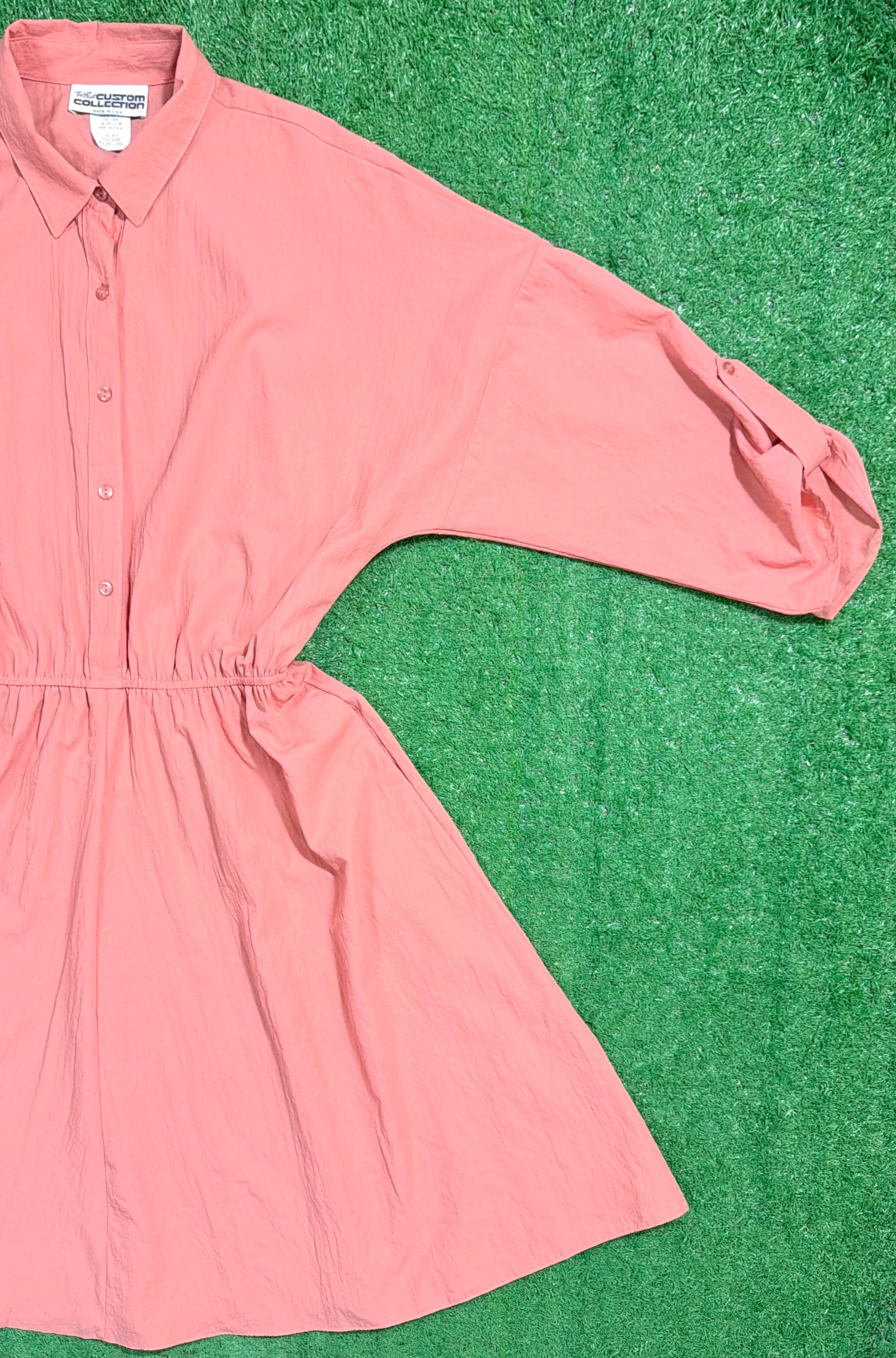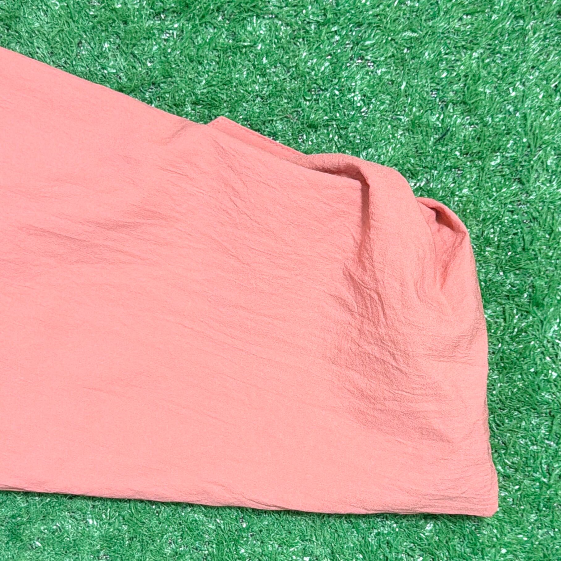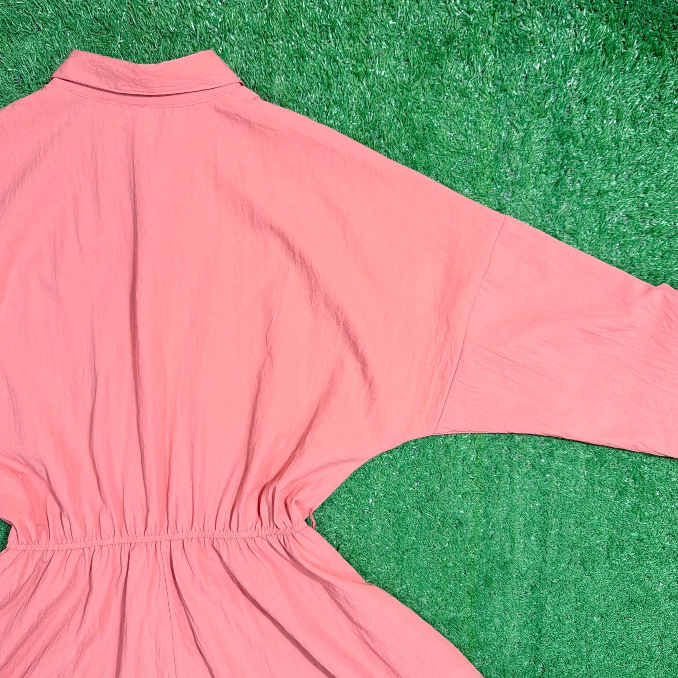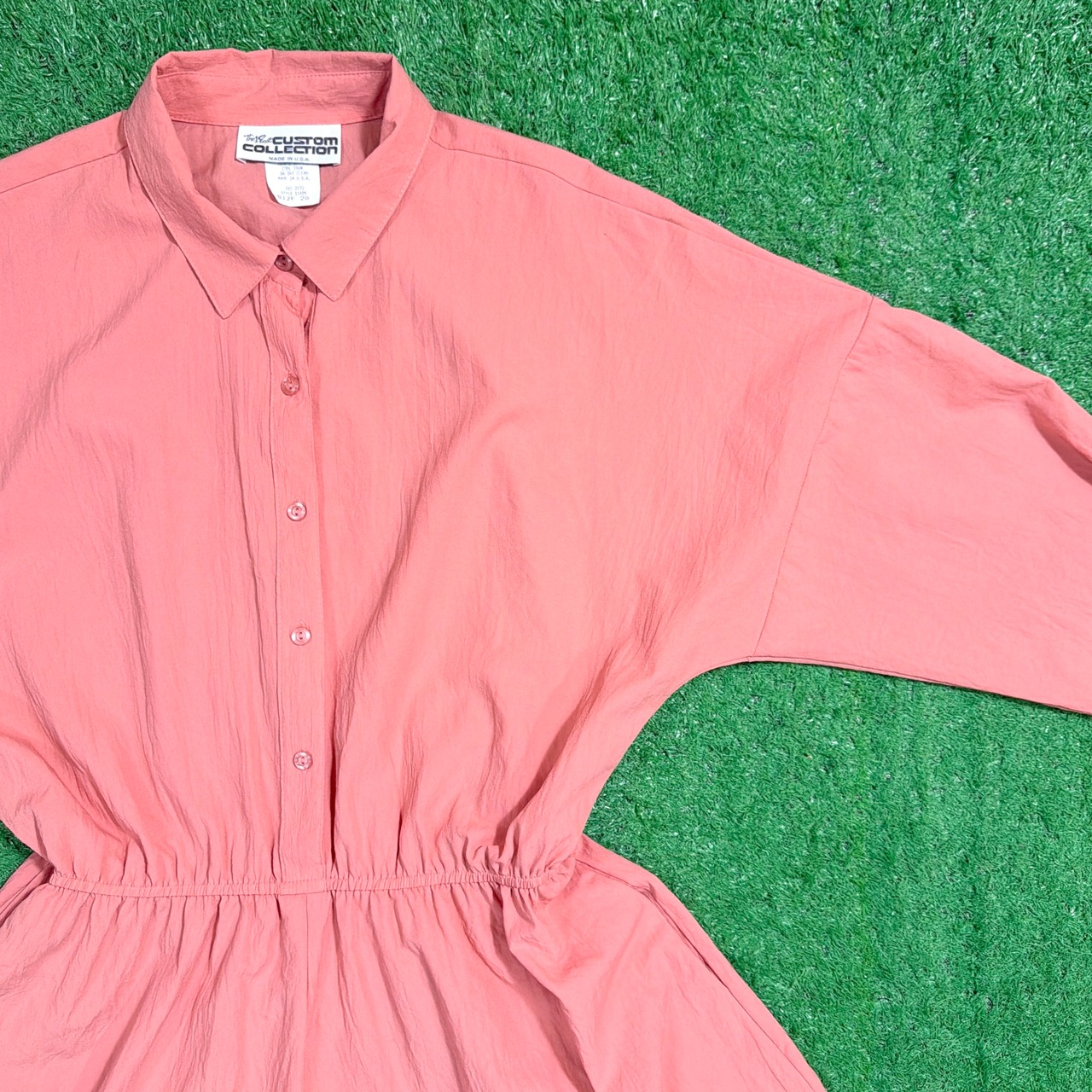 肩が大きく落ちるドロップショルダーデザインで、全体的にリラックス感のあるシルエット。素材はシャカシャカとした軽いポリエステル生地で、80sらしいスポーティーさと軽快な着心地が魅力。袖は七分袖くらいの丈感で、袖口のボタンを使ってロールアップされたようなデザインになっています。