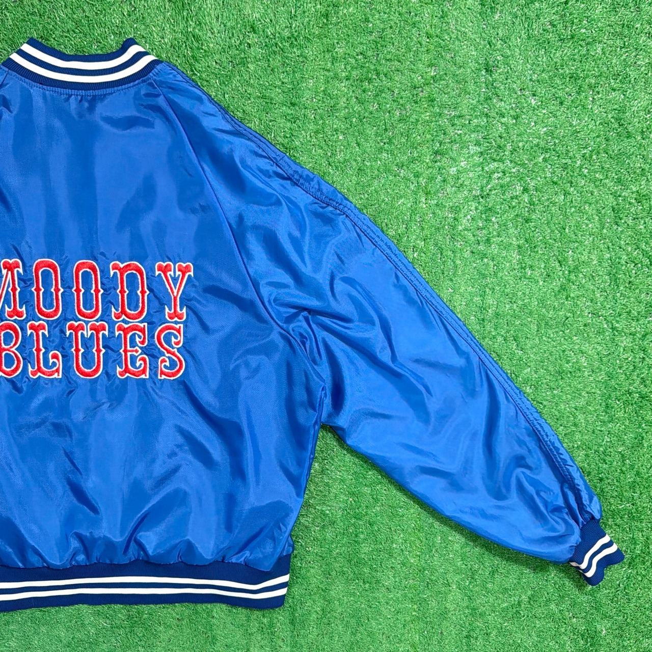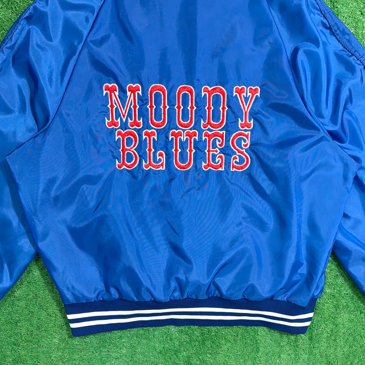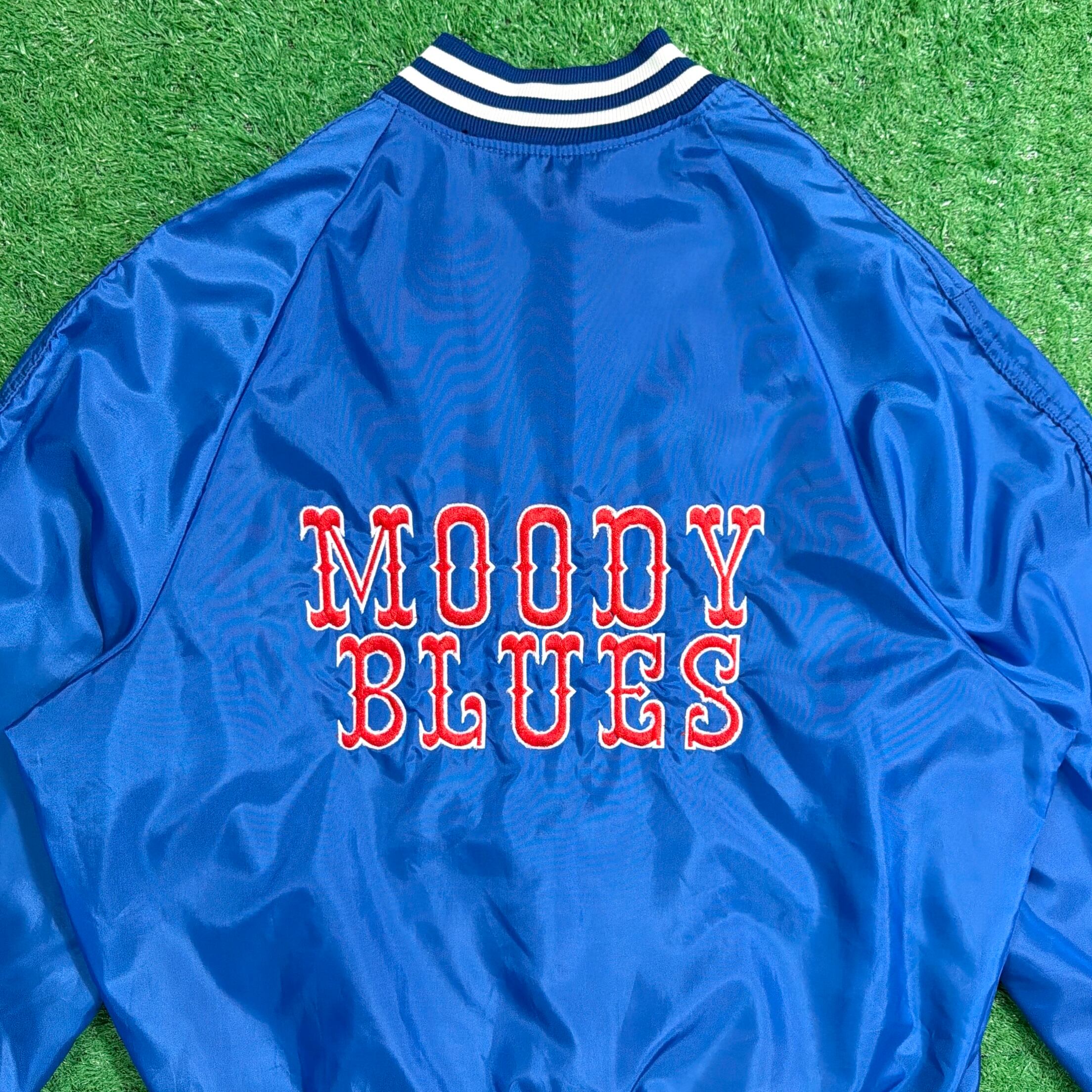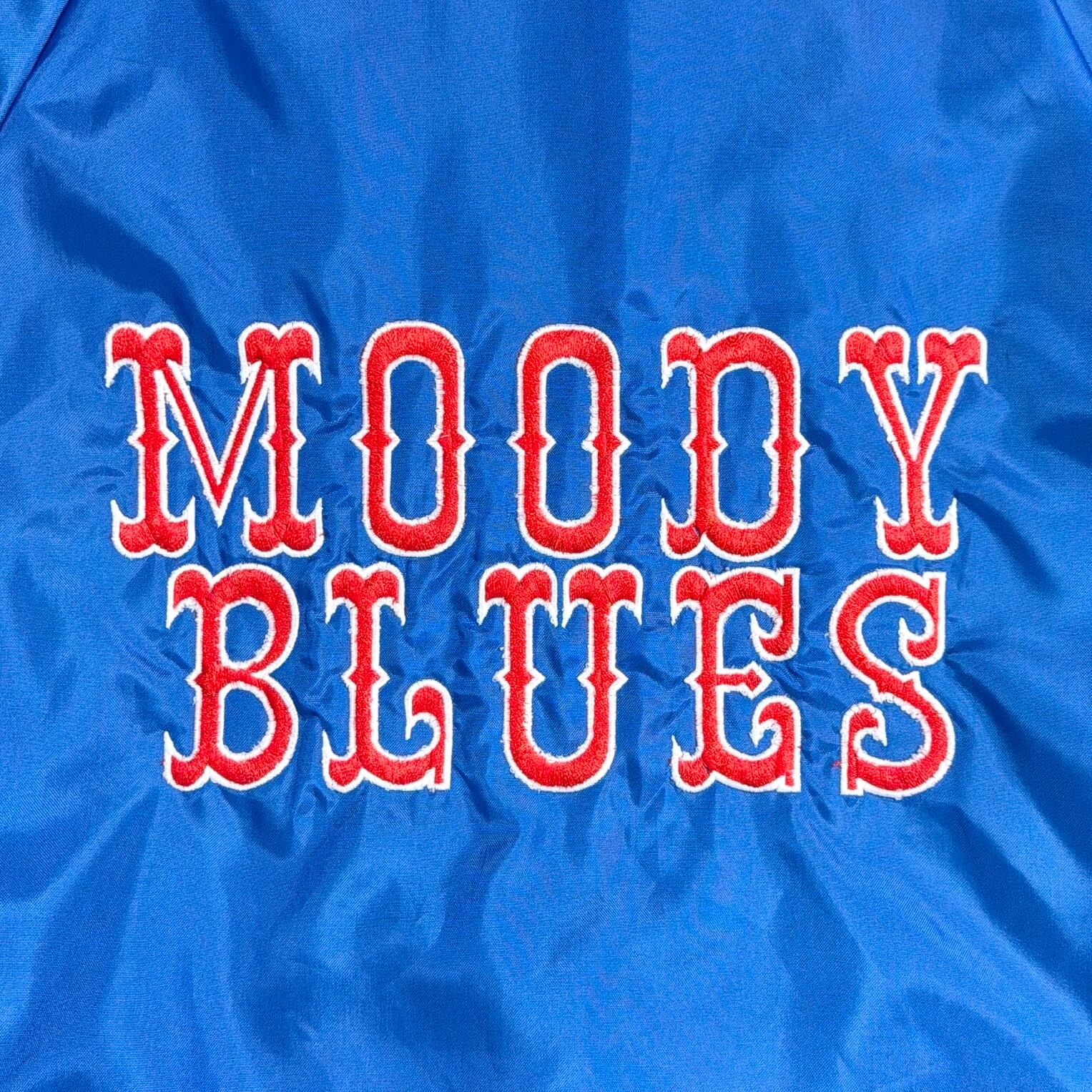 1980年代のアメリカ製、「MOODY BLUES」のハーフボタン仕様サテンジャケットです。