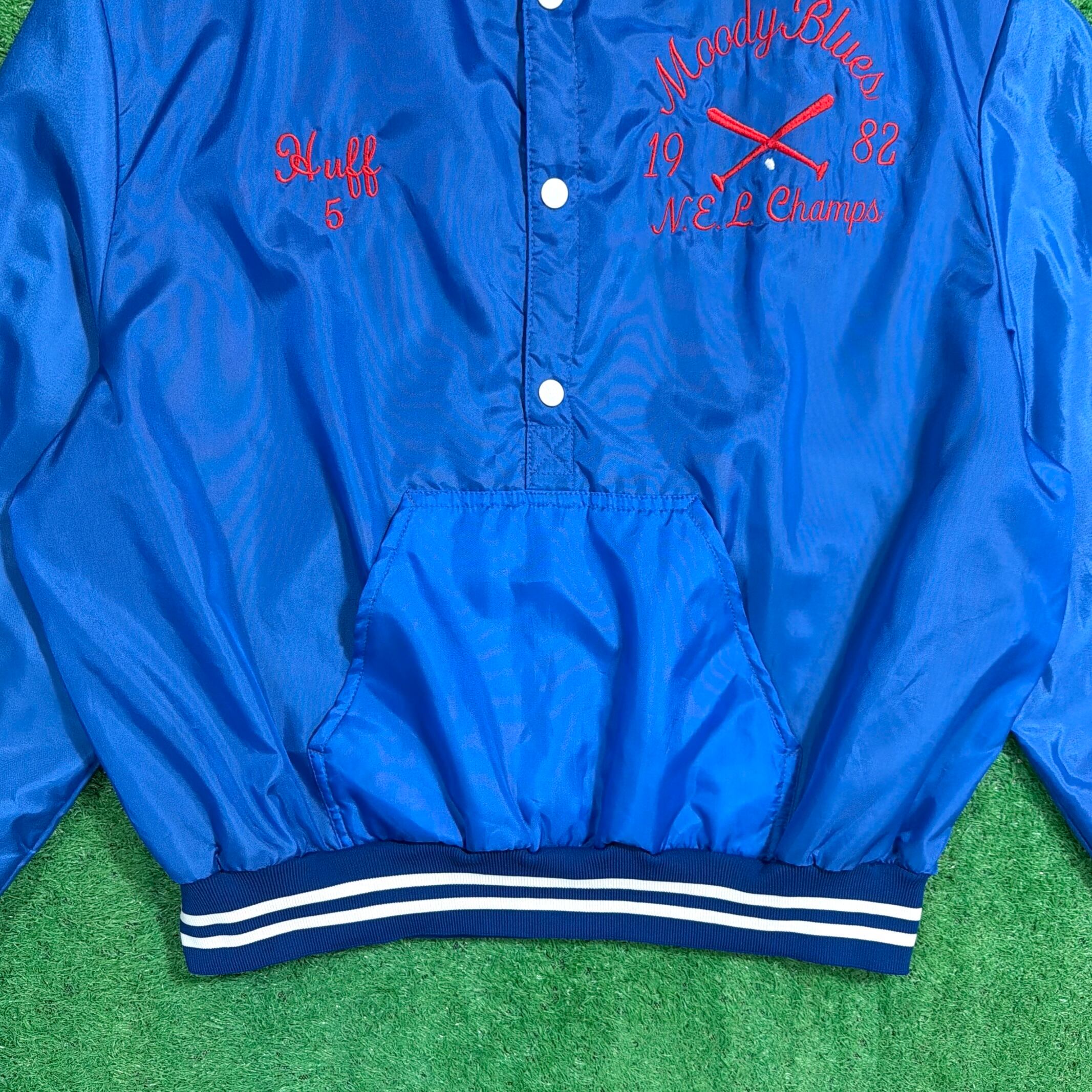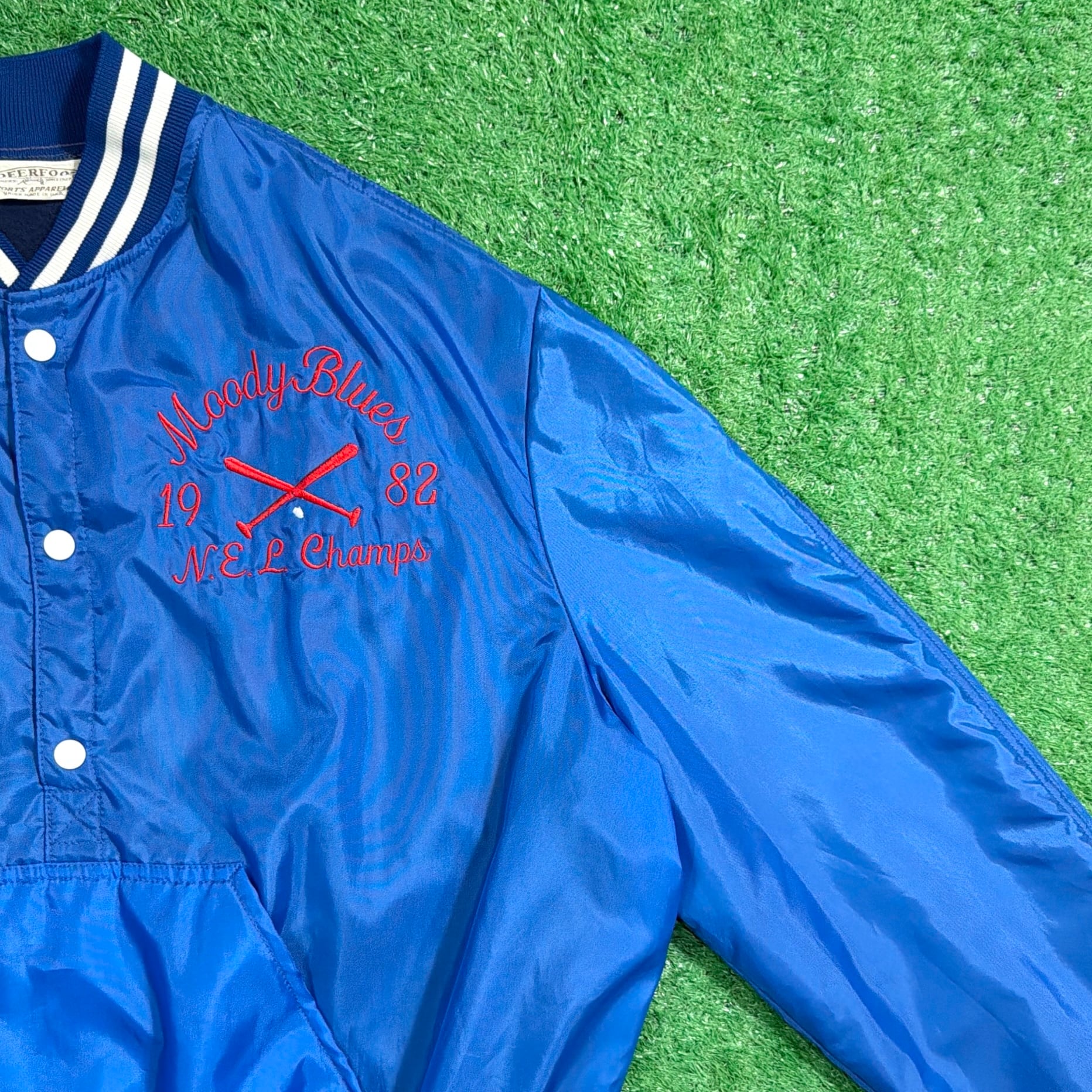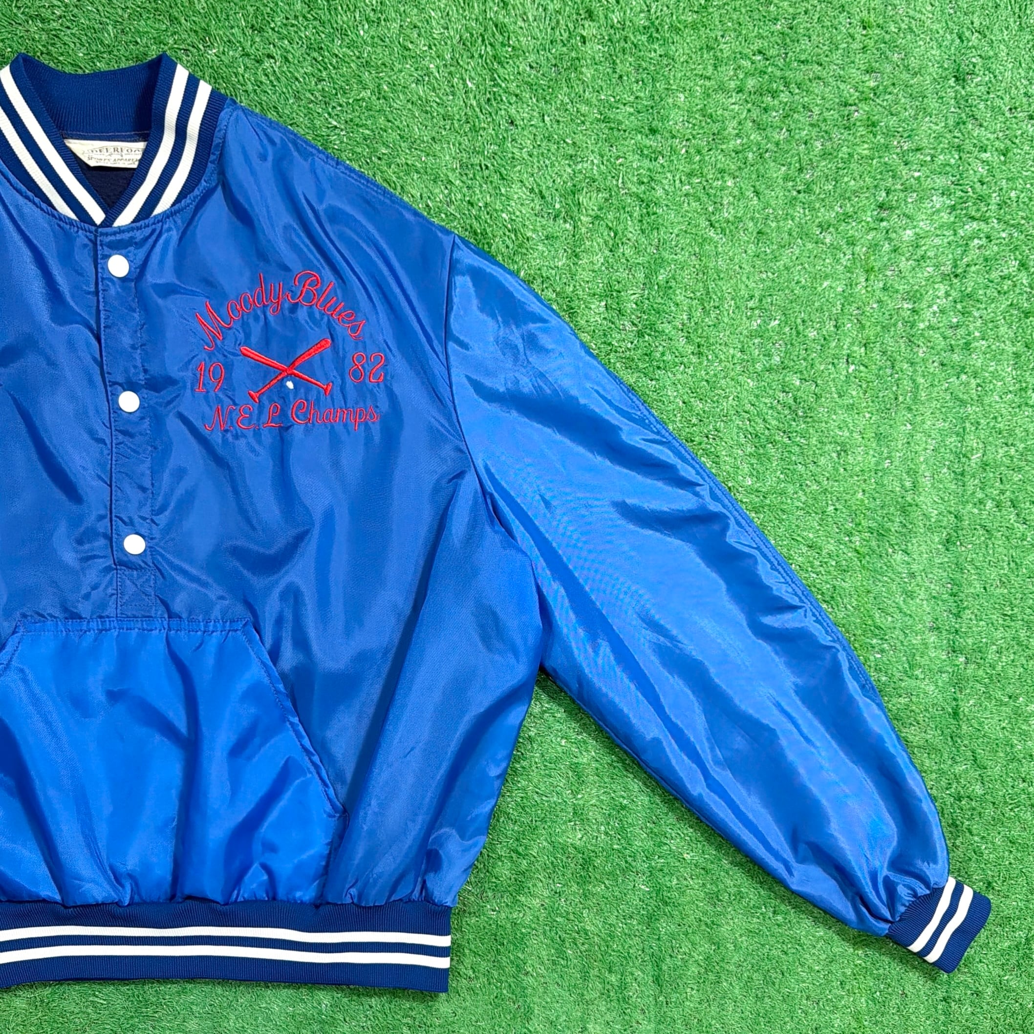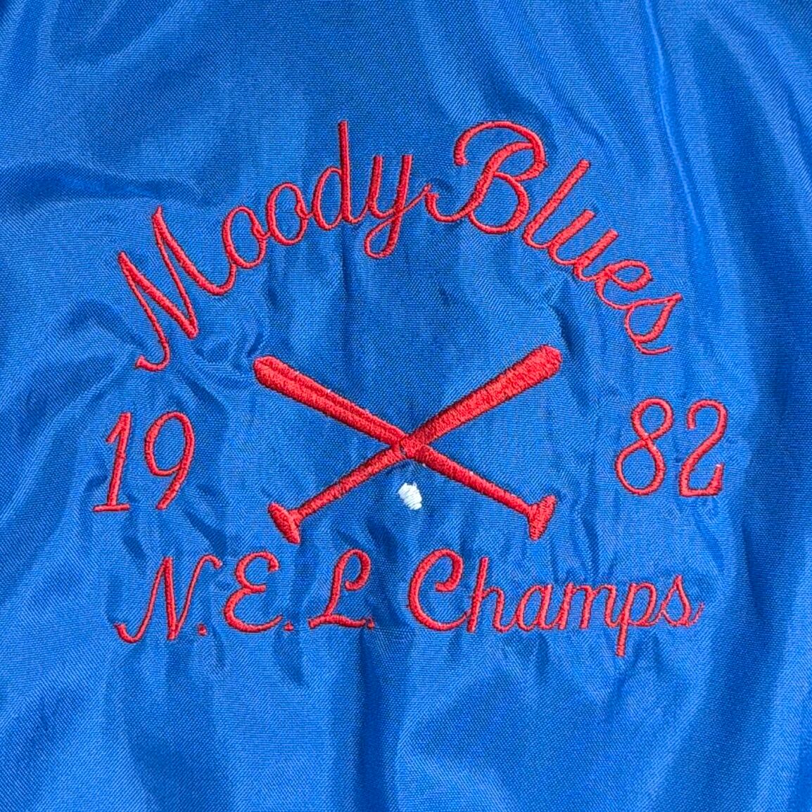 1980年代のアメリカ製、「MOODY BLUES」のハーフボタン仕様サテンジャケットです。