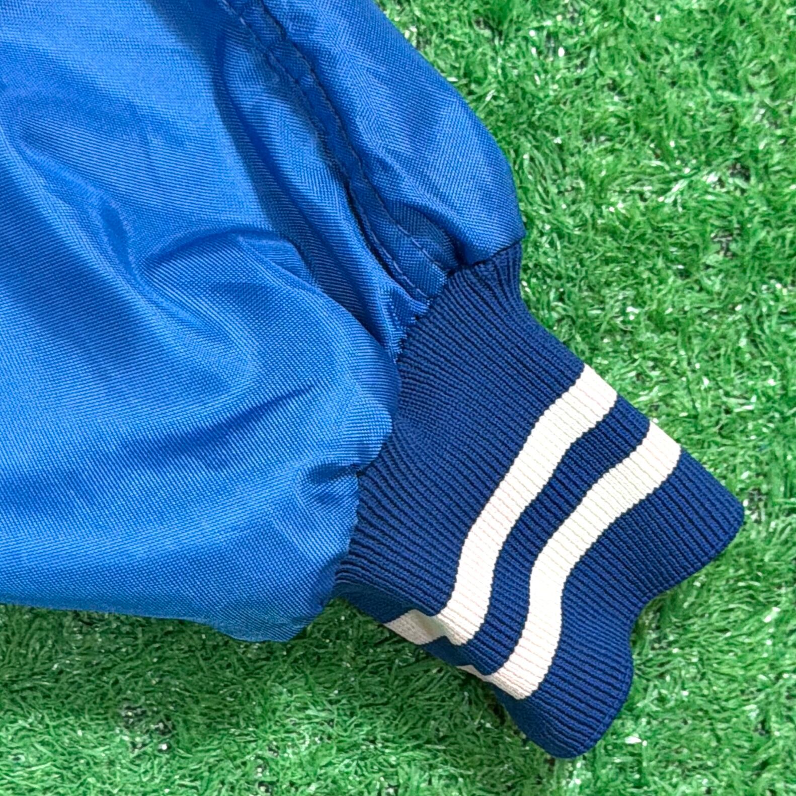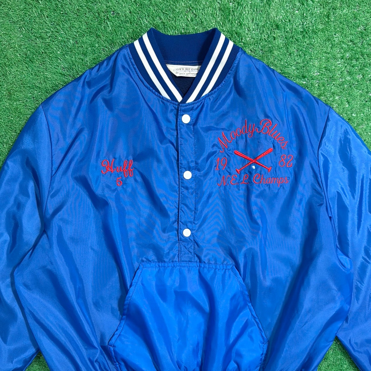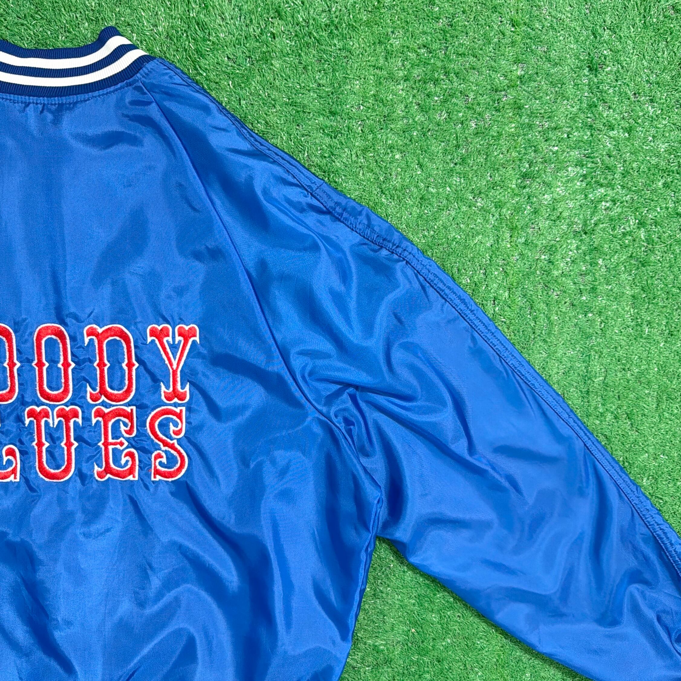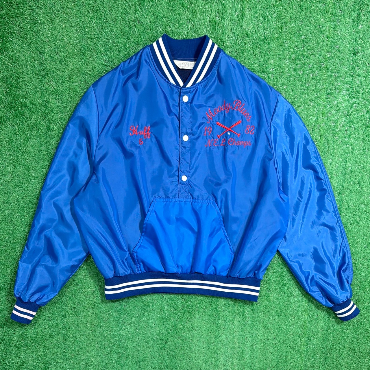 1980年代のアメリカ製、「MOODY BLUES」のハーフボタン仕様サテンジャケットです。