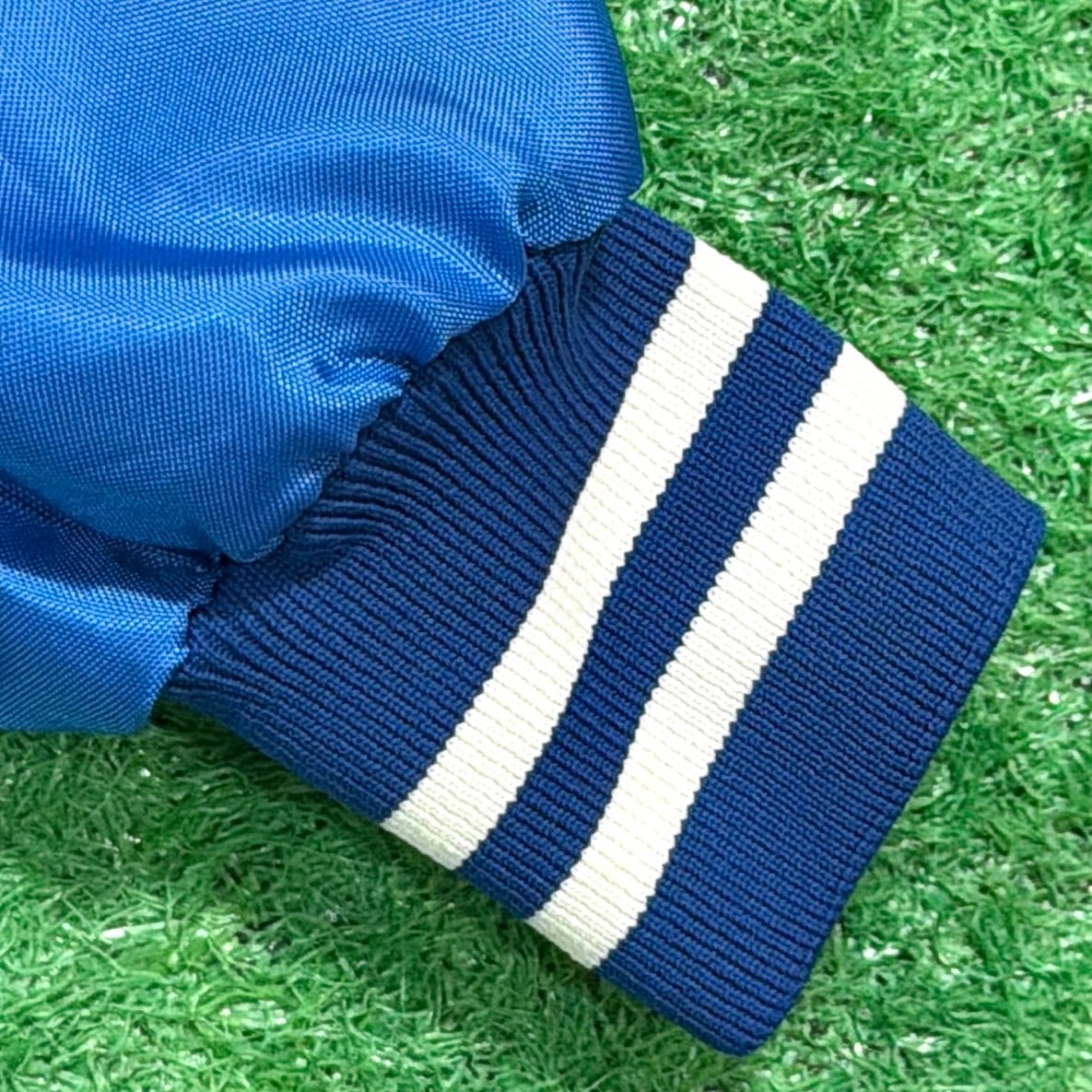 光沢感のあるサテン素材に、リブ付きの襟・袖・裾が80sらしいスポーツテイストを演出。
