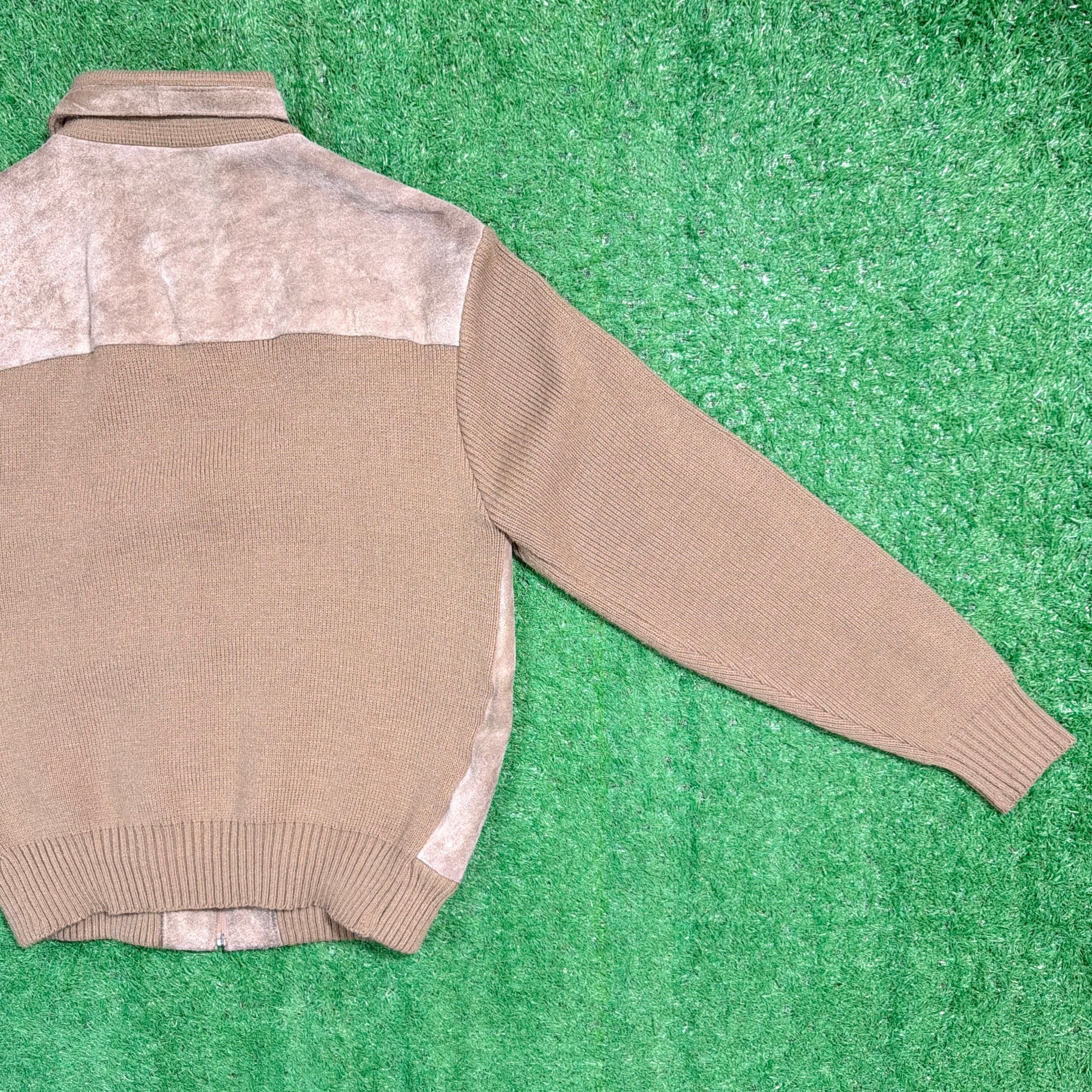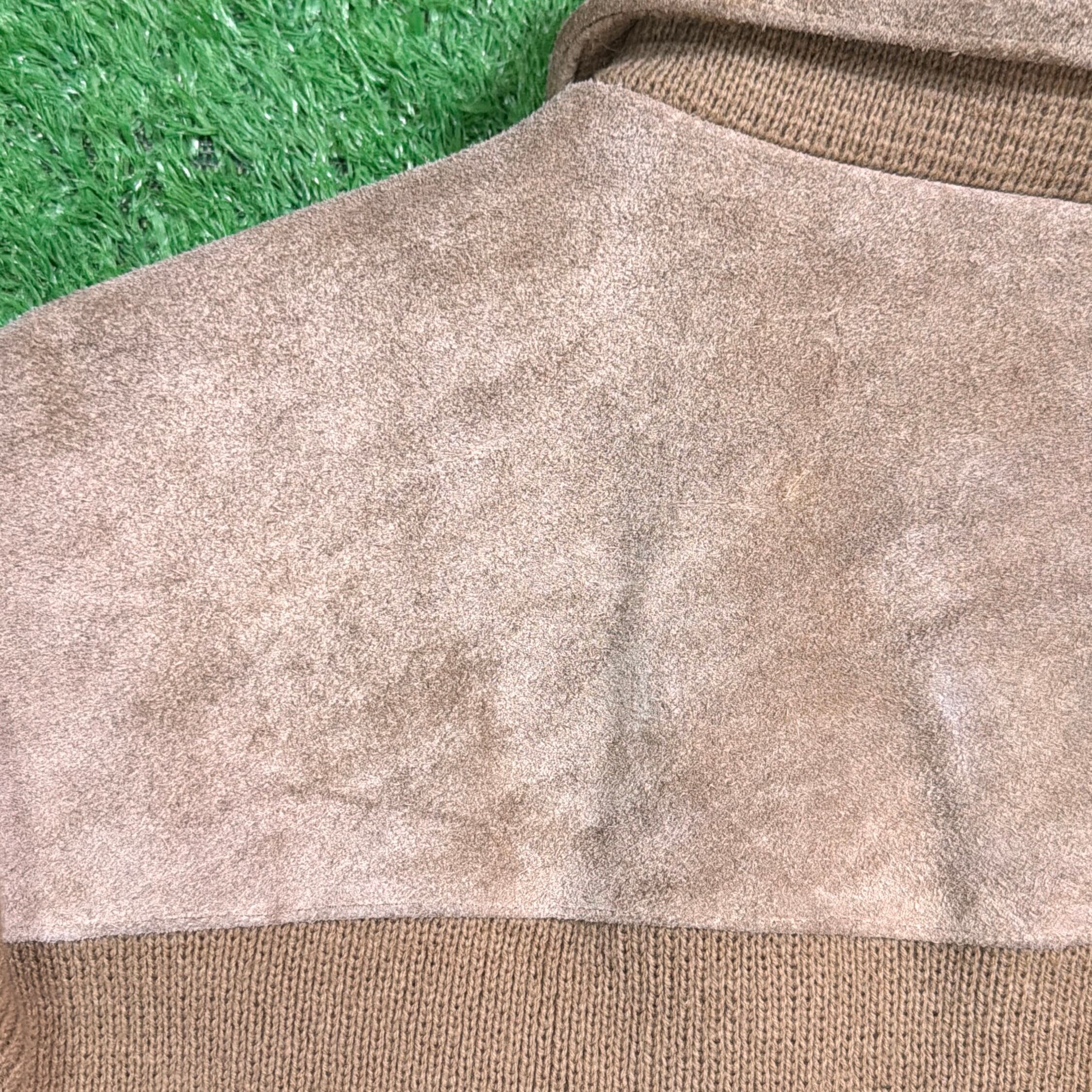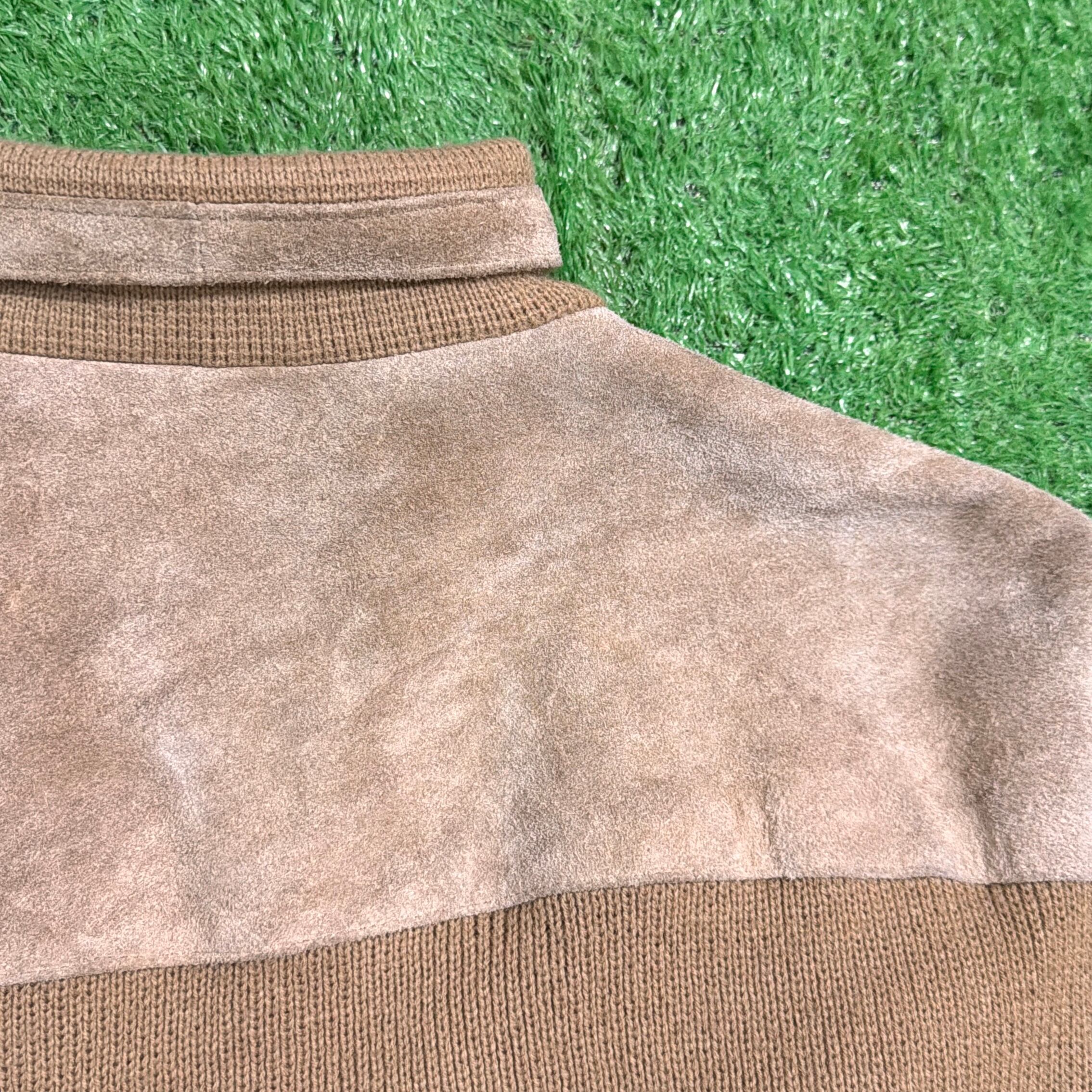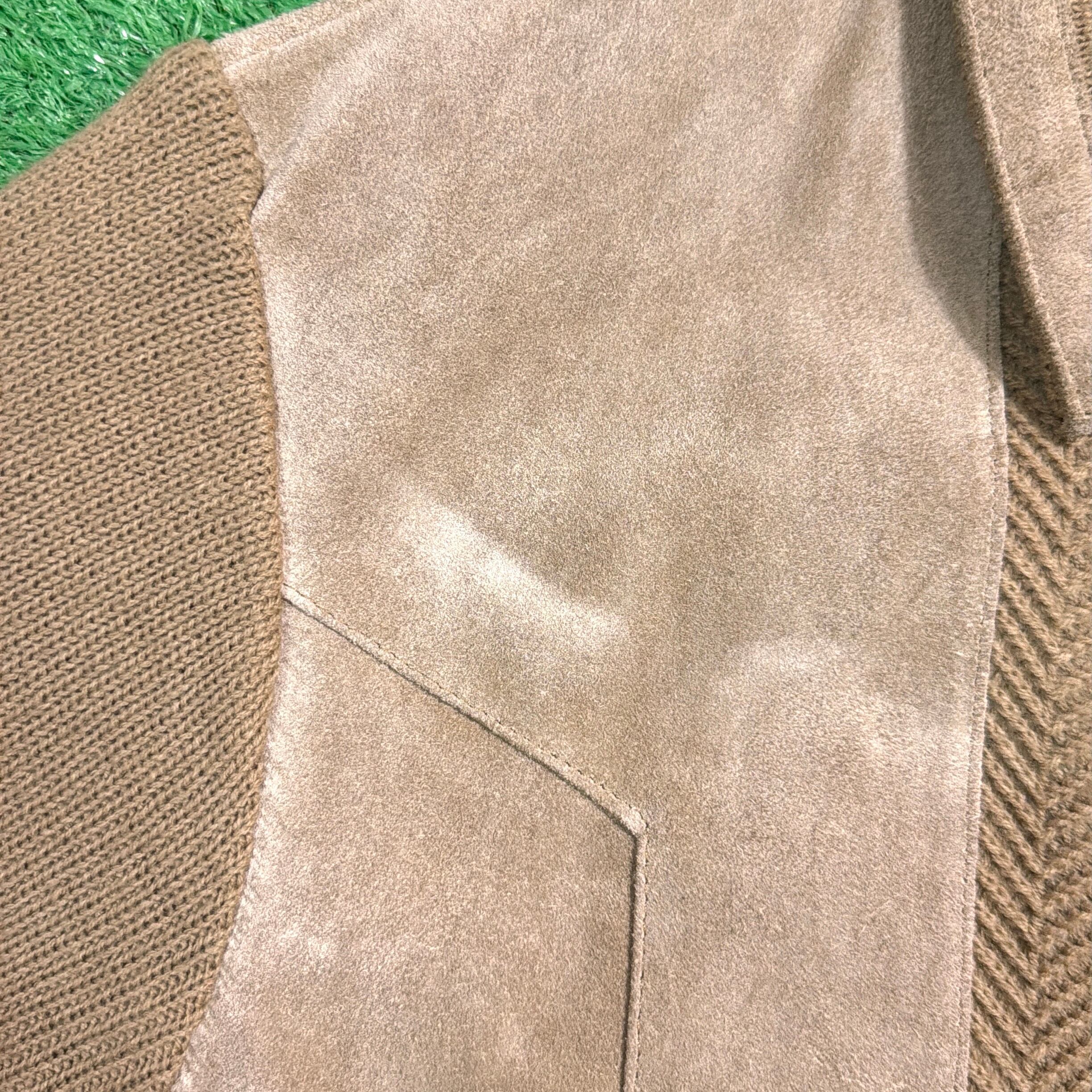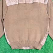 フロントと背中上部にスウェード調素材を切り返したデザインが特徴的で、90sらしい落ち着いた存在感のある一着。身頃や袖はニット素材で、スウェードとの異素材ミックスが程よいアクセントになっています。