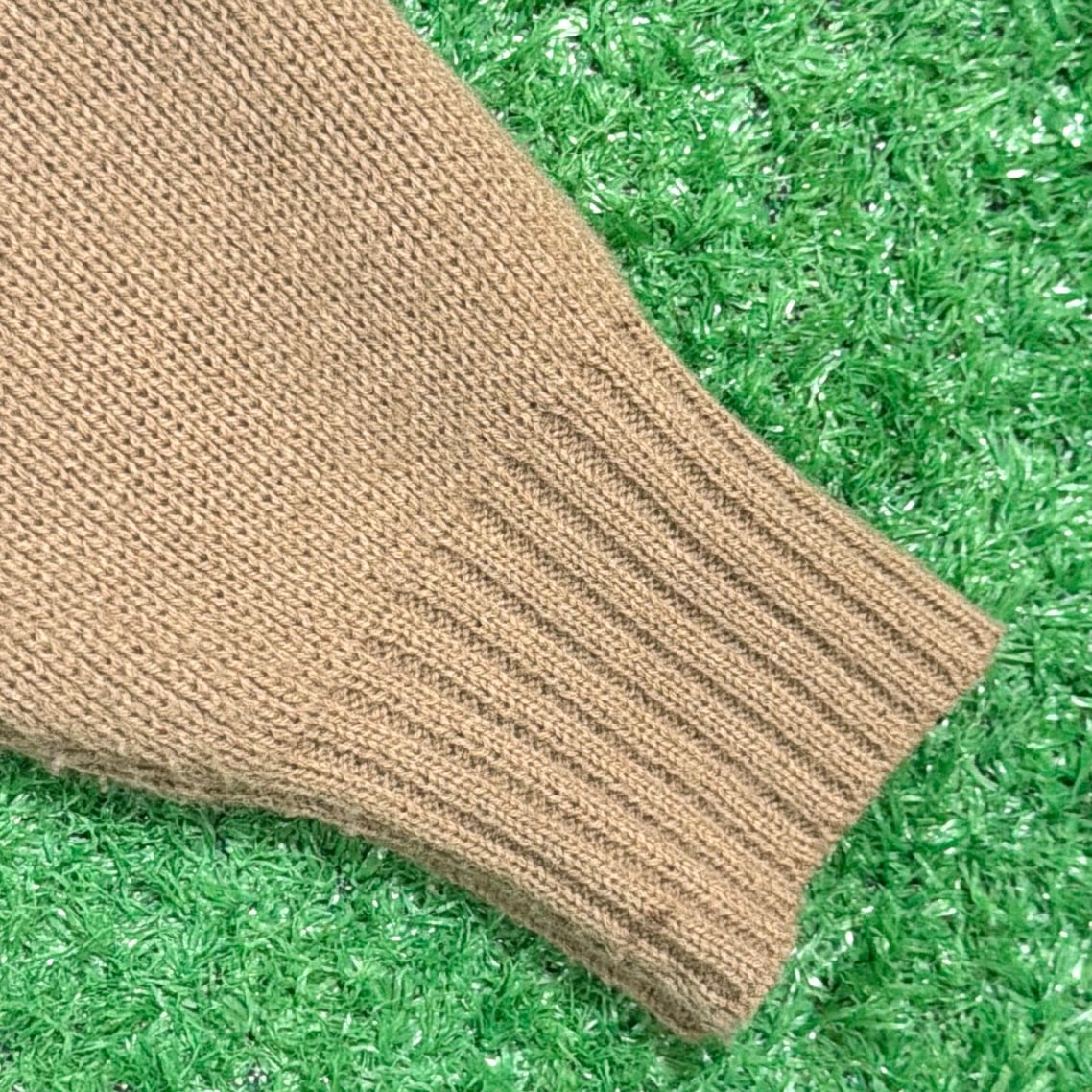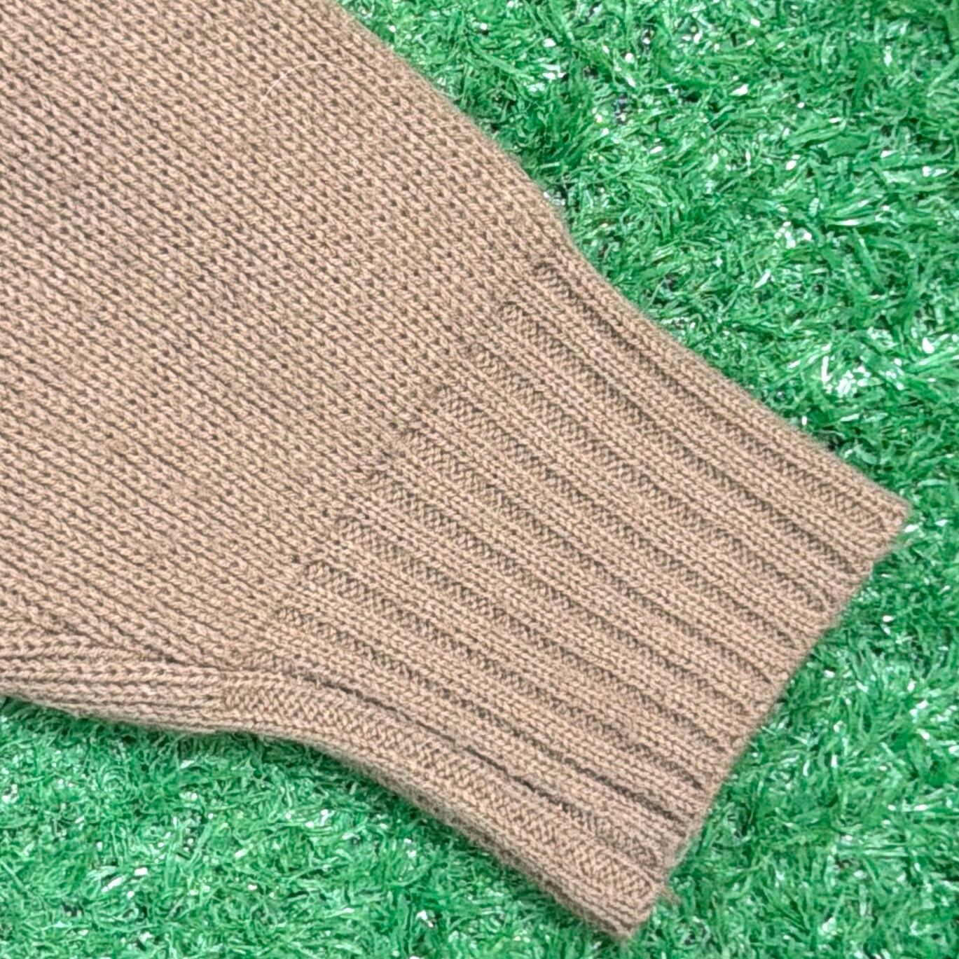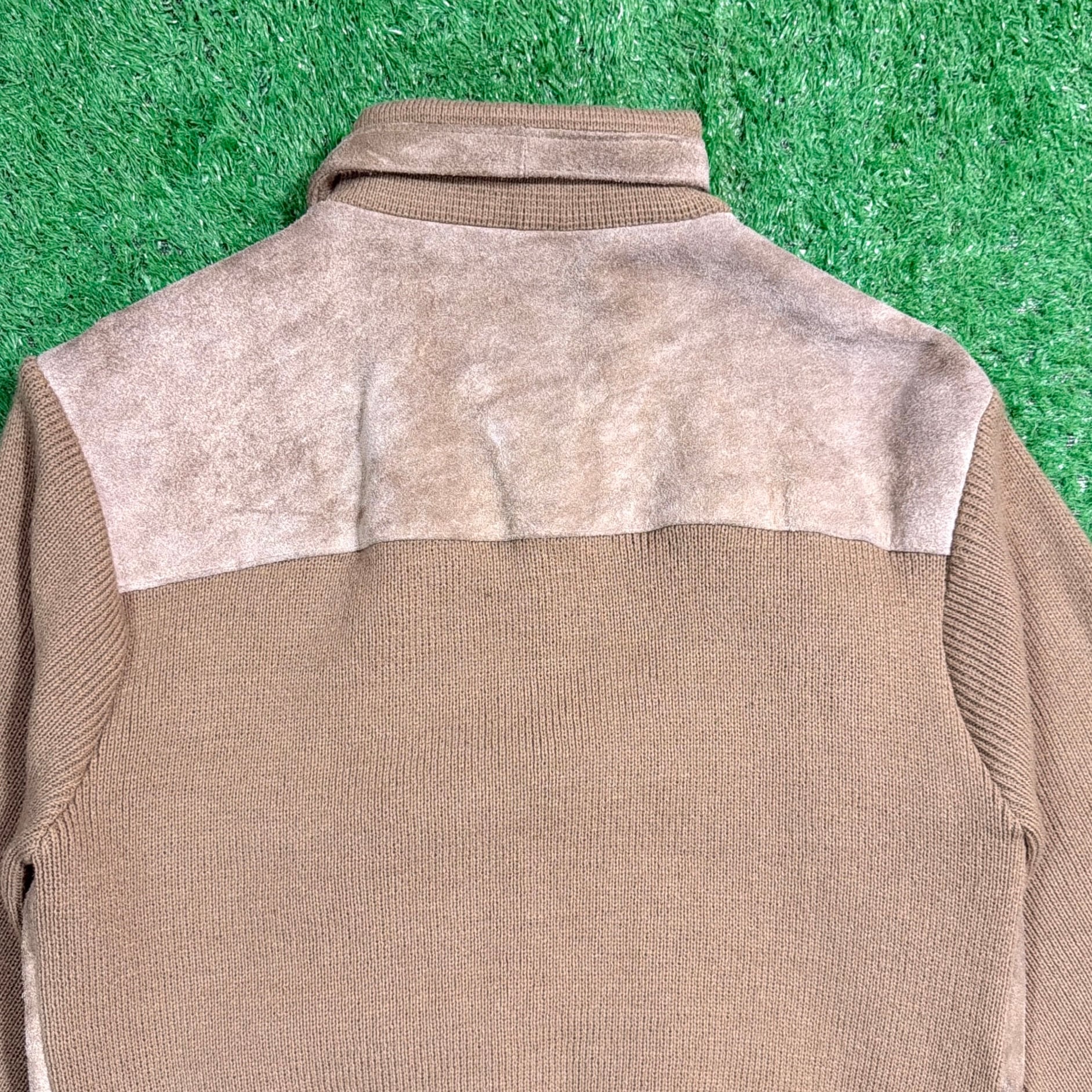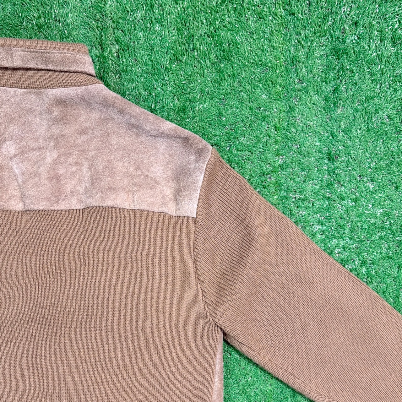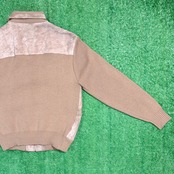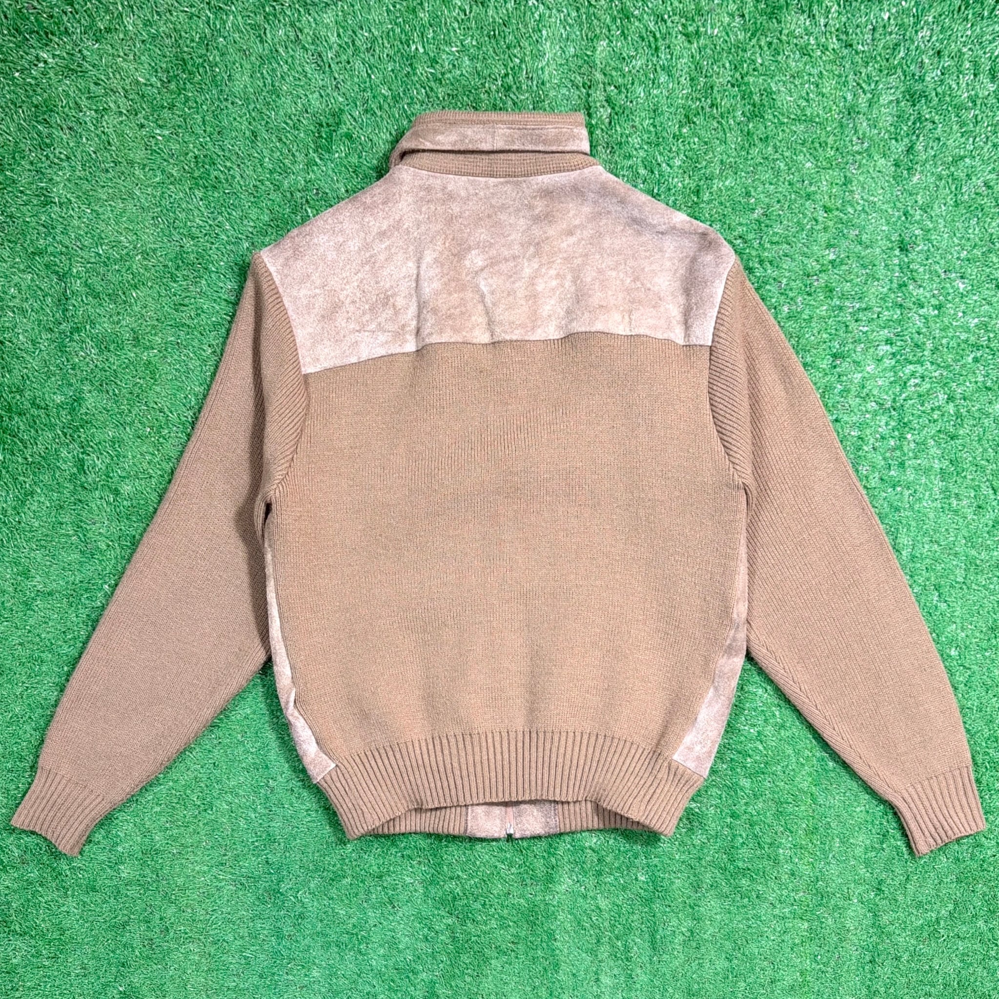 フロントと背中上部にスウェード調素材を切り返したデザインが特徴的で、90sらしい落ち着いた存在感のある一着。身頃や袖はニット素材で、スウェードとの異素材ミックスが程よいアクセントになっています。