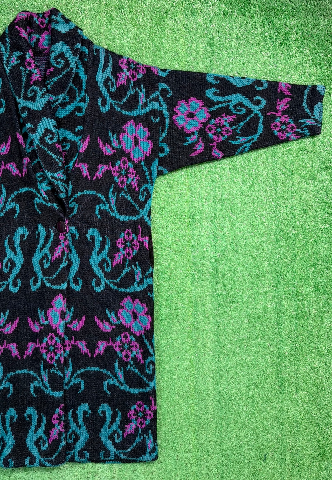 花柄デザインが印象的な、ロング丈のカーディガンです。