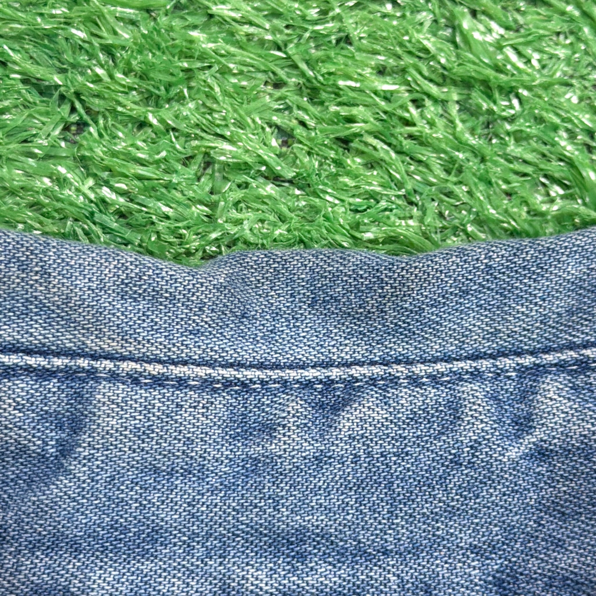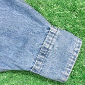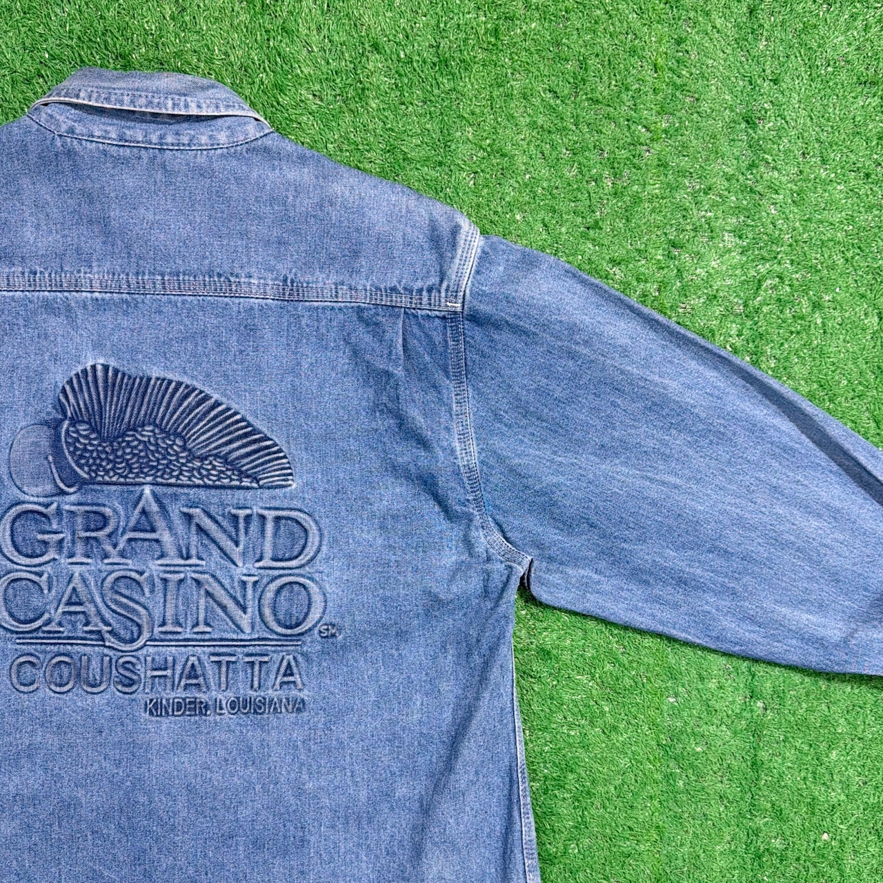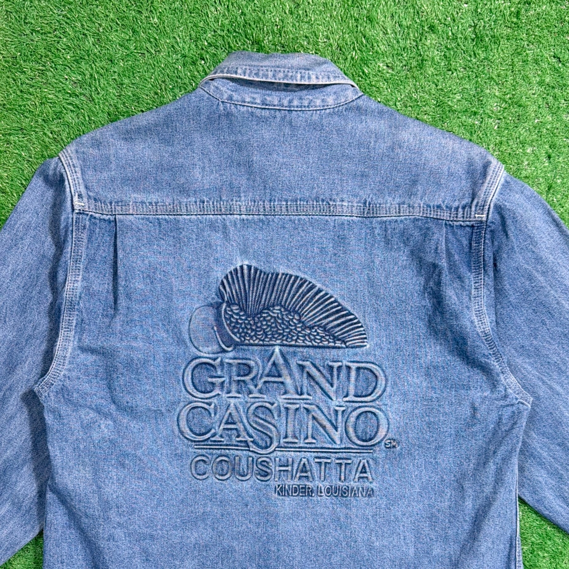 90年代のアメリカ製、デニムのシャツジャケットです。厚手でしっかりした生地感なので、シャツとジャケットの“中間”みたいな感覚で着られる一枚。ステッチワークも雰囲気があって、背中にはエンボス加工で入った「GRAND CASINO COUSHATTA」の立体ロゴが渋いポイントです。