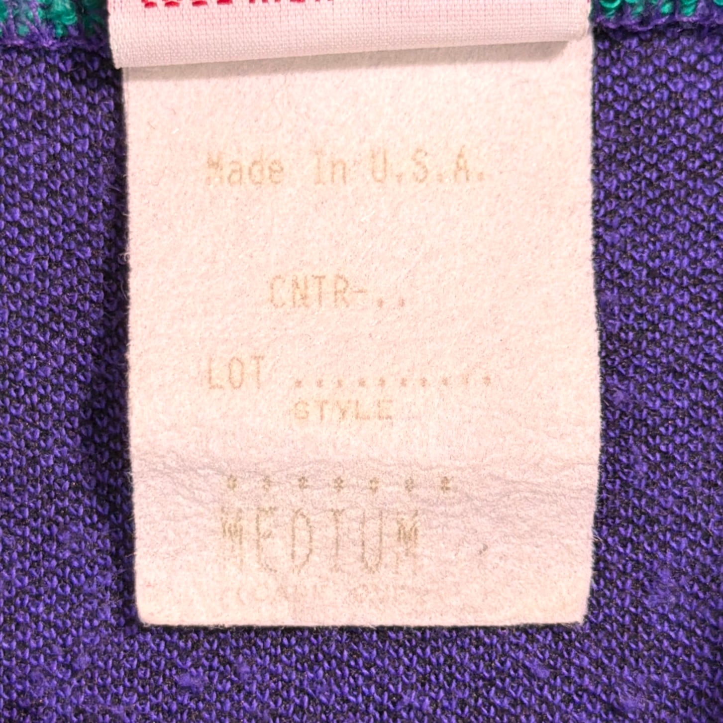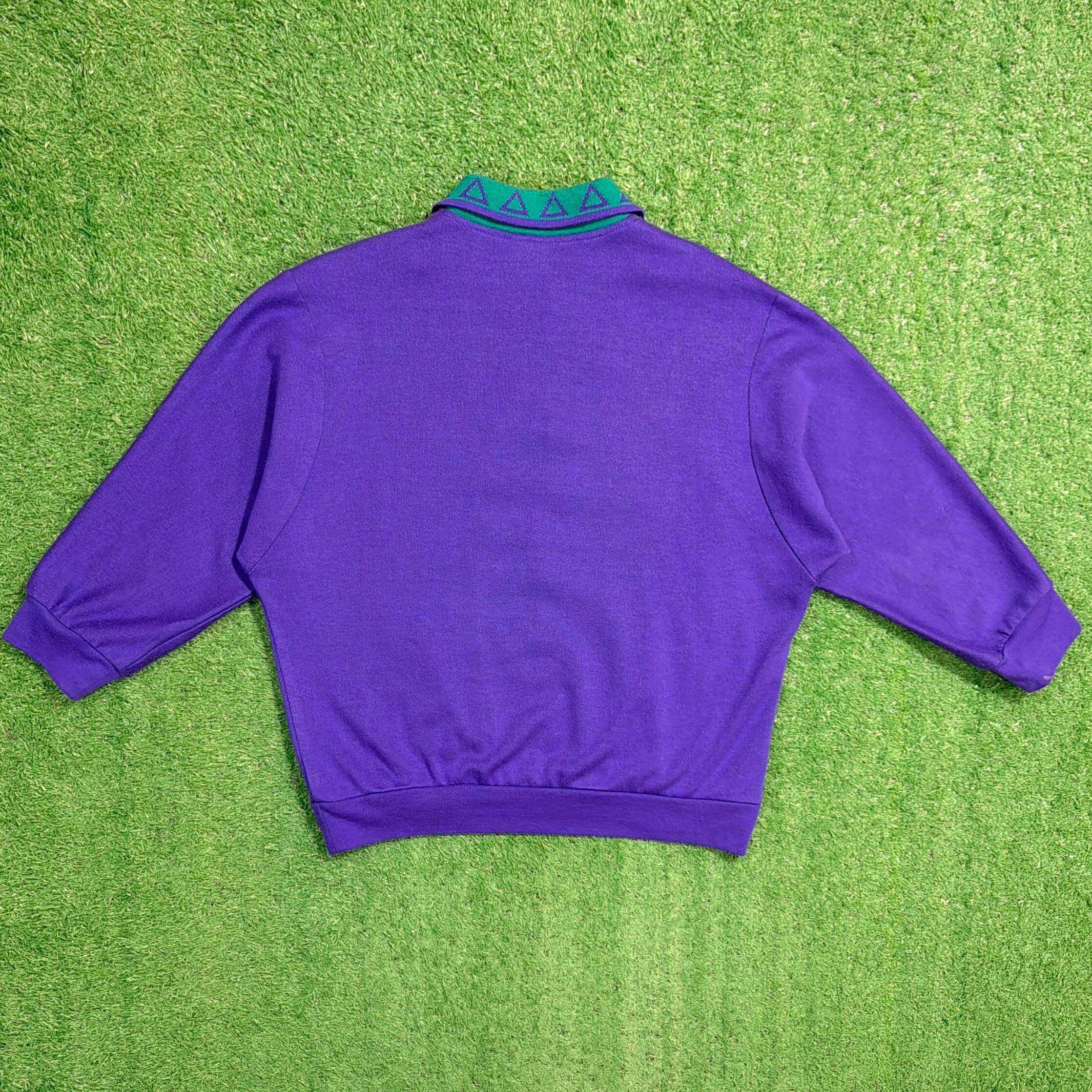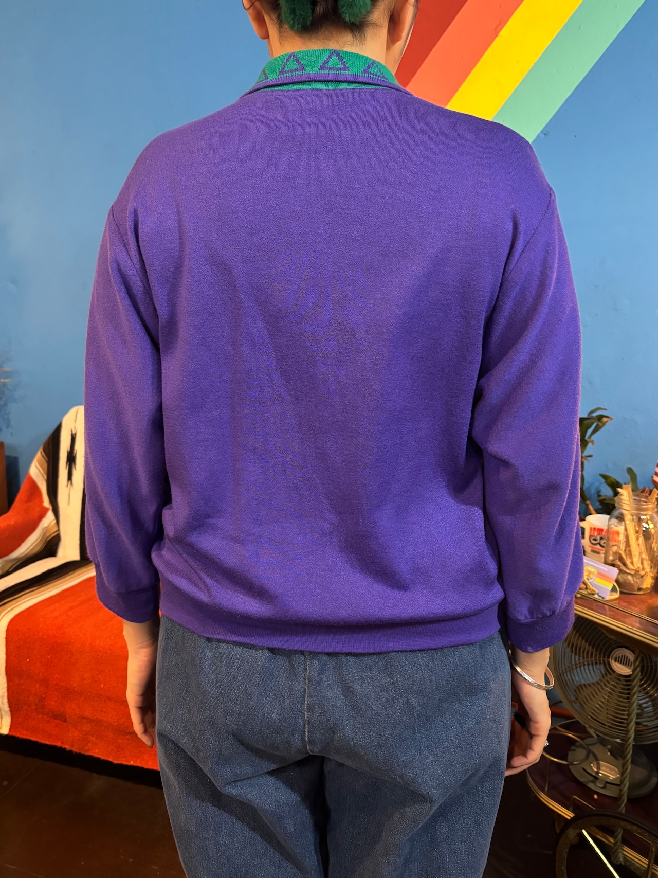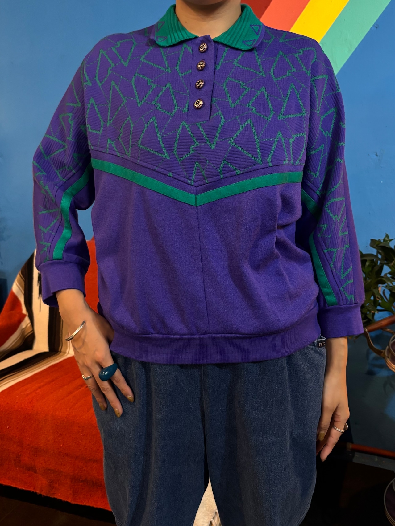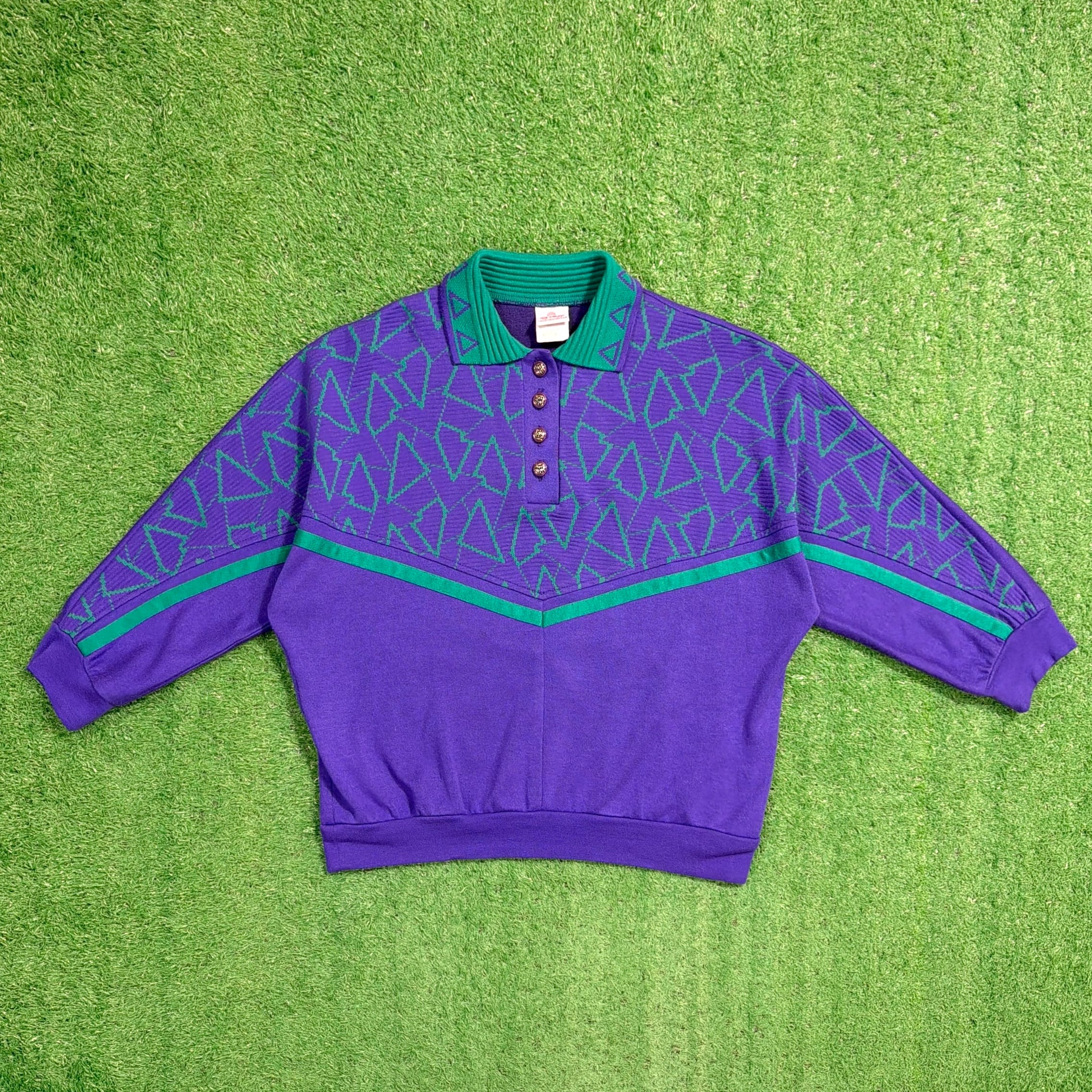 パープルをベースに、グリーンの切り替えと立体感のある幾何学柄が映える、80sらしい存在感のあるデザイン。襟付きのハーフボタン仕様で、ポロシャツのきちんと感と、古着ならではの遊び心がバランスよく合わさっています。