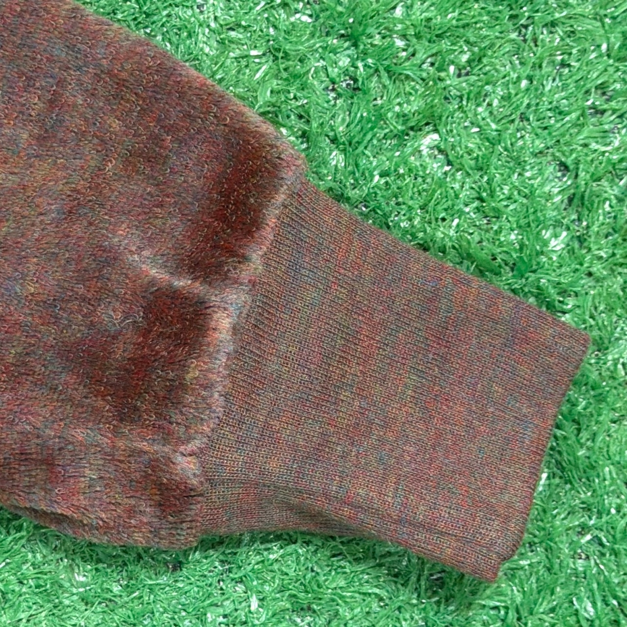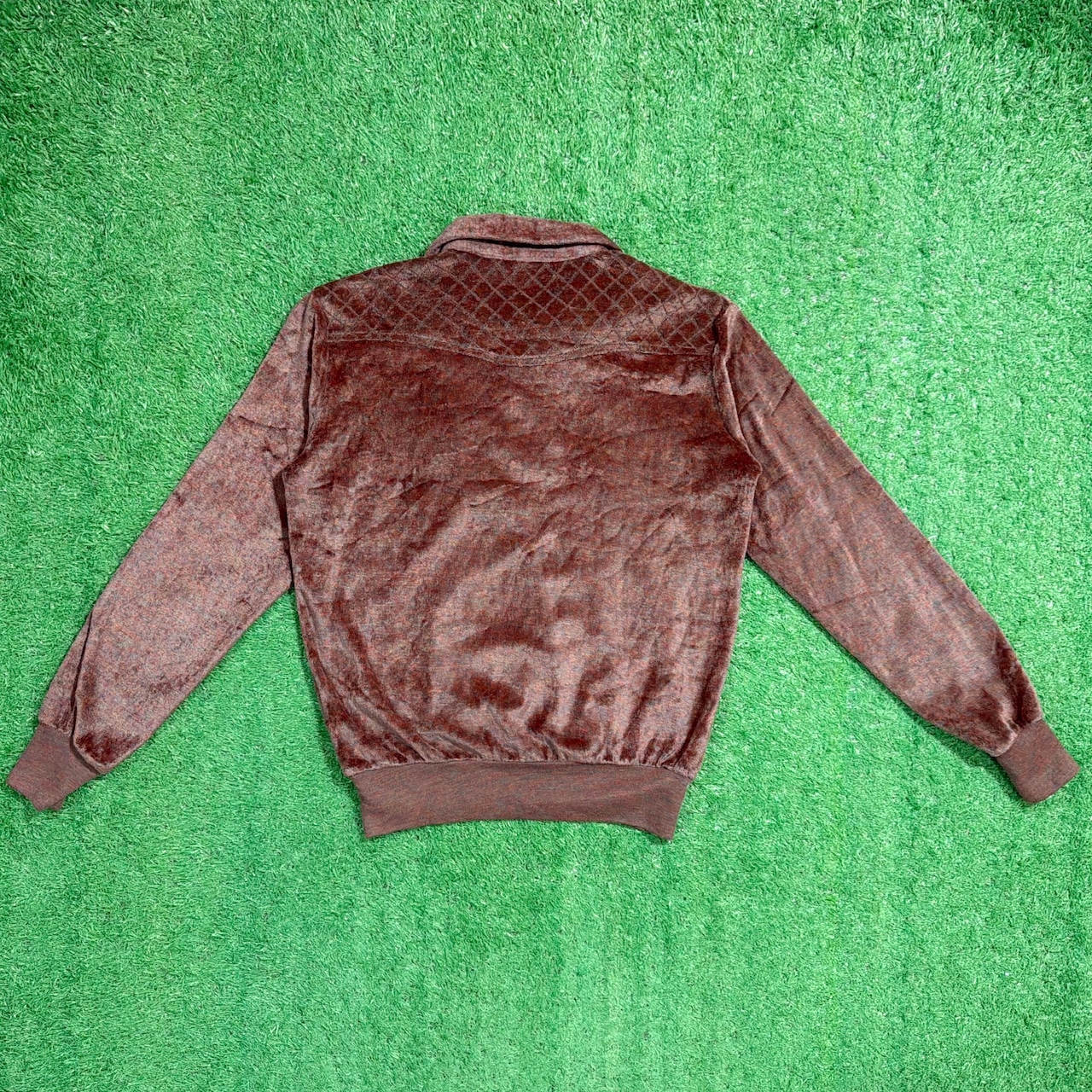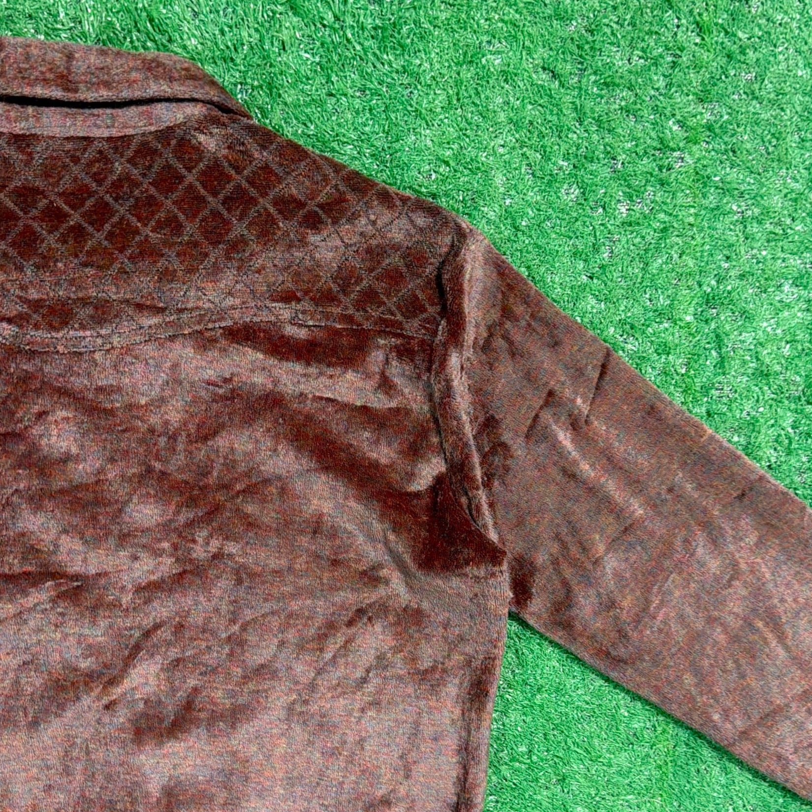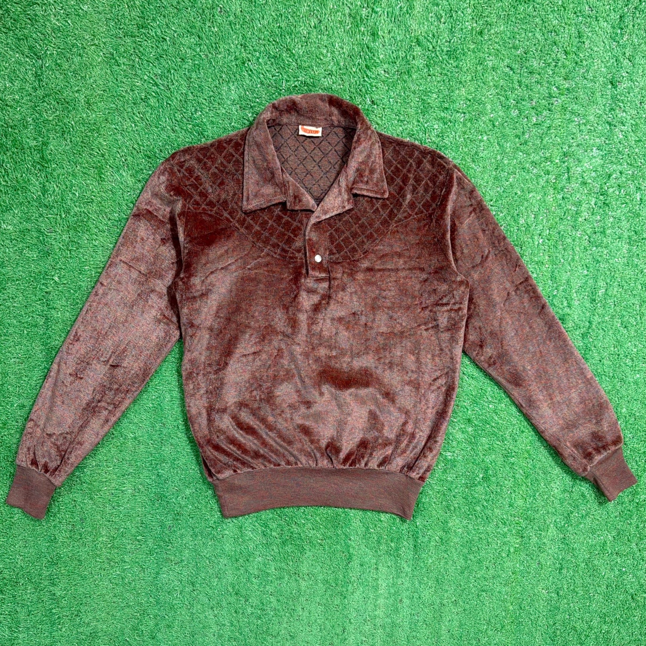 光の当たり方で表情が変わる、ムラ感のあるベロア調素材が雰囲気たっぷりで、落ち着いた中にもどこか色気を感じさせる一枚。襟付きのハーフボタン仕様で、ポロシャツのようなきちんと感と、古着らしいラフさを兼ね備えたデザインです。