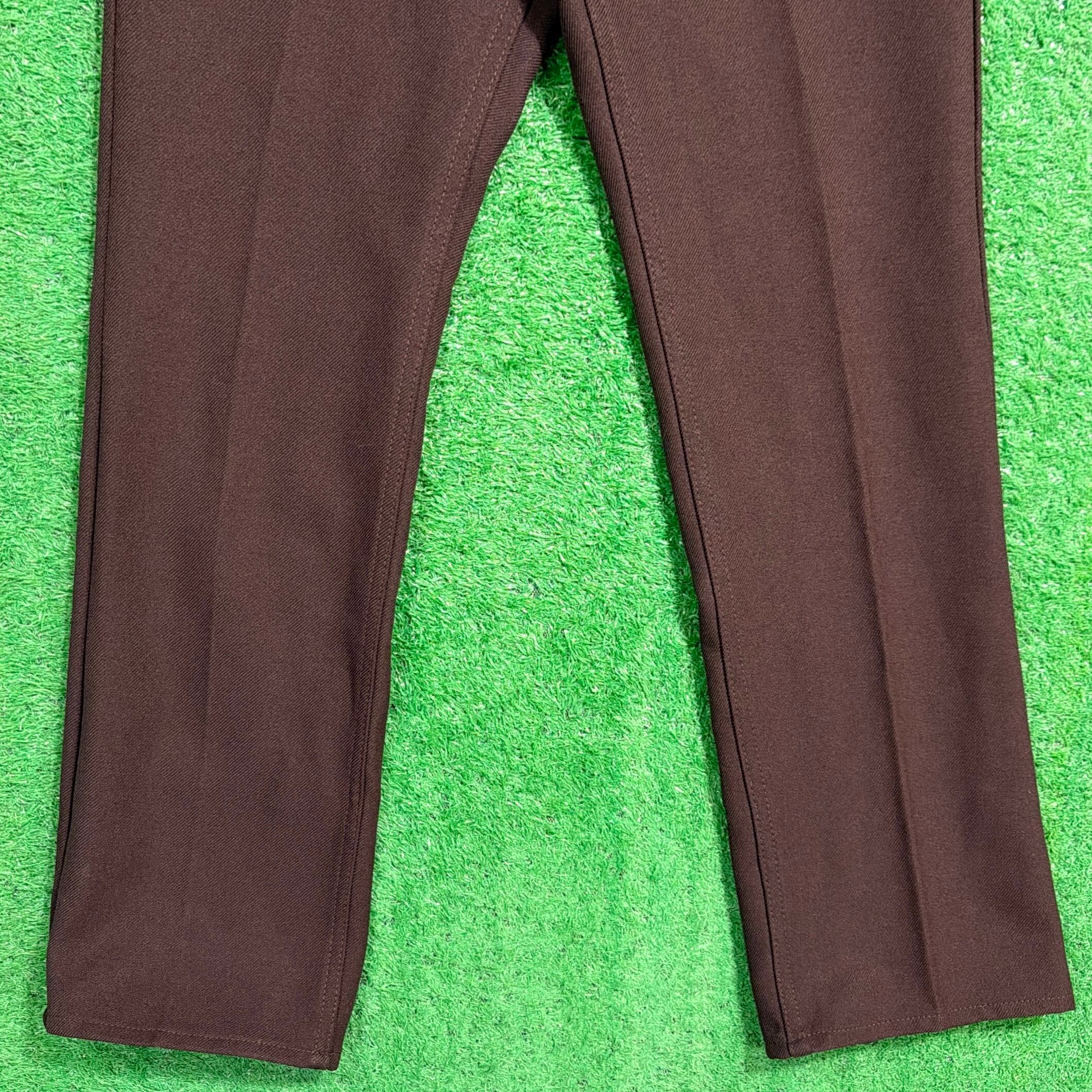 ポリエステル素材ならではのさらっとした質感と、センタープレスがきれいに入った上品なシルエットが特徴。シワになりにくく、当時はドレス寄りなワーク・スクールスタイルとして定番だったアイテムです。