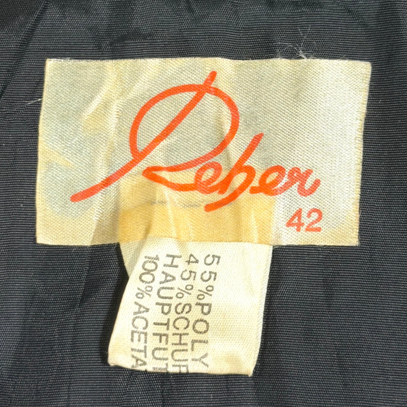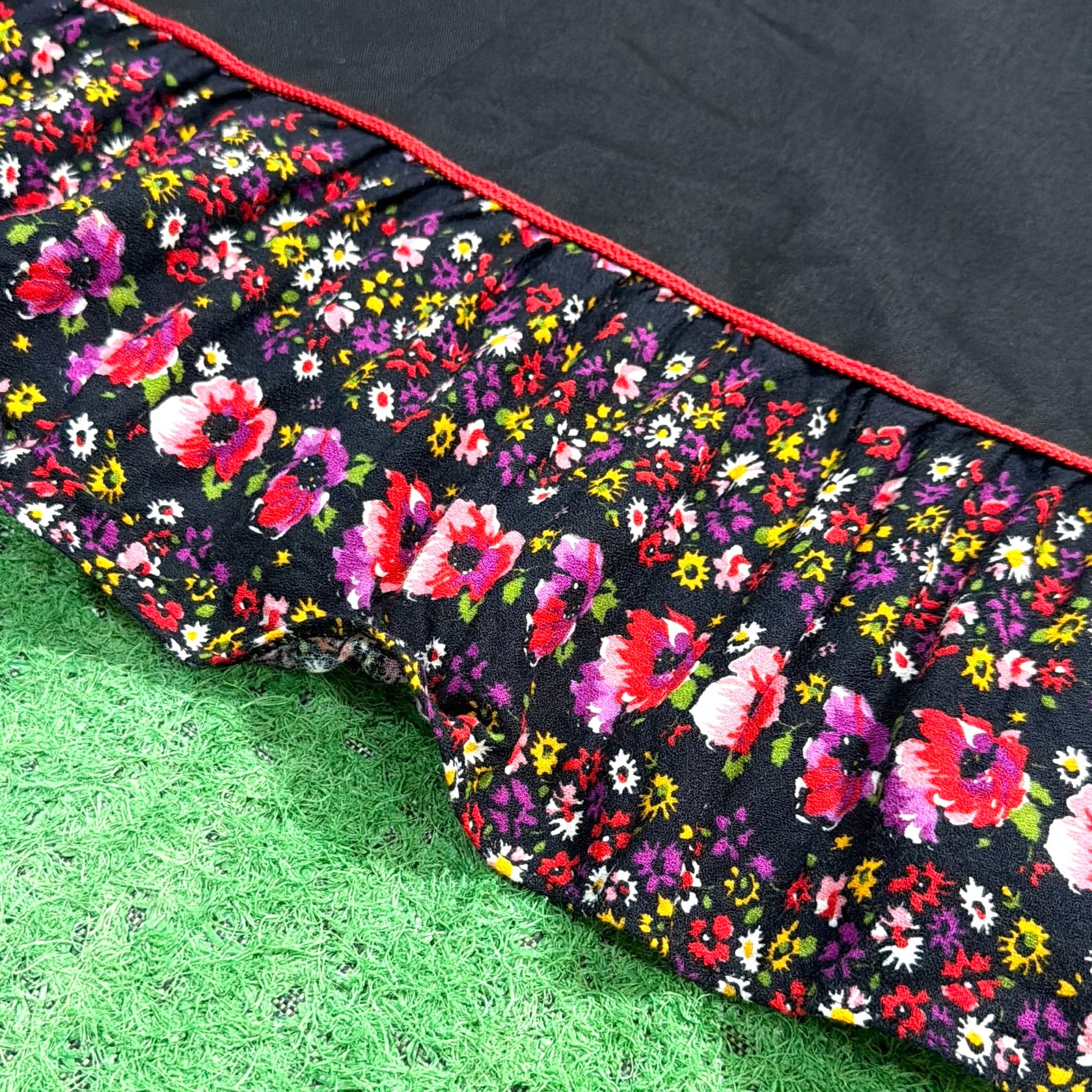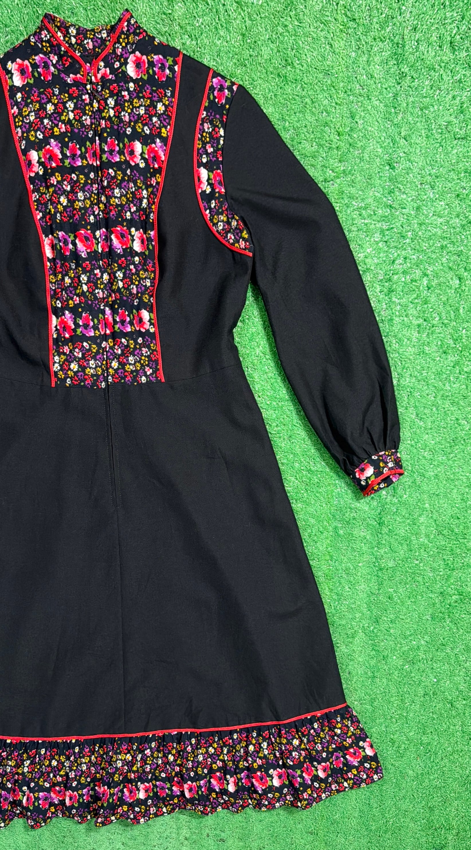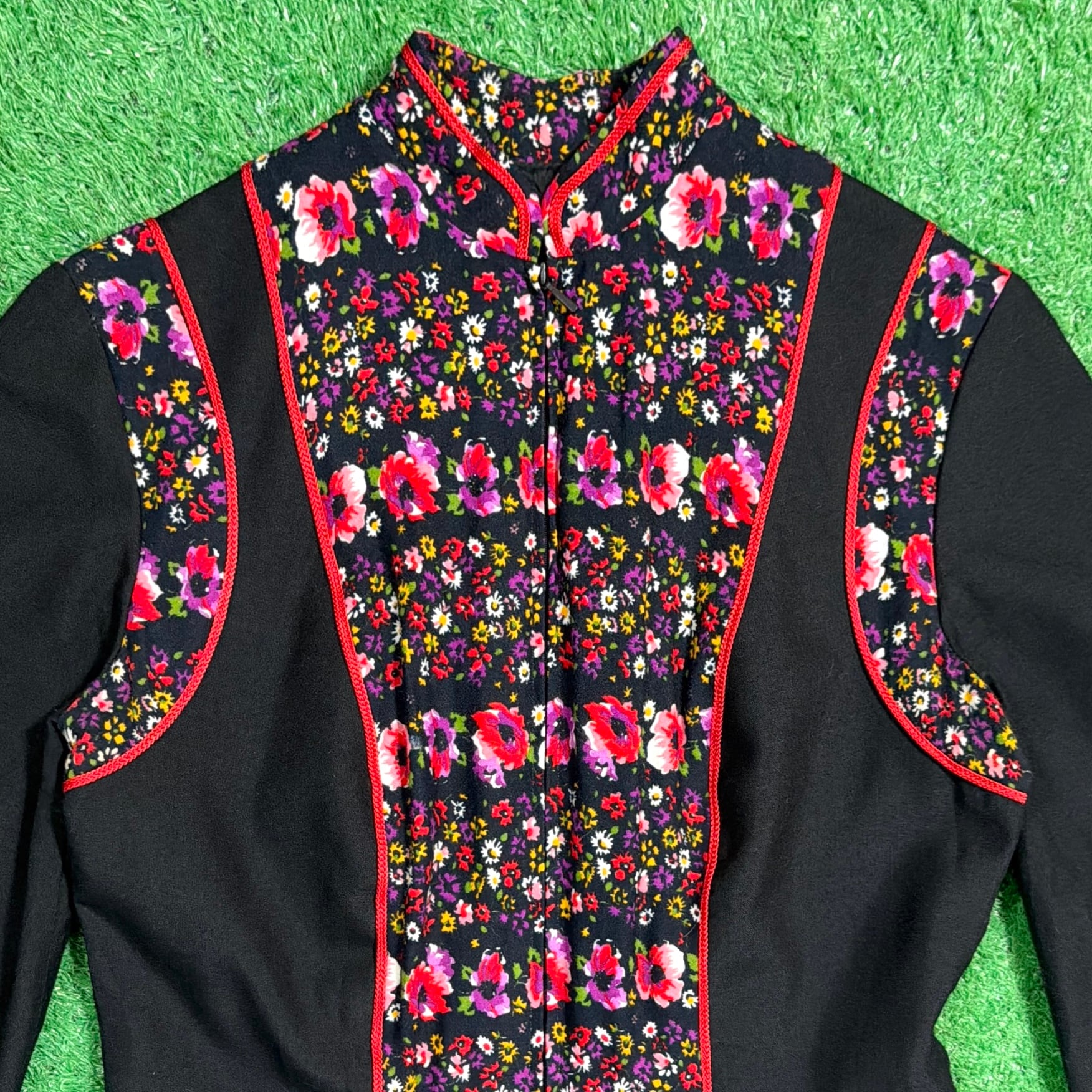 ブラックベースに、胸元から縦に配されたフラワーモチーフの装飾デザインが目を引く一着。生地の切り替えによる柄表現で、当時らしい民族調の雰囲気を感じられます。袖口や裾にも同系色の柄があしらわれており、全体に統一感のあるデザインです。