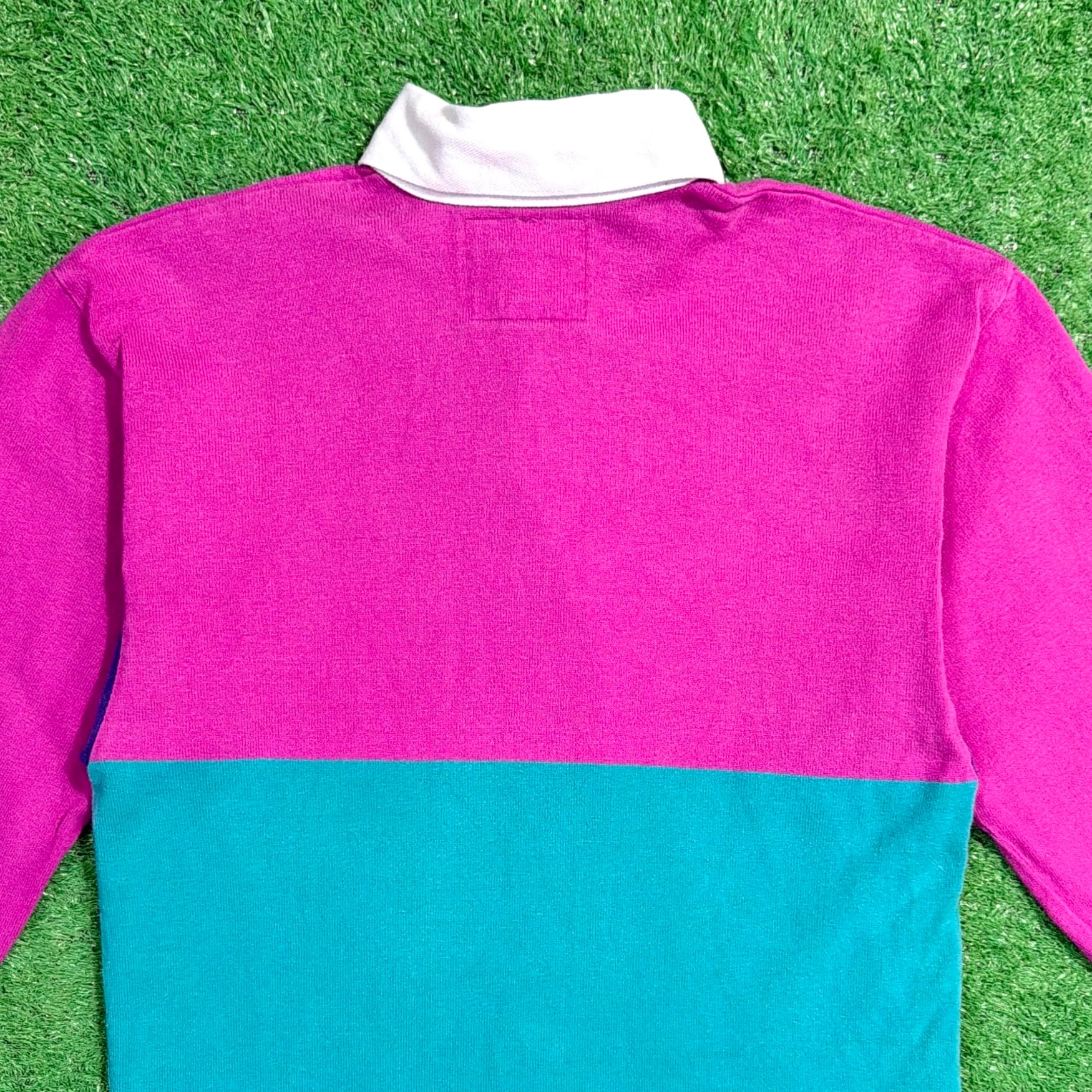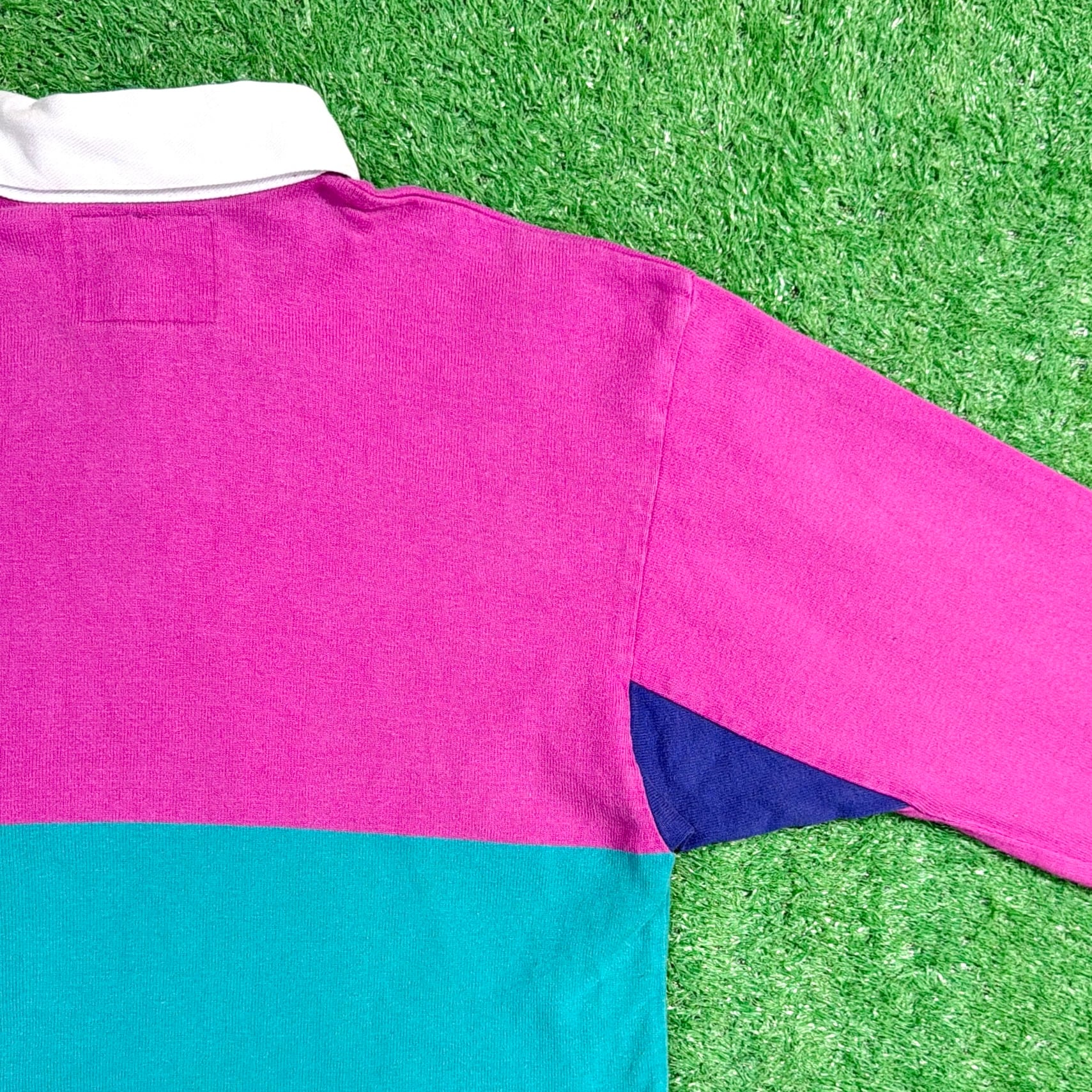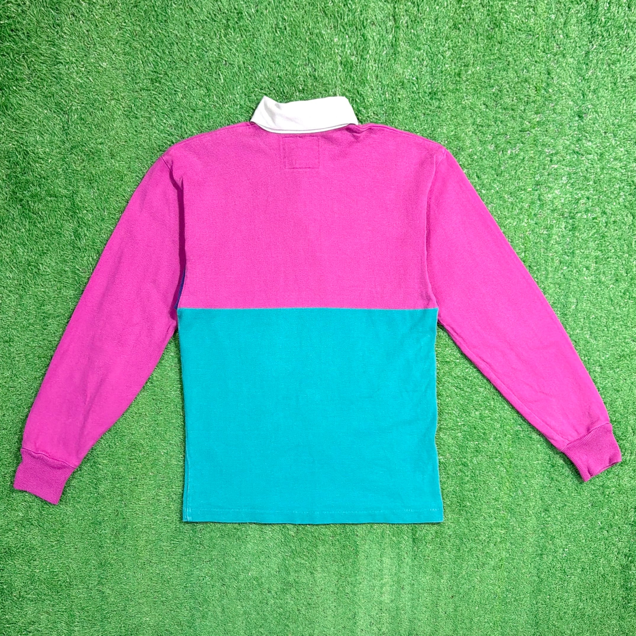 大胆な切り替え配色が90sらしく、1枚でしっかり主役になるデザイン。白い襟と前立て仕様で、ラガーシャツ特有のクラシックな雰囲気も感じられます。
