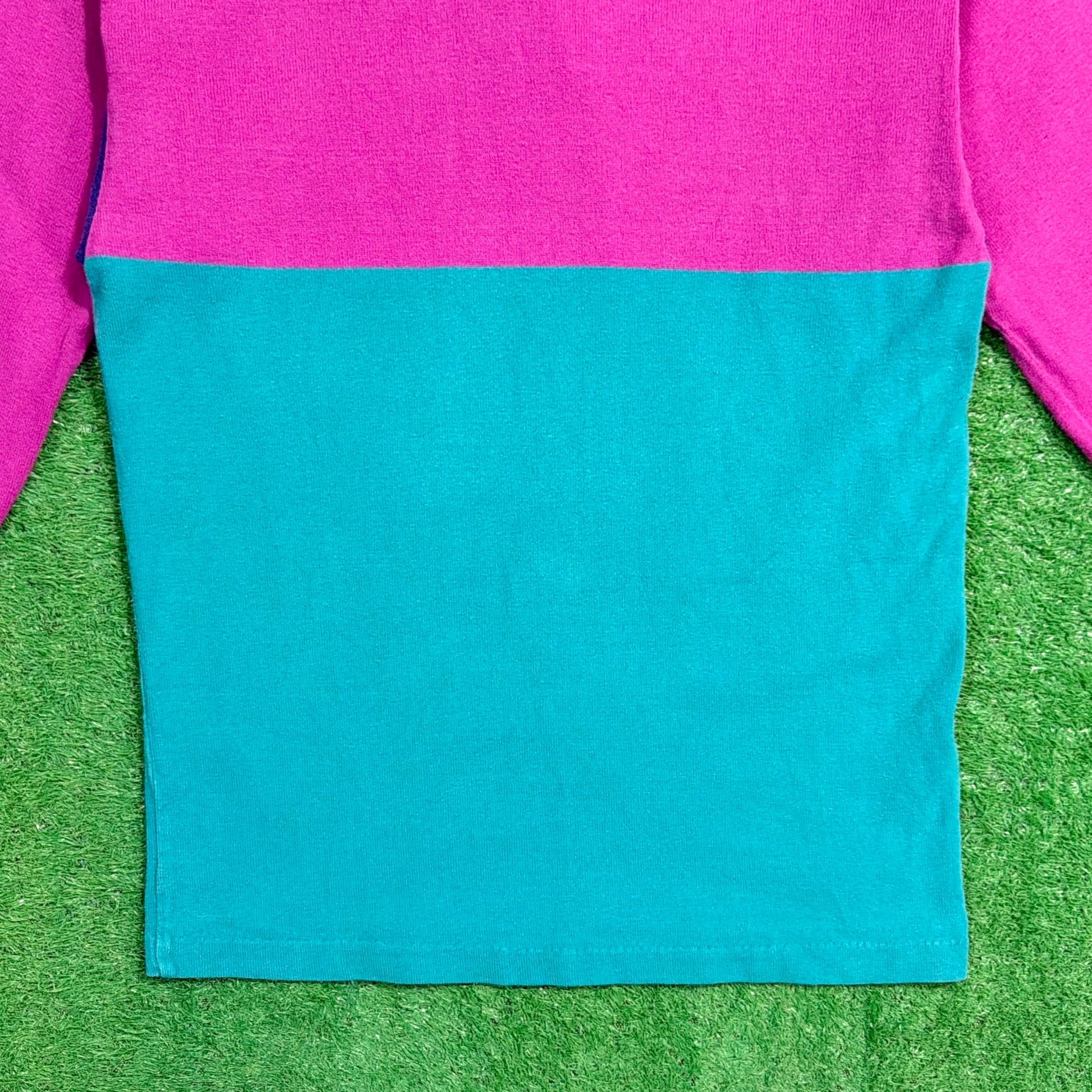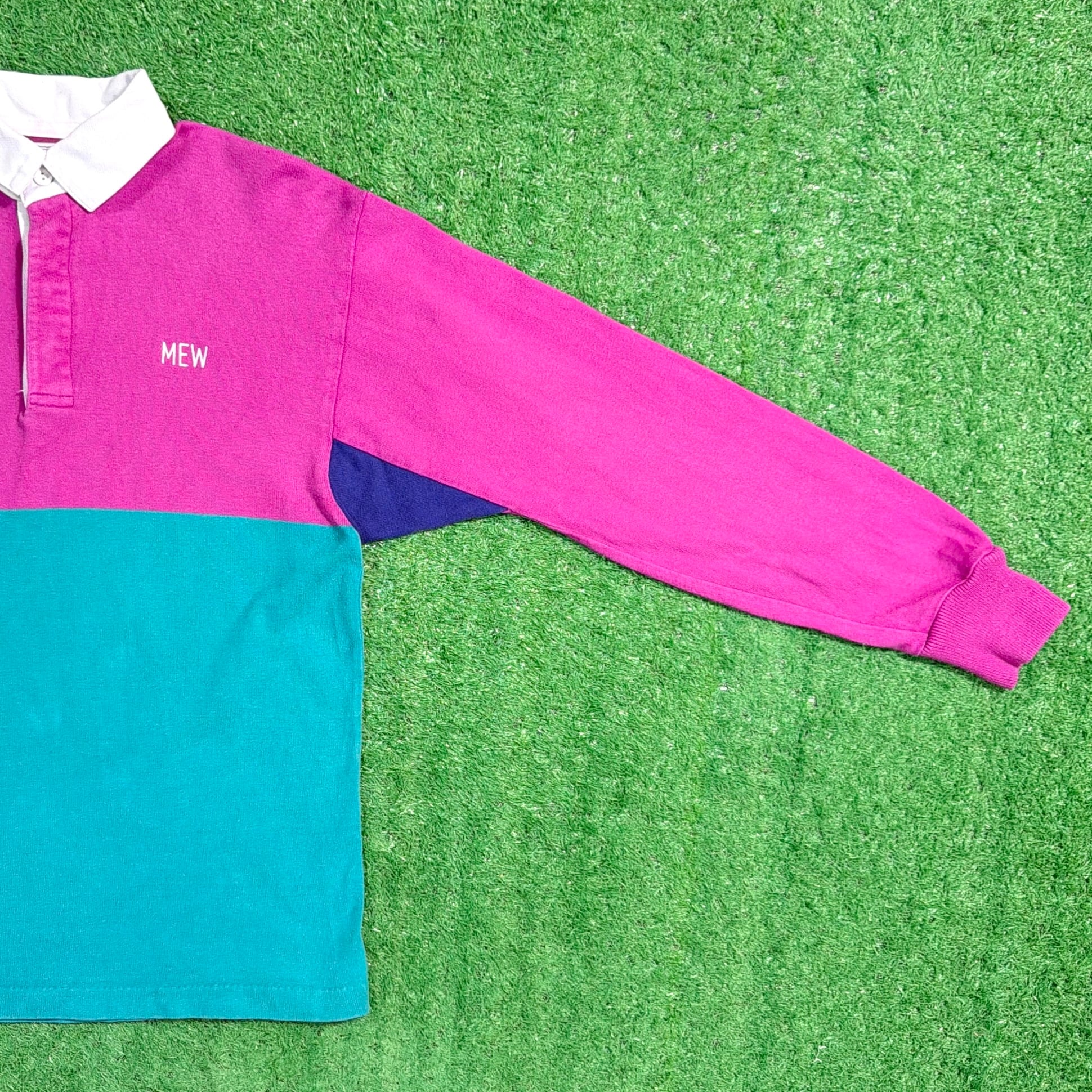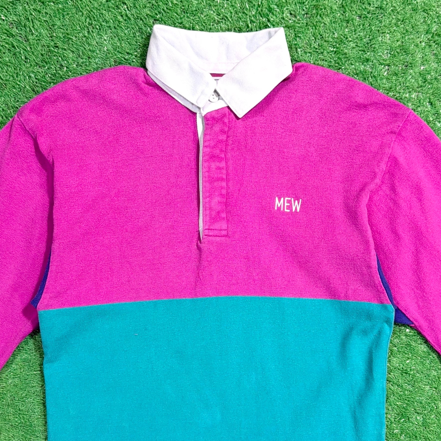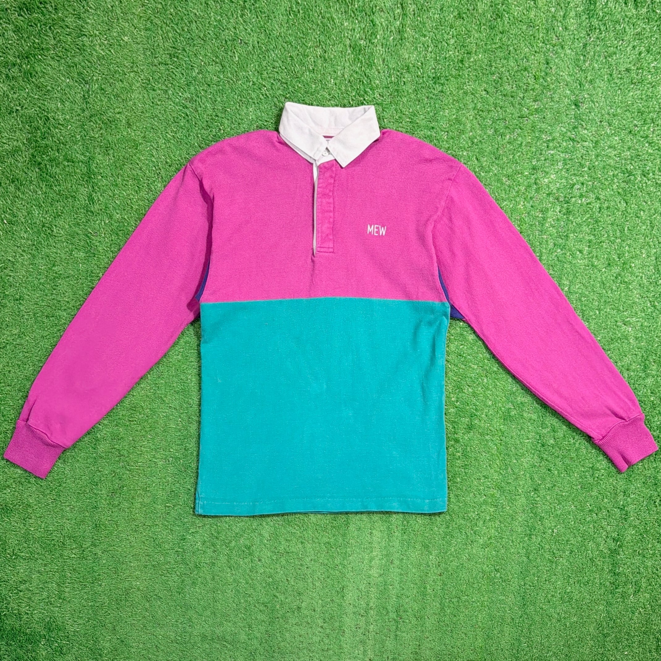 大胆な切り替え配色が90sらしく、1枚でしっかり主役になるデザイン。白い襟と前立て仕様で、ラガーシャツ特有のクラシックな雰囲気も感じられます。