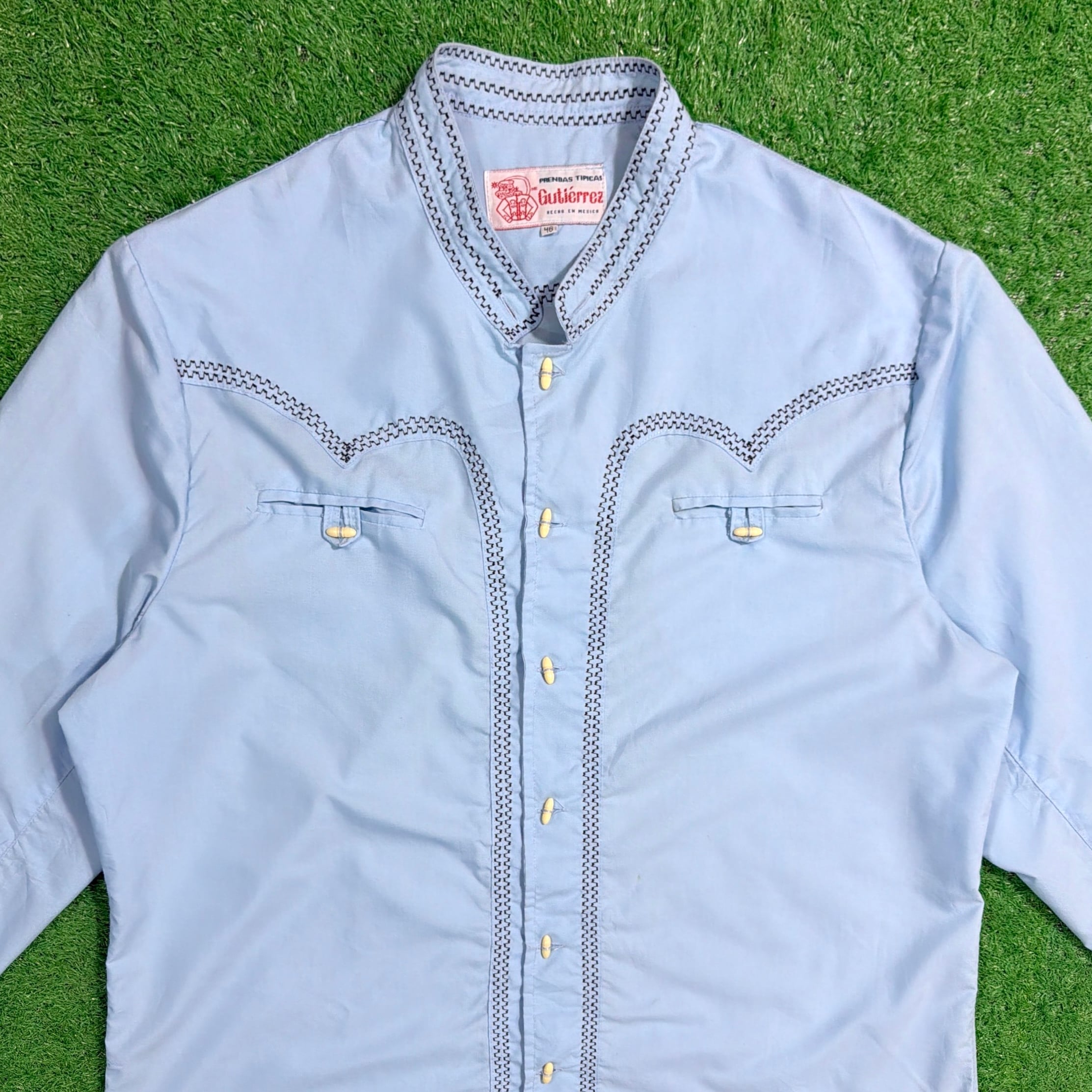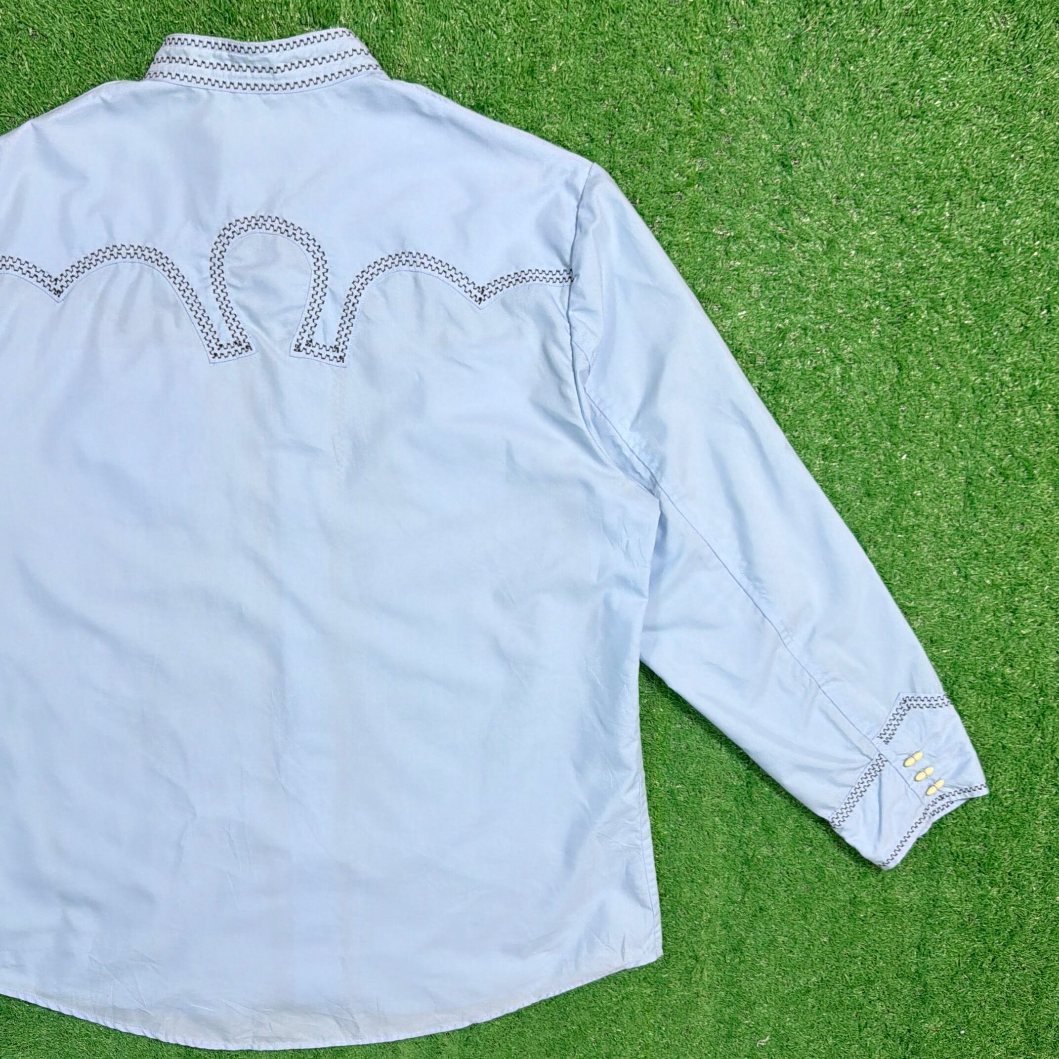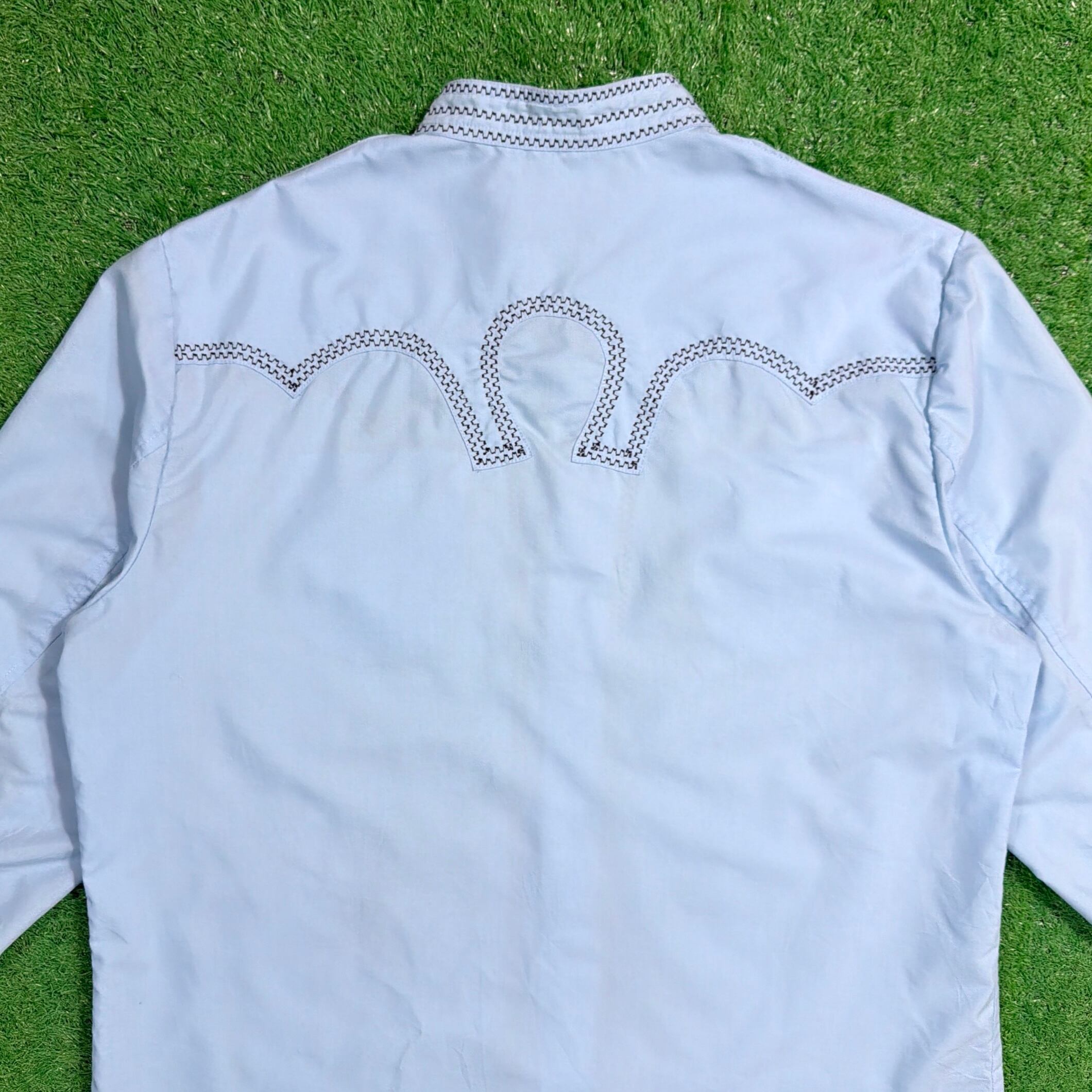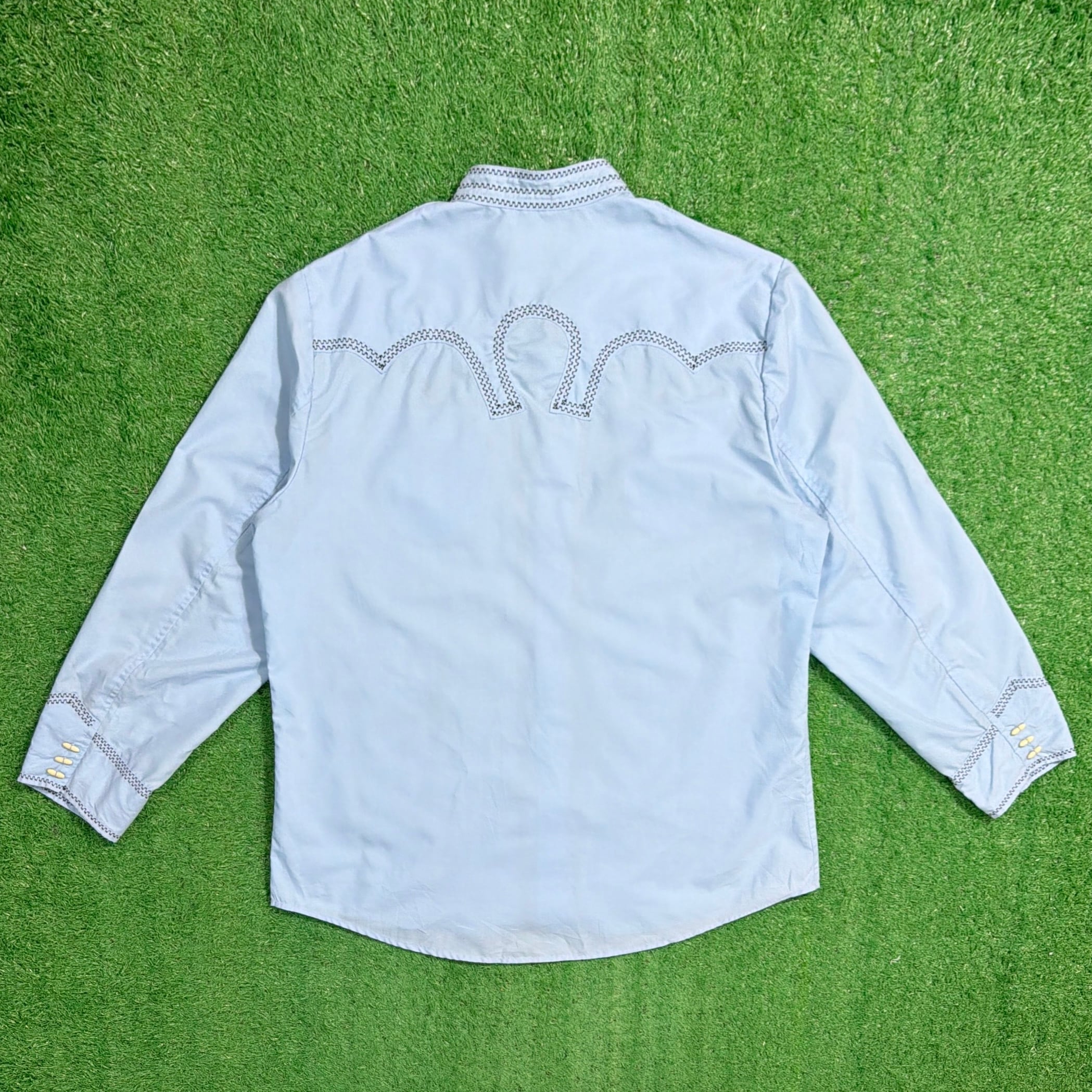 スタンドカラー(ノーカラー)仕様に、フロントから背面にかけて入る独特なステッチワークが印象的で、ウエスタンシャツやメキシカンシャツを思わせる雰囲気のある一枚。
