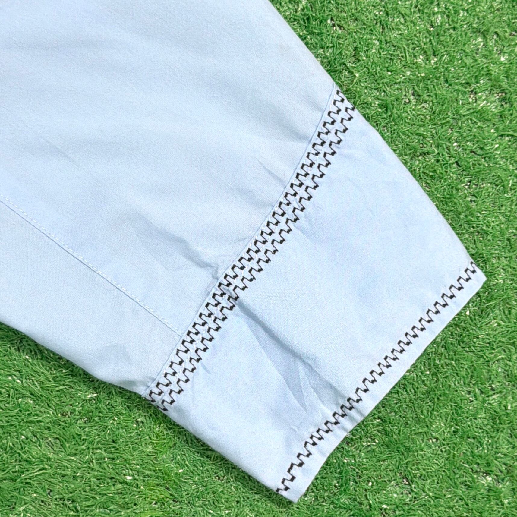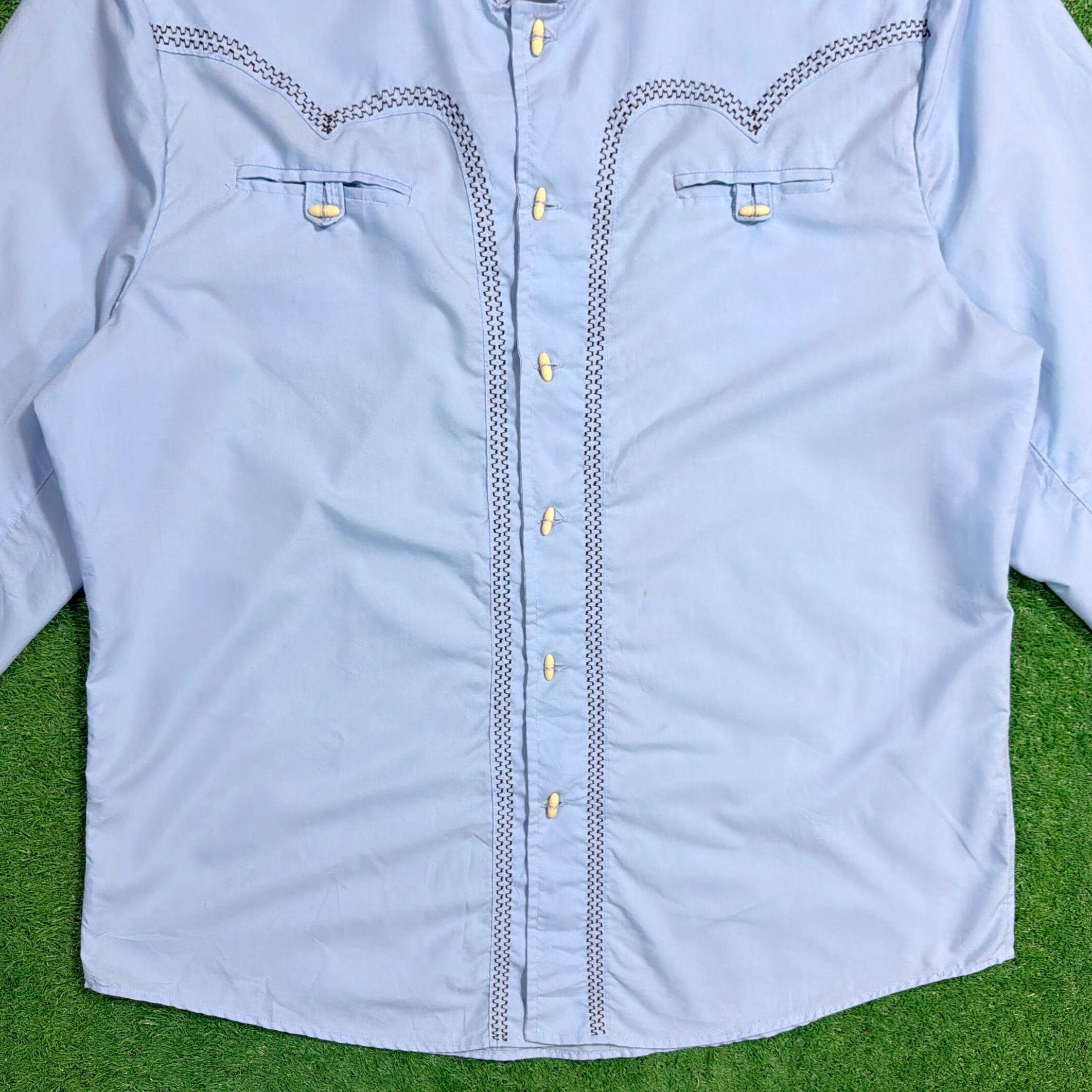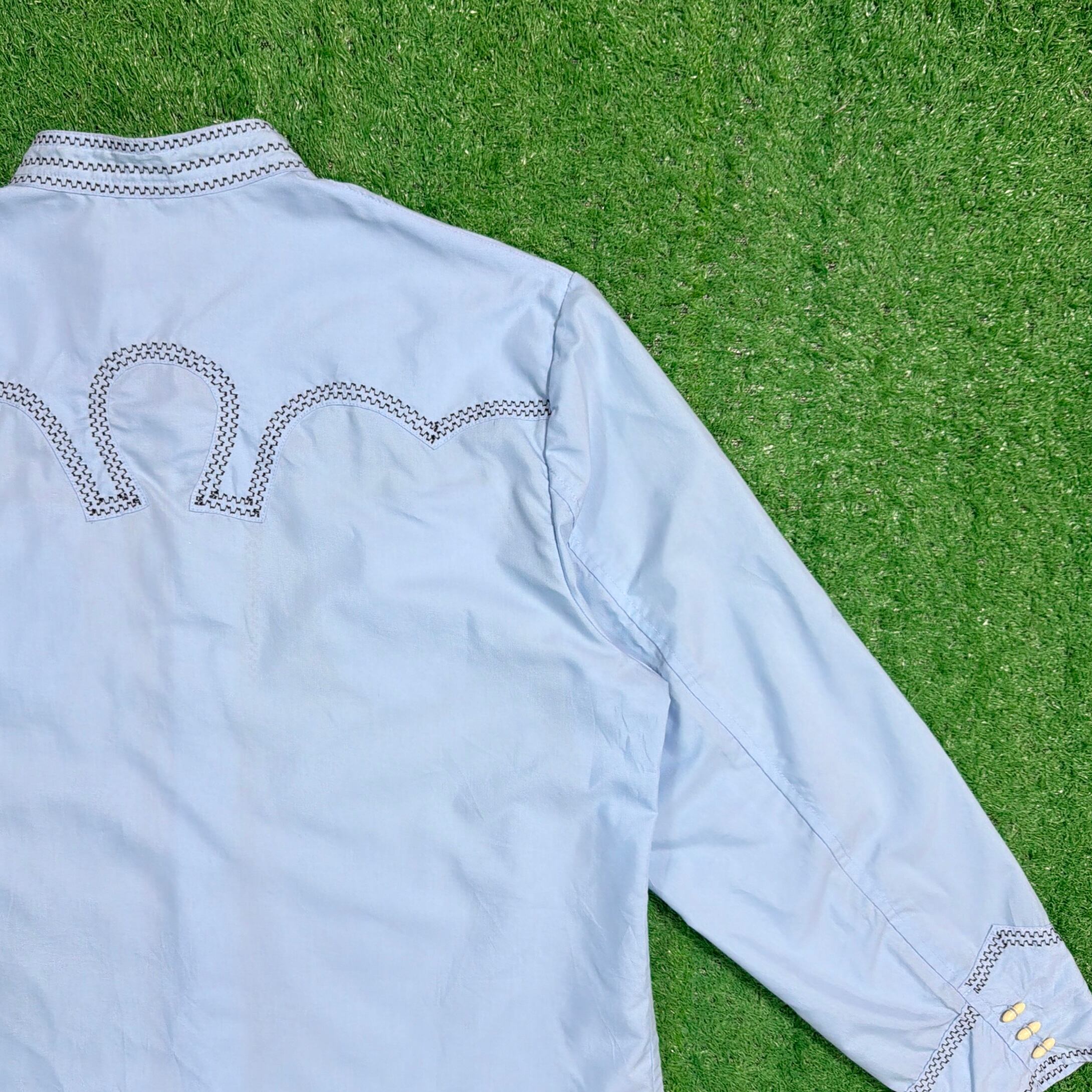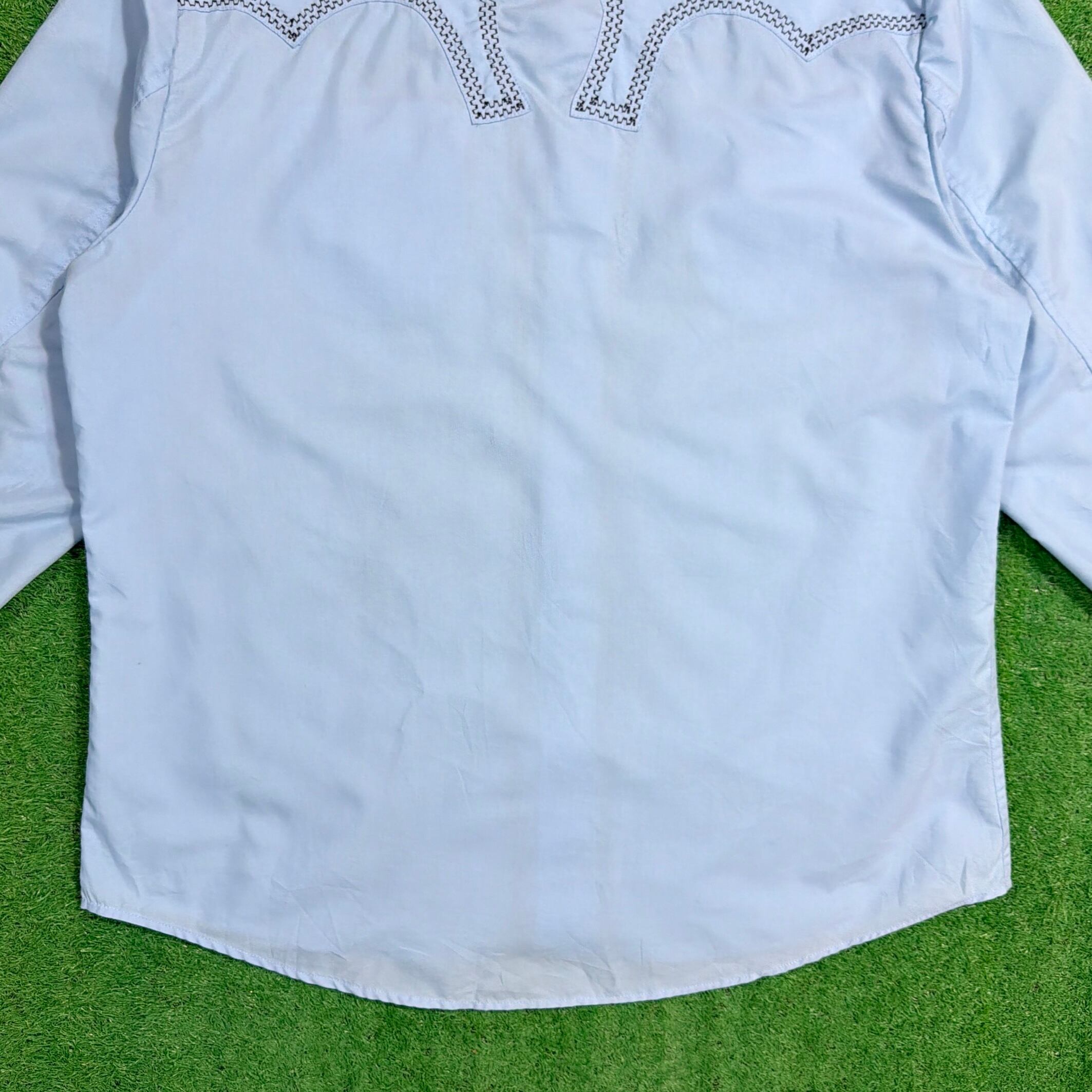 スタンドカラー(ノーカラー)仕様に、フロントから背面にかけて入る独特なステッチワークが印象的で、ウエスタンシャツやメキシカンシャツを思わせる雰囲気のある一枚。