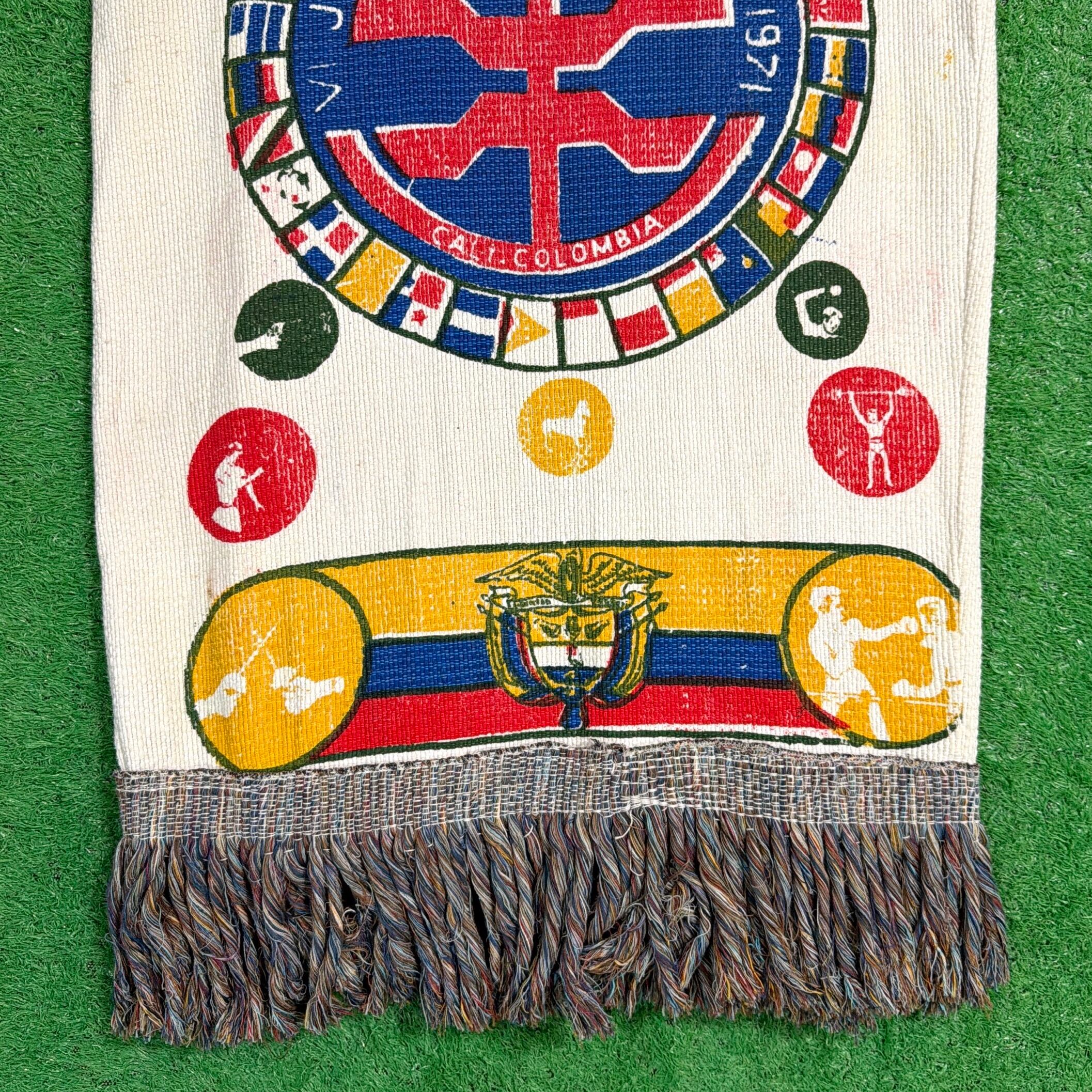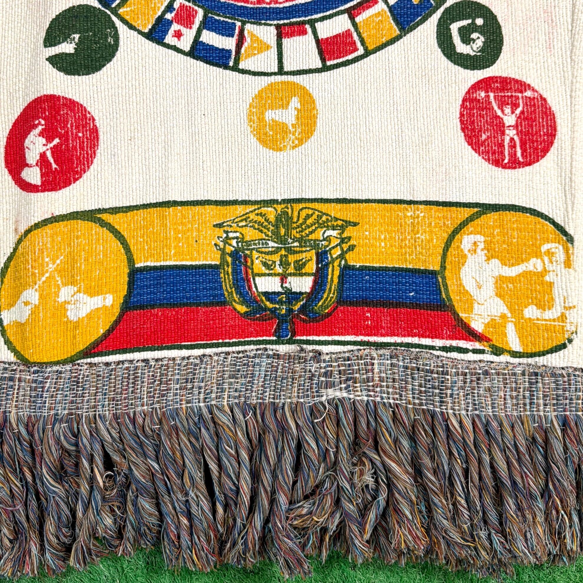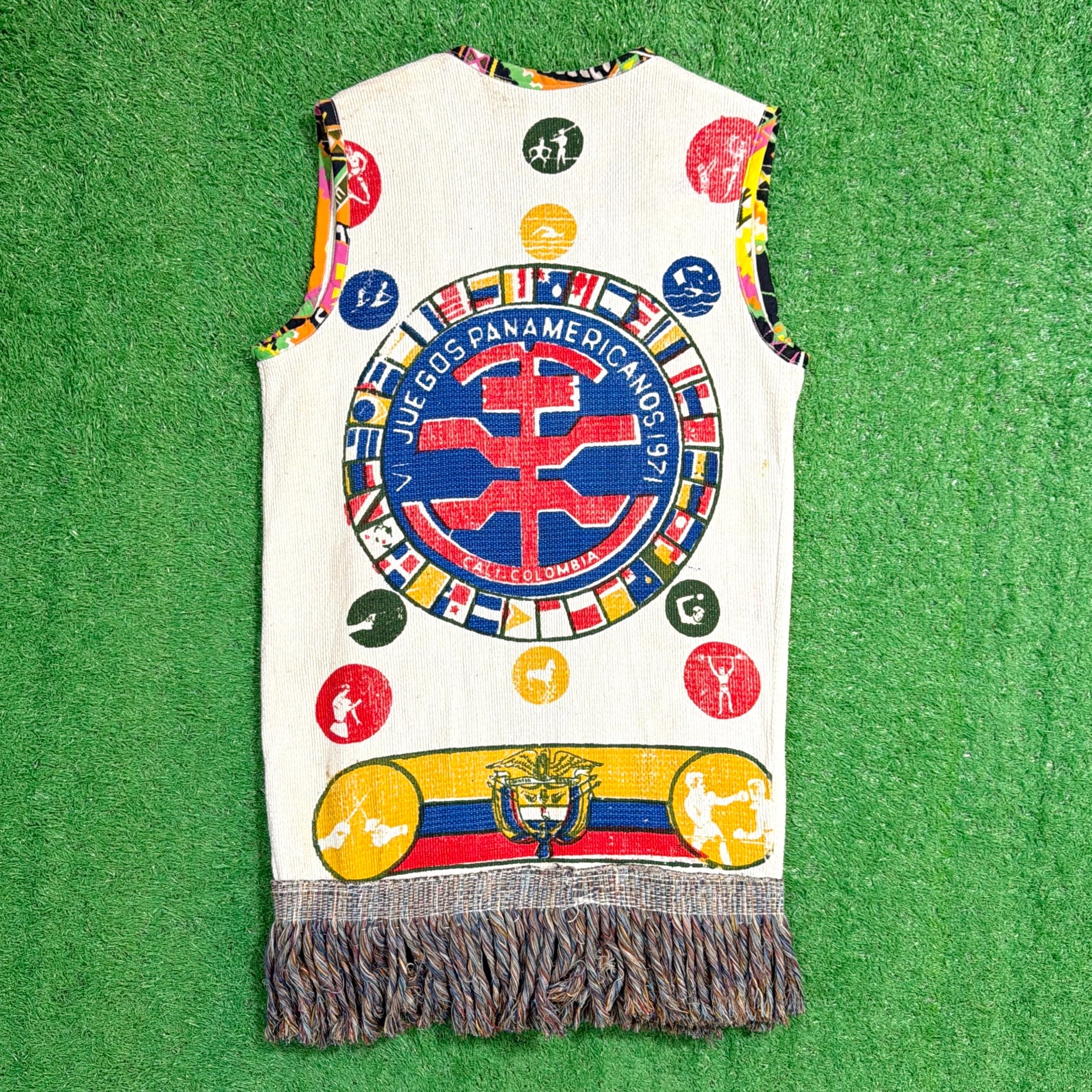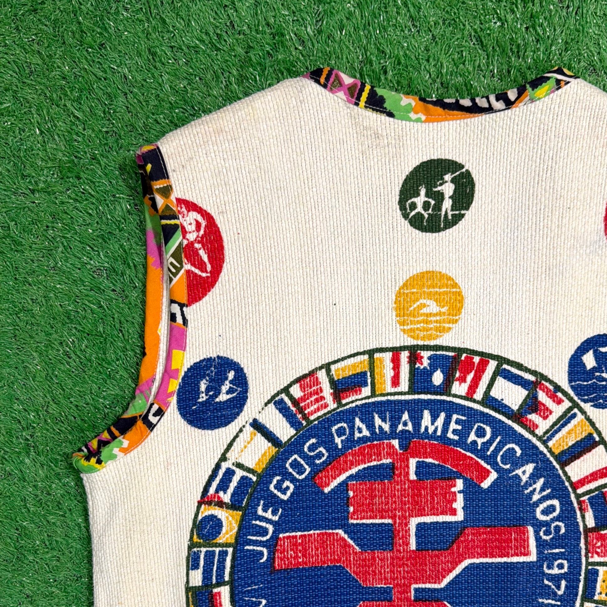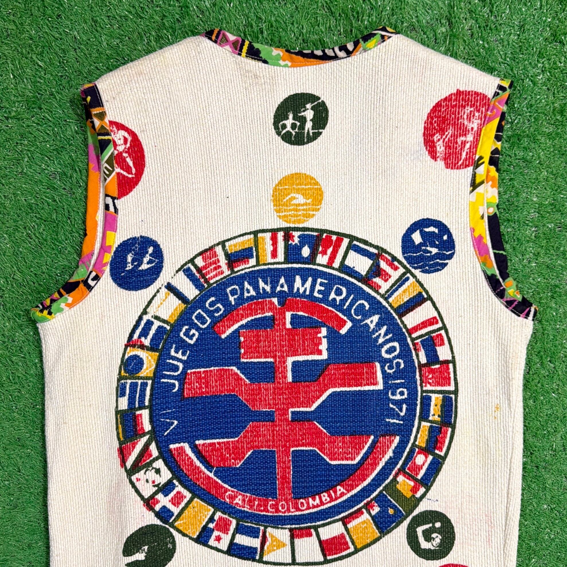 Pan American Games(パンアメリカン競技大会)は、北・中・南米の国々が参加する国際的なスポーツ大会で、1971年大会はコロンビア・カリで開催されました。本アイテムは、当時の大会関連の旗や記念用ファブリックをベースにリメイクされたものと考えられます。