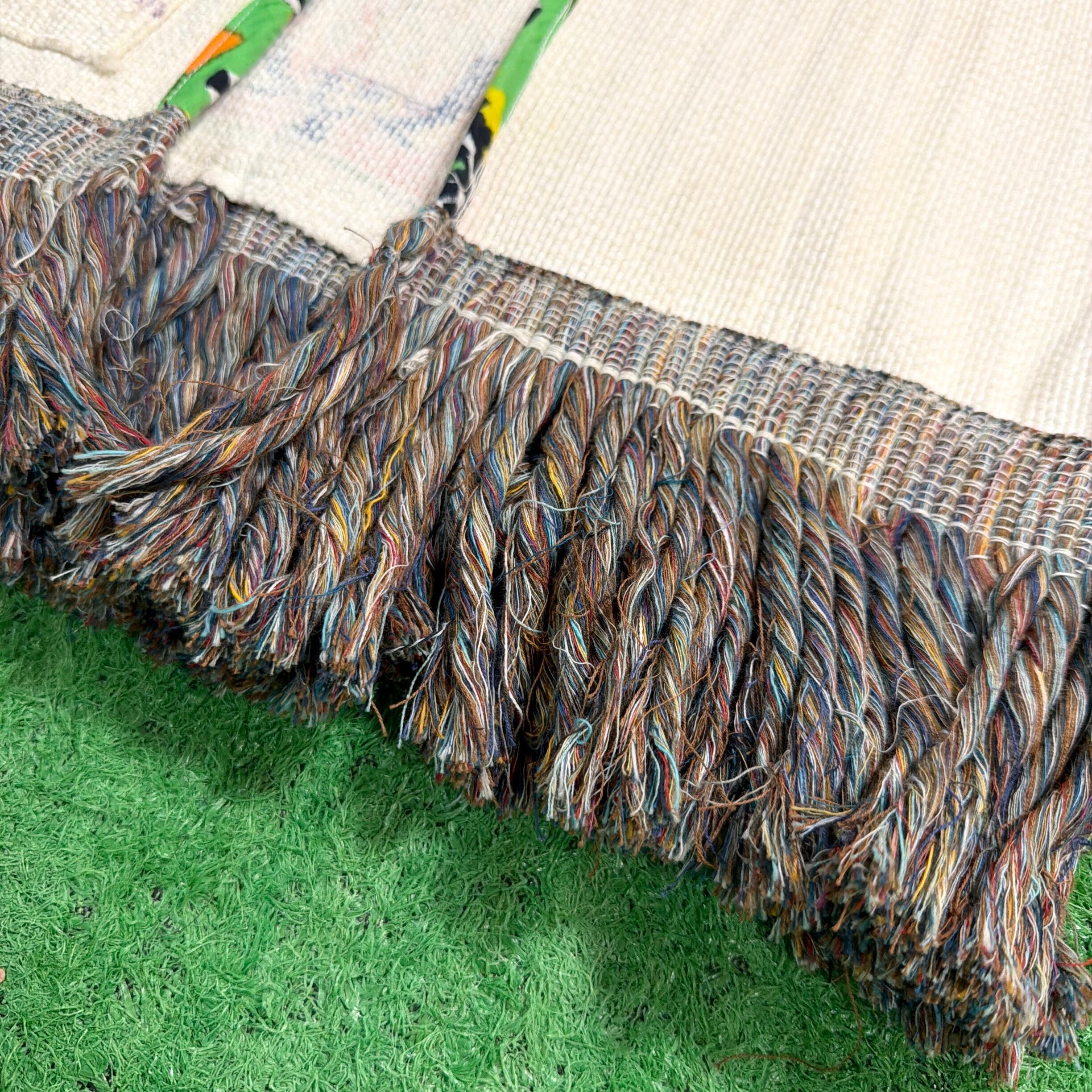 素材表記はありませんが、ざっくりとした織りのナチュラルな風合いで、コットンや麻に近い素材感。裾にはフリンジが施されており、1970年代らしいヒッピーやフォークロアのムードも漂います。