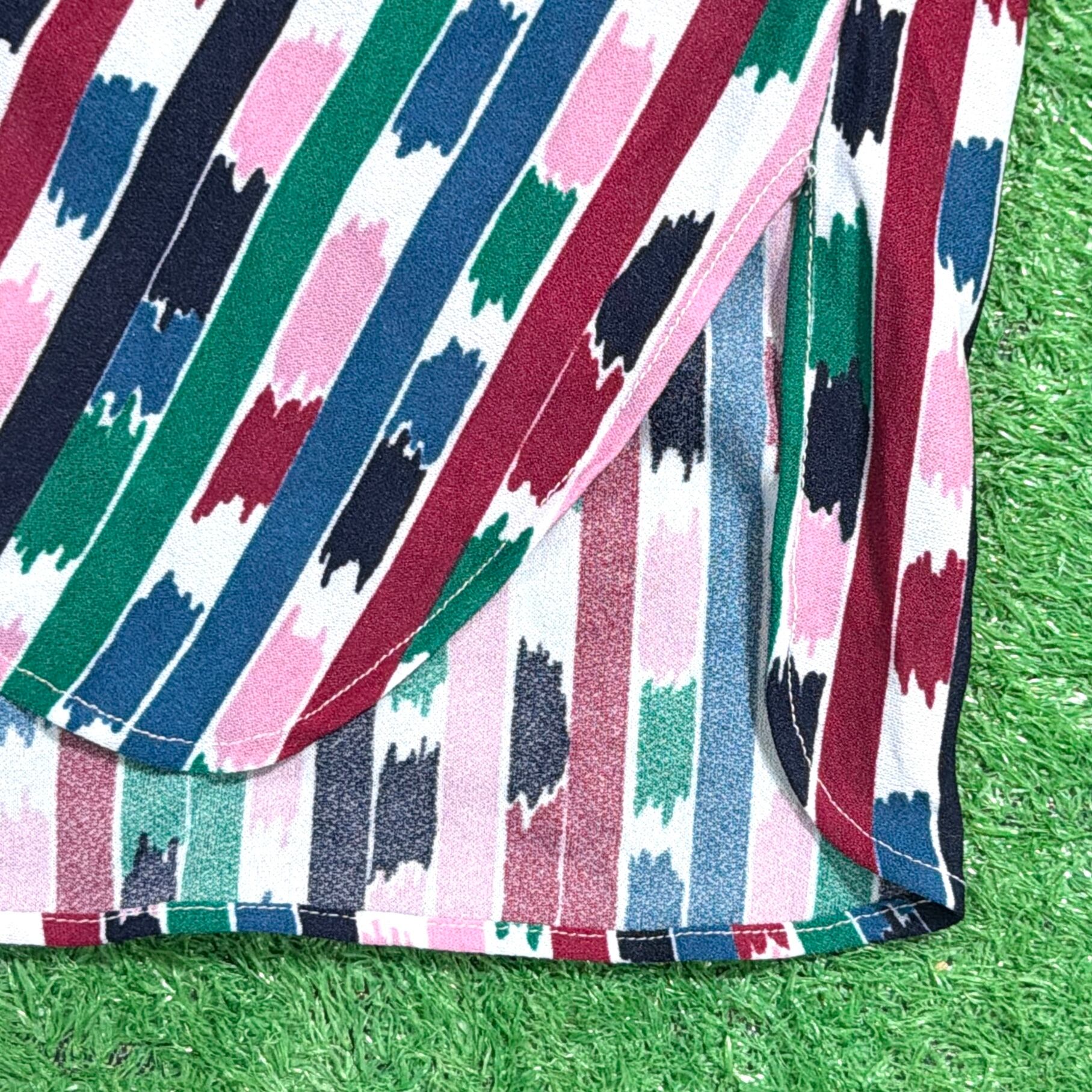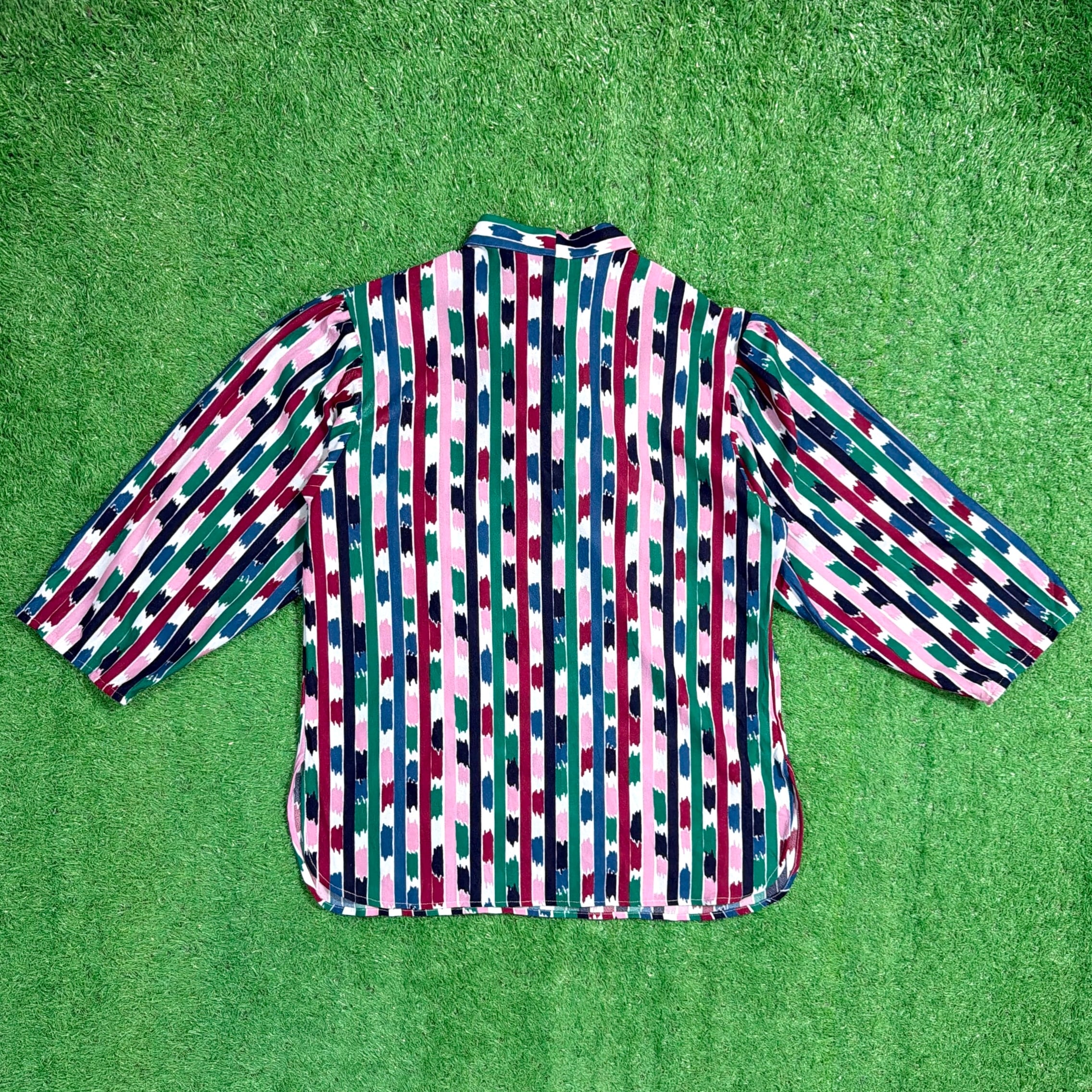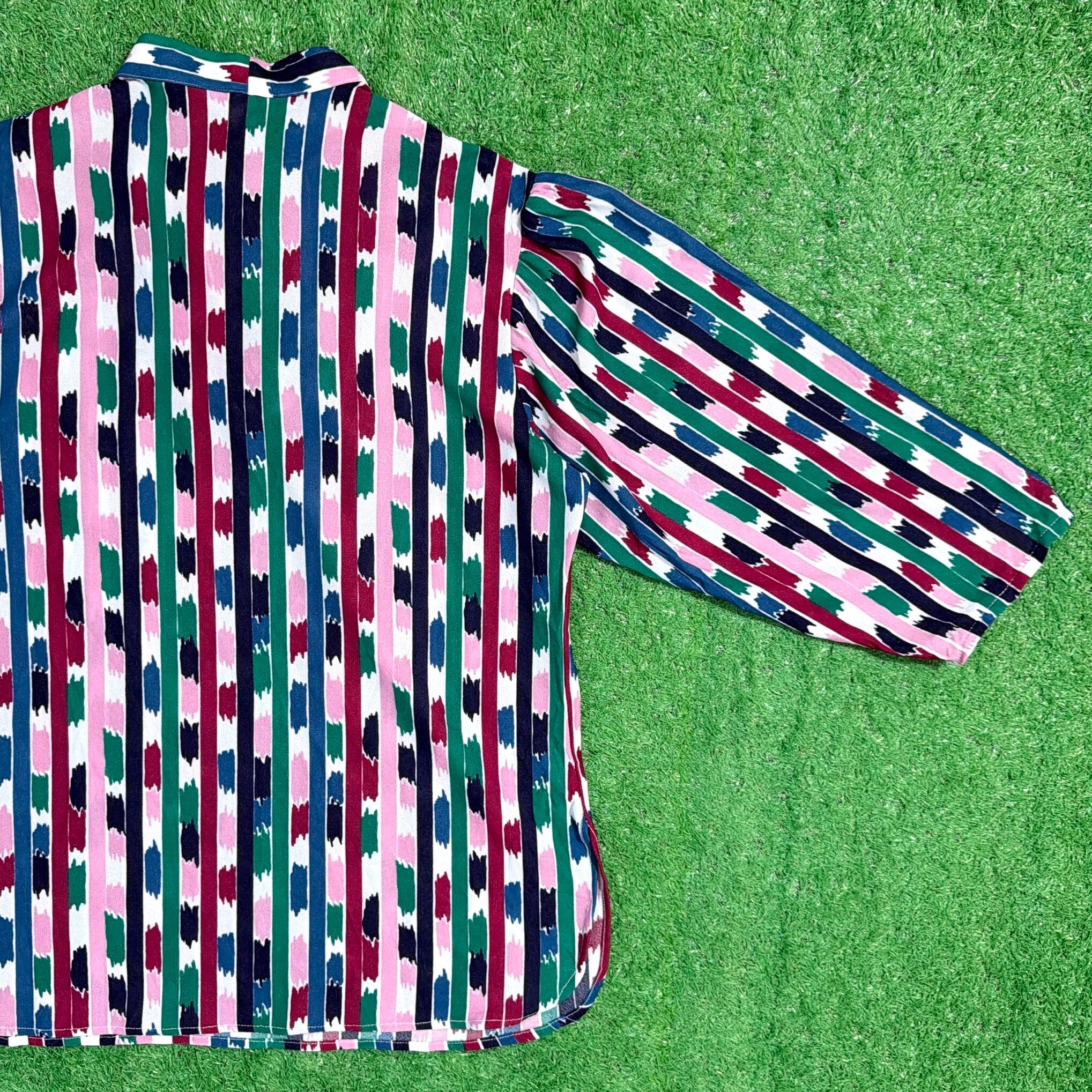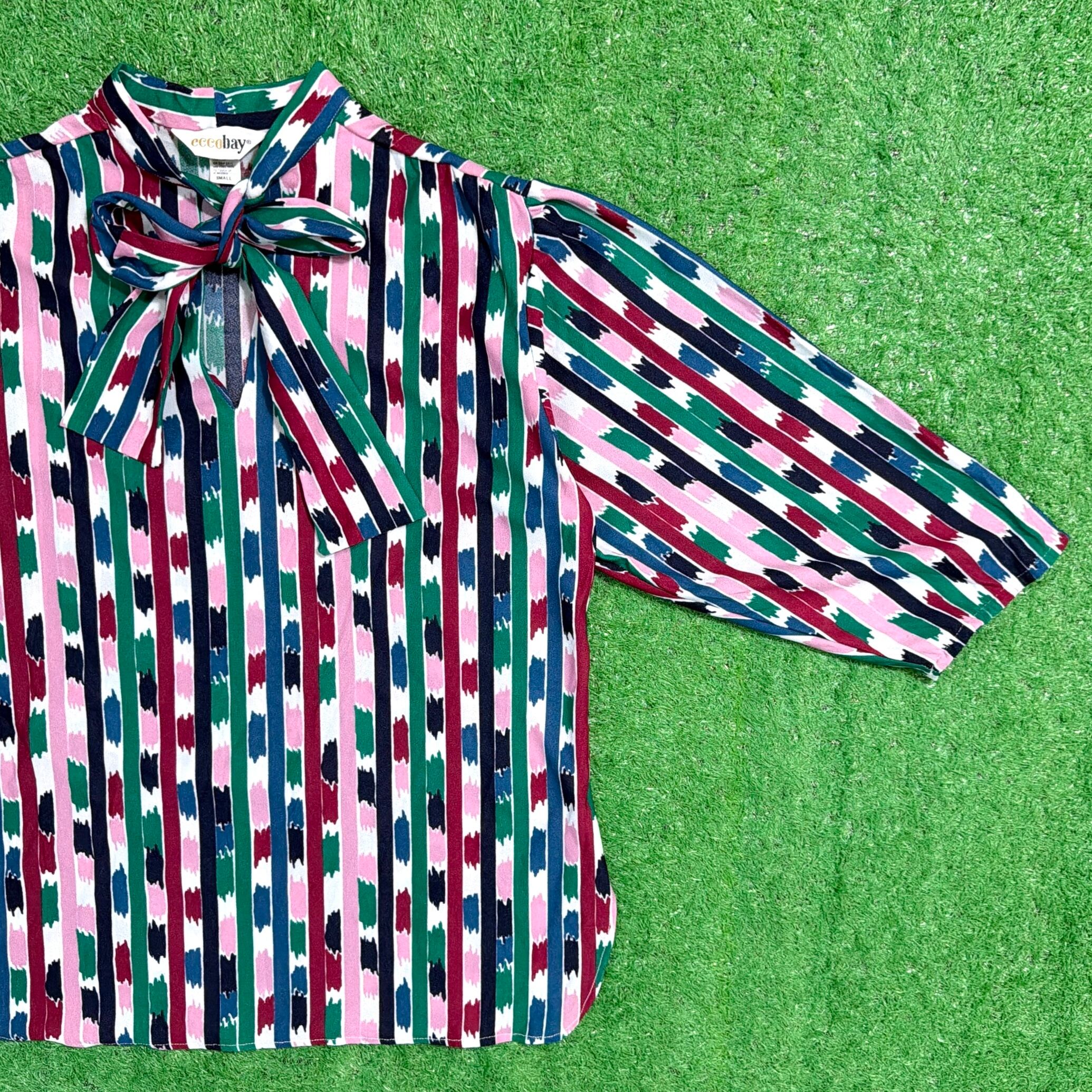 【Lady's】90s アート ストライプ 7分袖 ボウタイ プルオーバー トップス / 90年代 古着 シャツ レディース 総柄 1512
