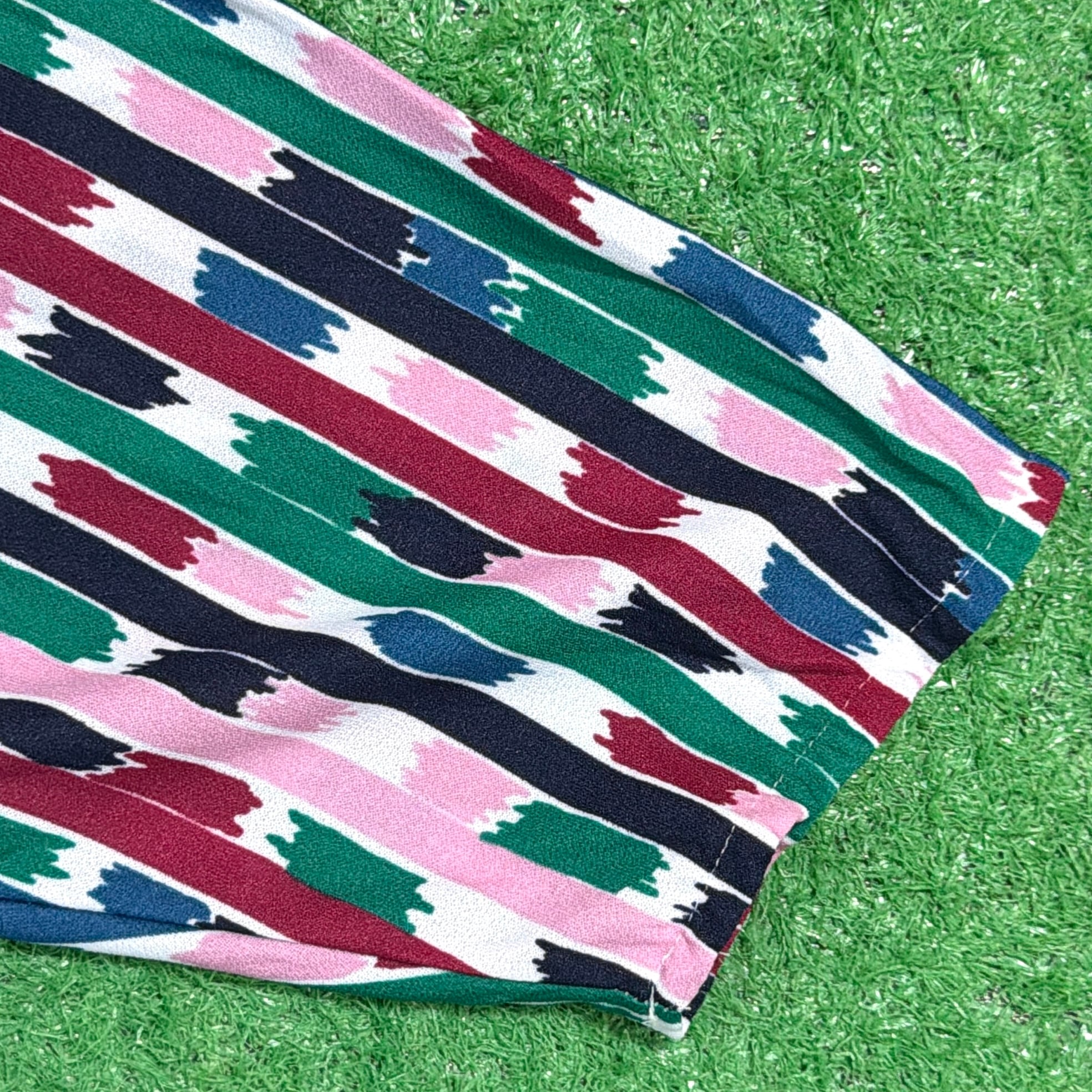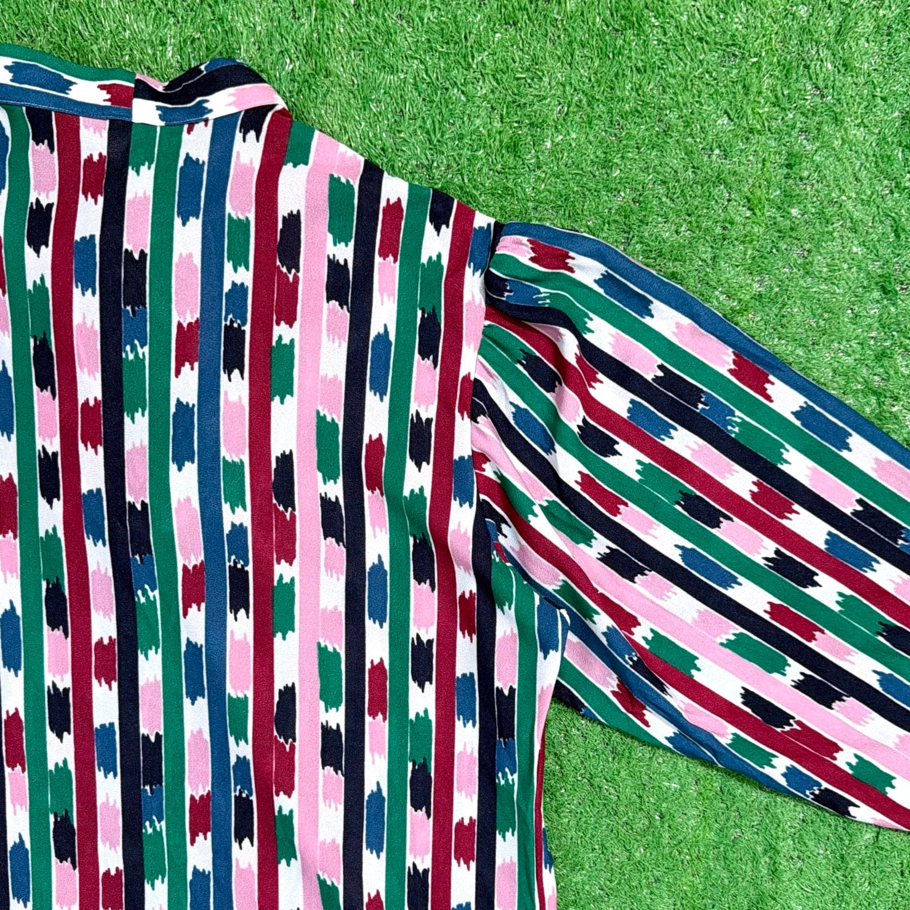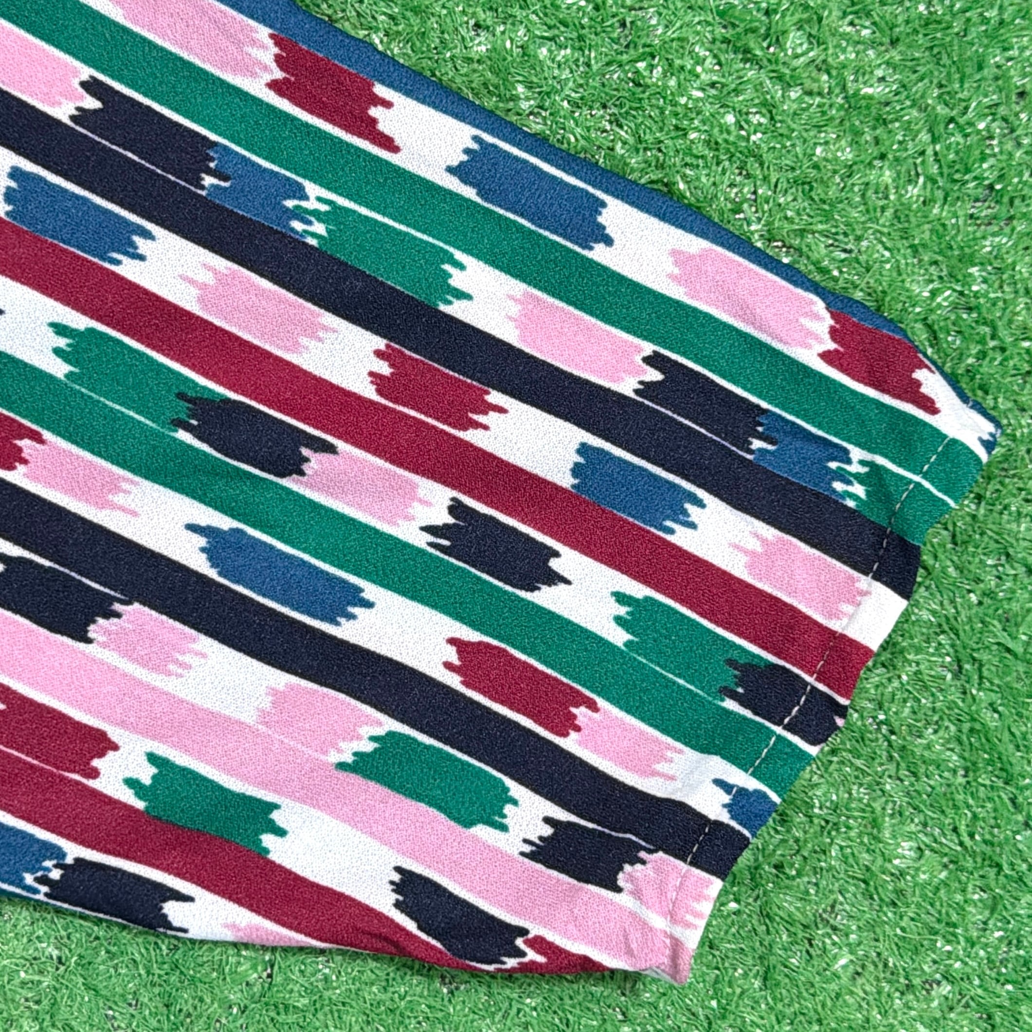 ストライプをベースにしつつもペイントのような表情があり、90sらしい遊び心を感じる一枚。ボウタイデザインが顔まわりのアクセントになり、シンプルなコーディネートでもしっかり存在感を出してくれます。