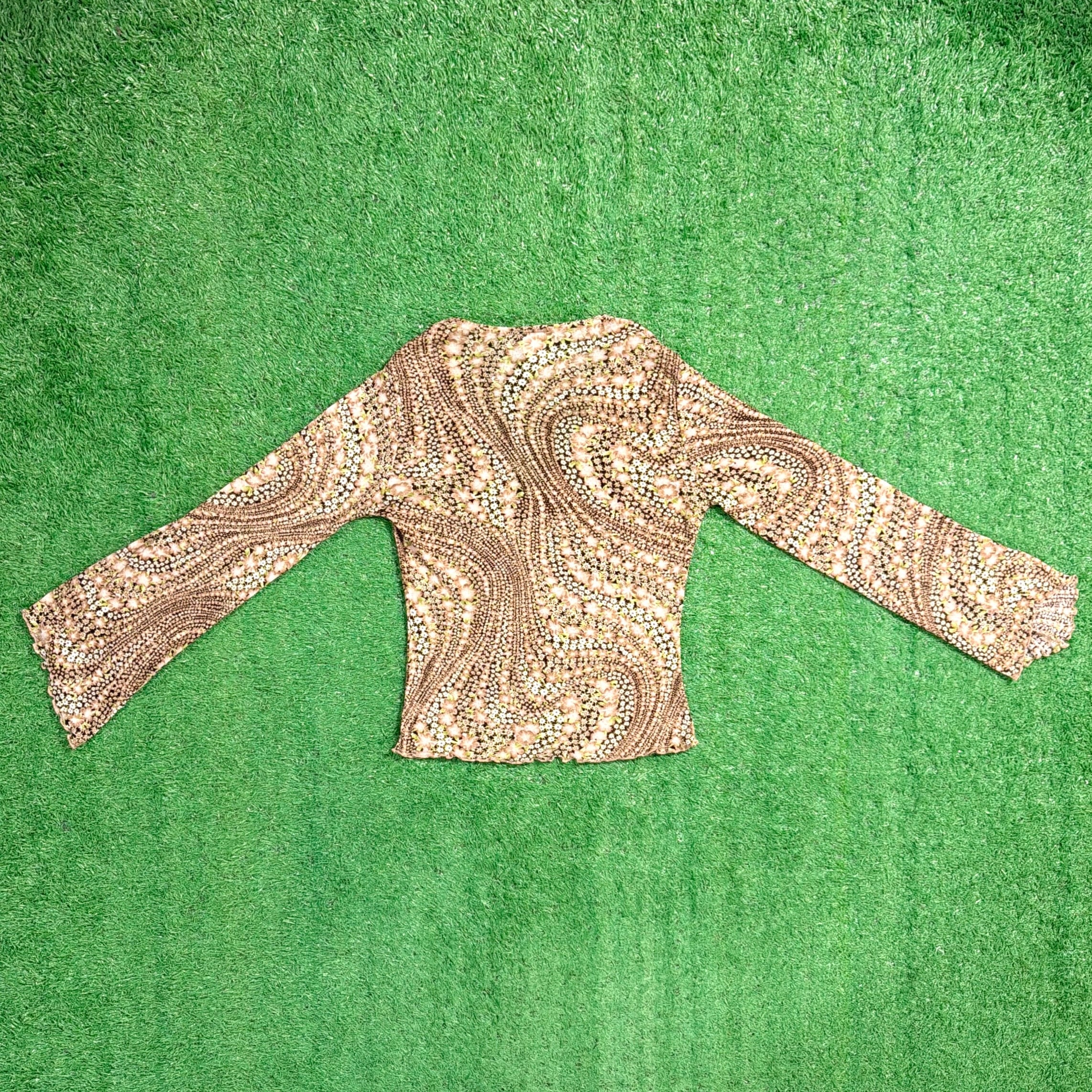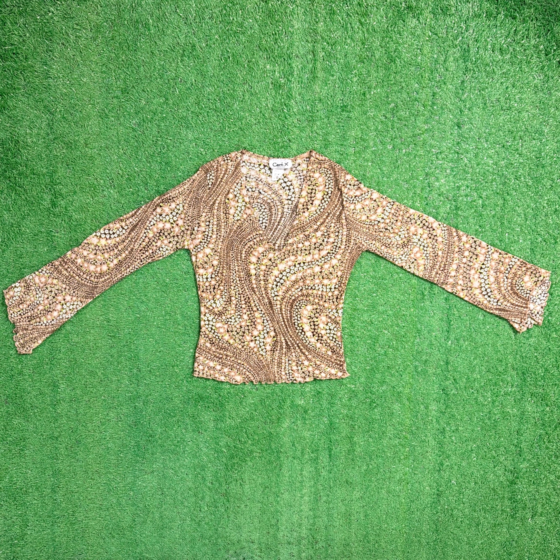 90年代らしいアート柄が目を引く、Vネックデザインのカットソートップスです。