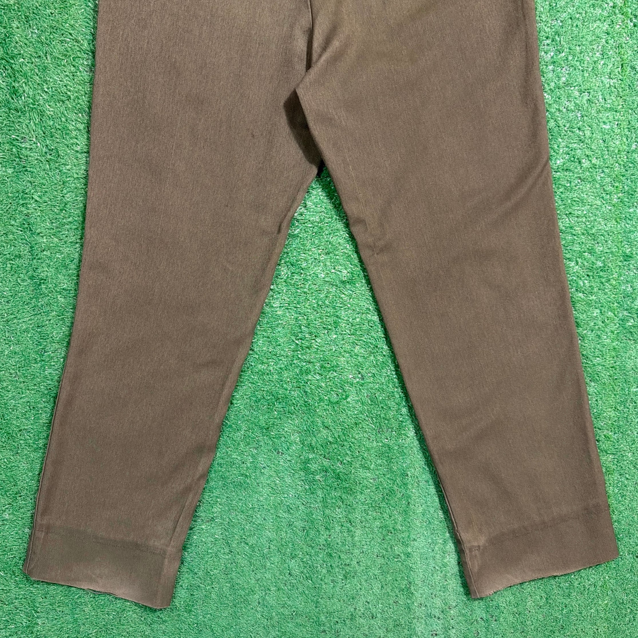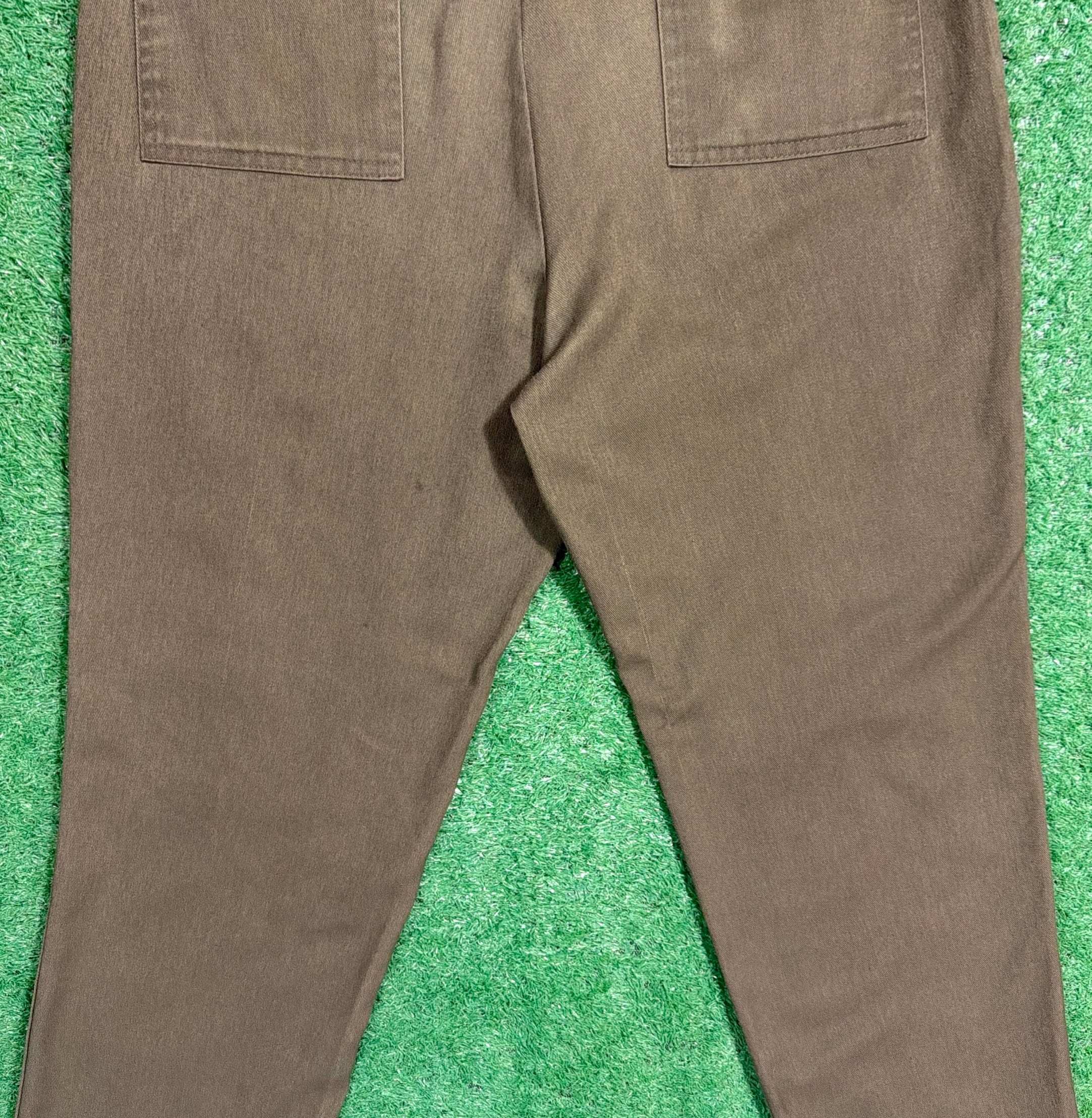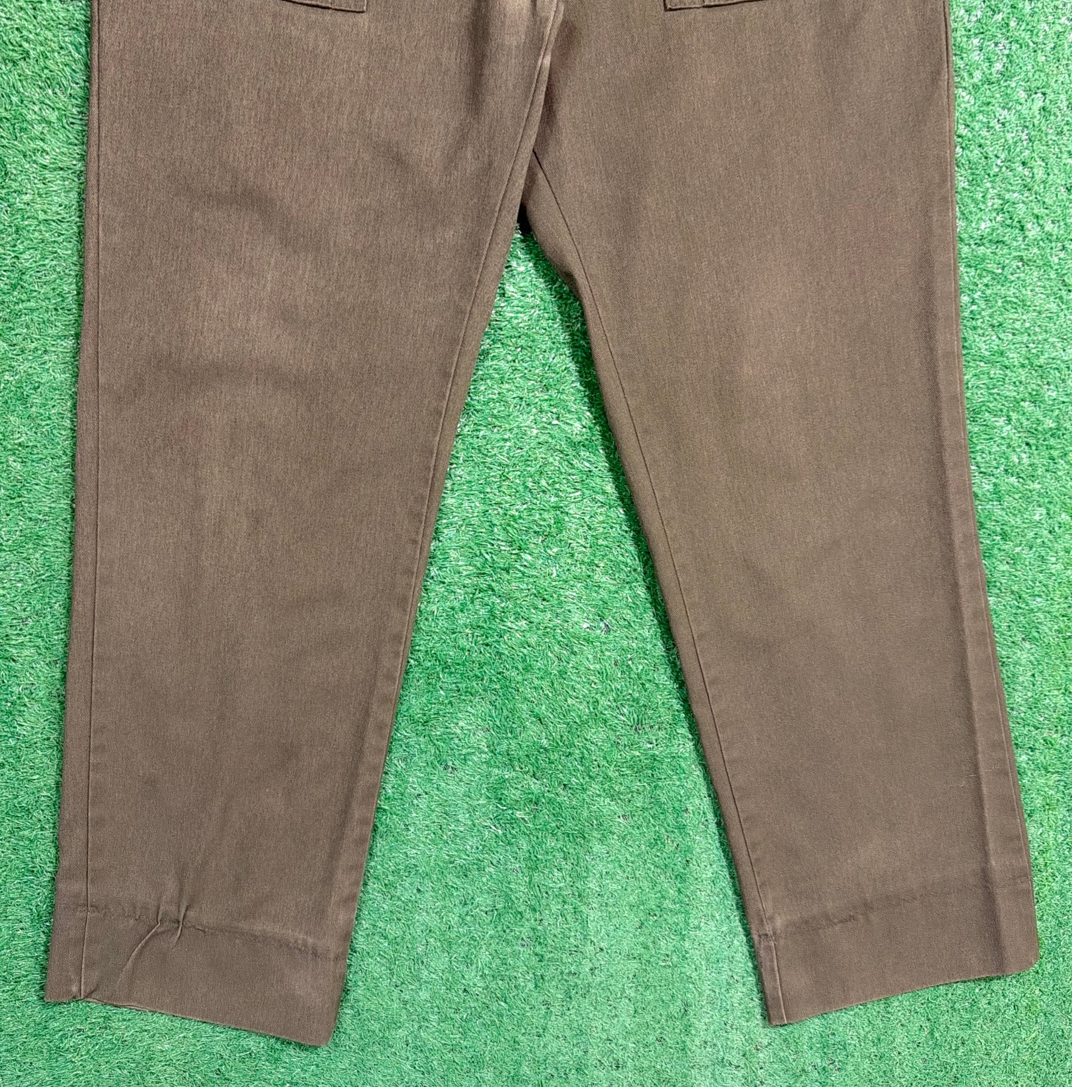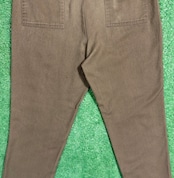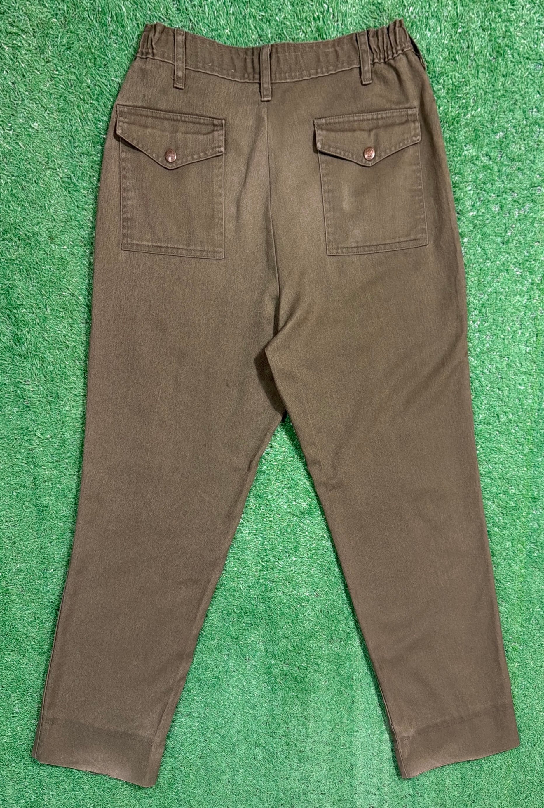 落ち着いたカーキカラーに、フラップ付きのバックポケットが特徴的で、当時のユニフォームらしい実用性の高いデザイン。ウエストはゴム仕様になっており、程よくリラックス感のある穿き心地です。太すぎず細すぎないシルエットで、ワークパンツやミリタリーパンツに近い感覚で取り入れやすい一本。コットン素材ならではのタフさもあり、日常使いしやすいパンツです。