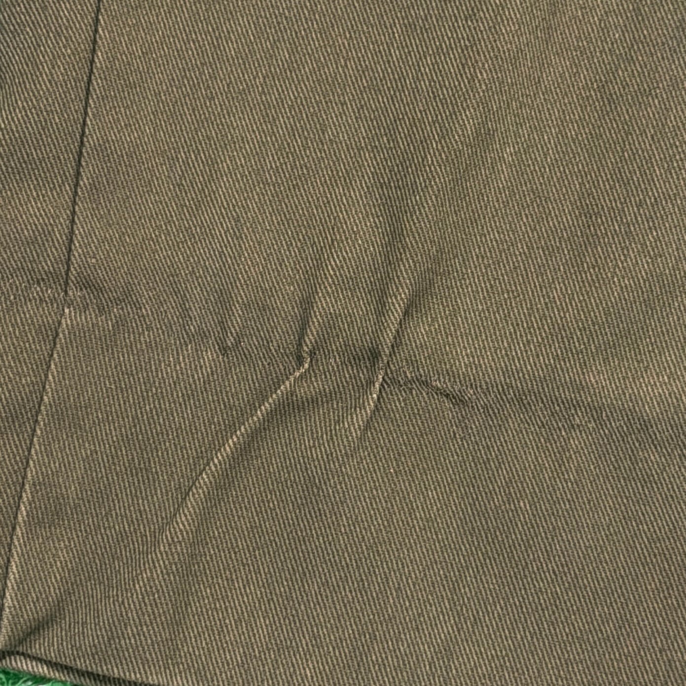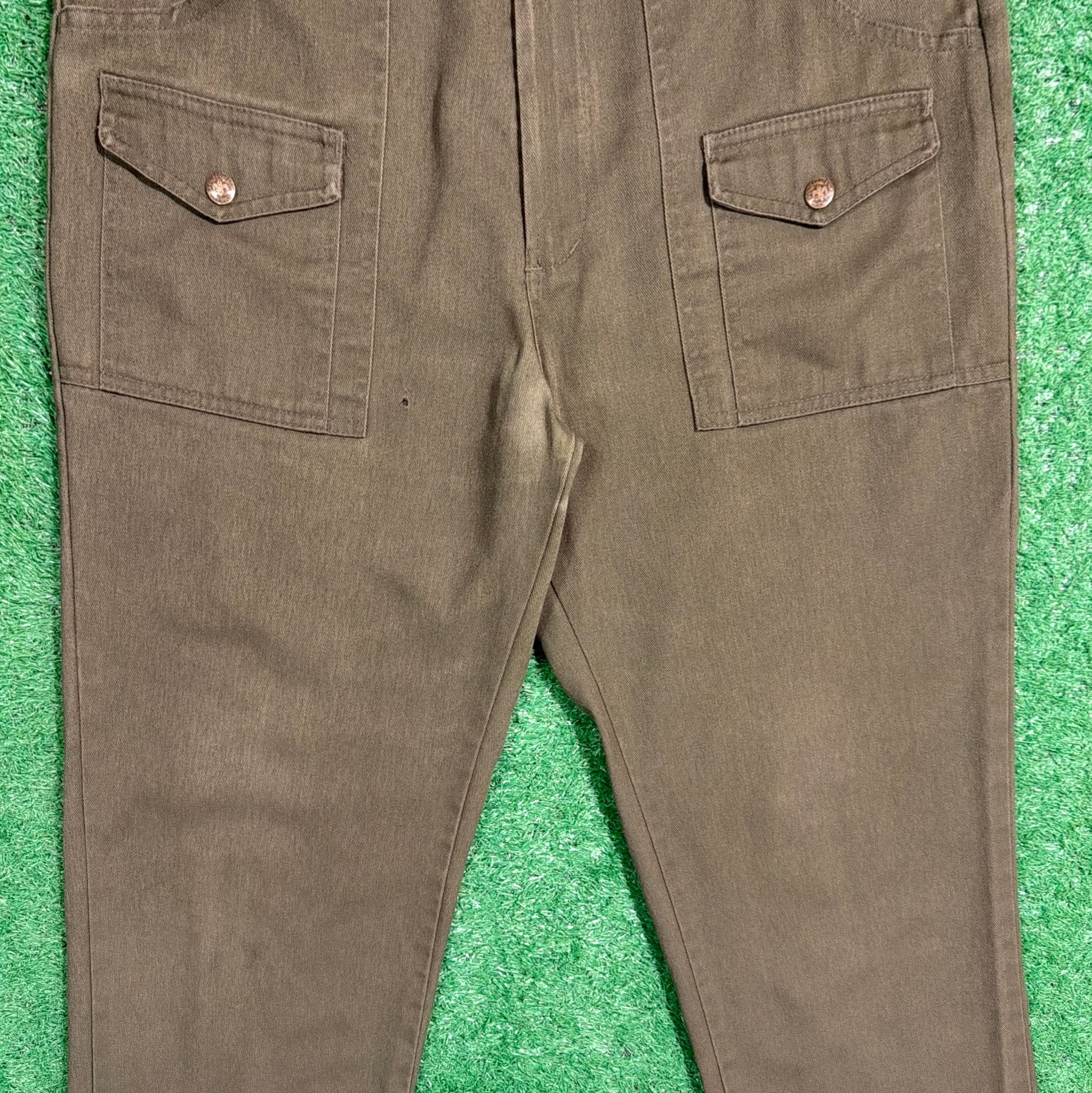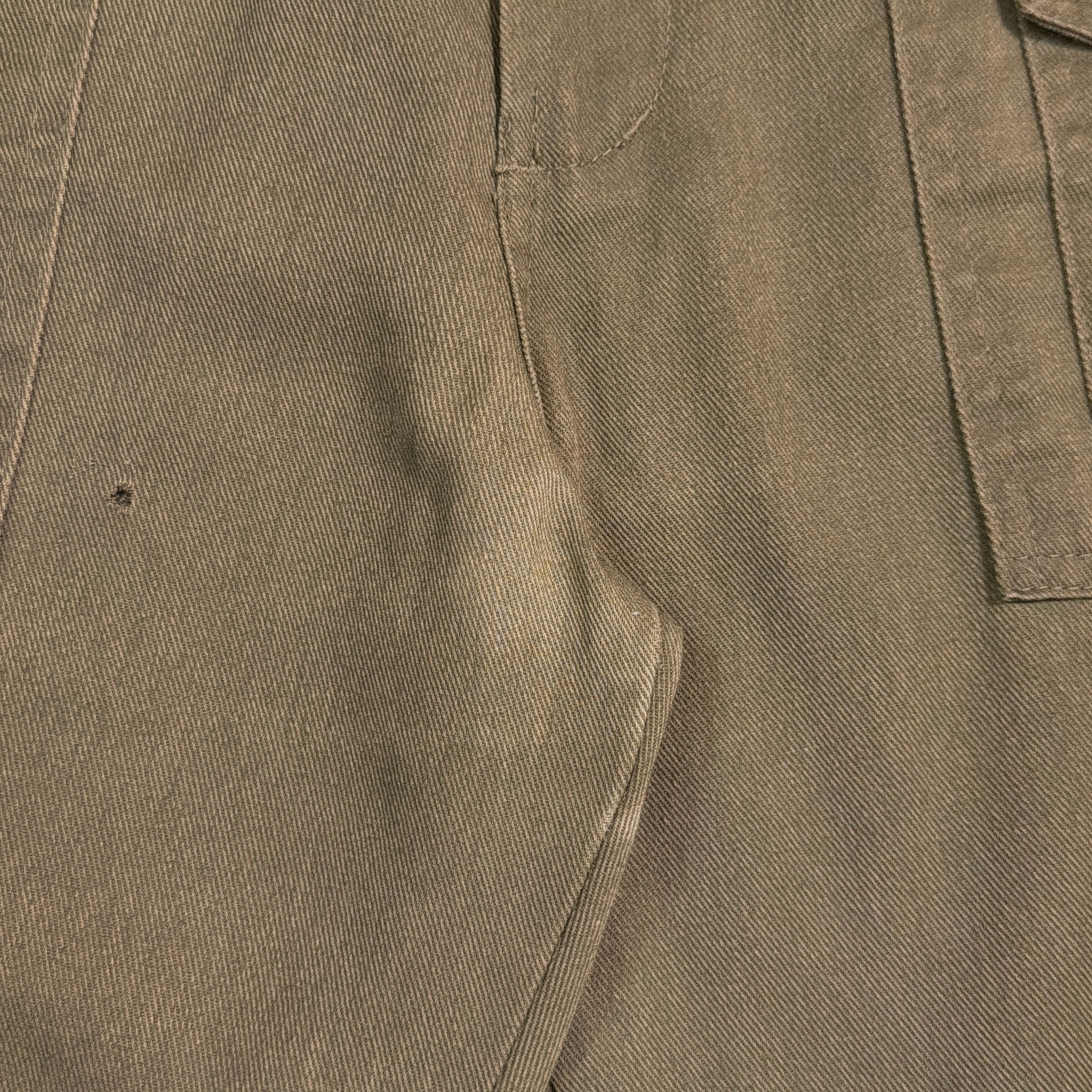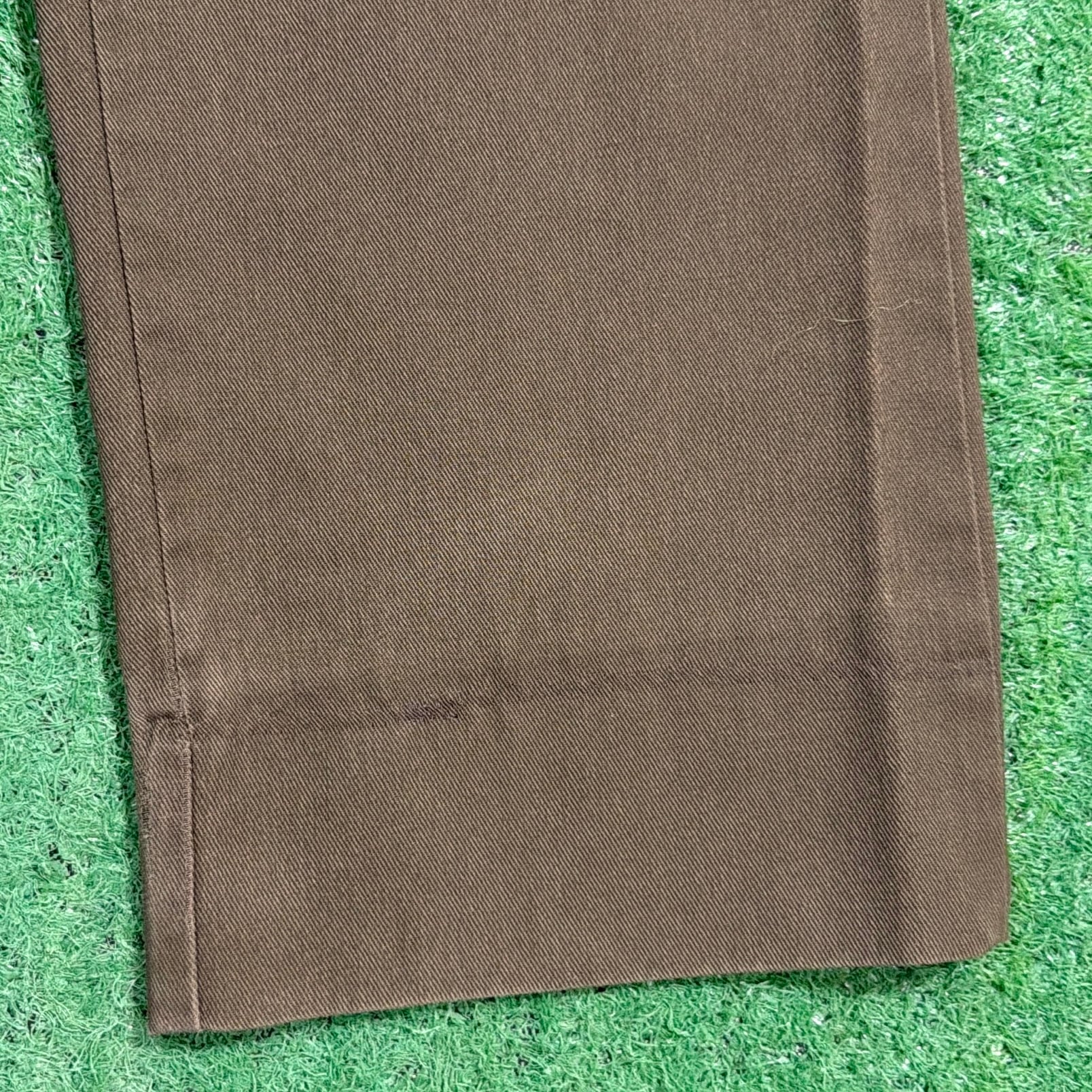 落ち着いたカーキカラーに、フラップ付きのバックポケットが特徴的で、当時のユニフォームらしい実用性の高いデザイン。ウエストはゴム仕様になっており、程よくリラックス感のある穿き心地です。太すぎず細すぎないシルエットで、ワークパンツやミリタリーパンツに近い感覚で取り入れやすい一本。コットン素材ならではのタフさもあり、日常使いしやすいパンツです。