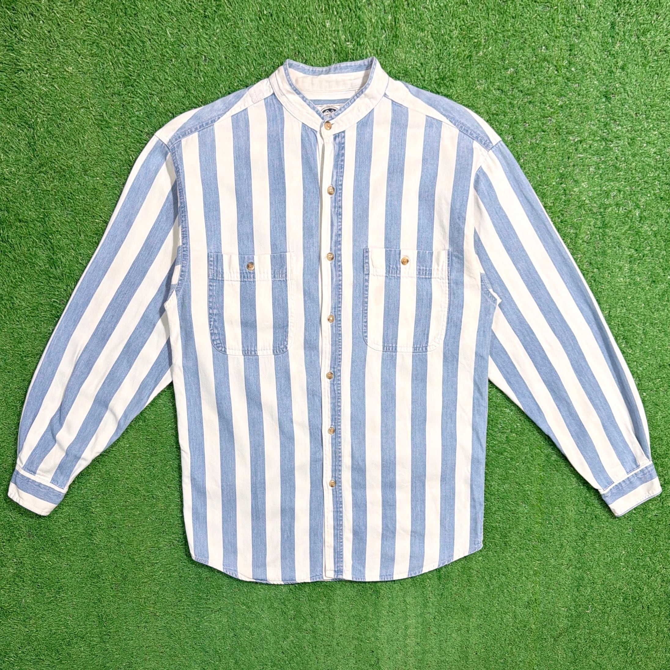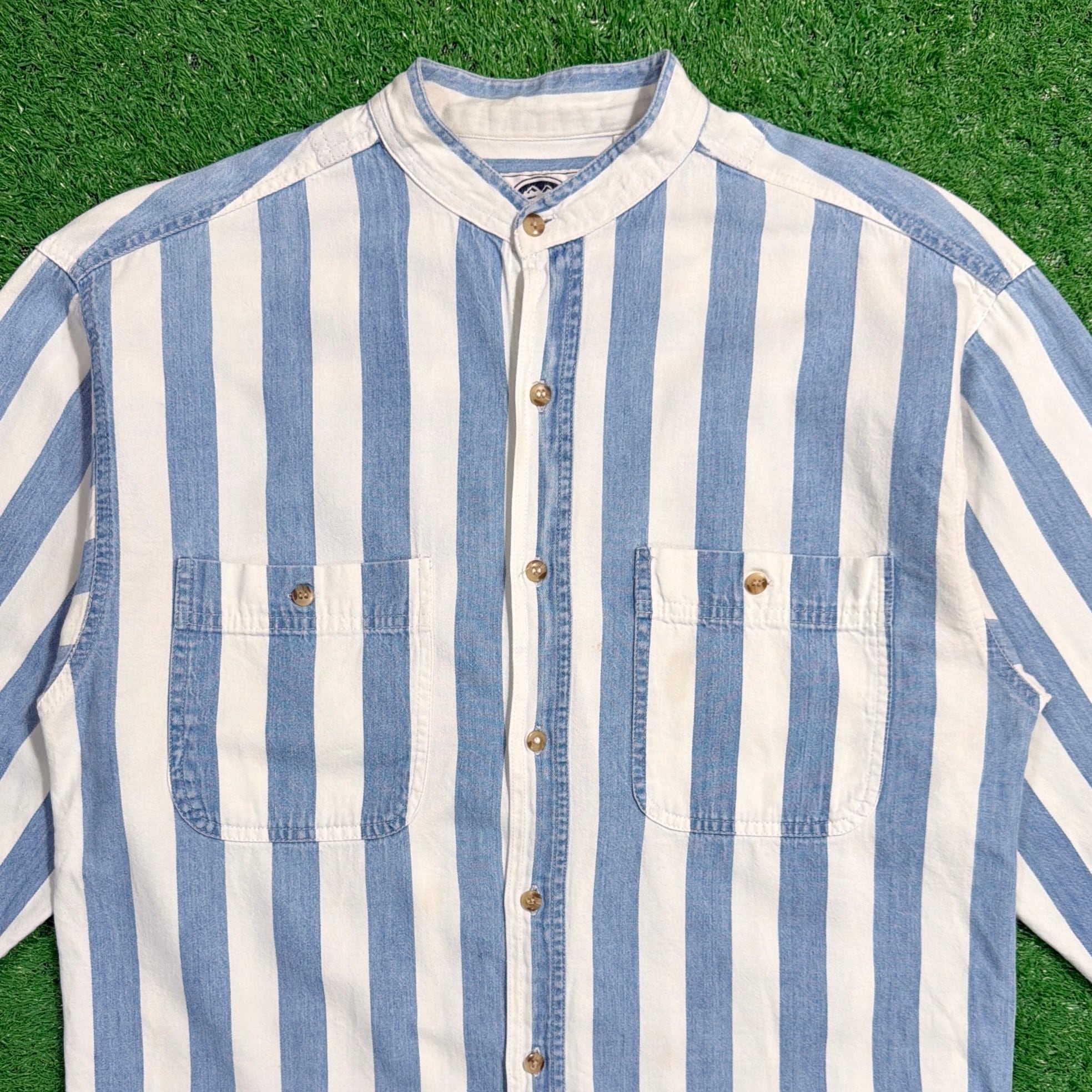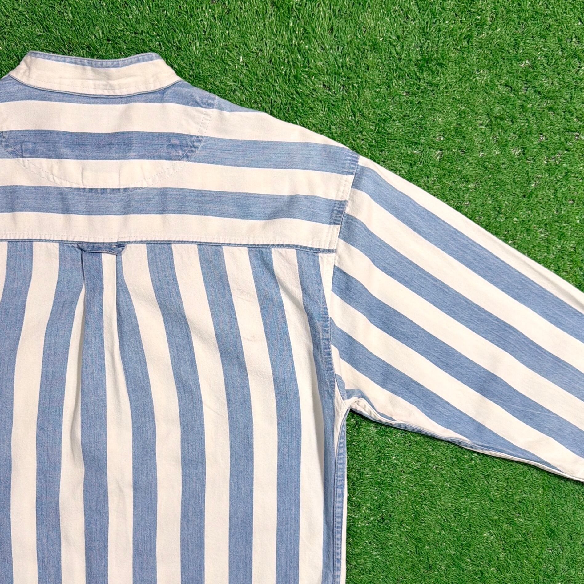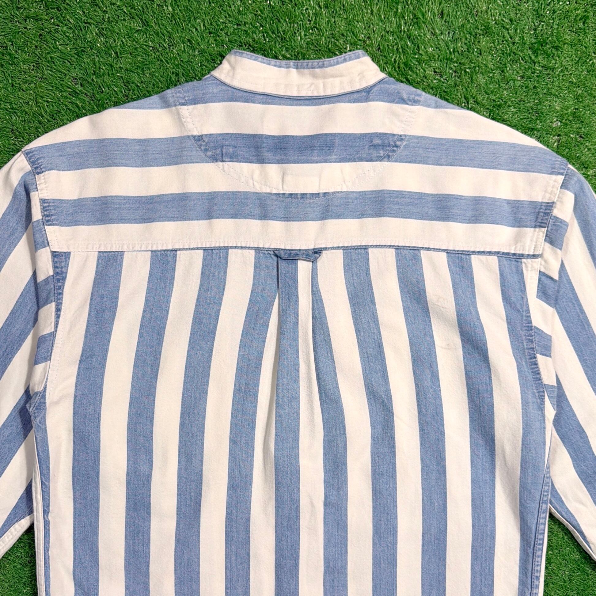 爽やかなストライプ柄に、襟のないすっきりとした首元が特徴的で、90sらしい程よく力の抜けた雰囲気の一着。シンプルながらも作りの良さが感じられます。