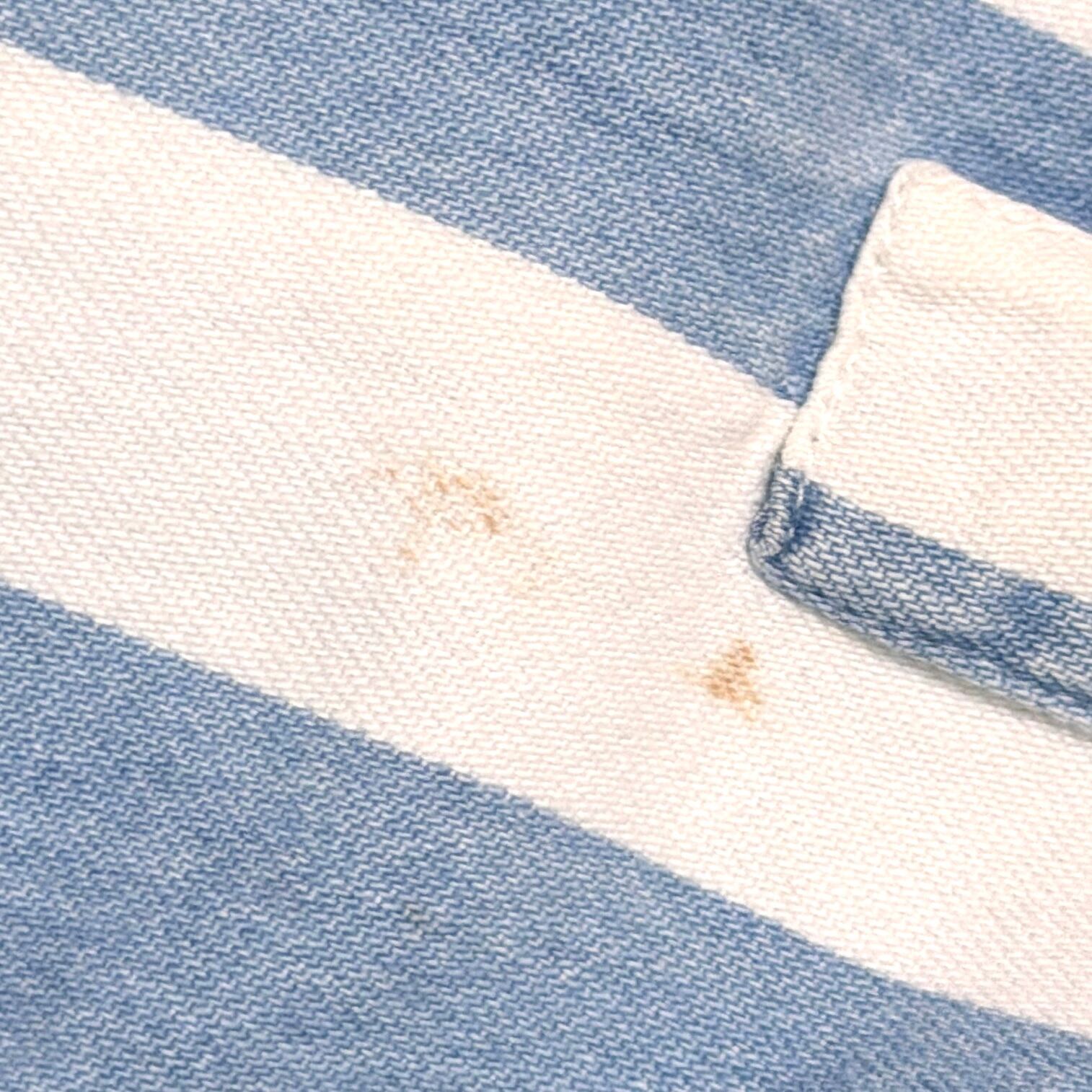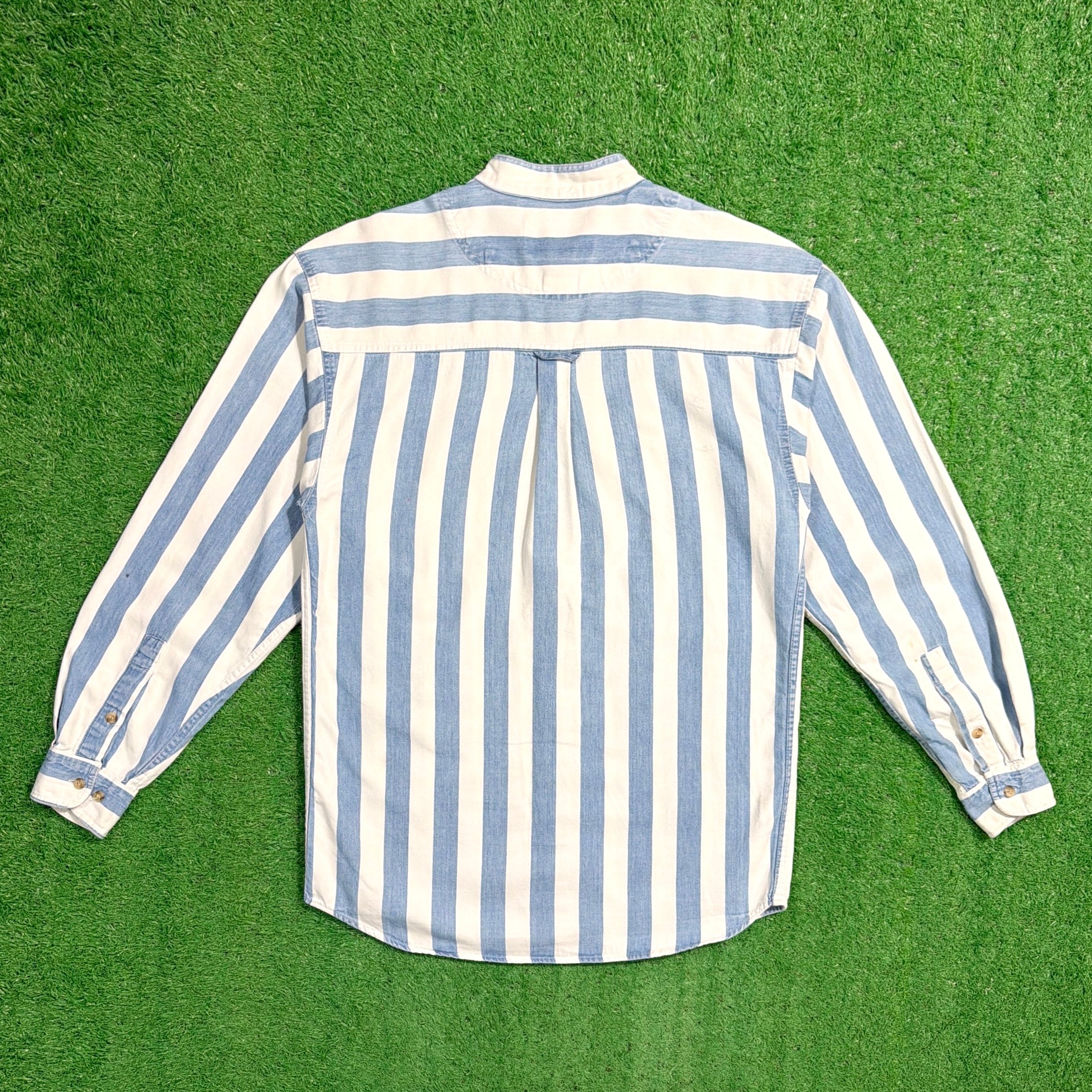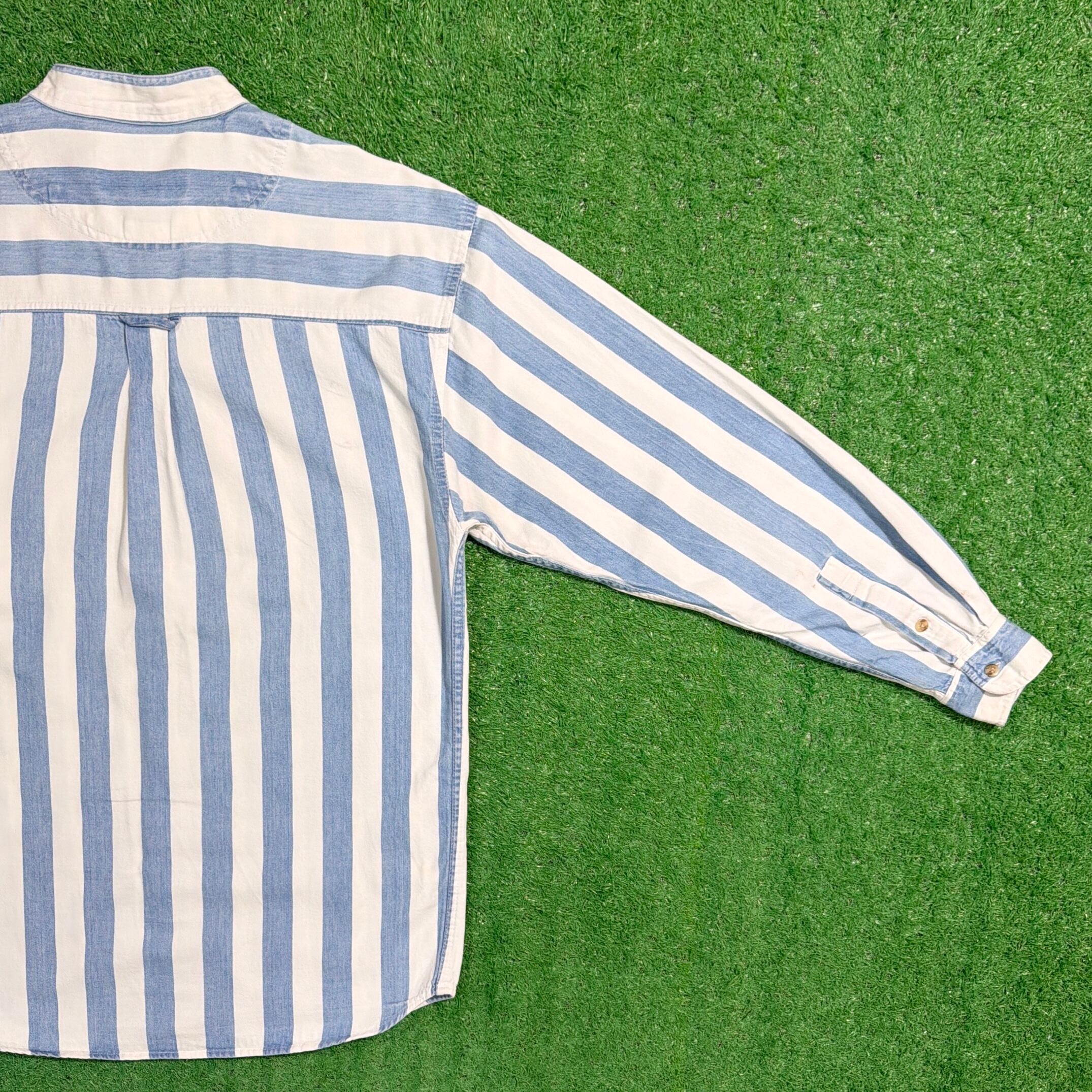 爽やかなストライプ柄に、襟のないすっきりとした首元が特徴的で、90sらしい程よく力の抜けた雰囲気の一着。シンプルながらも作りの良さが感じられます。
