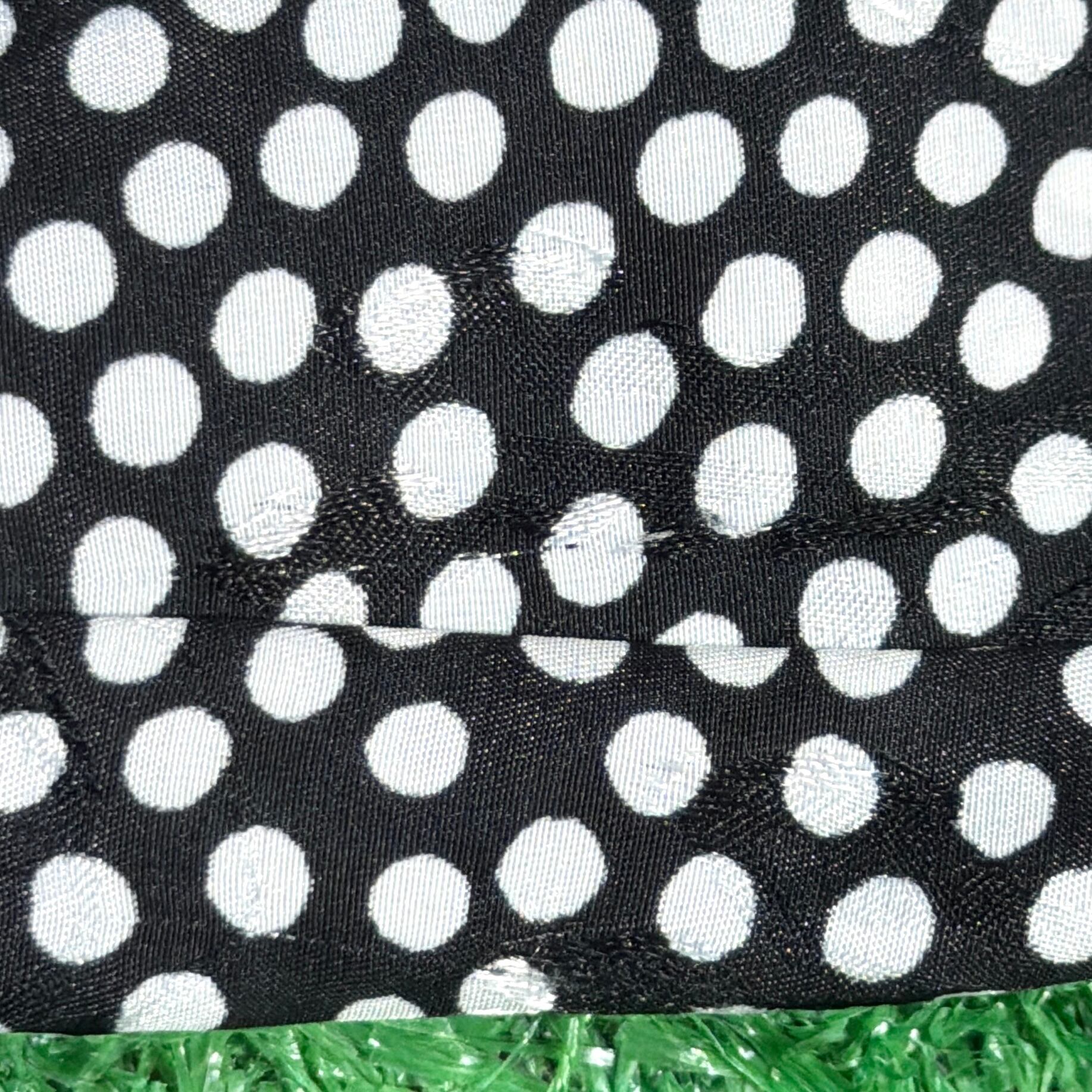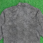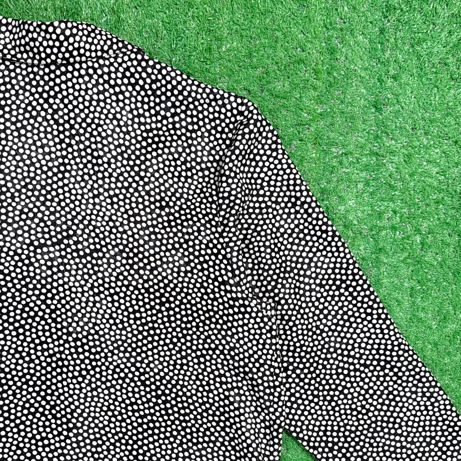 細かめのドット柄なので主張しすぎず、コーディネートに程よいアクセントをプラスしてくれる一着。ポリエステル素材ならではの軽くてシャカシャカした質感で、かっちりしすぎずラフに羽織れるのもポイントです。