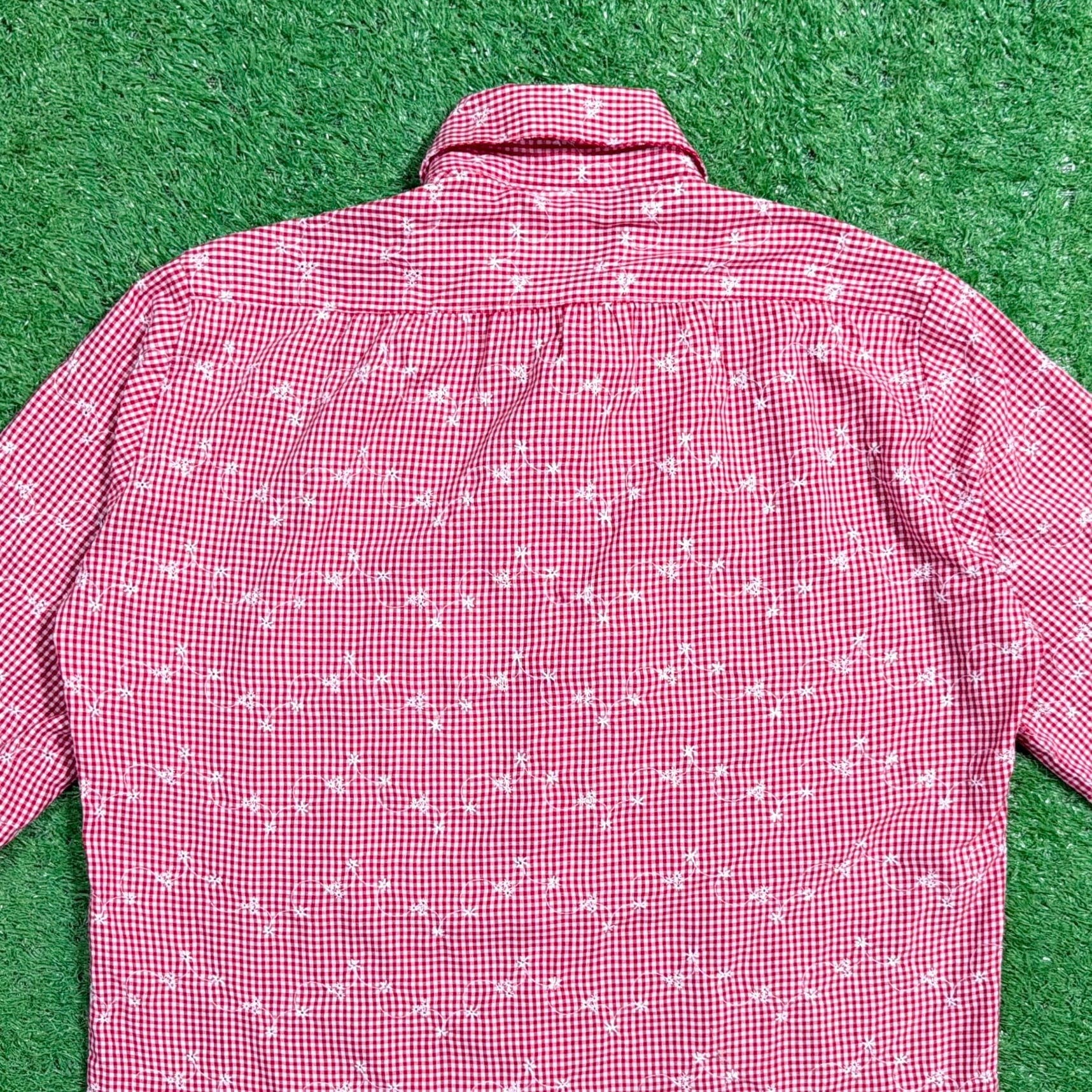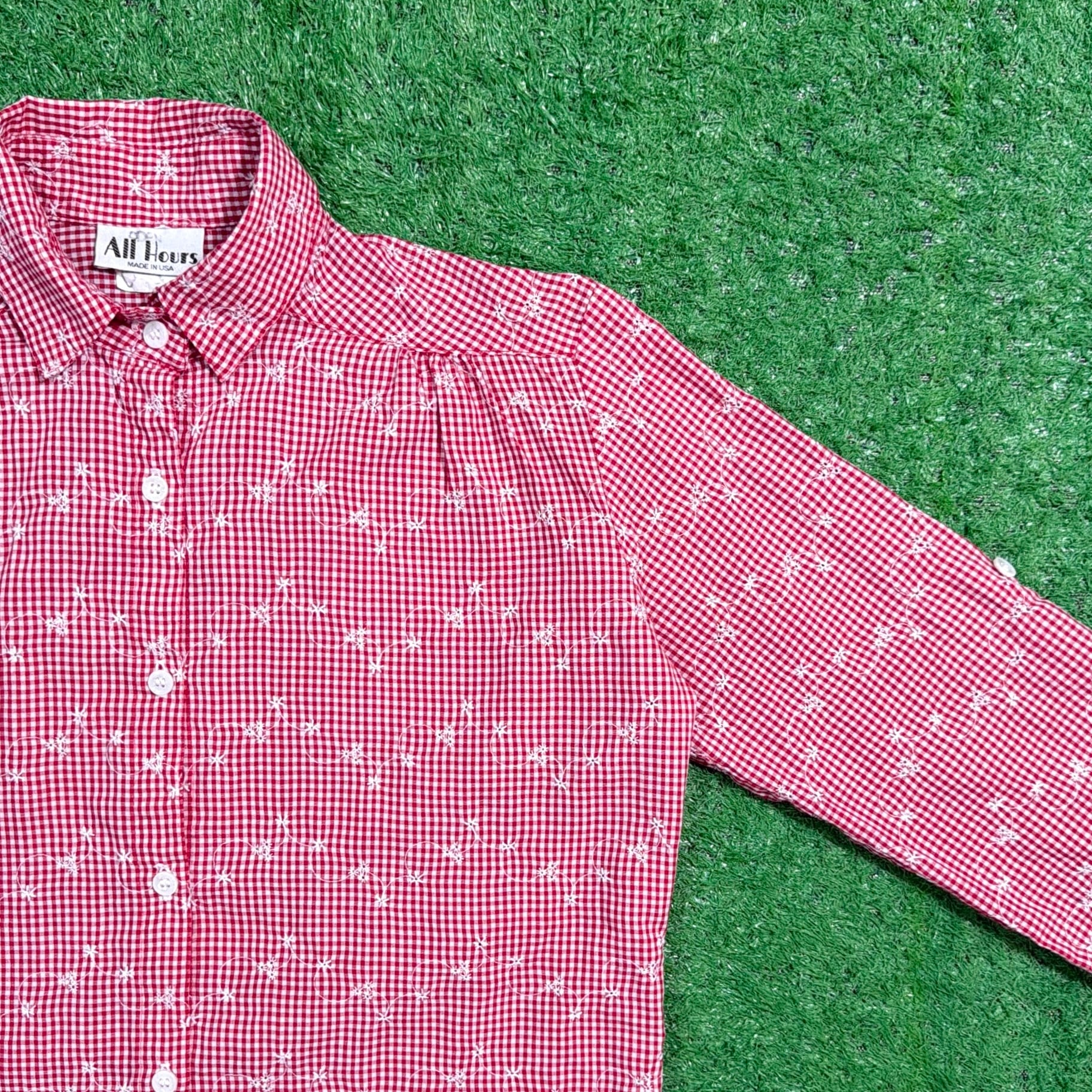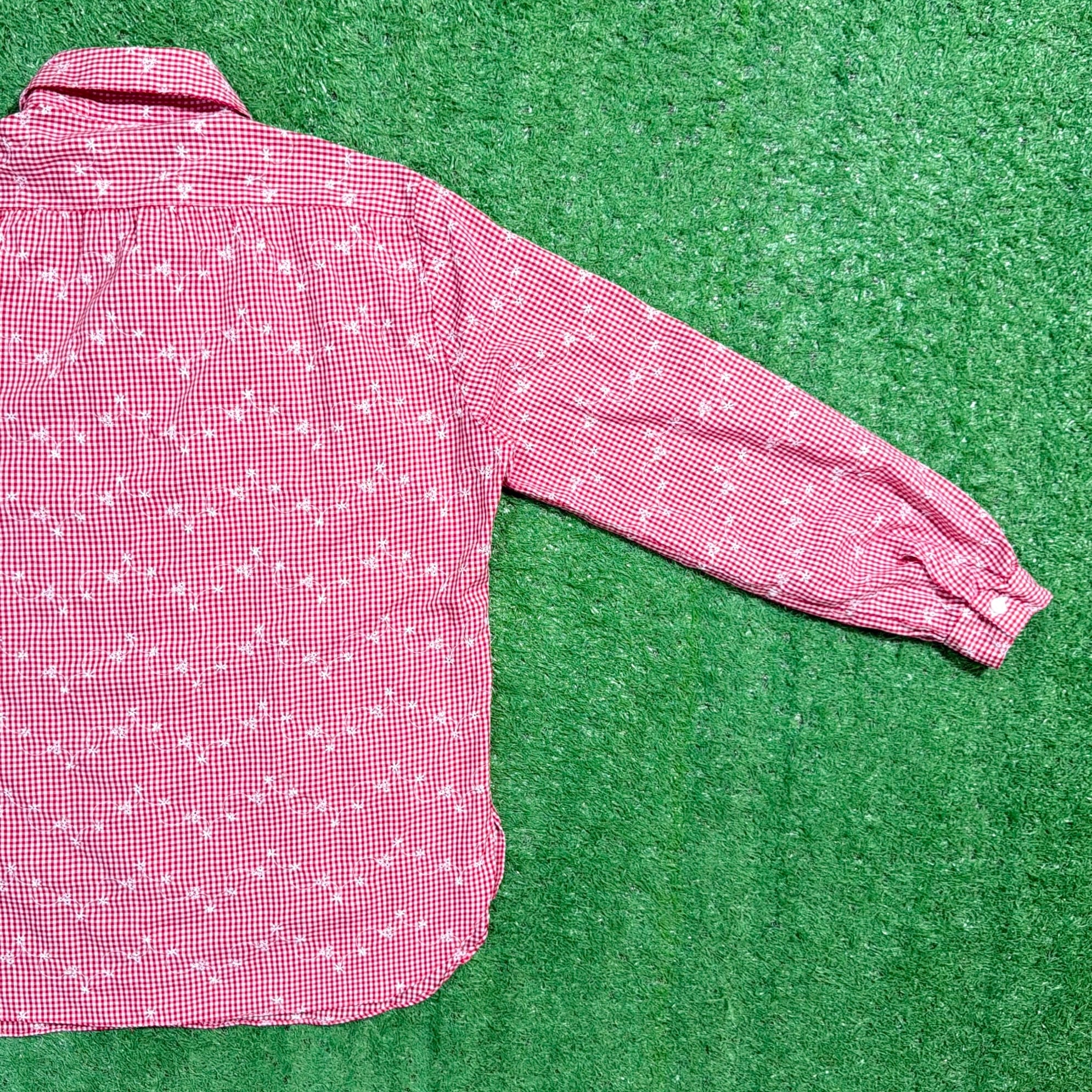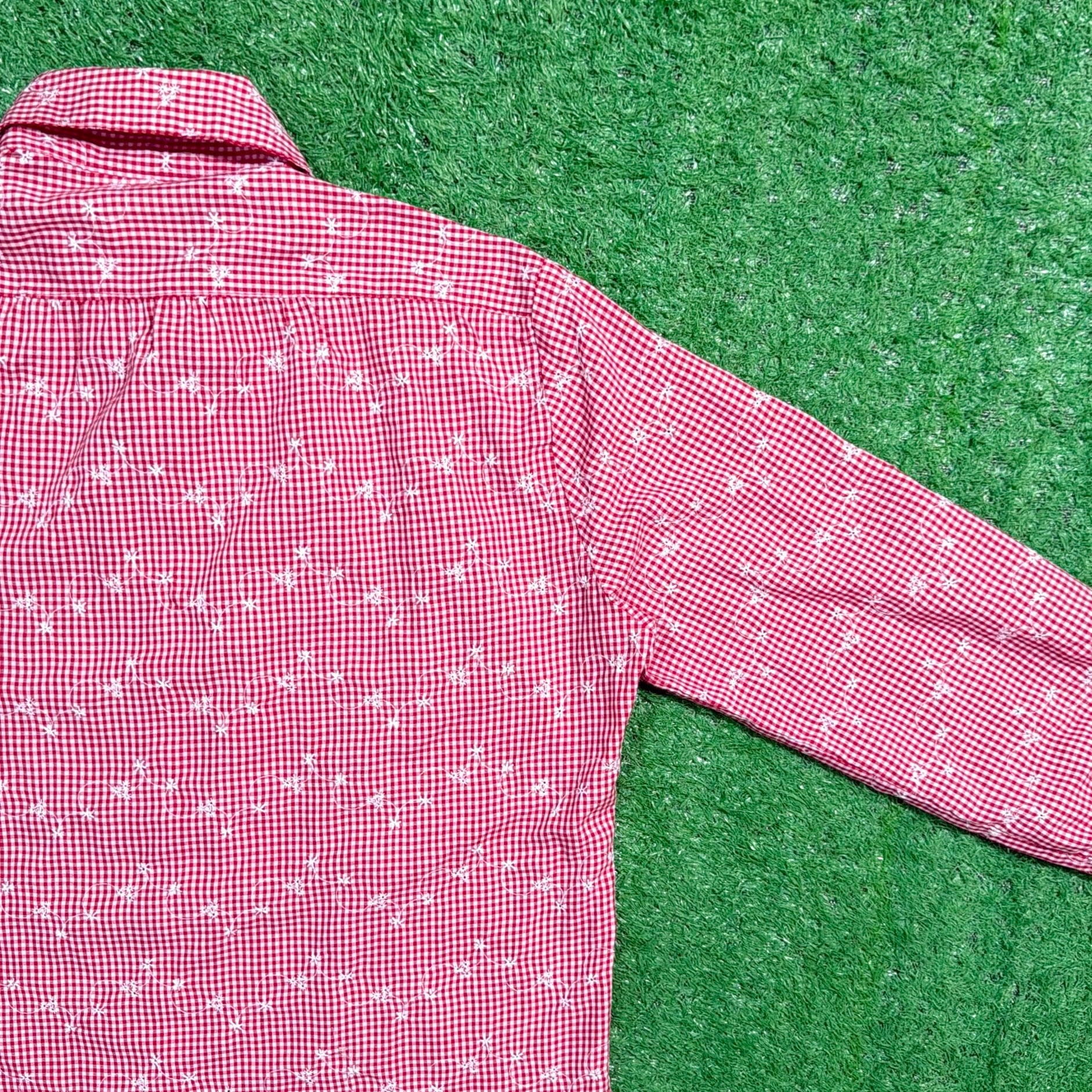 赤×白の細かなギンガムチェックをベースに、さりげなく散りばめられた花柄が可愛らしく、80sらしいレトロな雰囲気を楽しめる一枚。柄同士の主張が強すぎず、全体的にまとまりのあるデザインです。