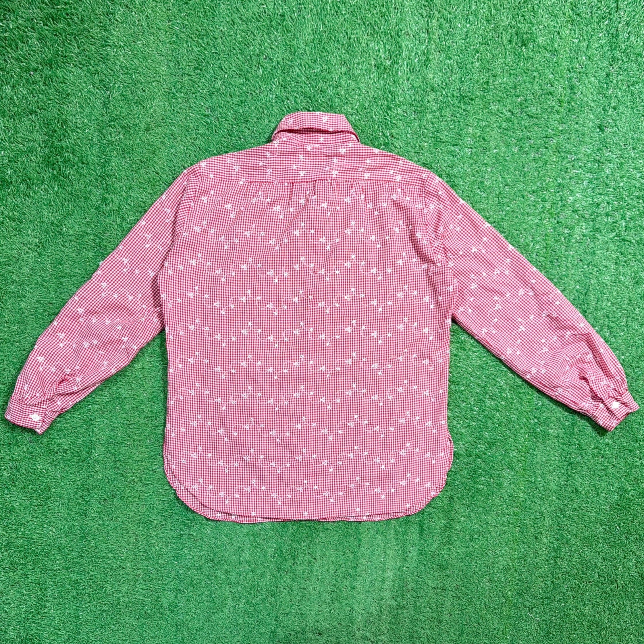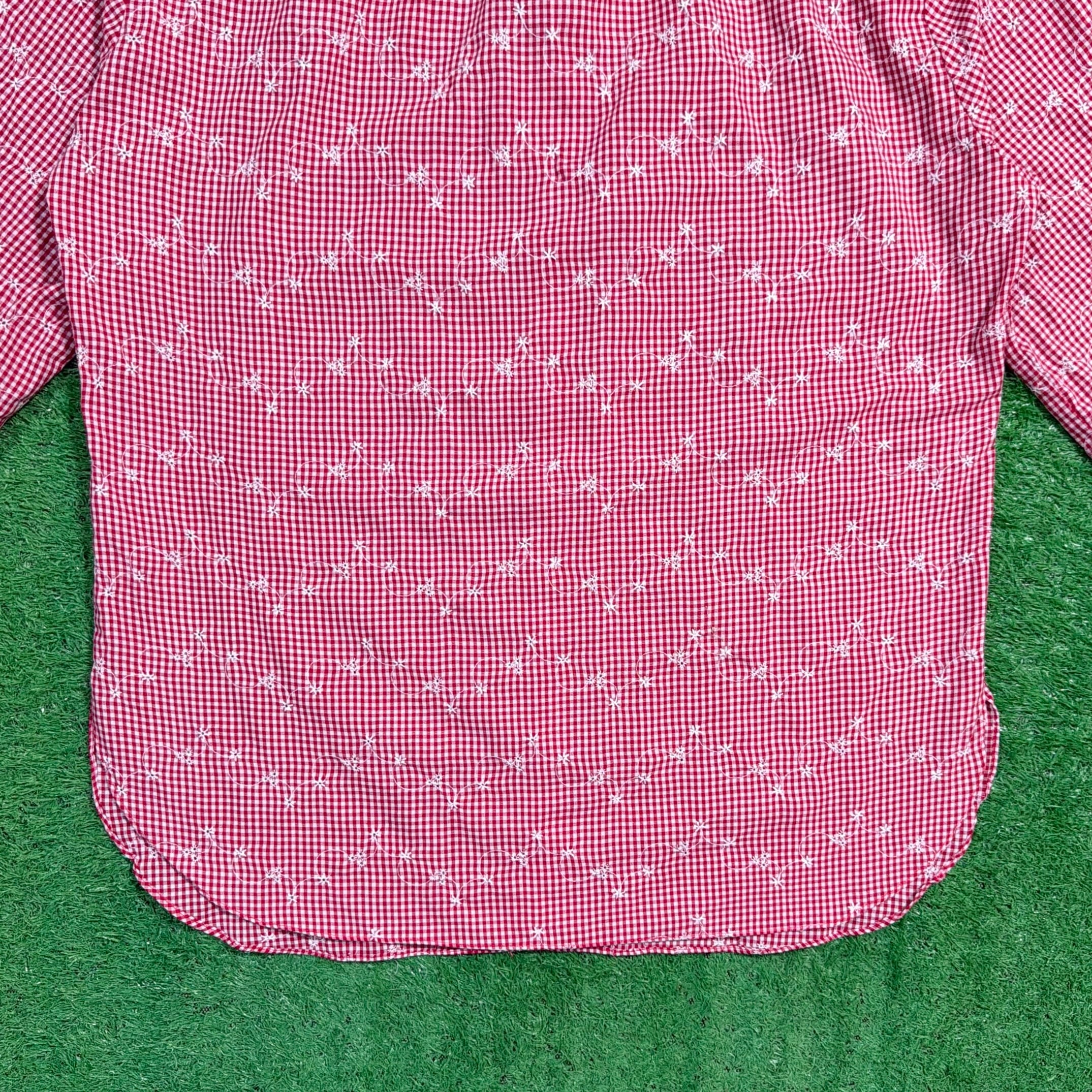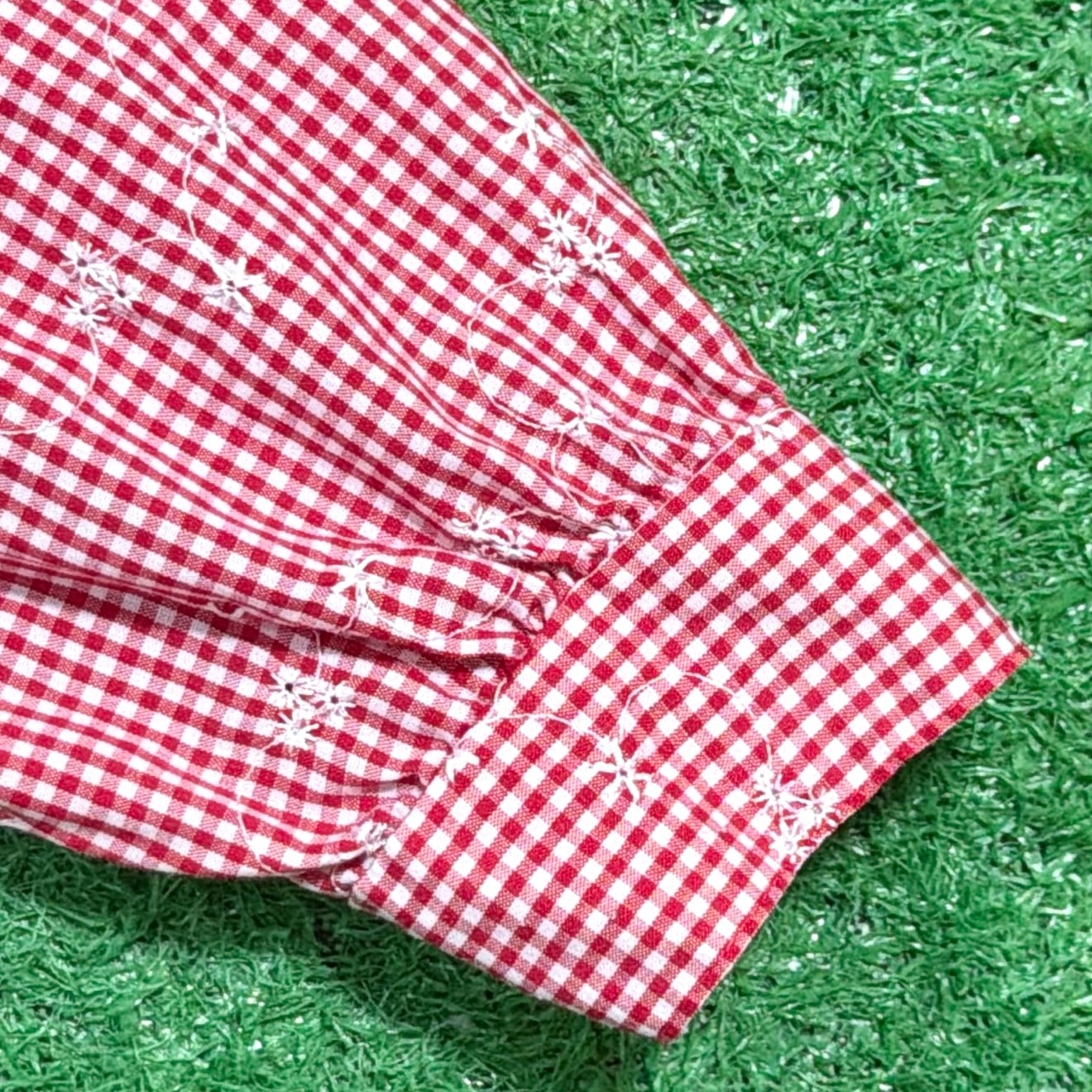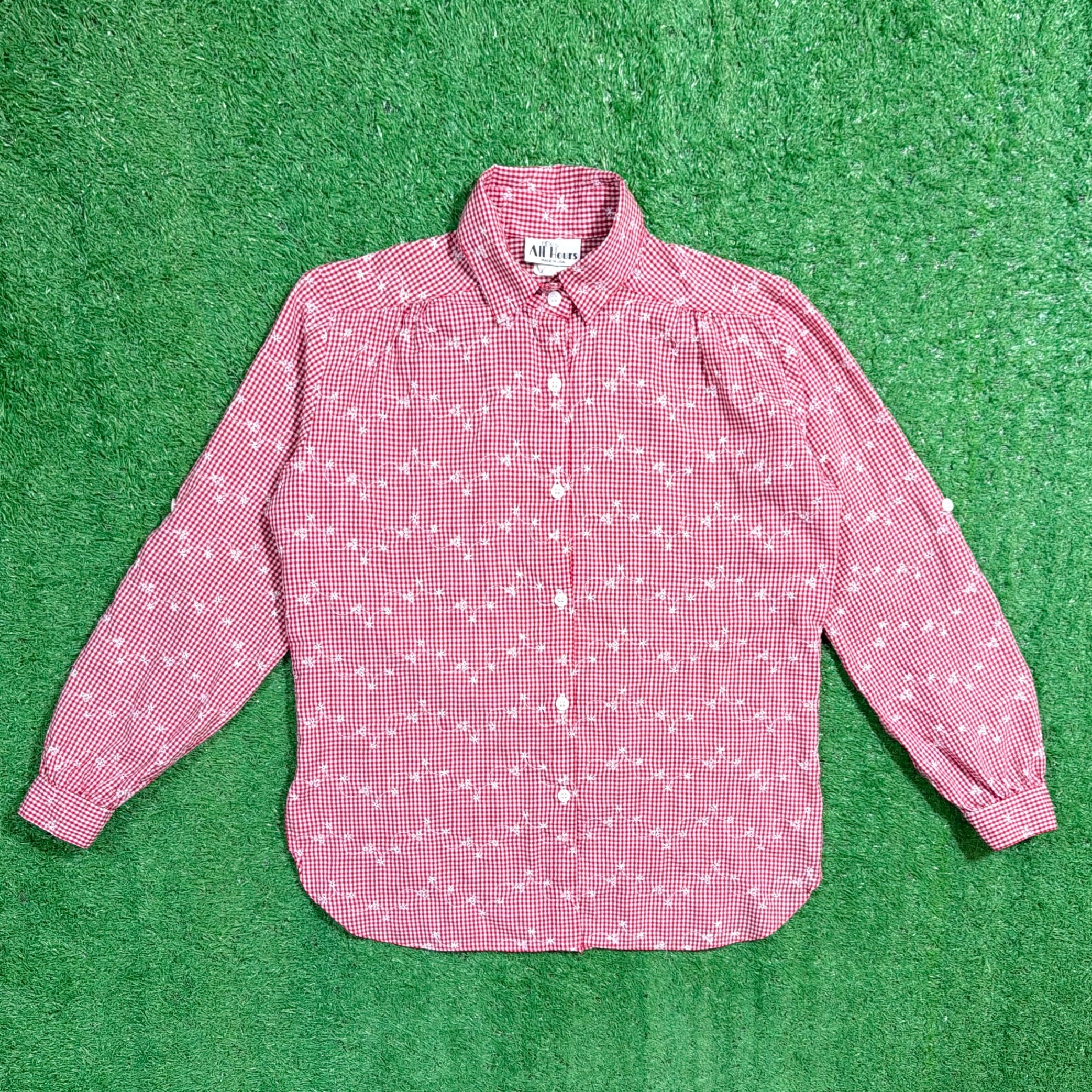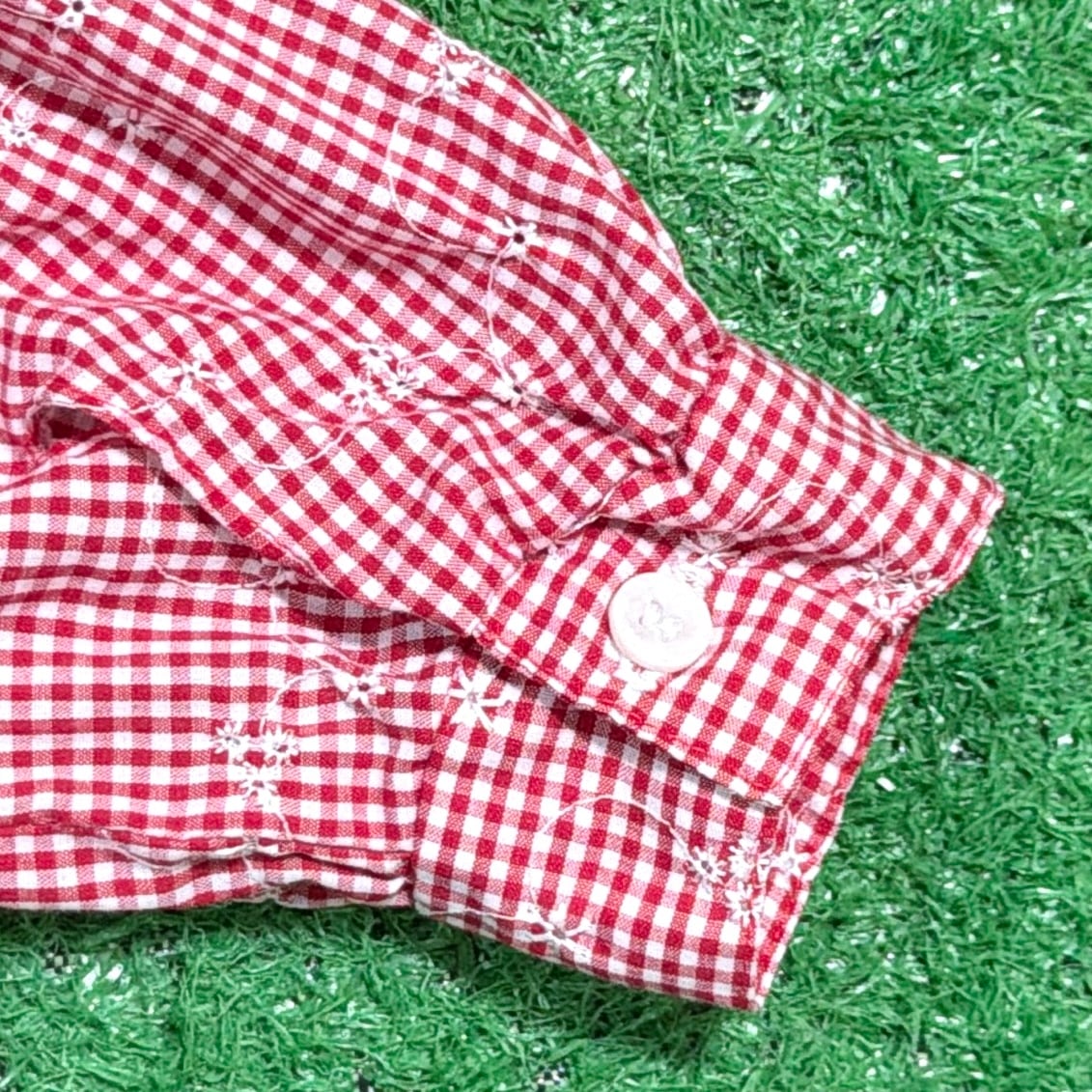 赤×白の細かなギンガムチェックをベースに、さりげなく散りばめられた花柄が可愛らしく、80sらしいレトロな雰囲気を楽しめる一枚。柄同士の主張が強すぎず、全体的にまとまりのあるデザインです。