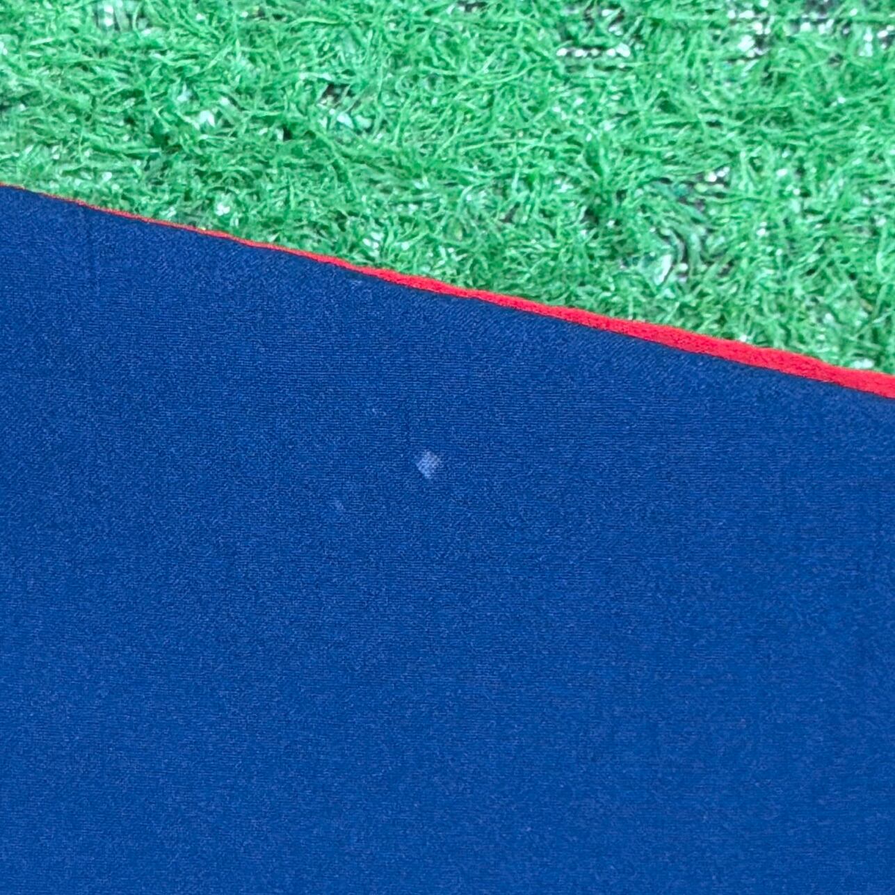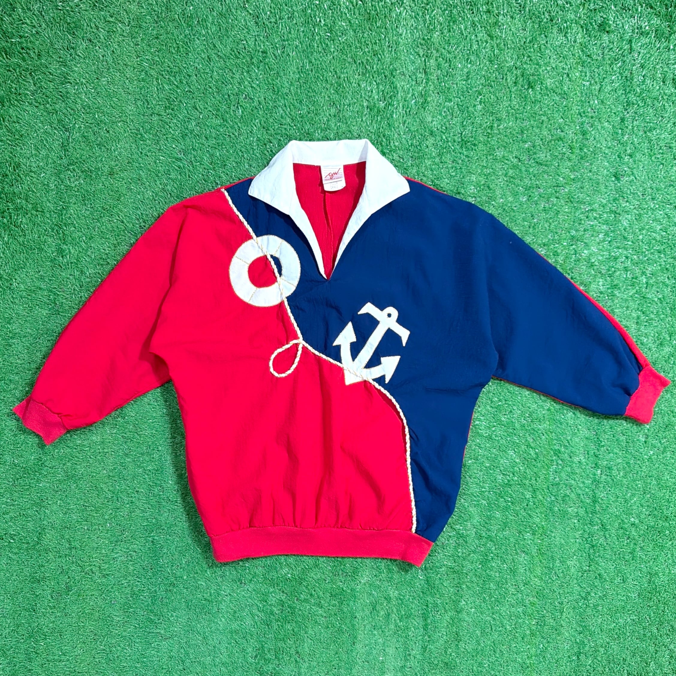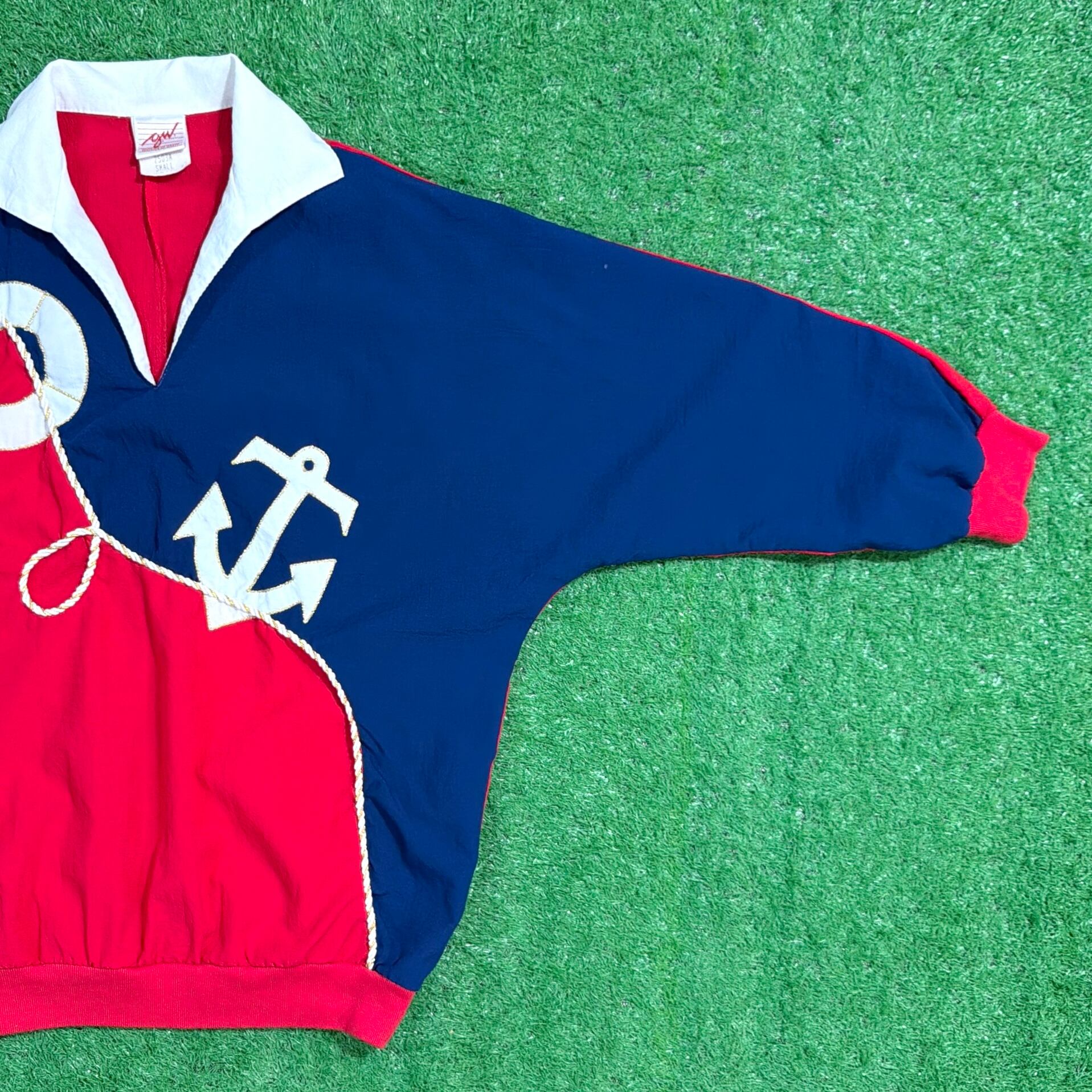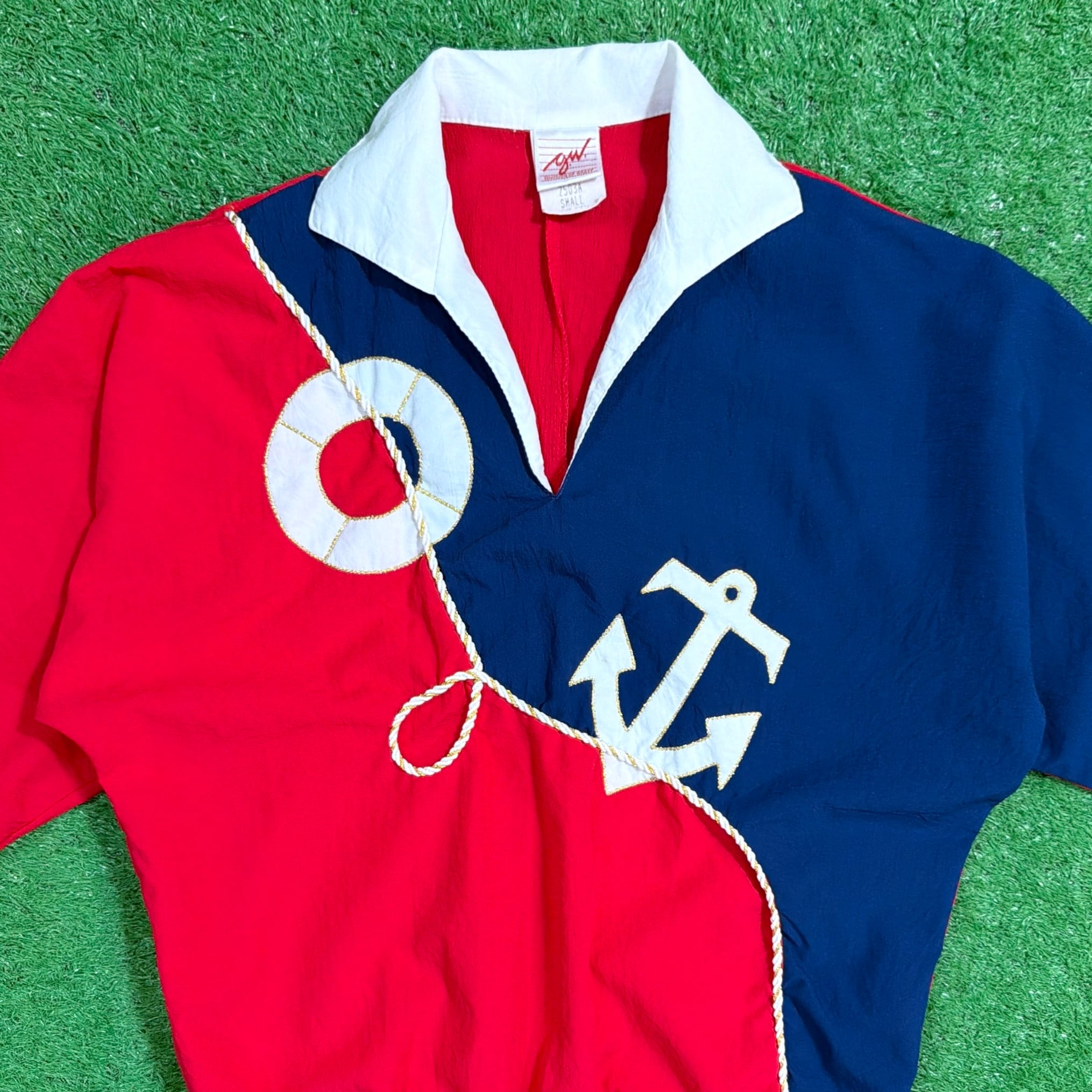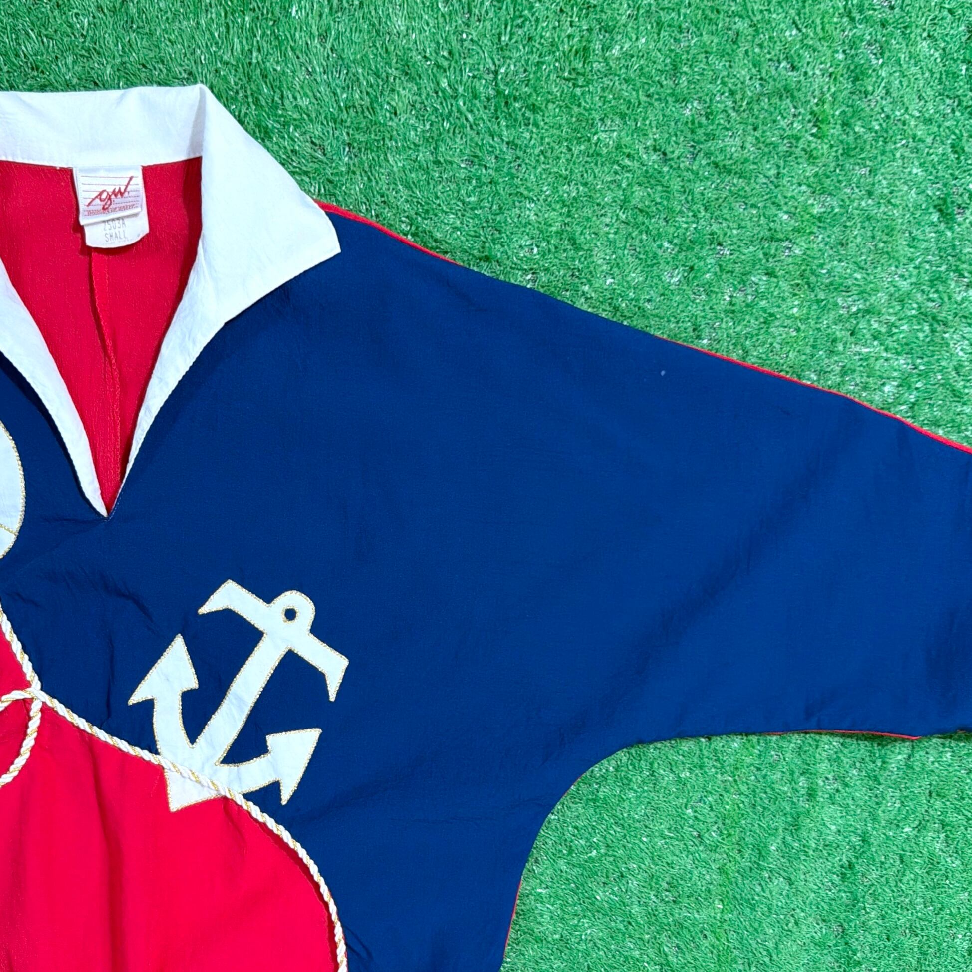 レッドとネイビーの大胆な切り替えに、アンカー(碇)やロープモチーフがあしらわれた、マリンテイストを感じるデザインが印象的な一着。少しゴワっとした薄手のポリエステル素材で、シャツ感覚に近い軽やかな着心地です。