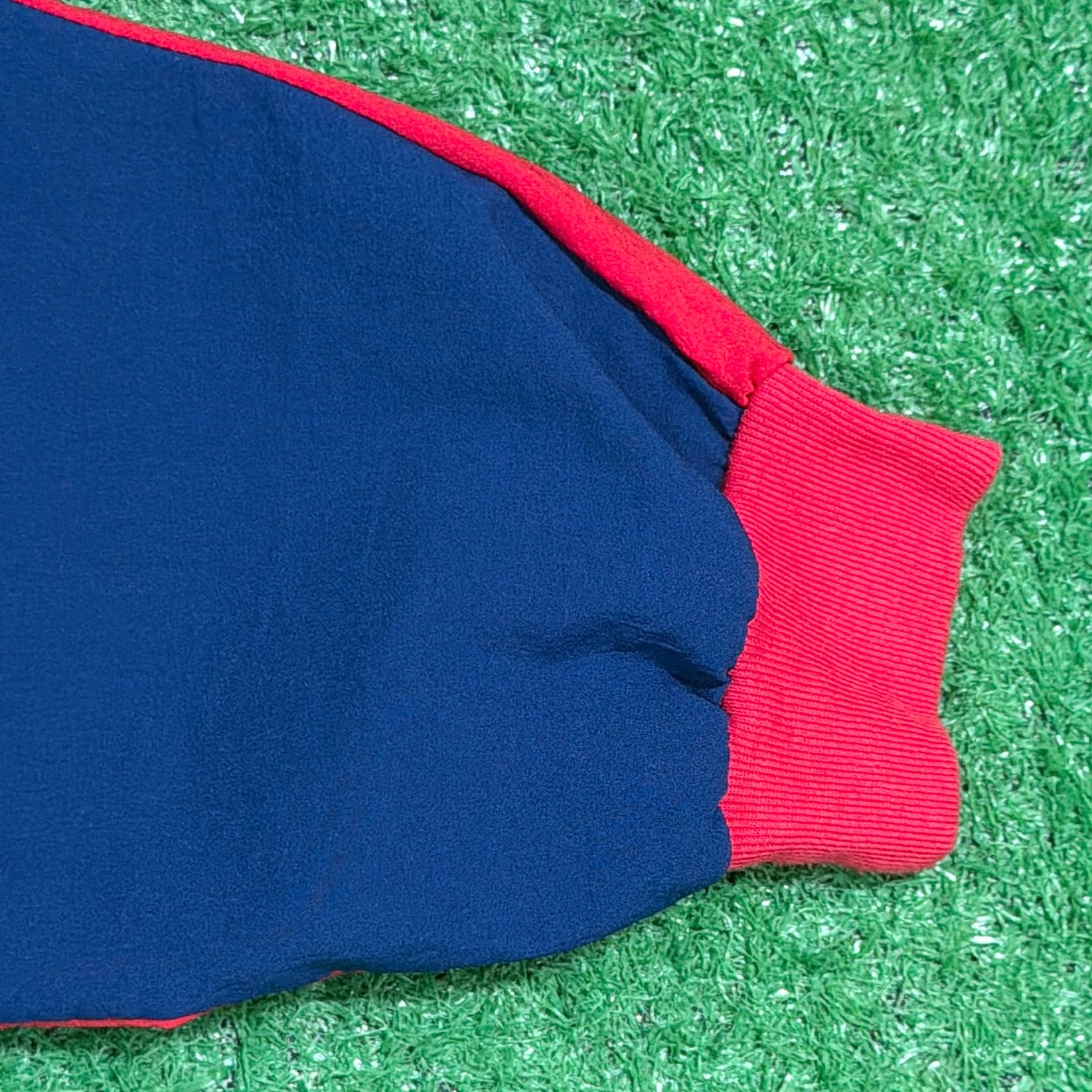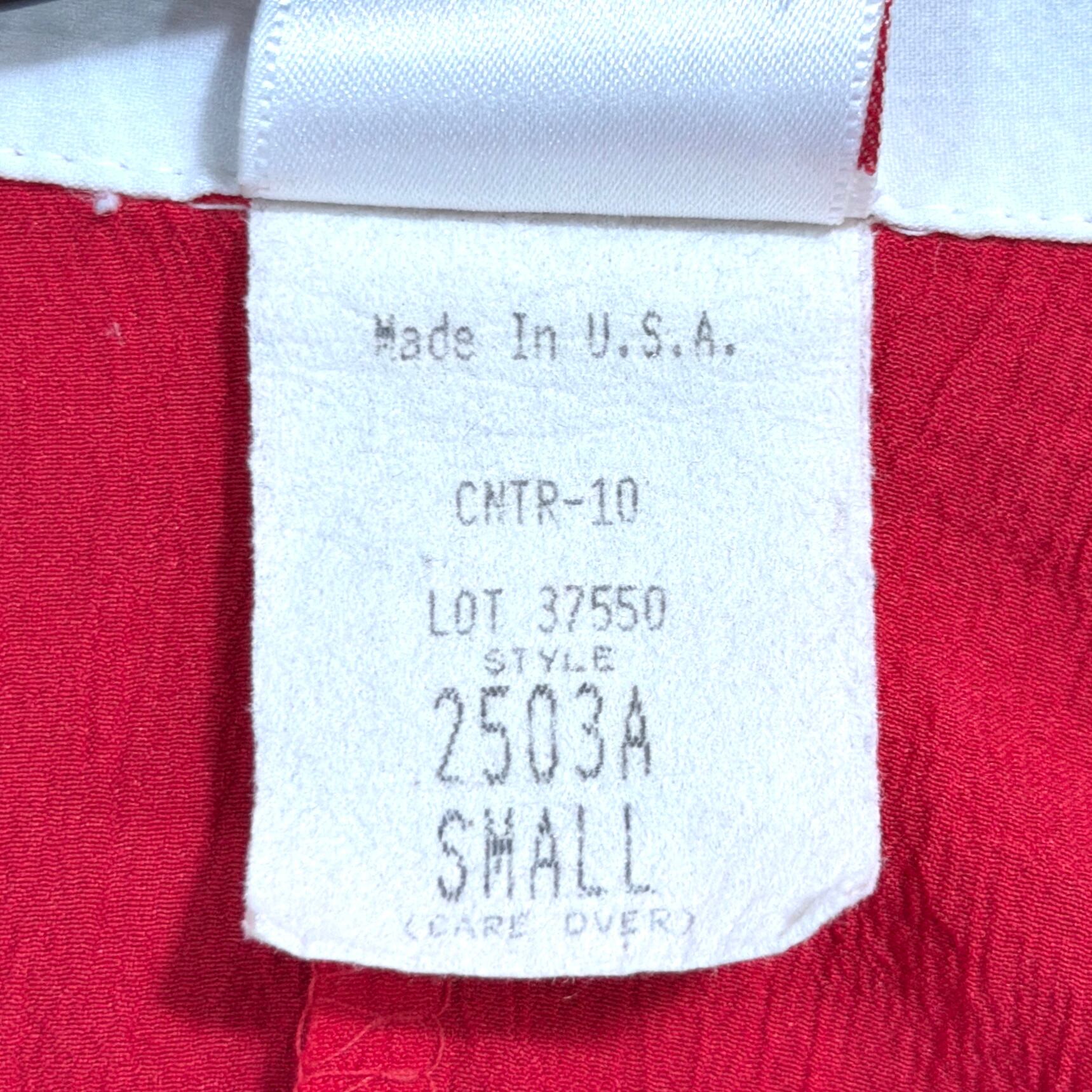 袖は手首がしっかり出るくらいの長さで、7分袖〜8分袖ほどのバランス。襟元の配色や切り替えデザインも含め、80sらしいポップさと遊び心が詰まったアイテムです。