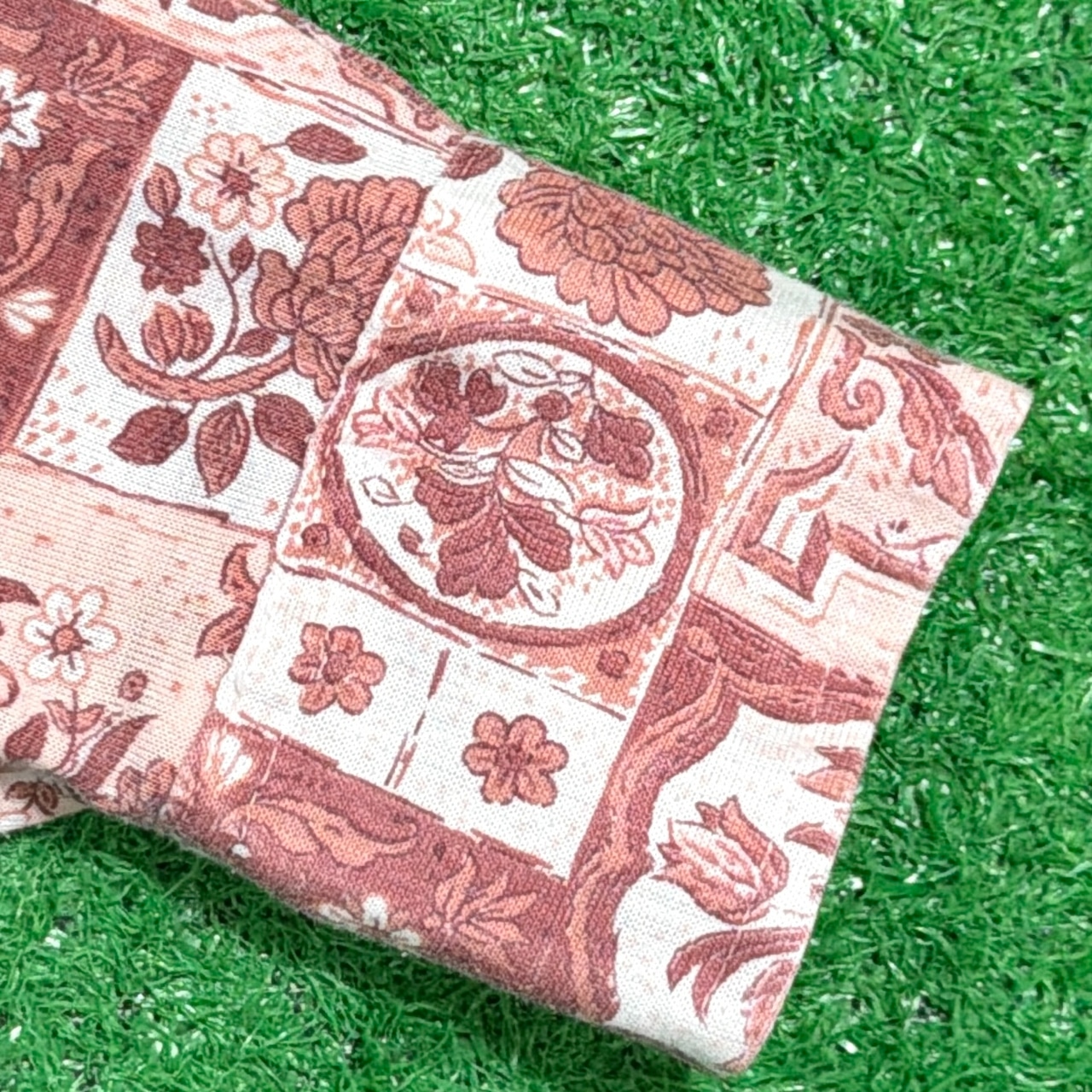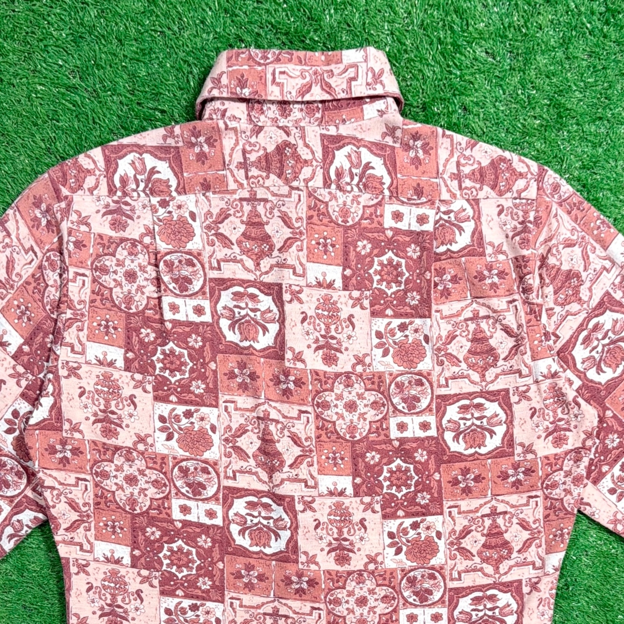 パネル調の総柄デザインが特徴的で、70sらしいヒッピーカルチャーを感じさせる一着。規則的でありながらもどこかラフさのある柄感が、当時の空気感をそのまま残しています。