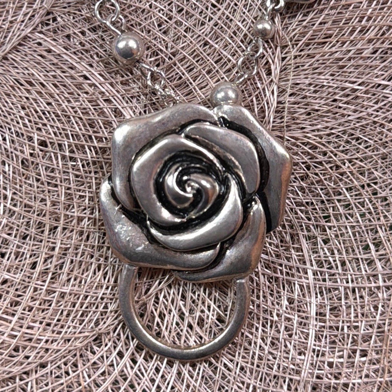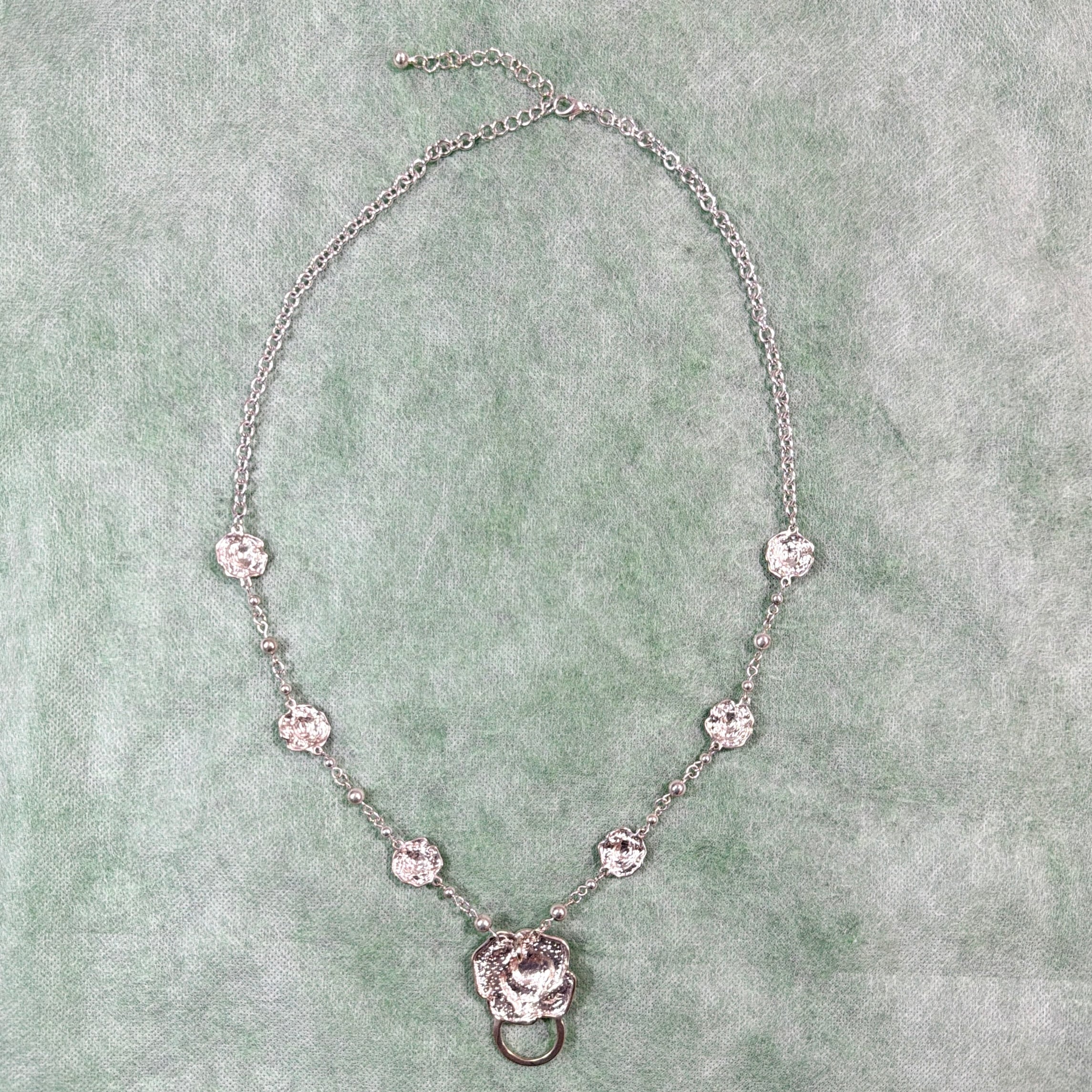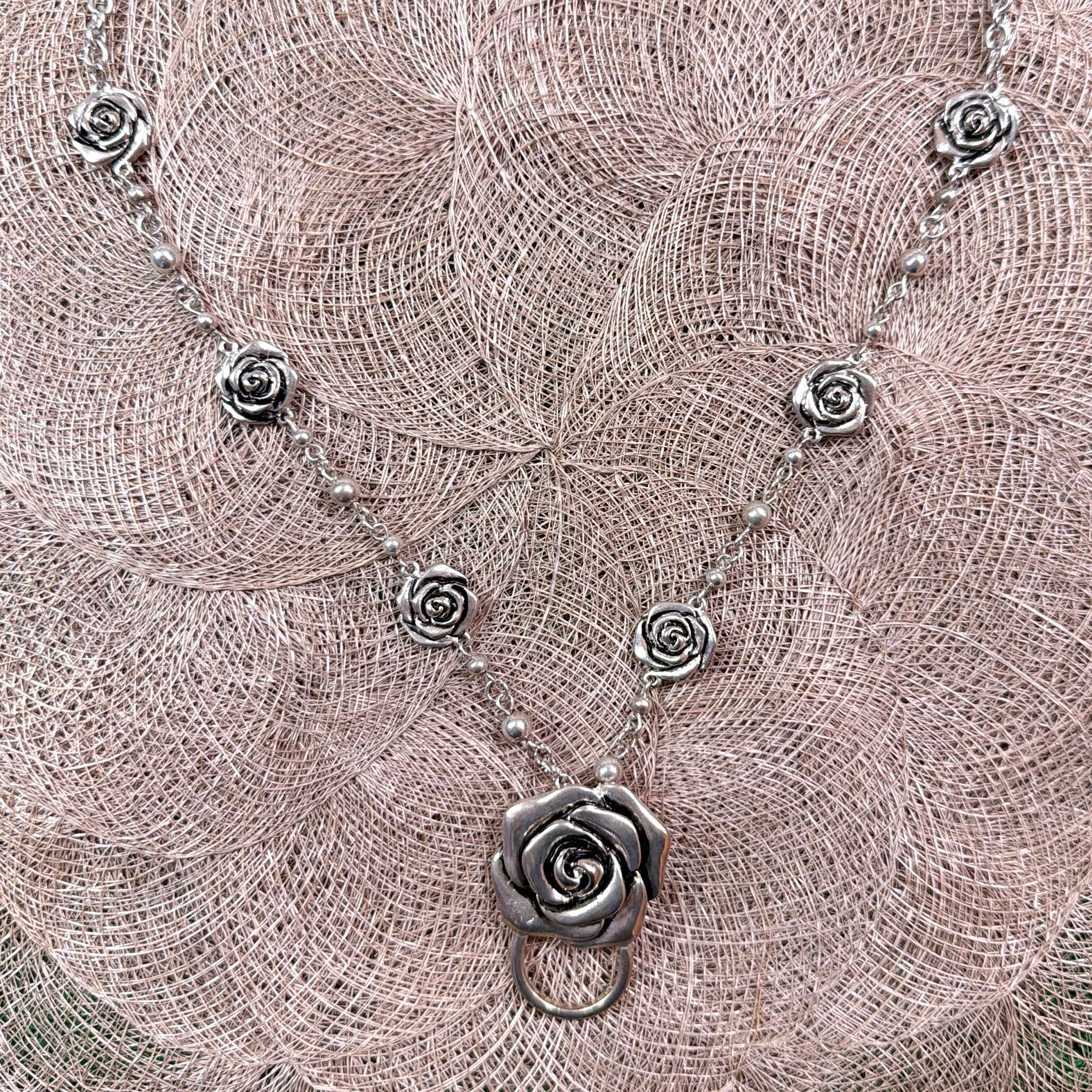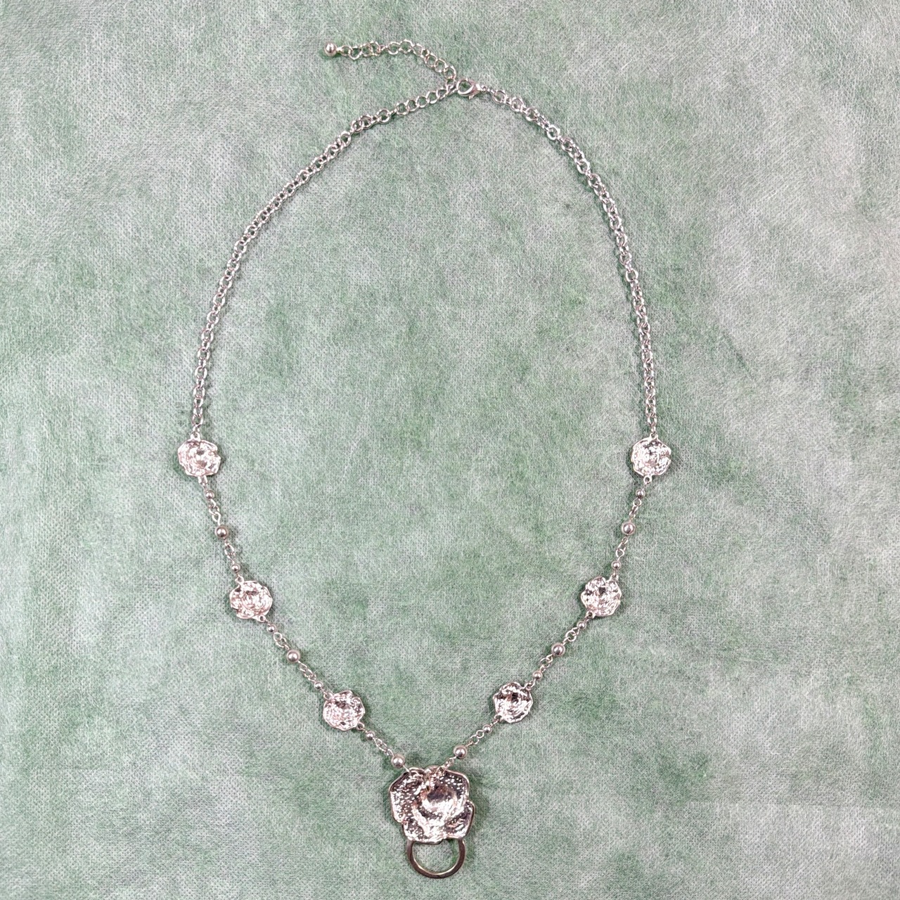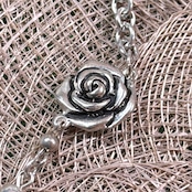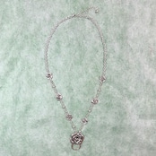 バラモチーフのチャームが目を引く、シルバーカラーのネックレスです。