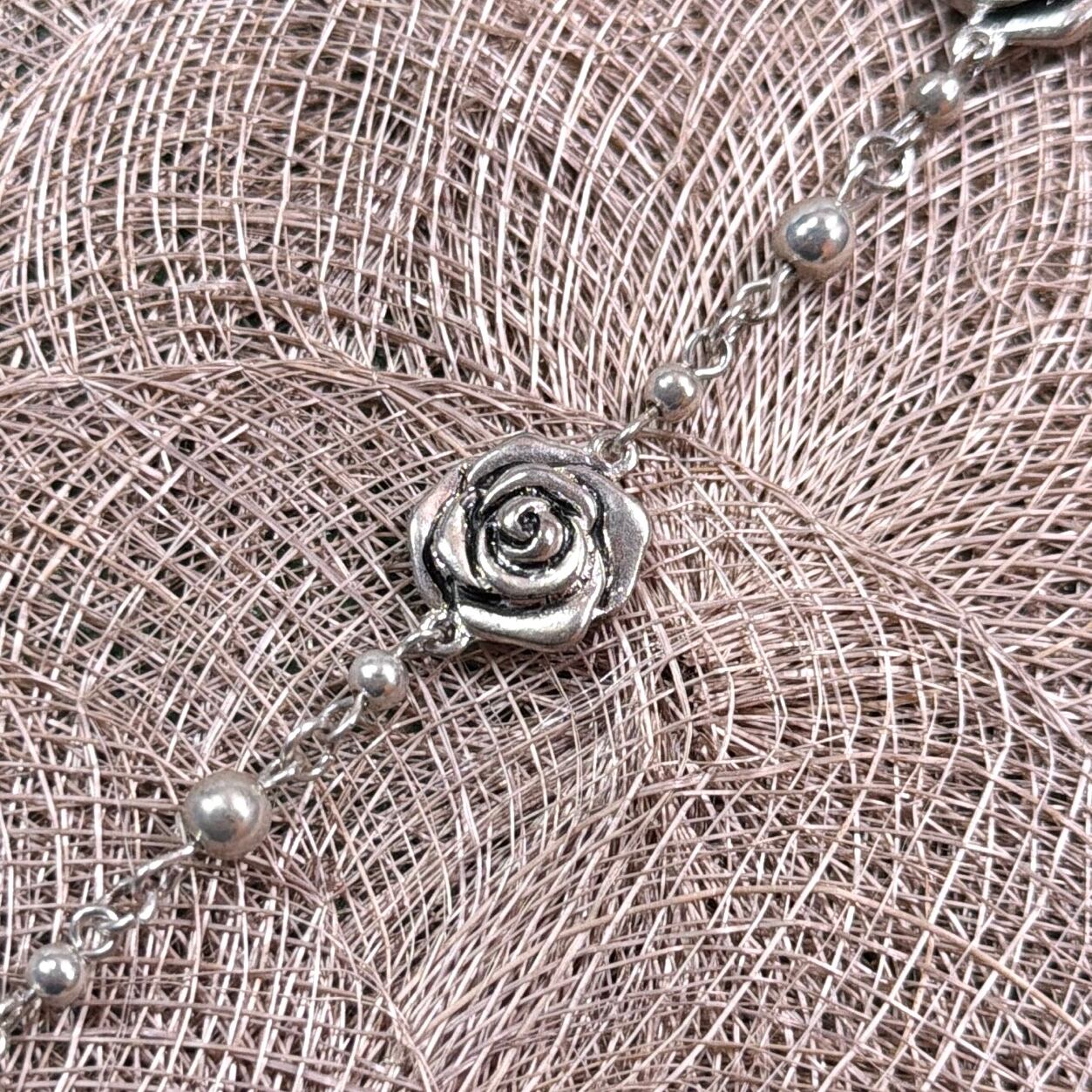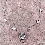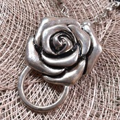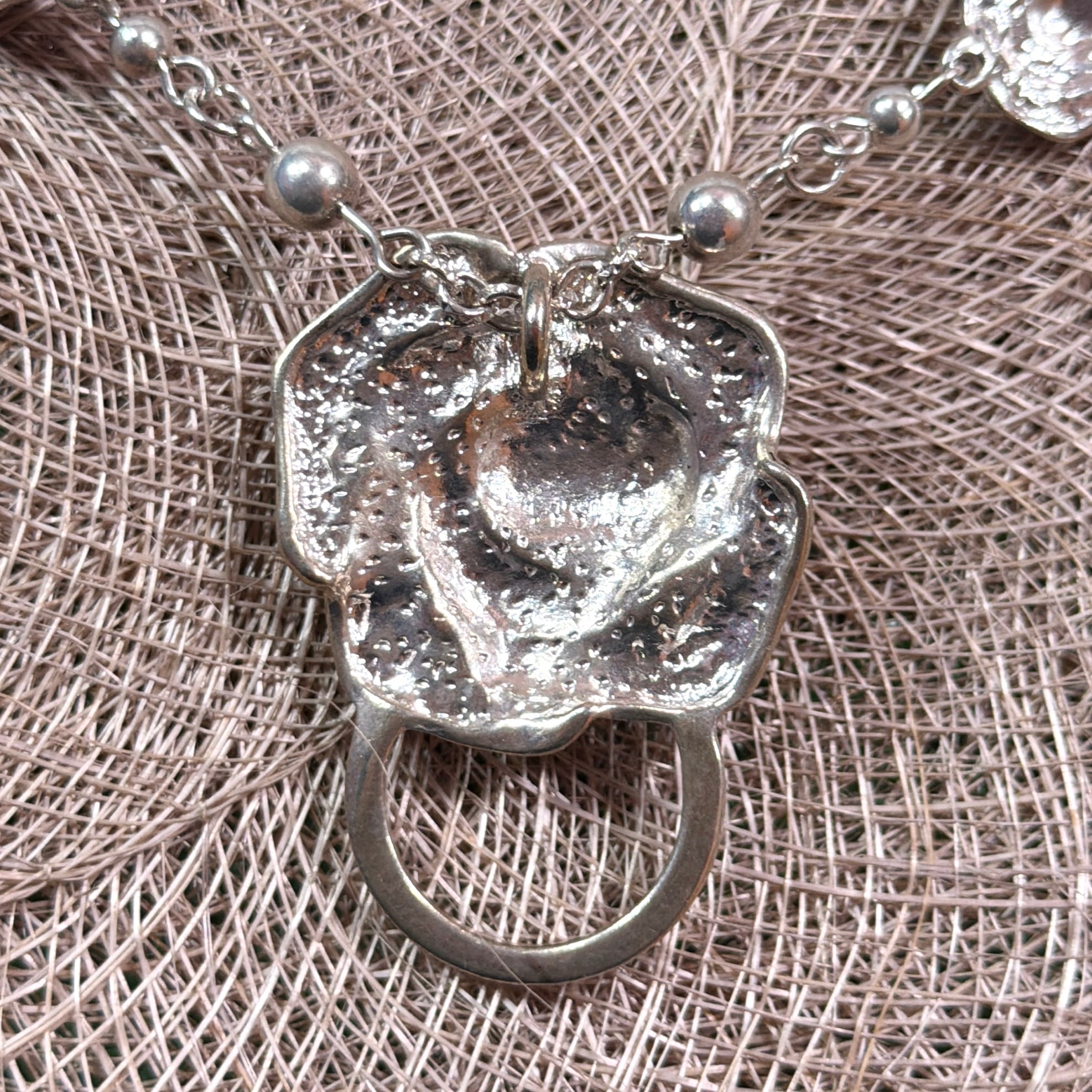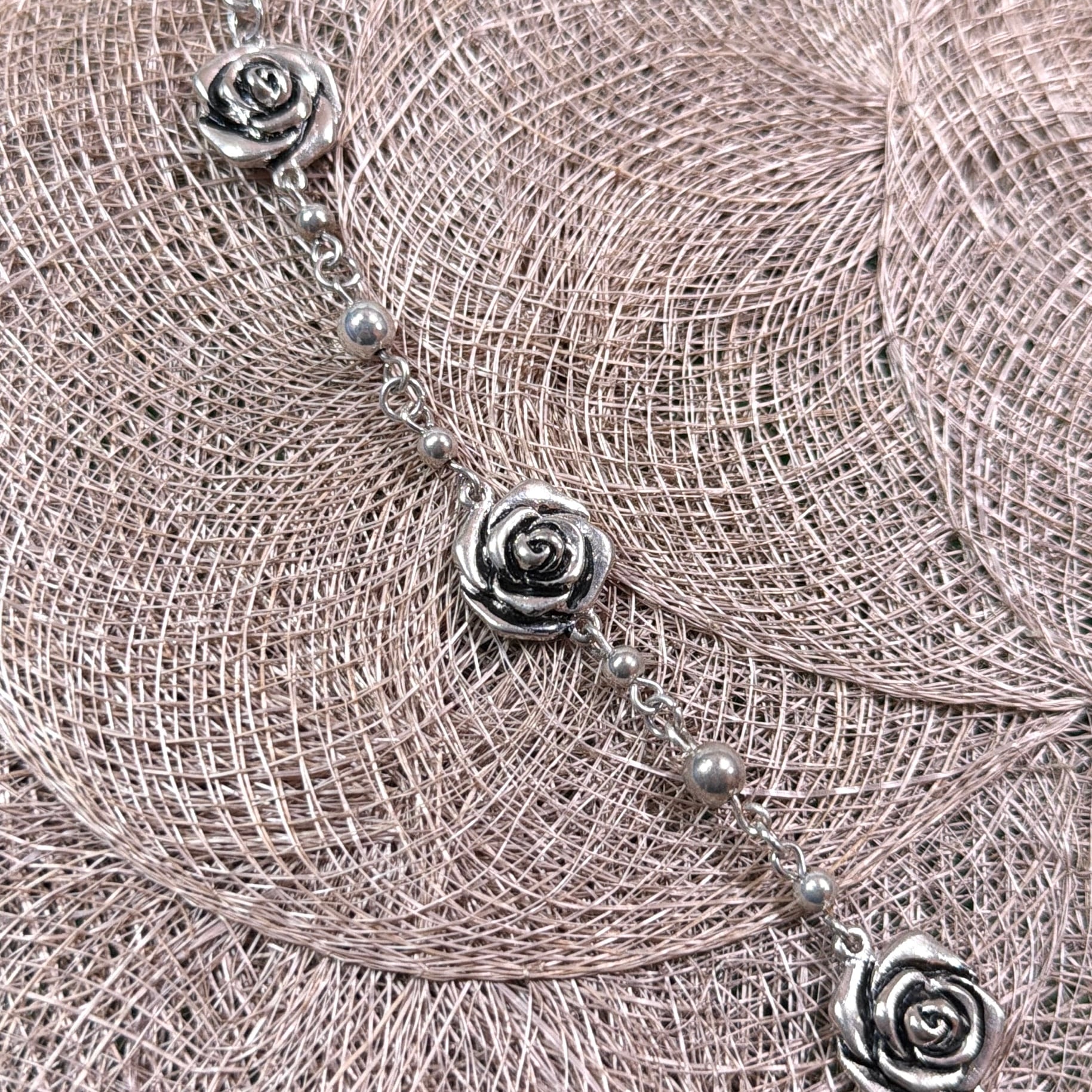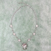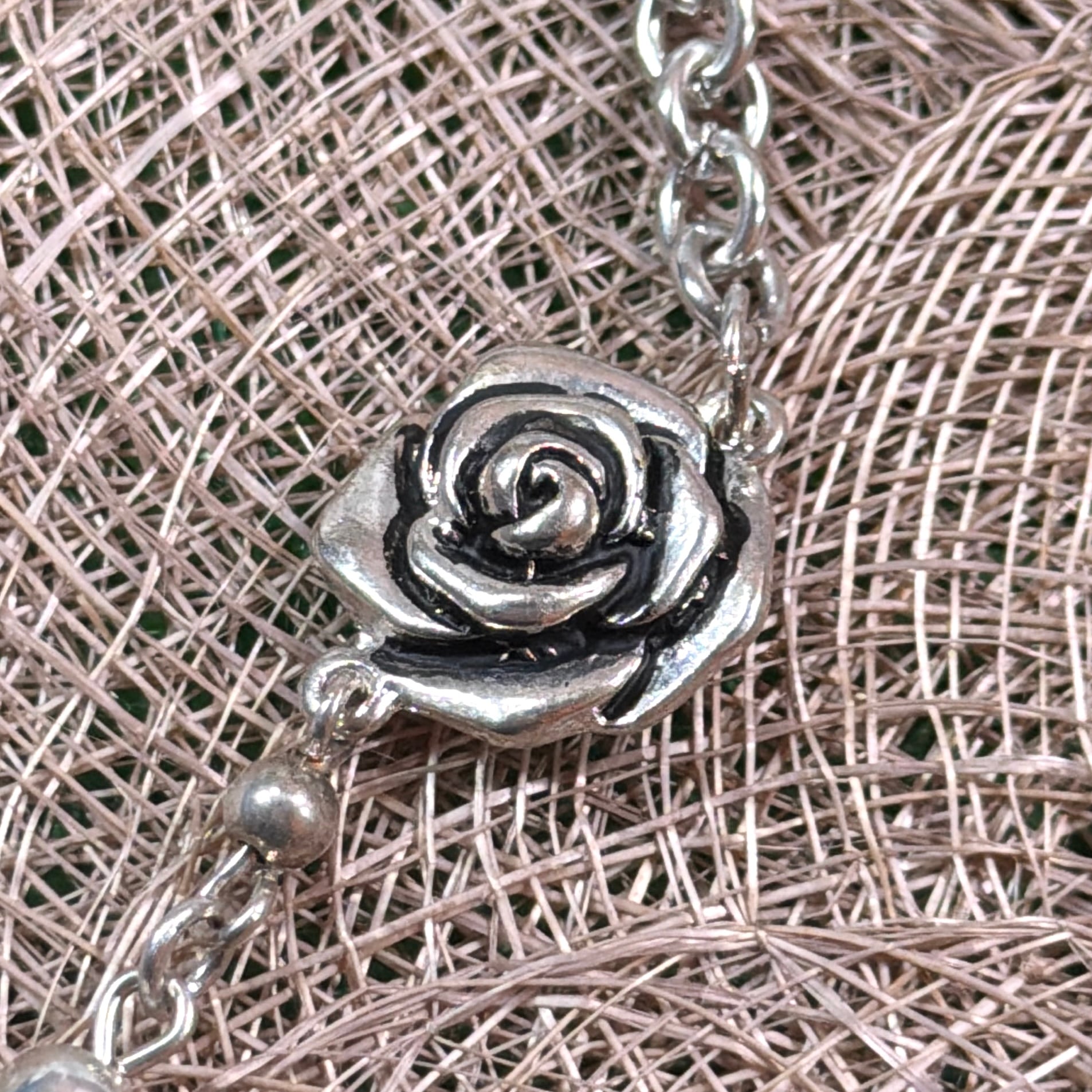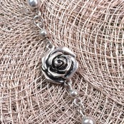 バラモチーフのチャームが目を引く、シルバーカラーのネックレスです。