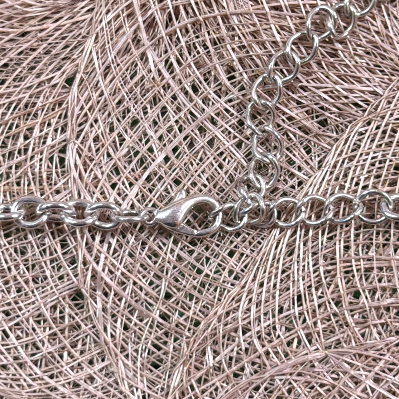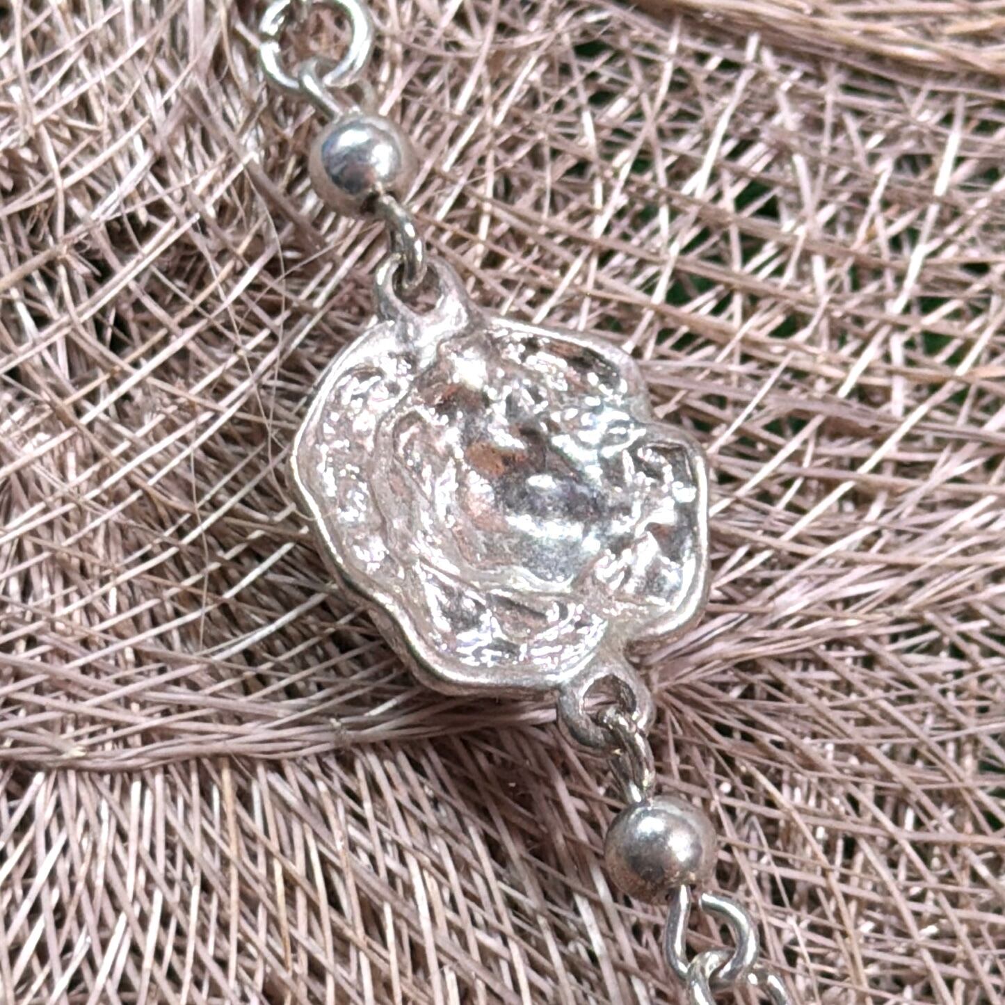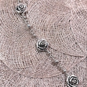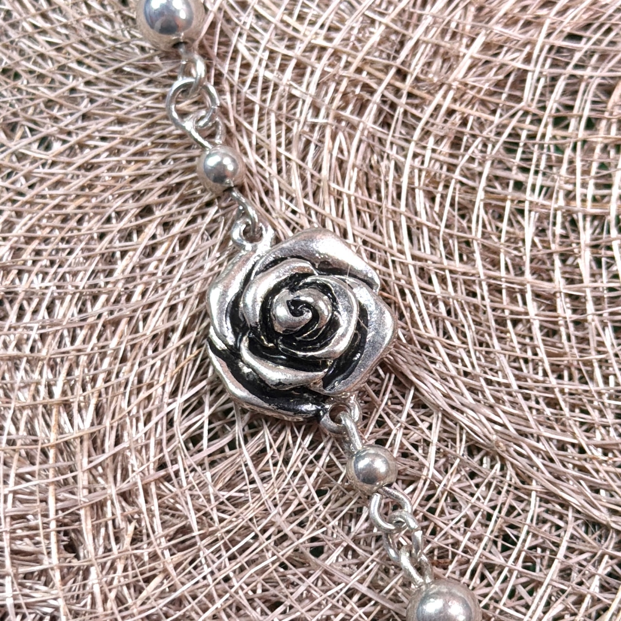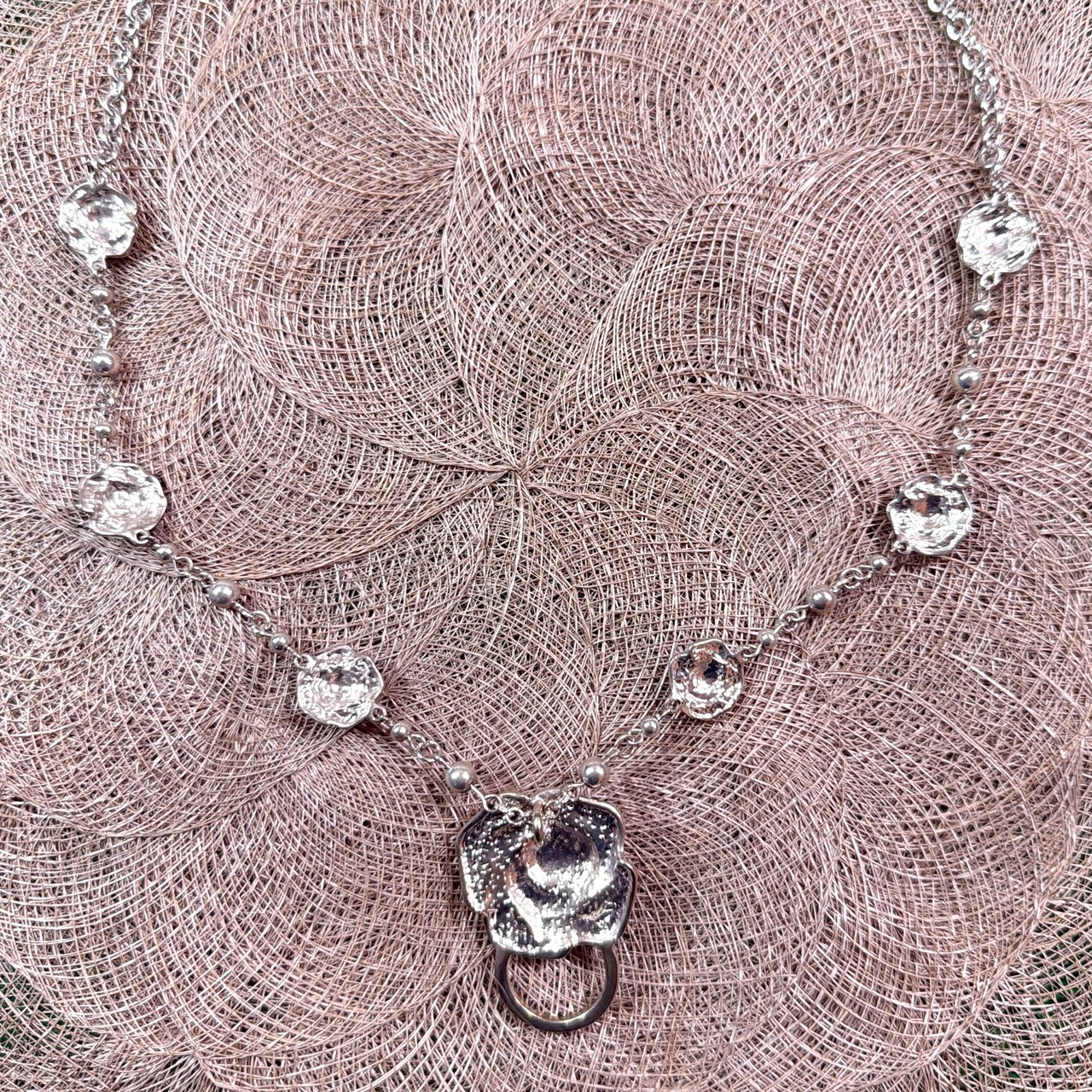 バラモチーフのチャームが目を引く、シルバーカラーのネックレスです。