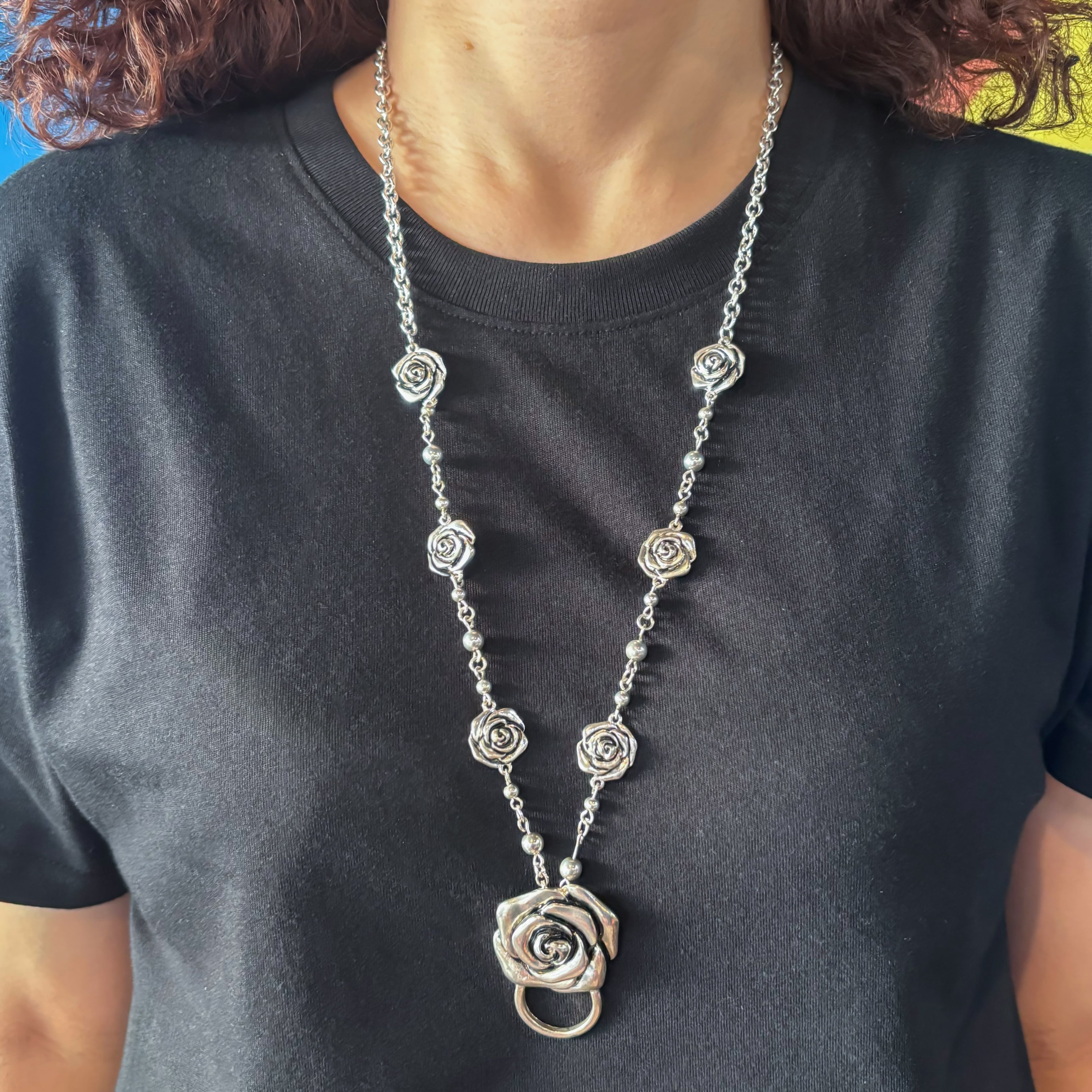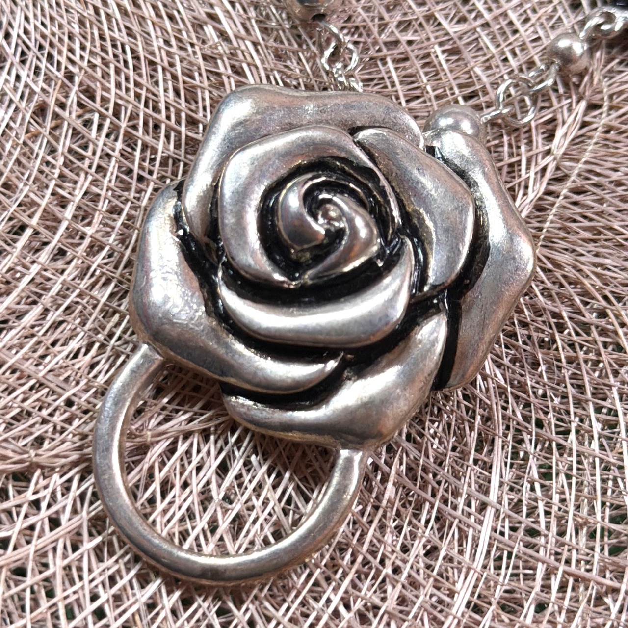 立体感のあるローズデザインに、シルバーカラーが合わさり、甘さを抑えた雰囲気に仕上がっています。チェーン部分にも装飾が施されており、シンプルながらも程よい存在感のあるデザインです。トップスの上からでも映える長さで、ユニセックスで使いやすい一点です。
