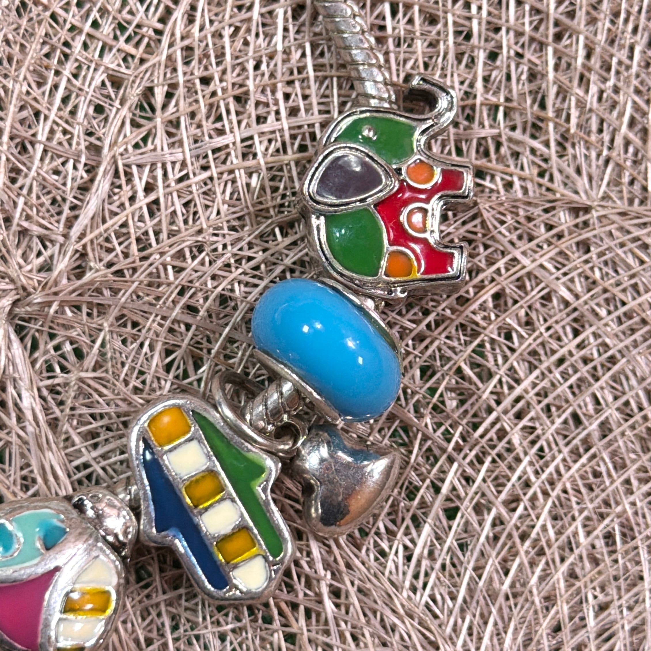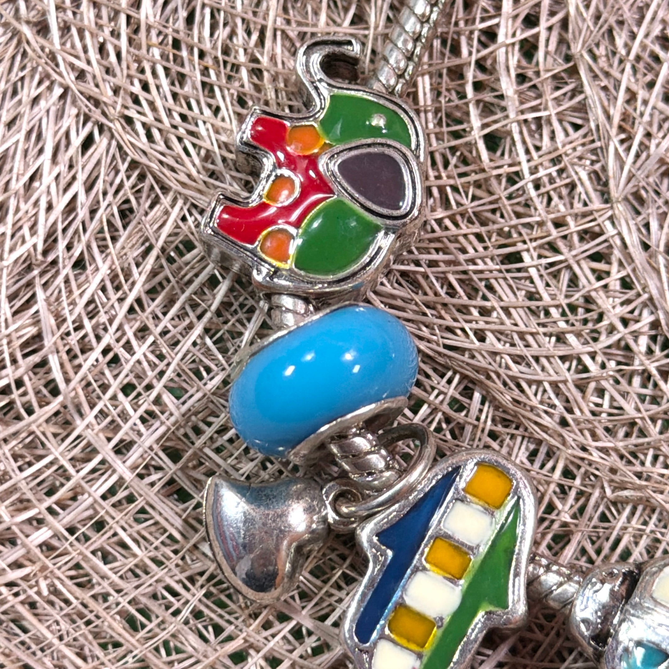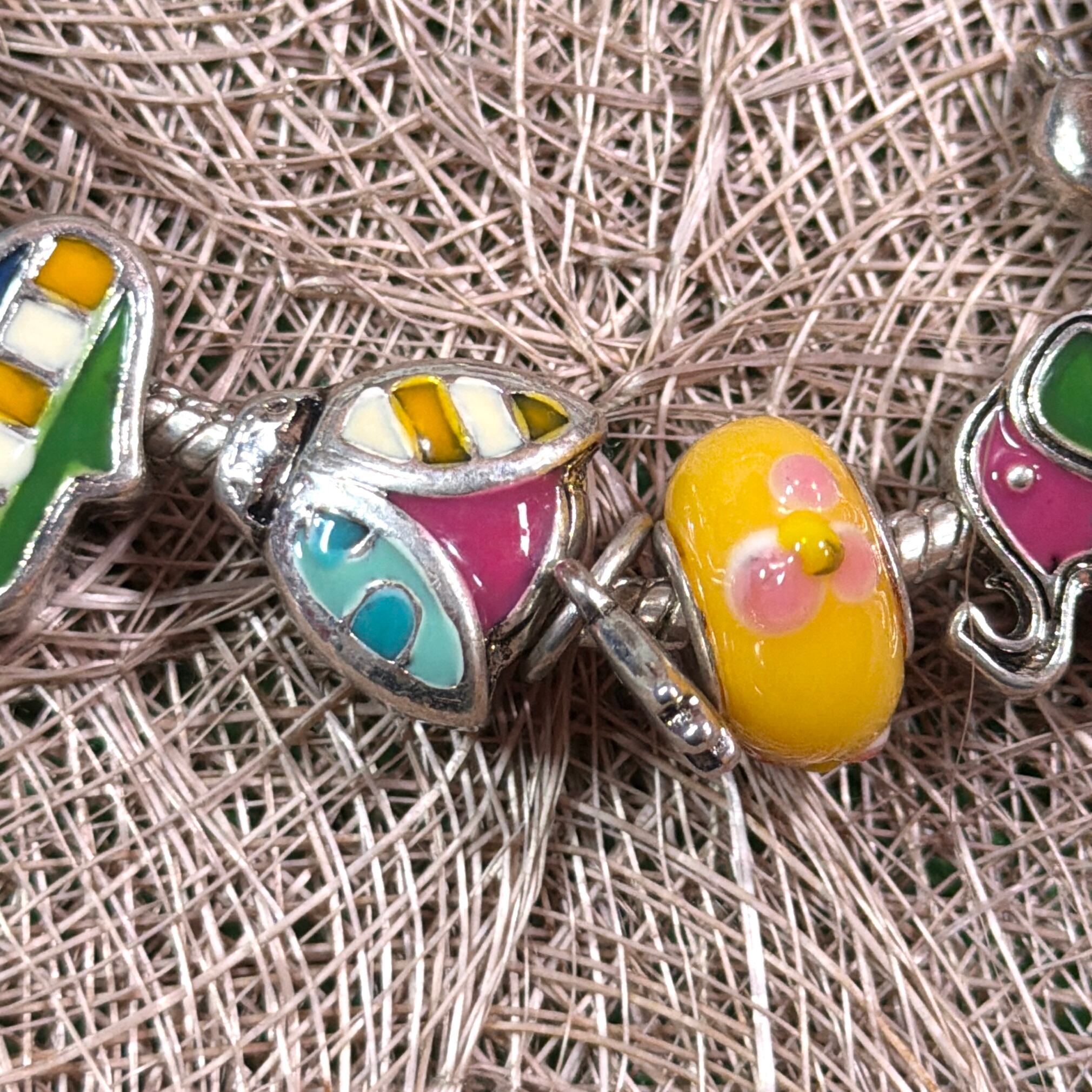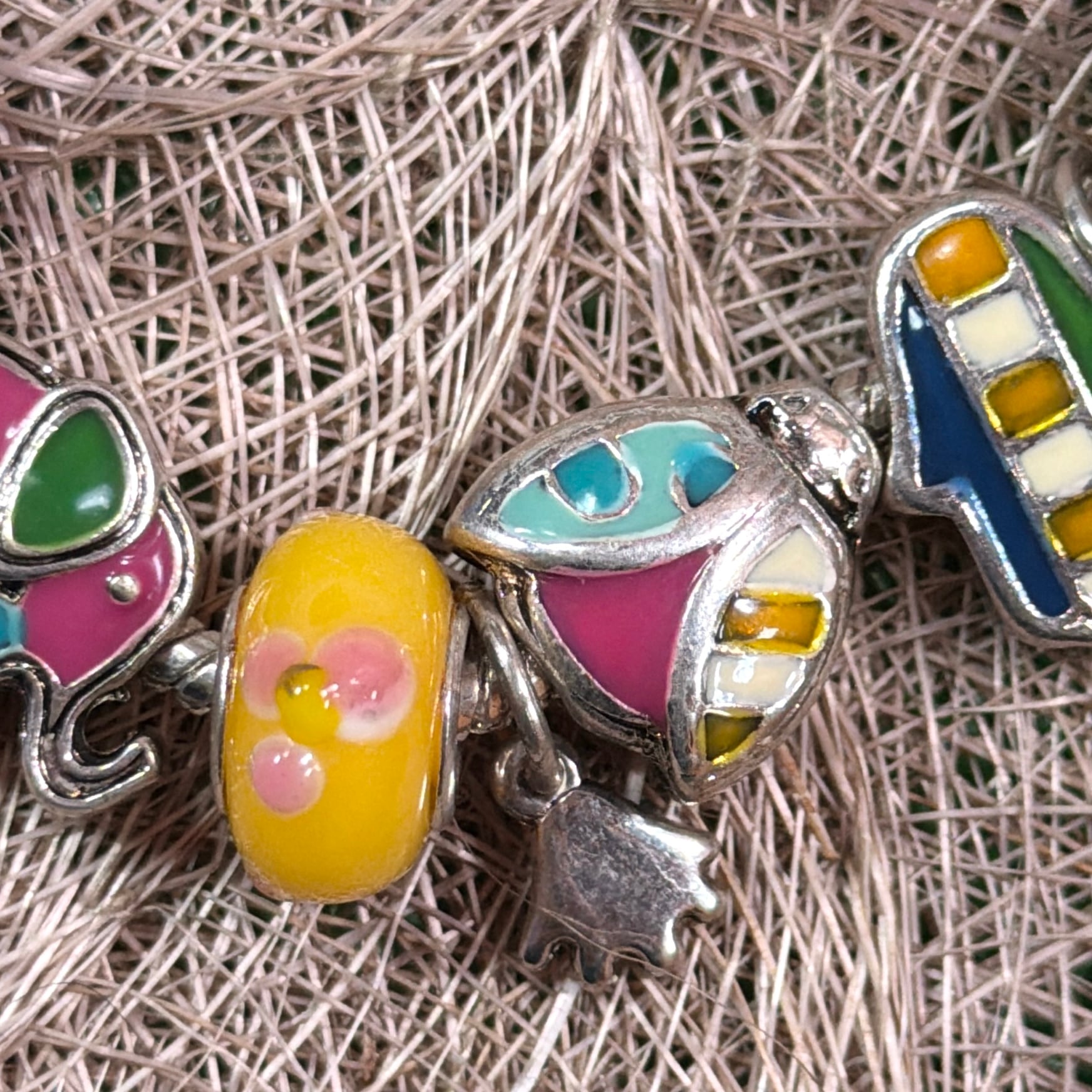 カラフルなチャームが連なった、遊び心たっぷりのブレスレットです。