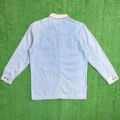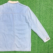 ライトブルーのデニムに、襟部分のみ切り替えられた配色デザインがポイント。ワーク由来のカバーオールらしいフロントポケット付きで、程よくラフな雰囲気があります。