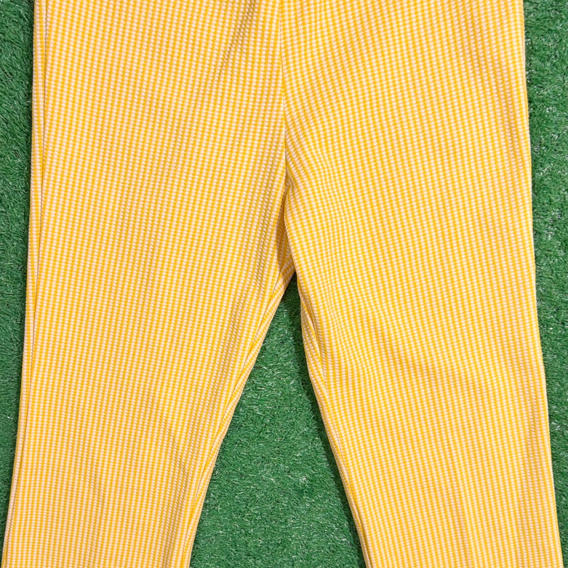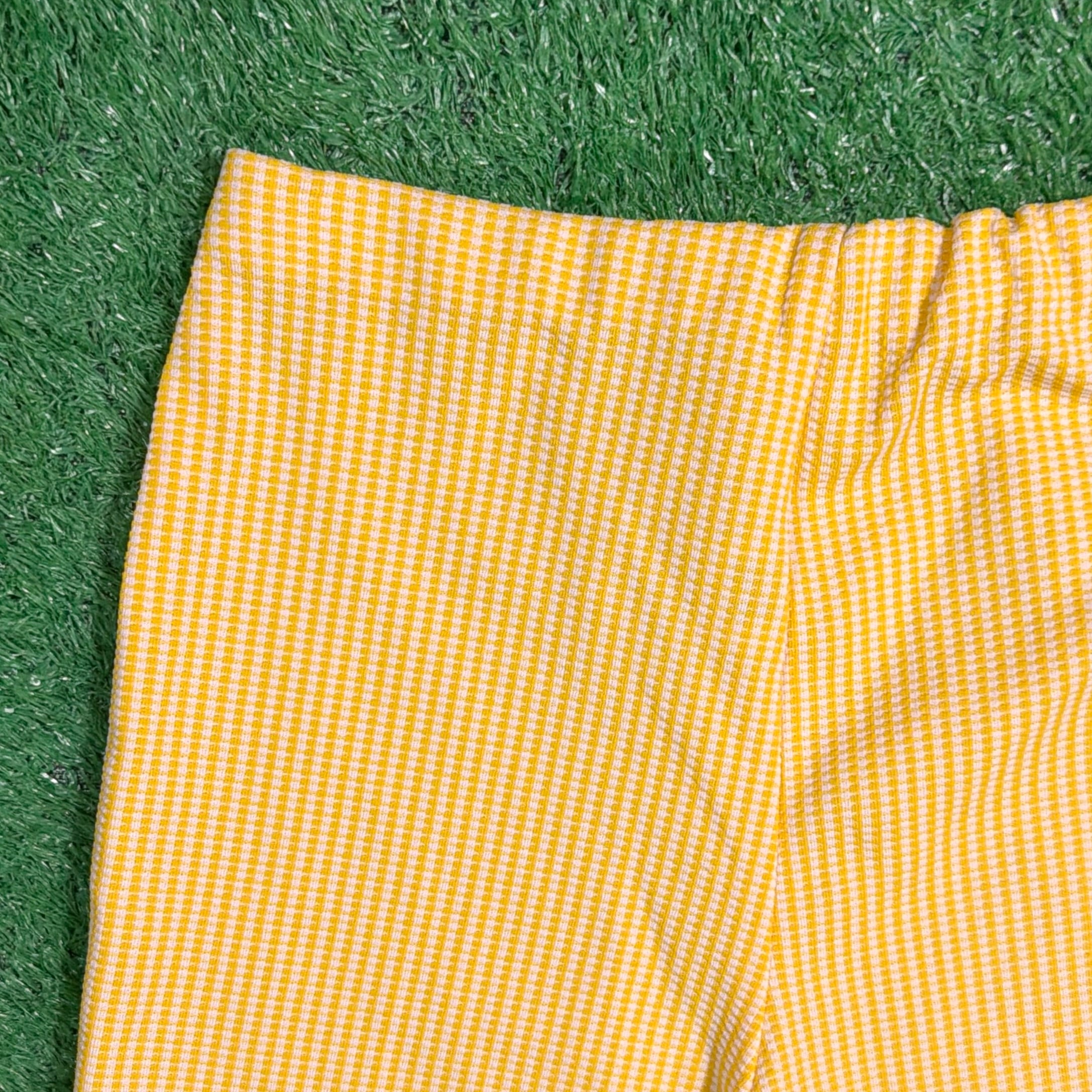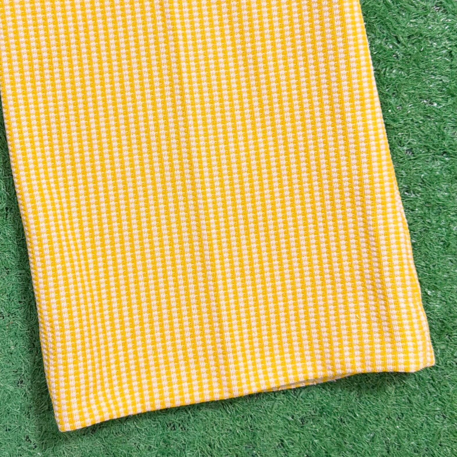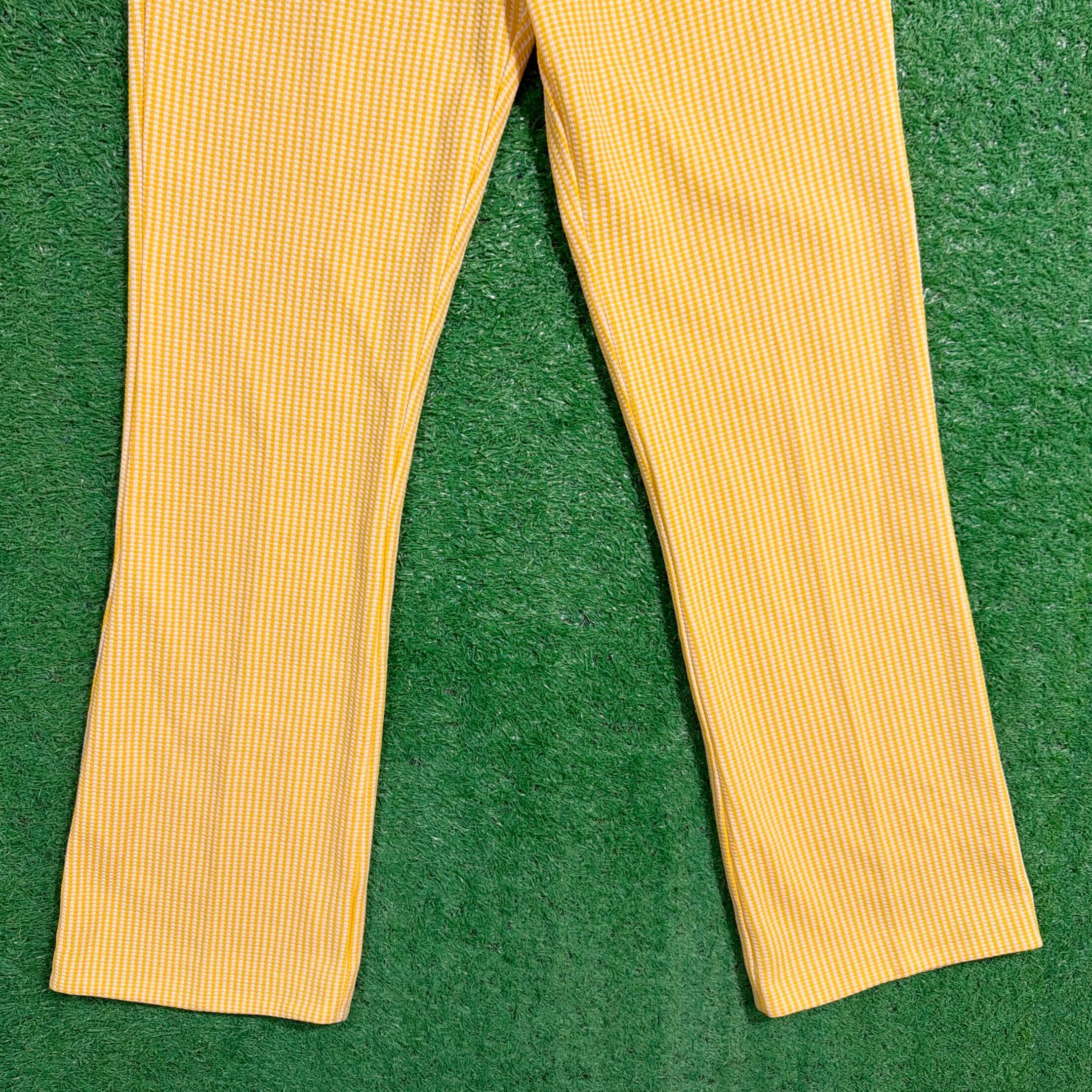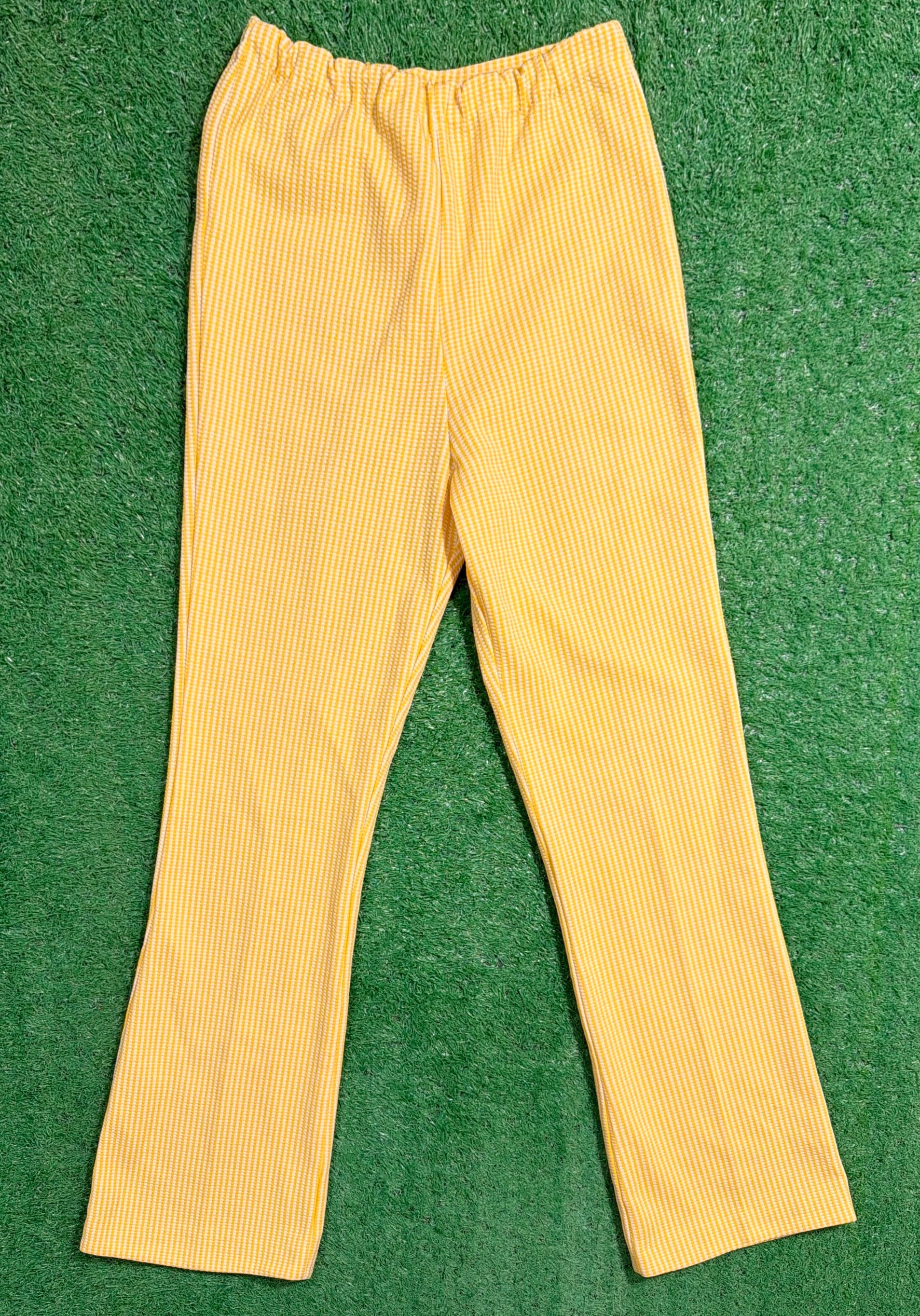 ウエストはゴム仕様でフィット感がありつつ、全体的にタイトで細身なシルエットなのが特徴です。裾に向かって緩やかに広がるフレアラインと、イエローカラーがスタイリングのアクセントになる一本です。