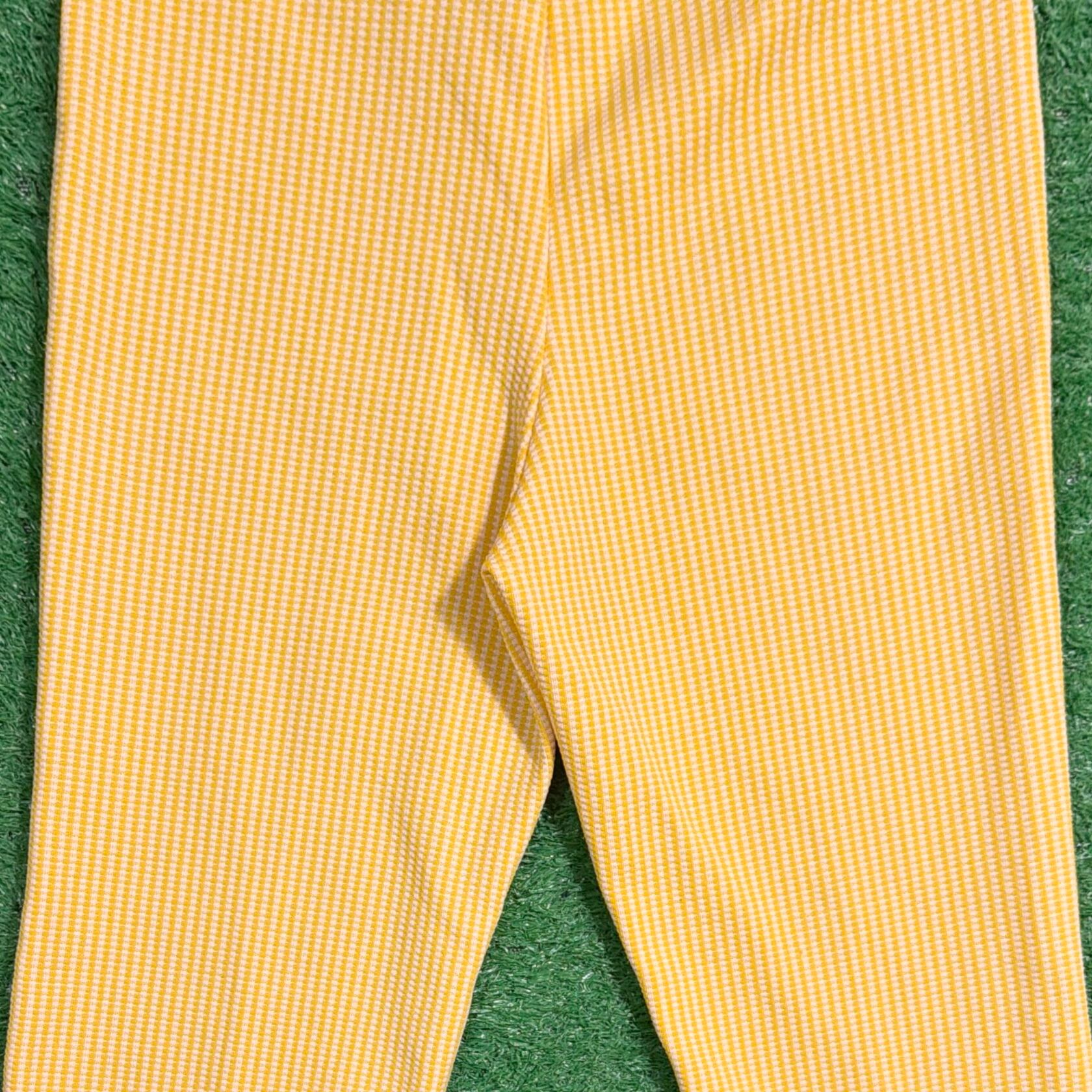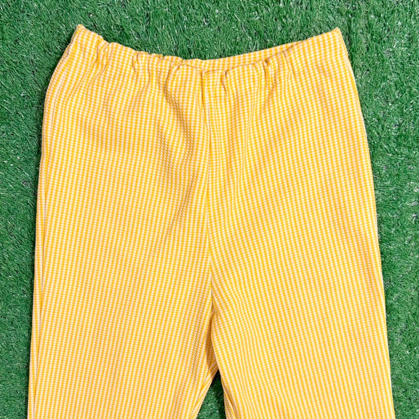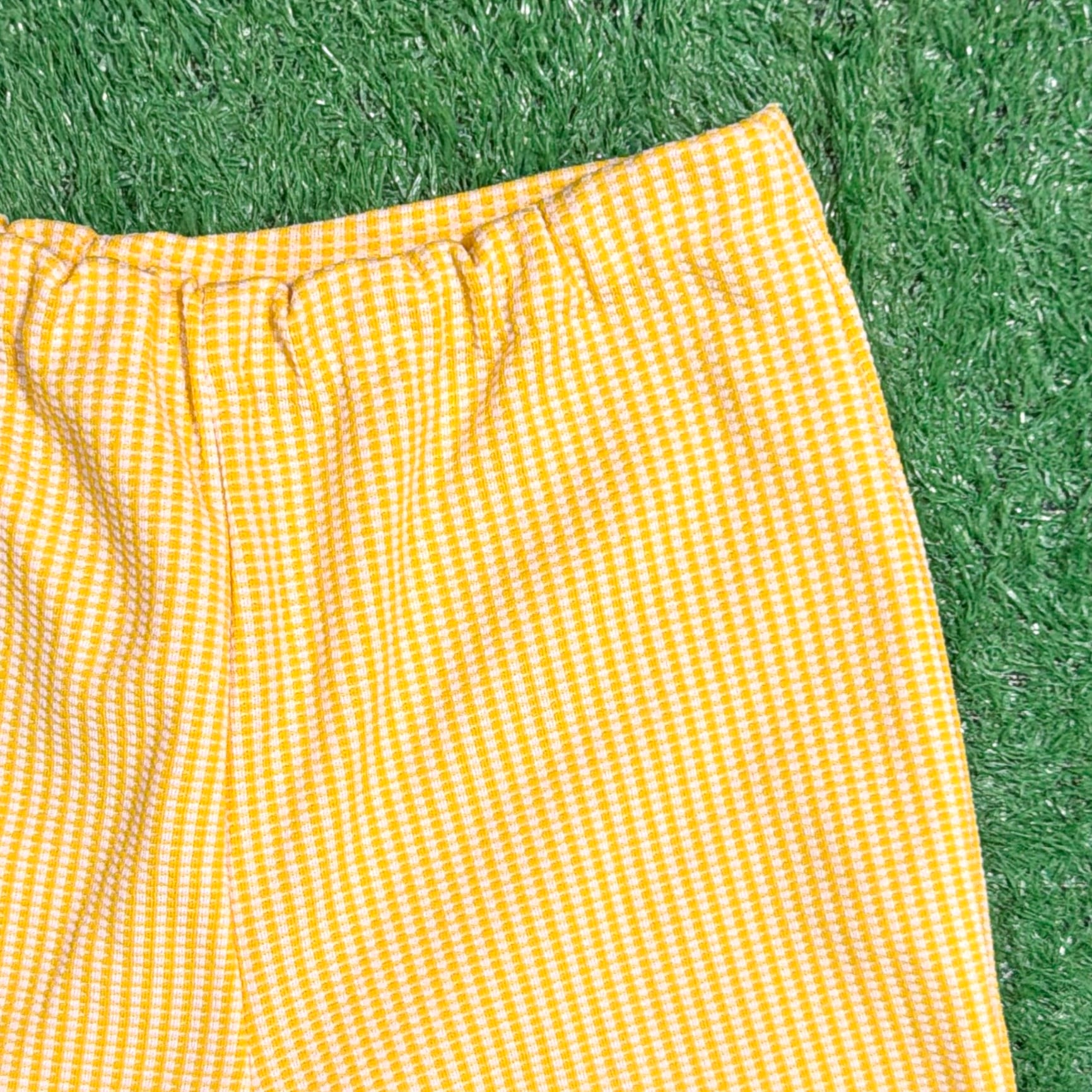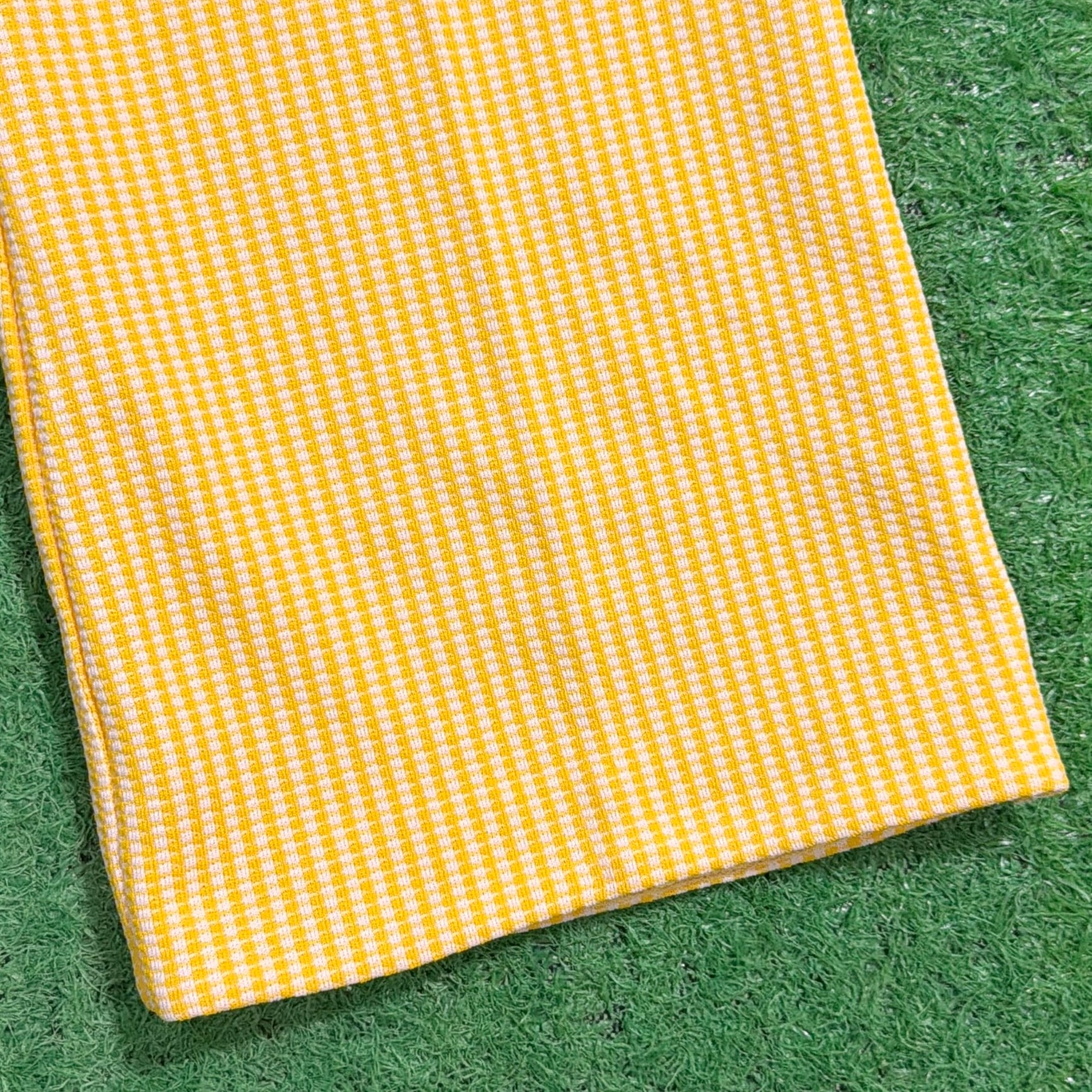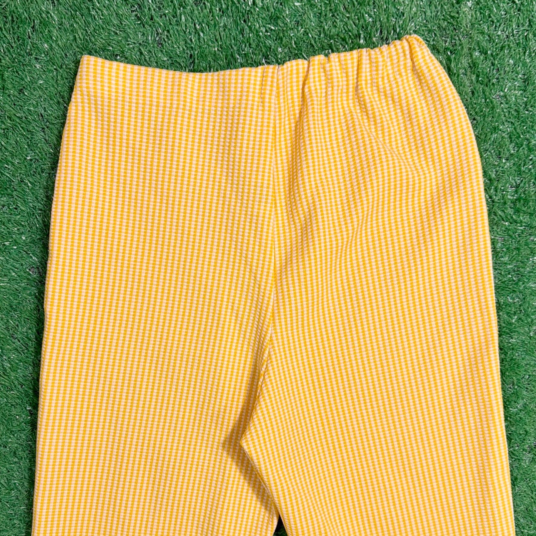 ウエストはゴム仕様でフィット感がありつつ、全体的にタイトで細身なシルエットなのが特徴です。裾に向かって緩やかに広がるフレアラインと、イエローカラーがスタイリングのアクセントになる一本です。