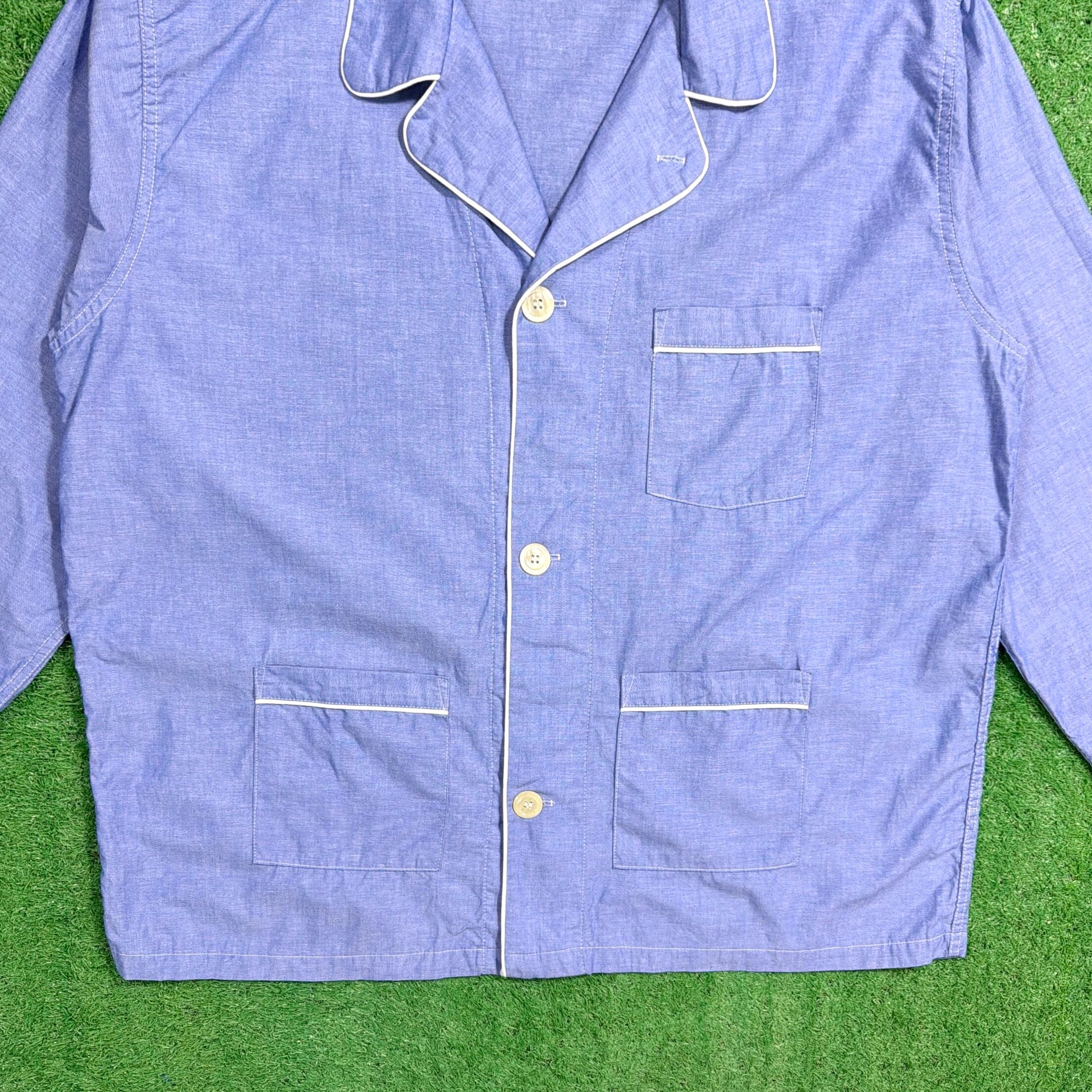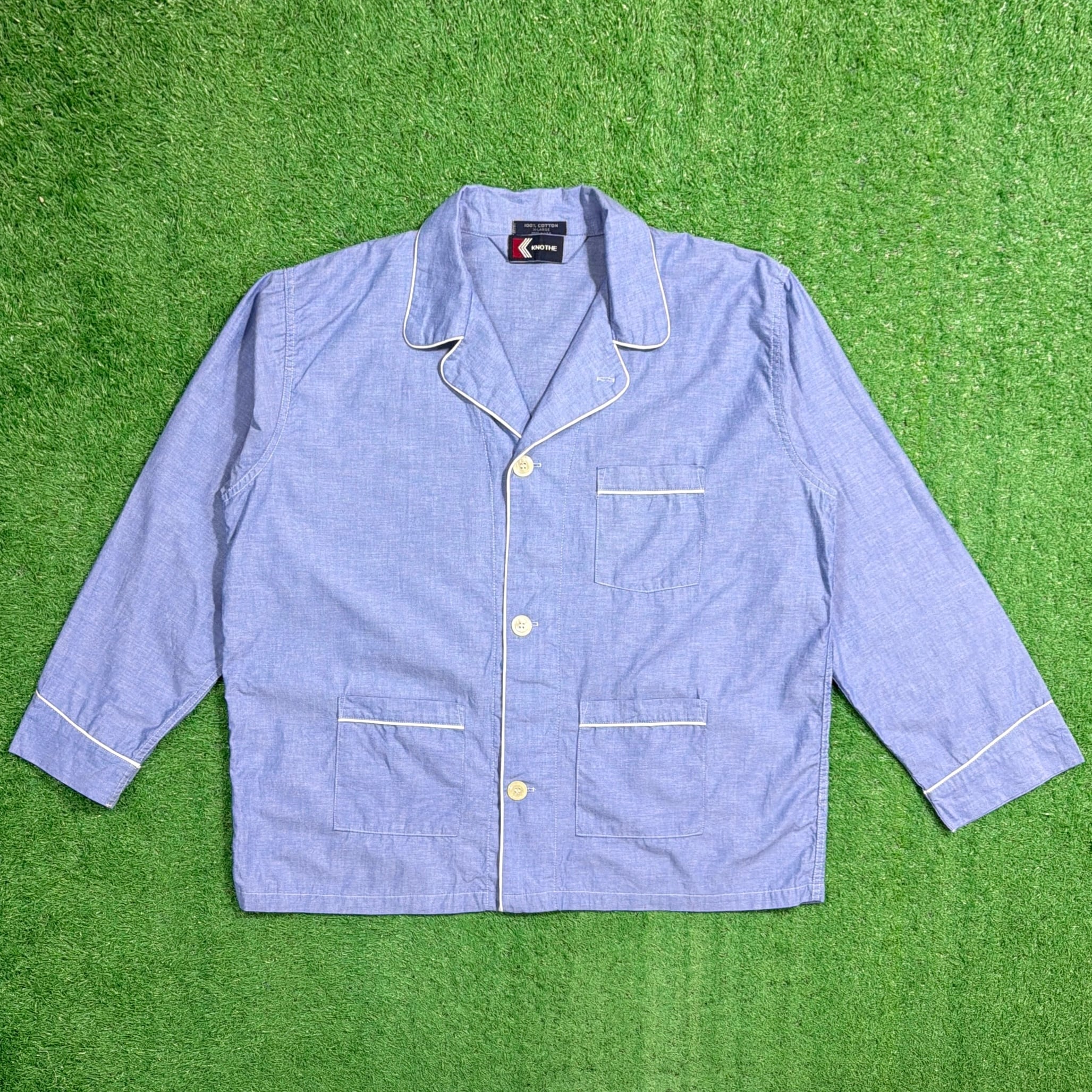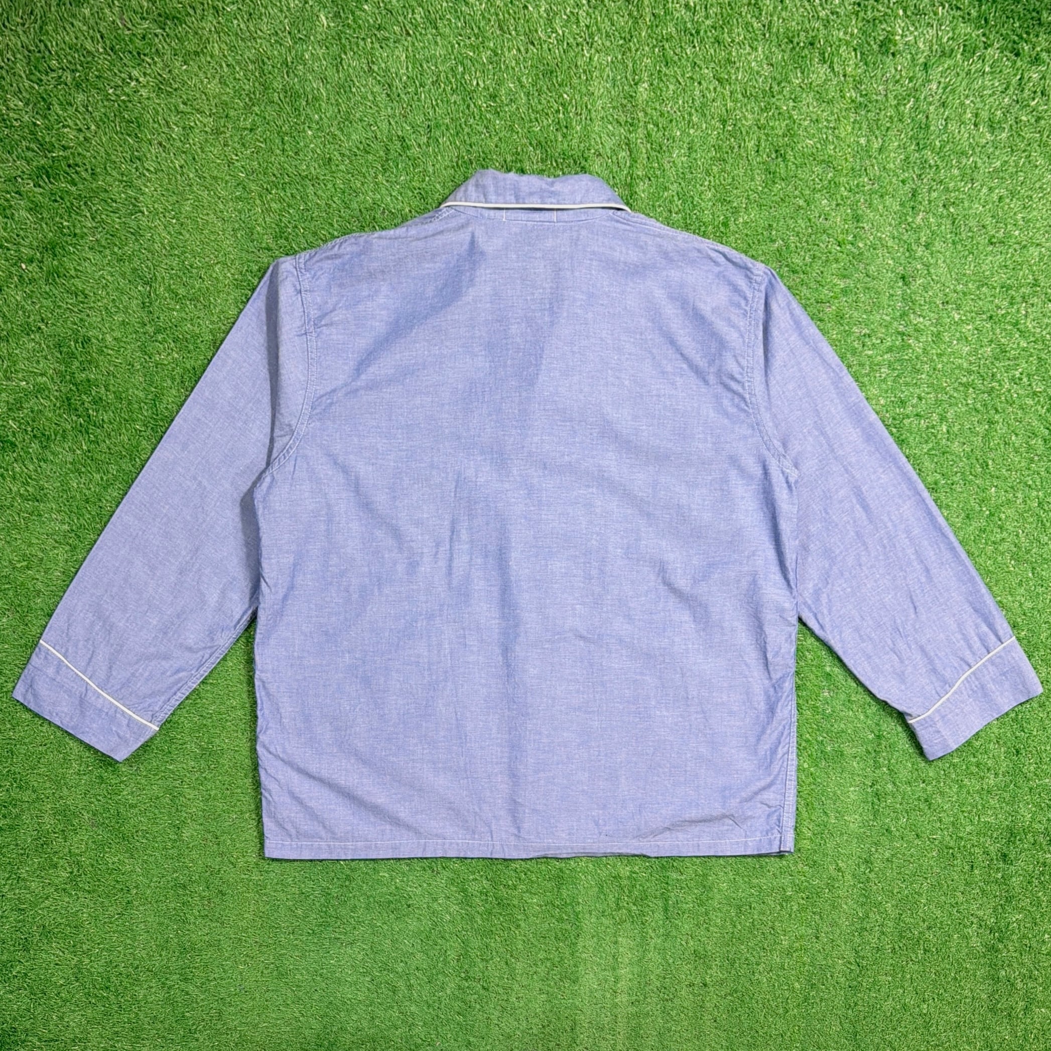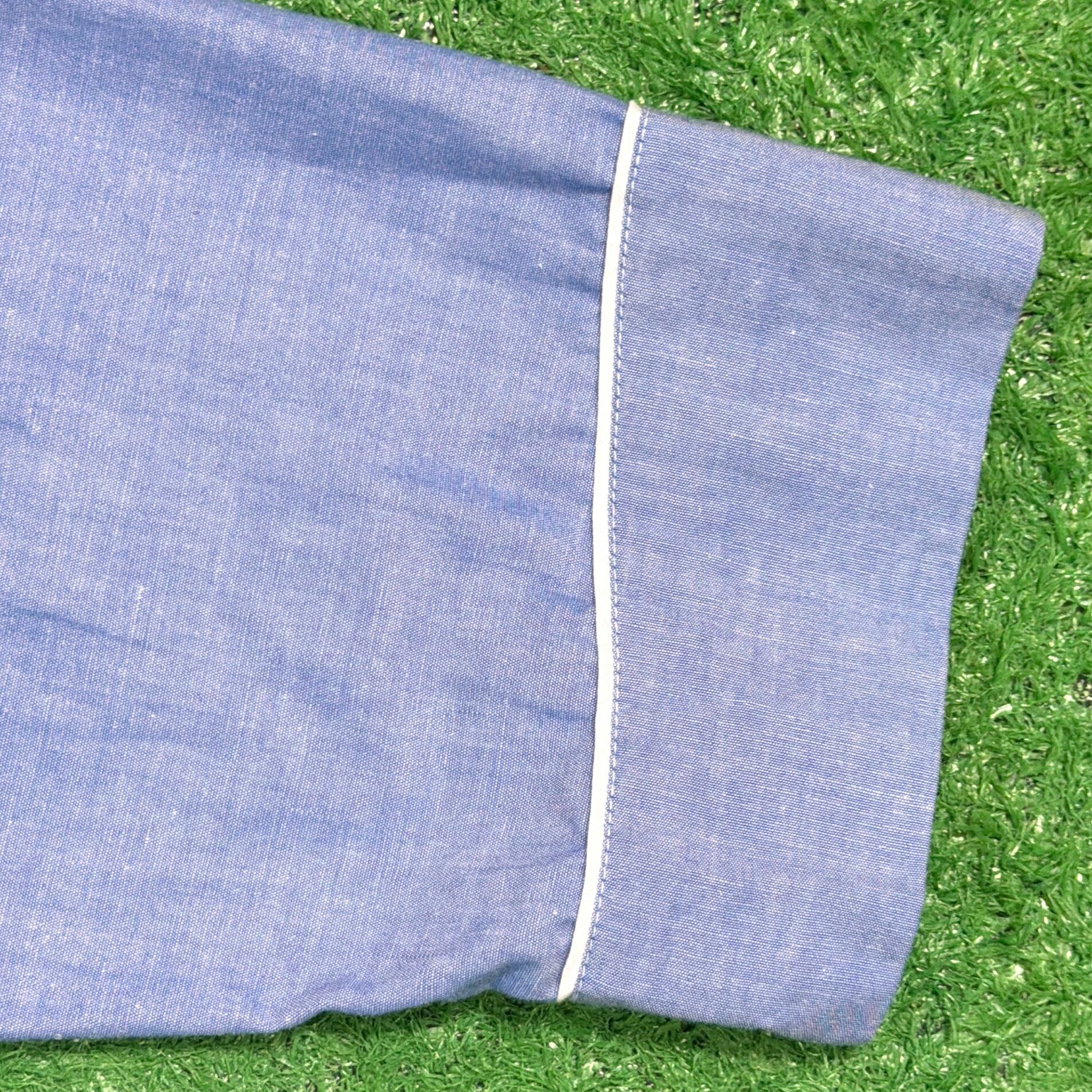 やわらかなブルーカラーに、ホワイトのパイピングが映えるクラシックなデザイン。オープンカラー仕様で、程よく力の抜けた雰囲気が魅力の一枚です。胸ポケット付きのベーシックなディテールで、シンプルながら90年代らしいリラックス感を楽しめます。