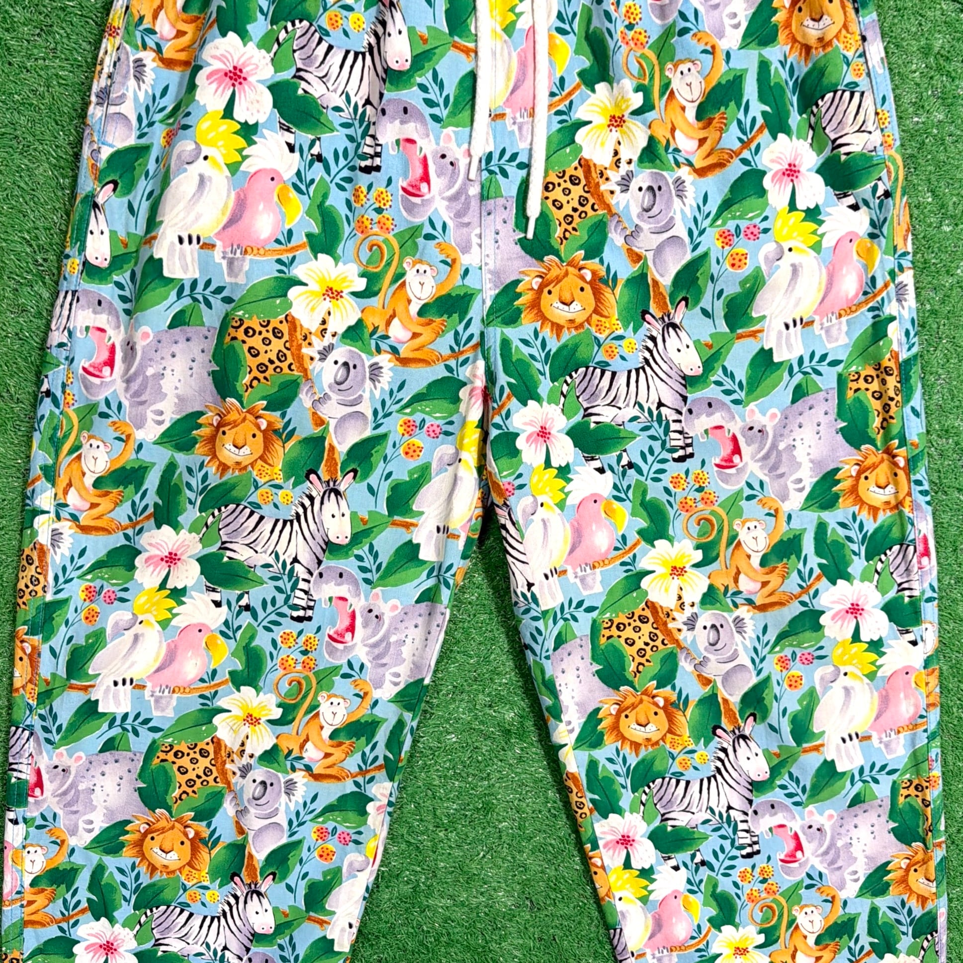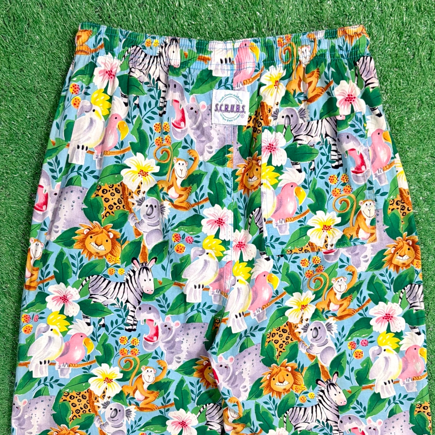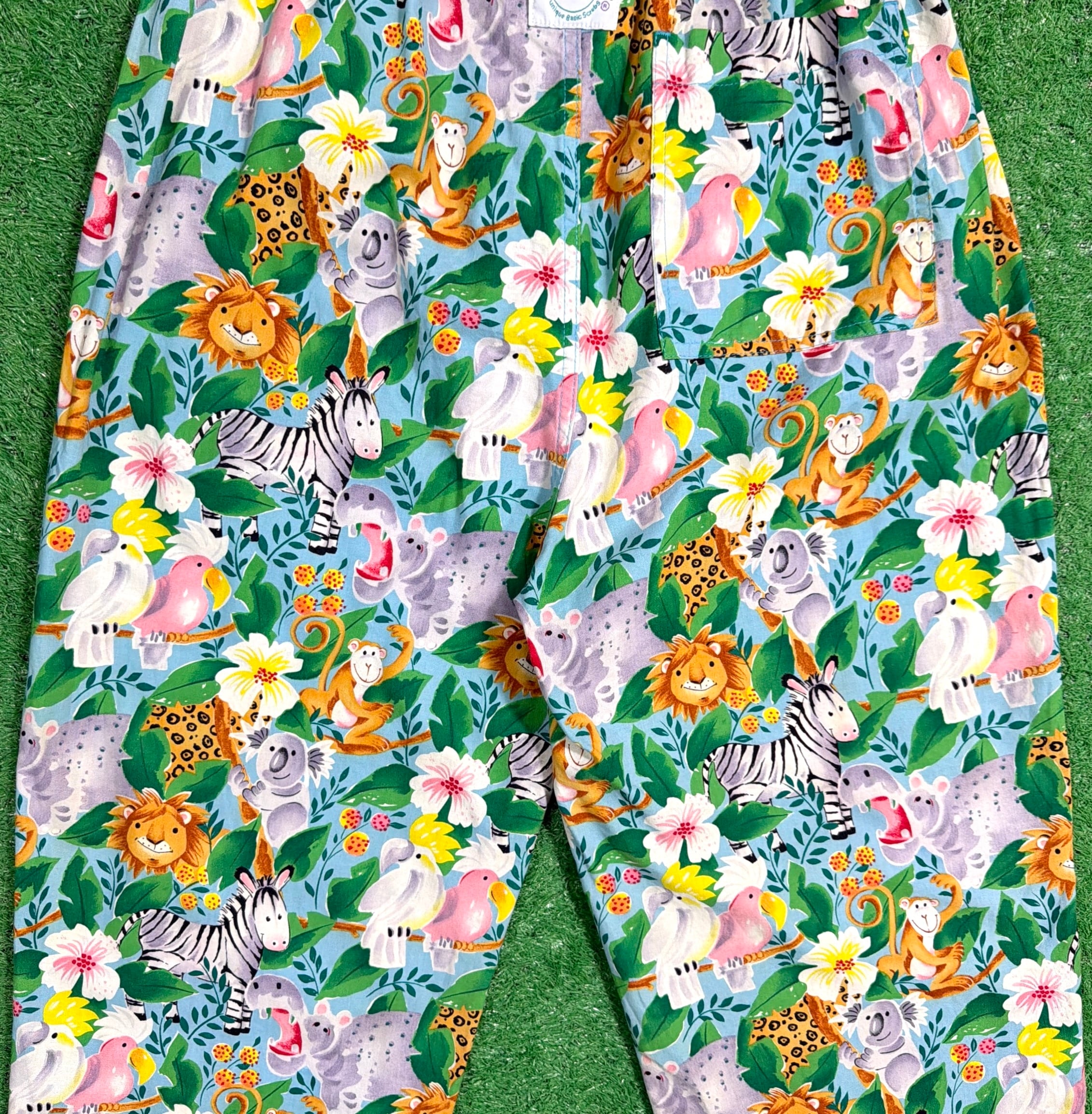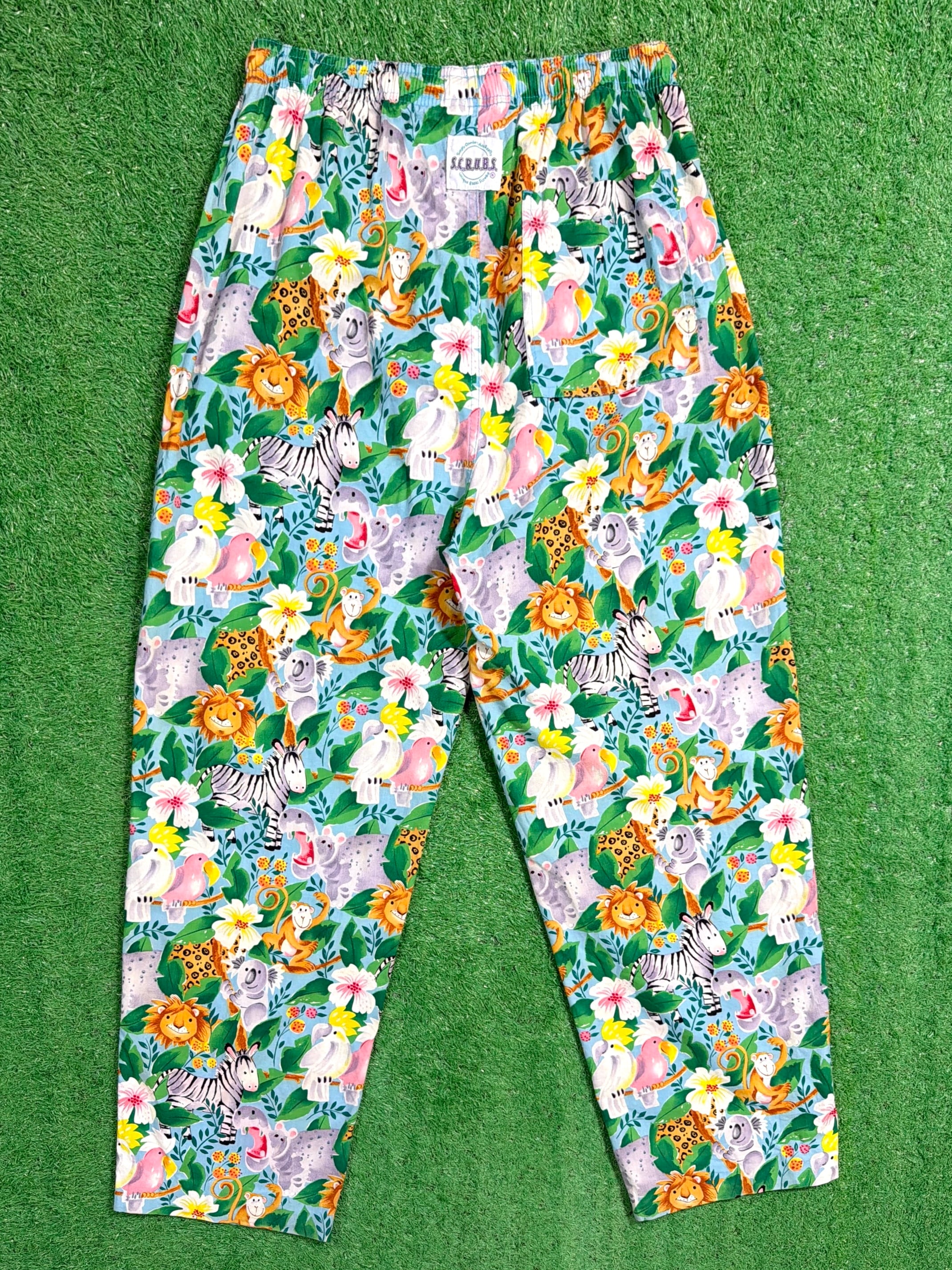 ライオンやシマウマ、キリンなどの動物たちがカラフルに描かれた、90sらしいポップで遊び心のあるデザインが目を引く一本。もともとは医療用のスクラブパンツのため、リラックス感のあるシルエットと動きやすさが魅力です。